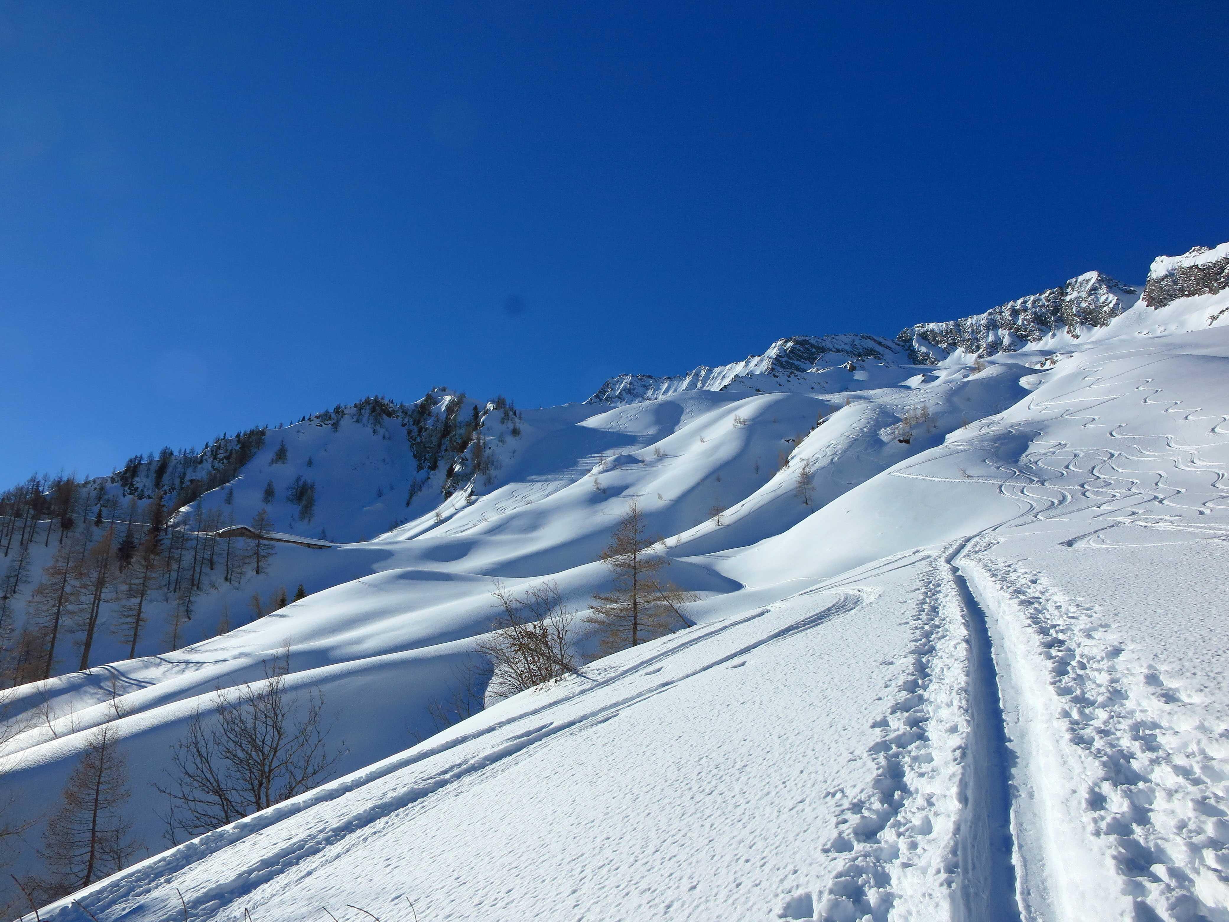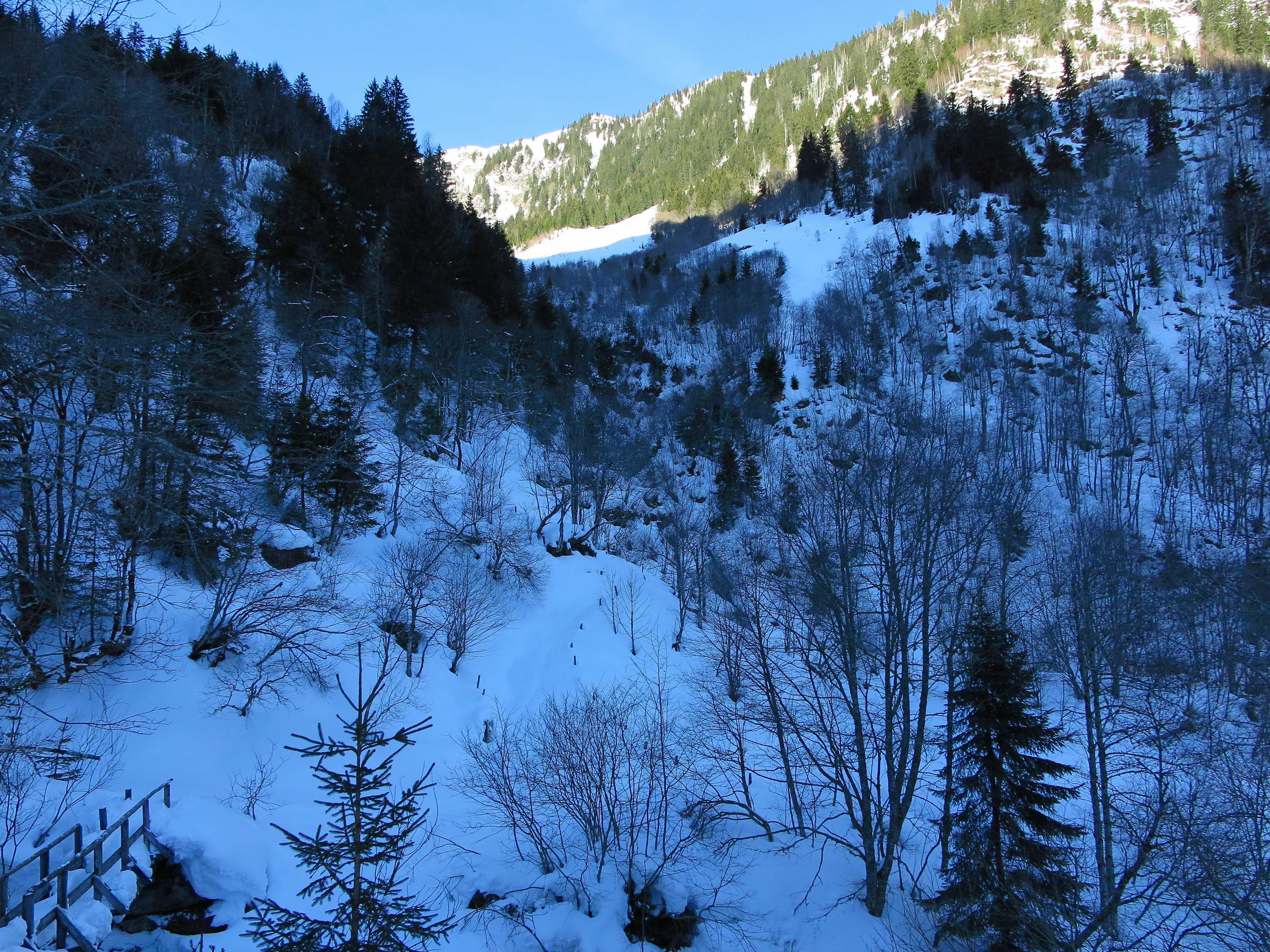 Schneelage: Der Anstieg nach dem Brückerl durch den steilen Wald war am Morgen beinhart gefroren, ich habe die Ski getragen. Weiter oben gings dann mit Harscheisen bis in die Rinne, die von der Schiederscharte herunter zieht. Der Rest war durchwegs schöner Pulver. Bei der Abfahrt war dann die Waldpassage sulzig-weich und ordentlich fahrbar.