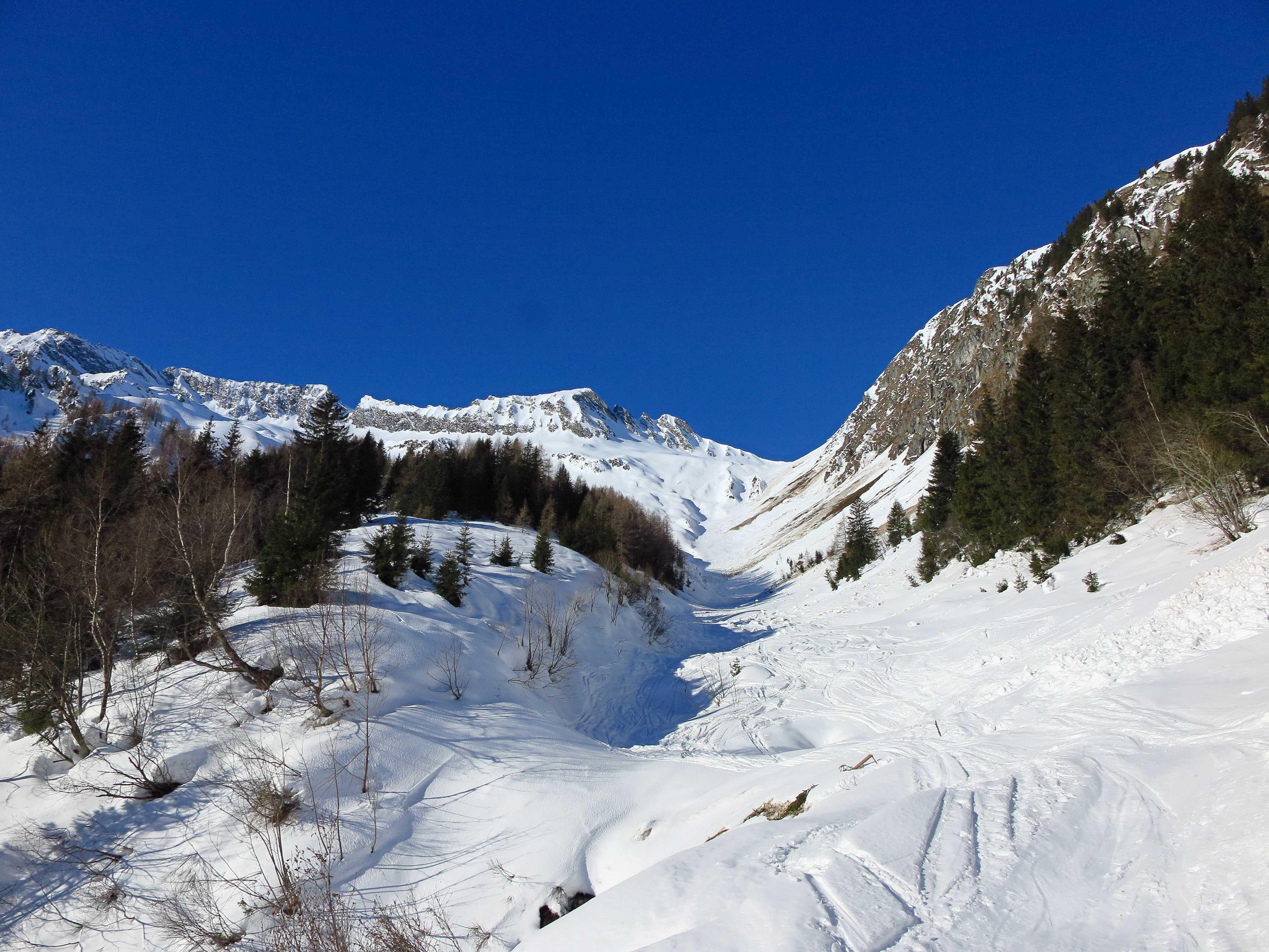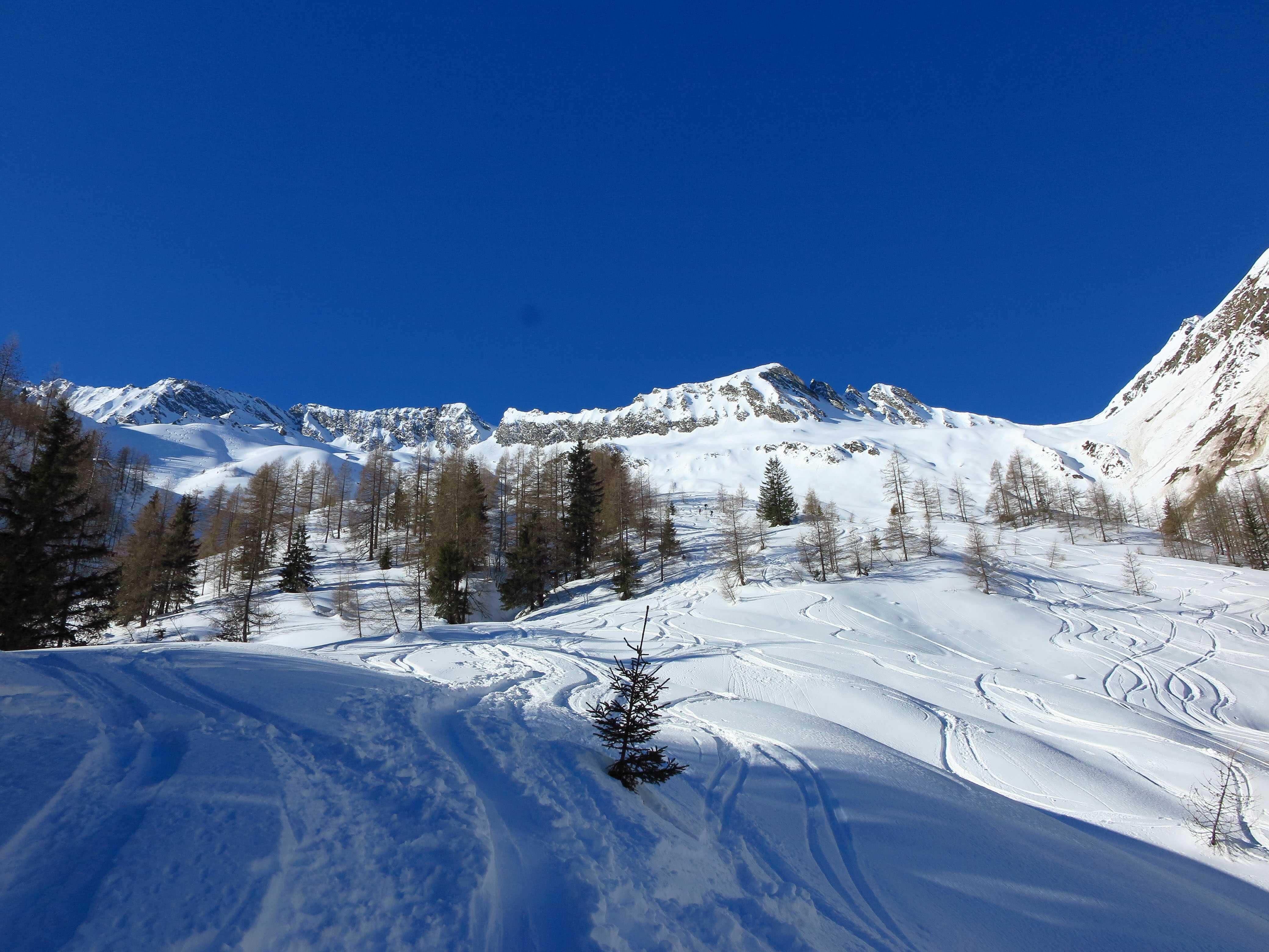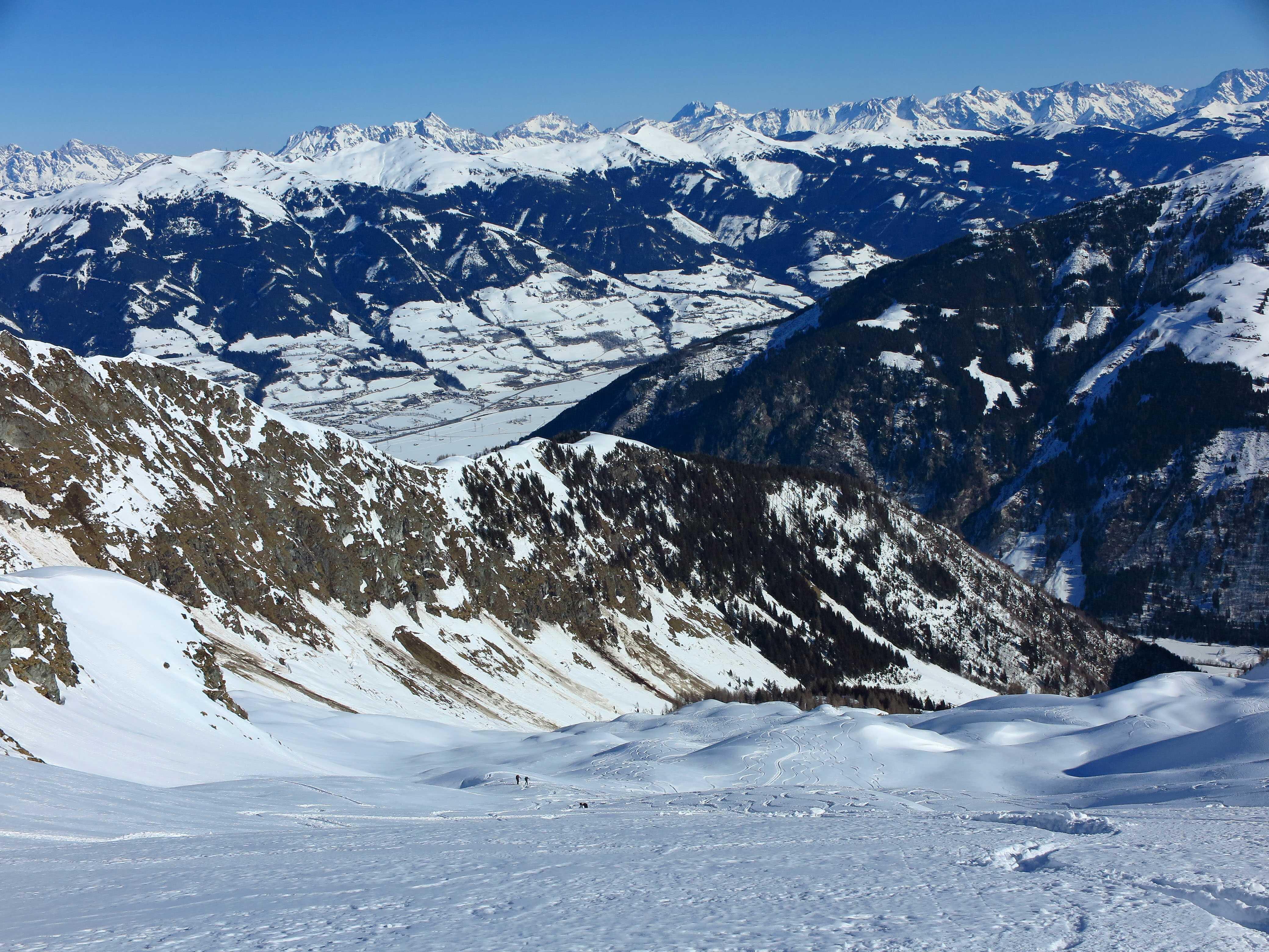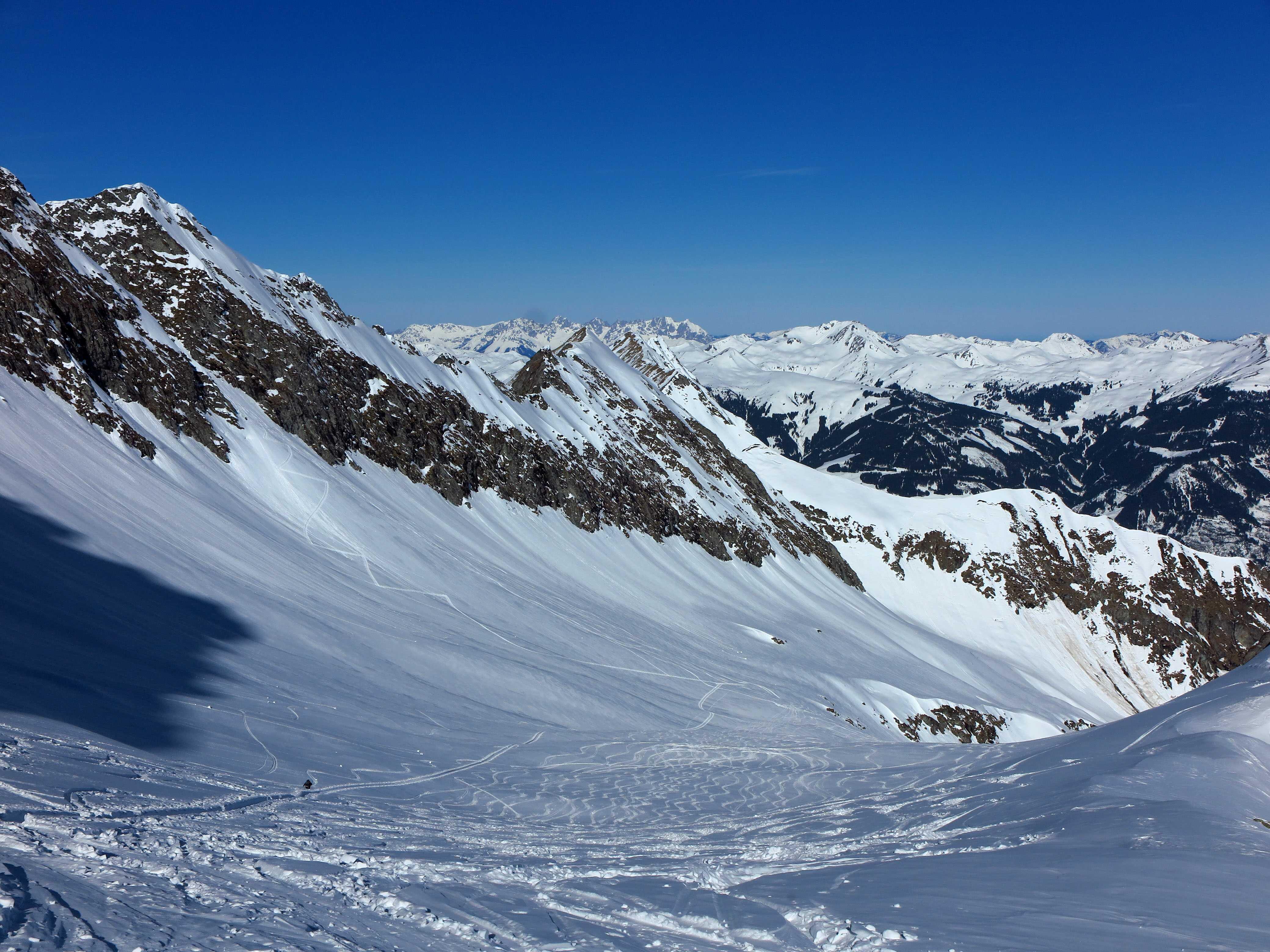 Nach dem schönen Pulver gestern am Glanzgschirr heute nochmal Stubachtal (884), diesmal in ca. 1200m rechts abgebogen übers Brückerl und durch den Wald hinauf ins Grüneckkogelkar und in die Grüneckkogelscharte (ca. 2500).