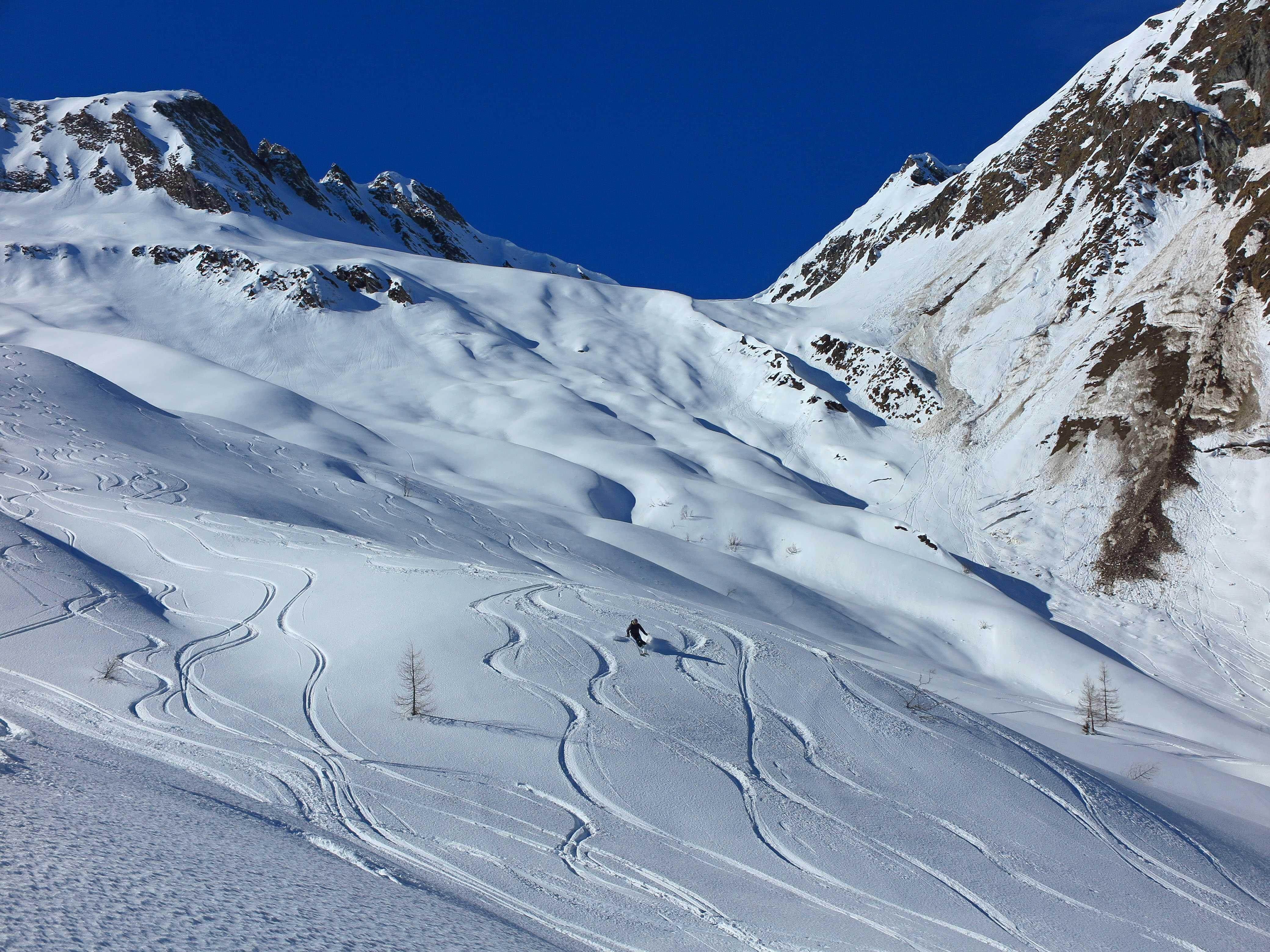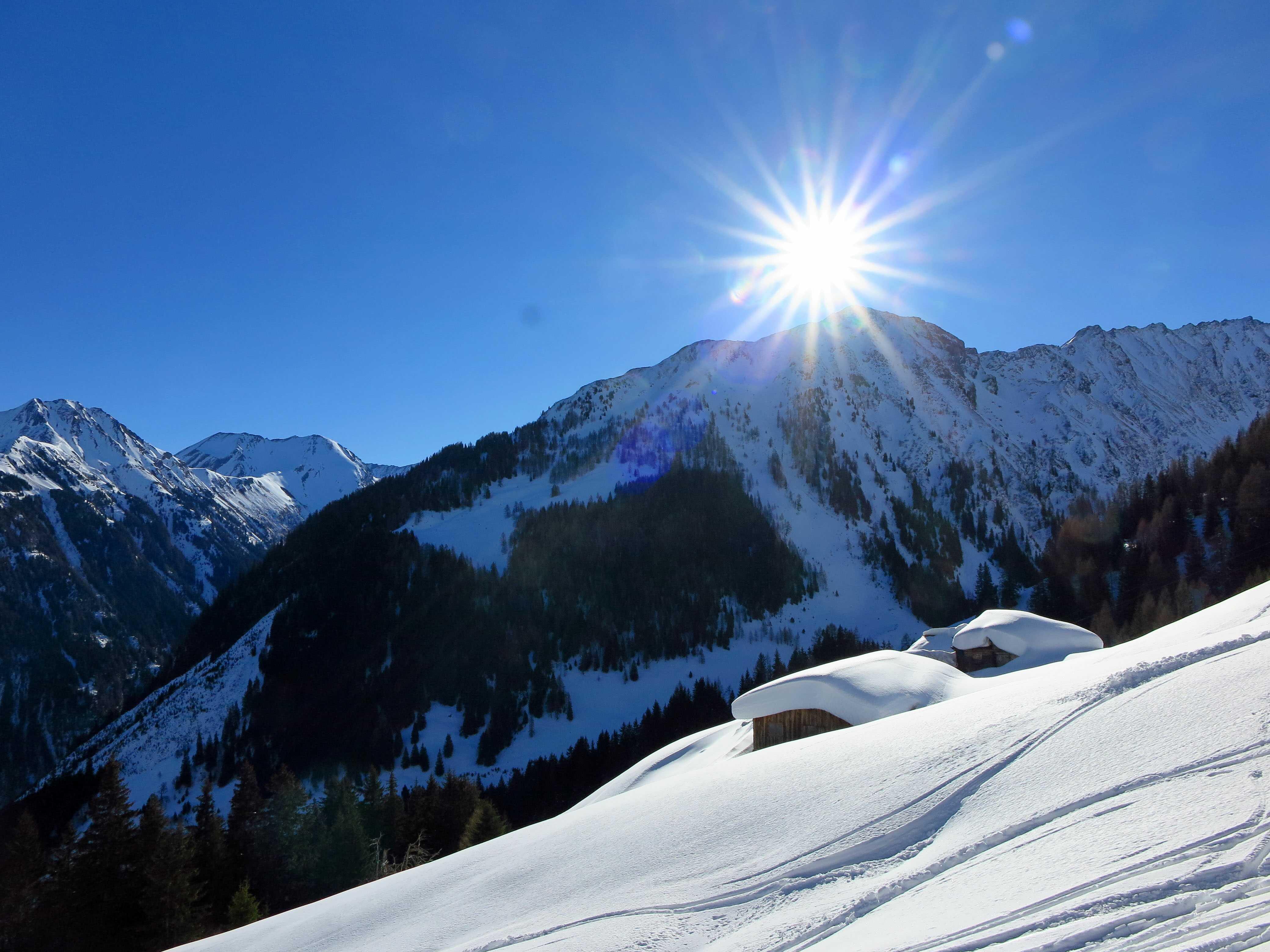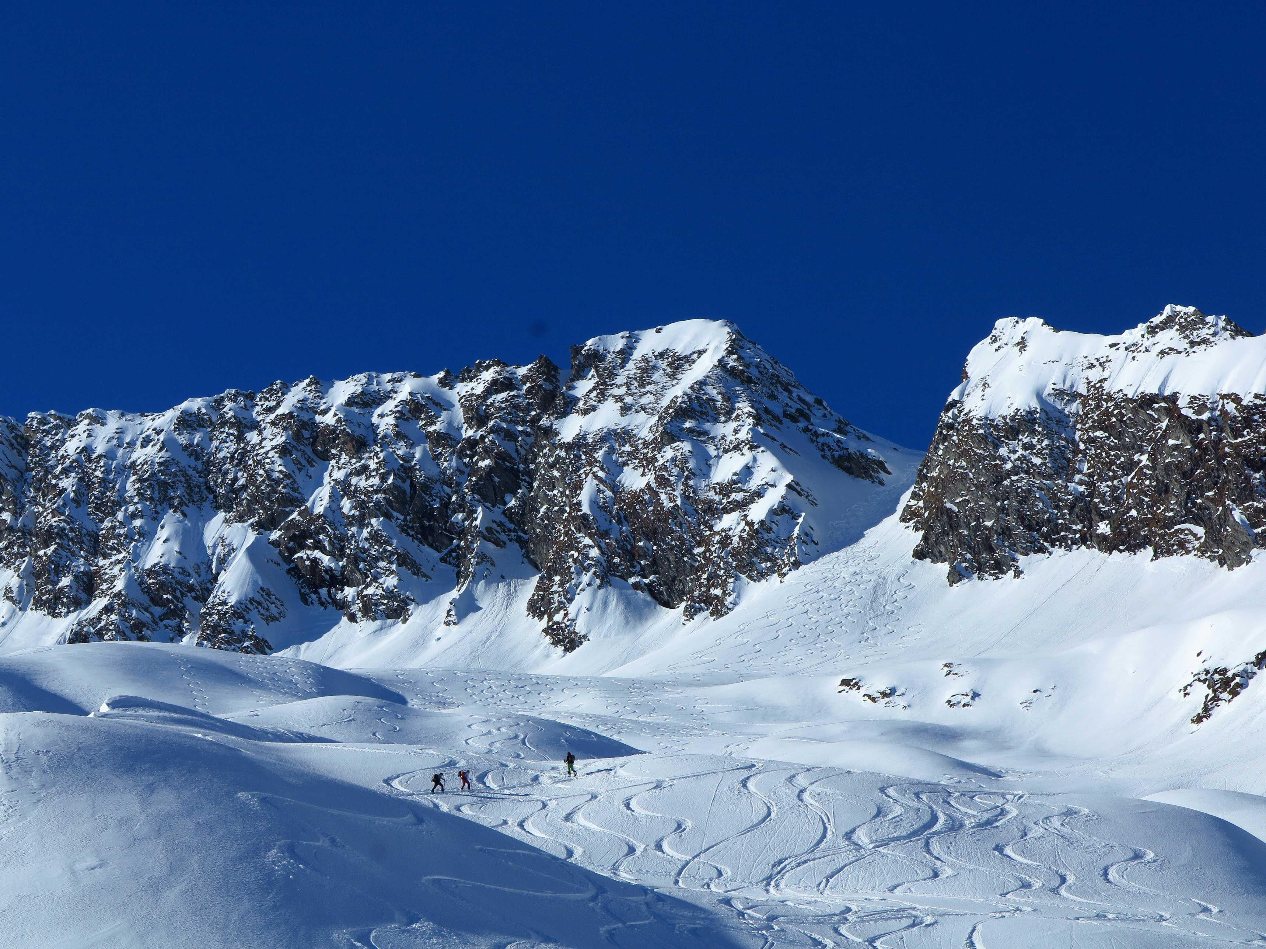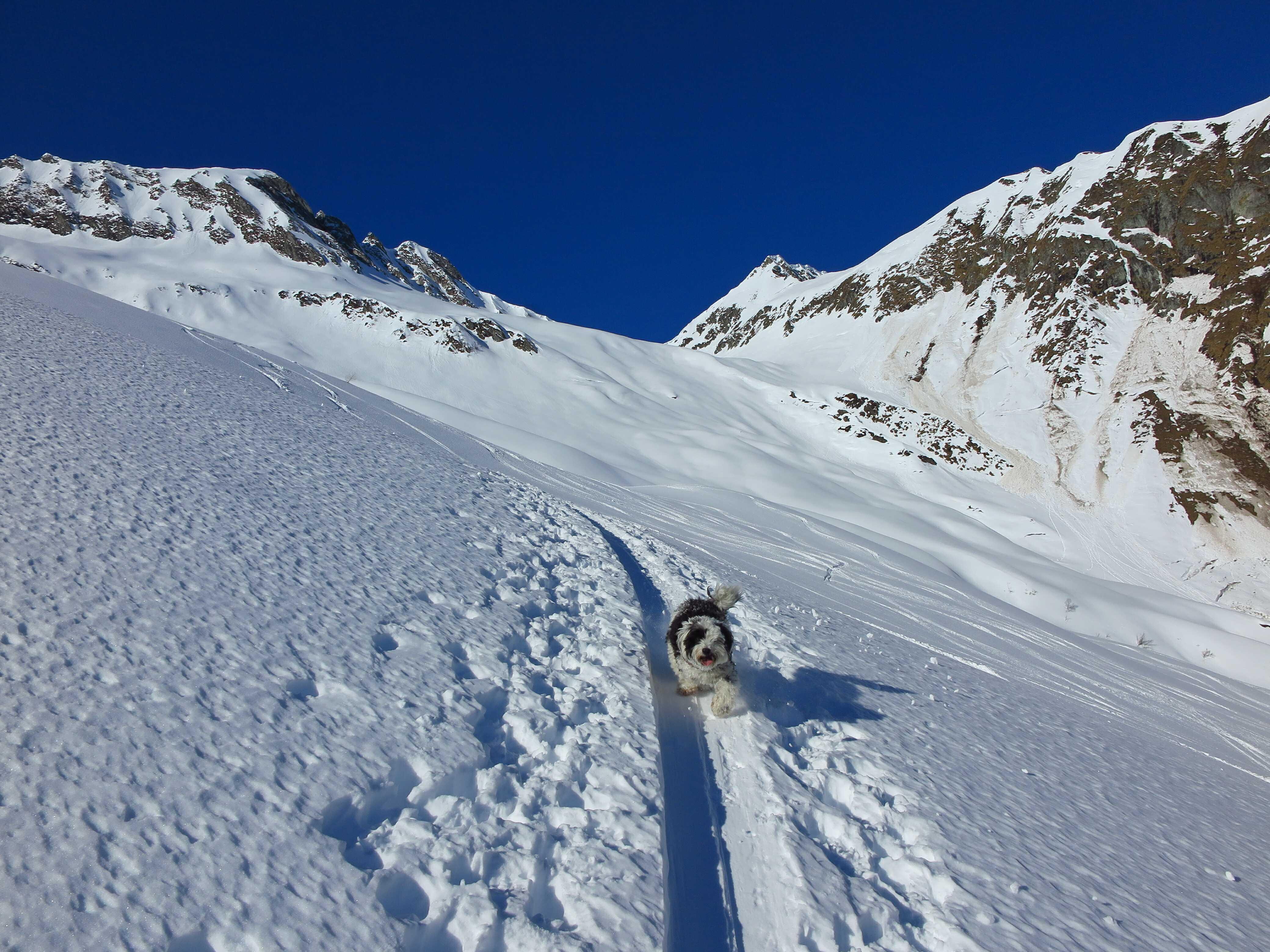 Nach dem schönen Pulver gestern am Glanzgschirr heute nochmal Stubachtal (884), diesmal in ca. 1200m rechts abgebogen übers Brückerl und durch den Wald hinauf ins Grüneckkogelkar und in die Grüneckkogelscharte (ca. 2500).