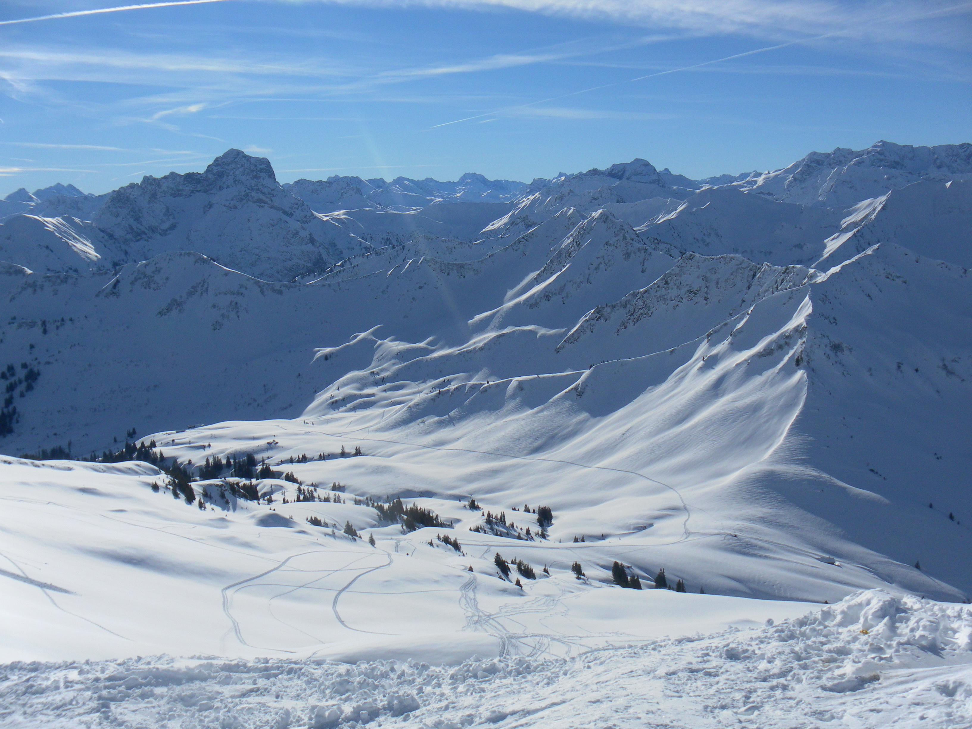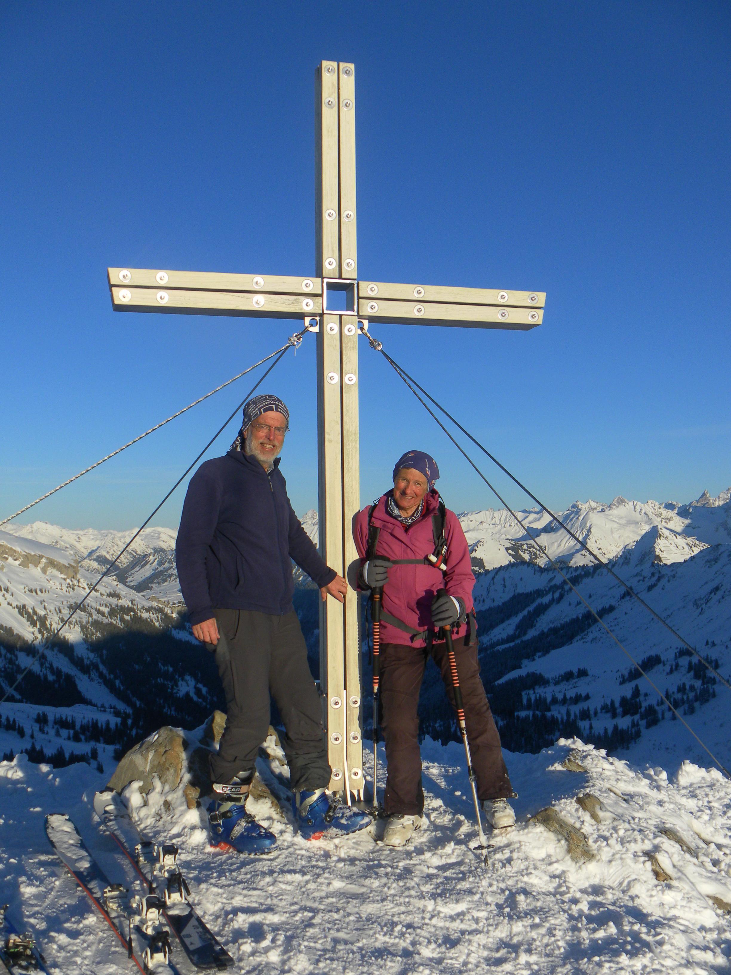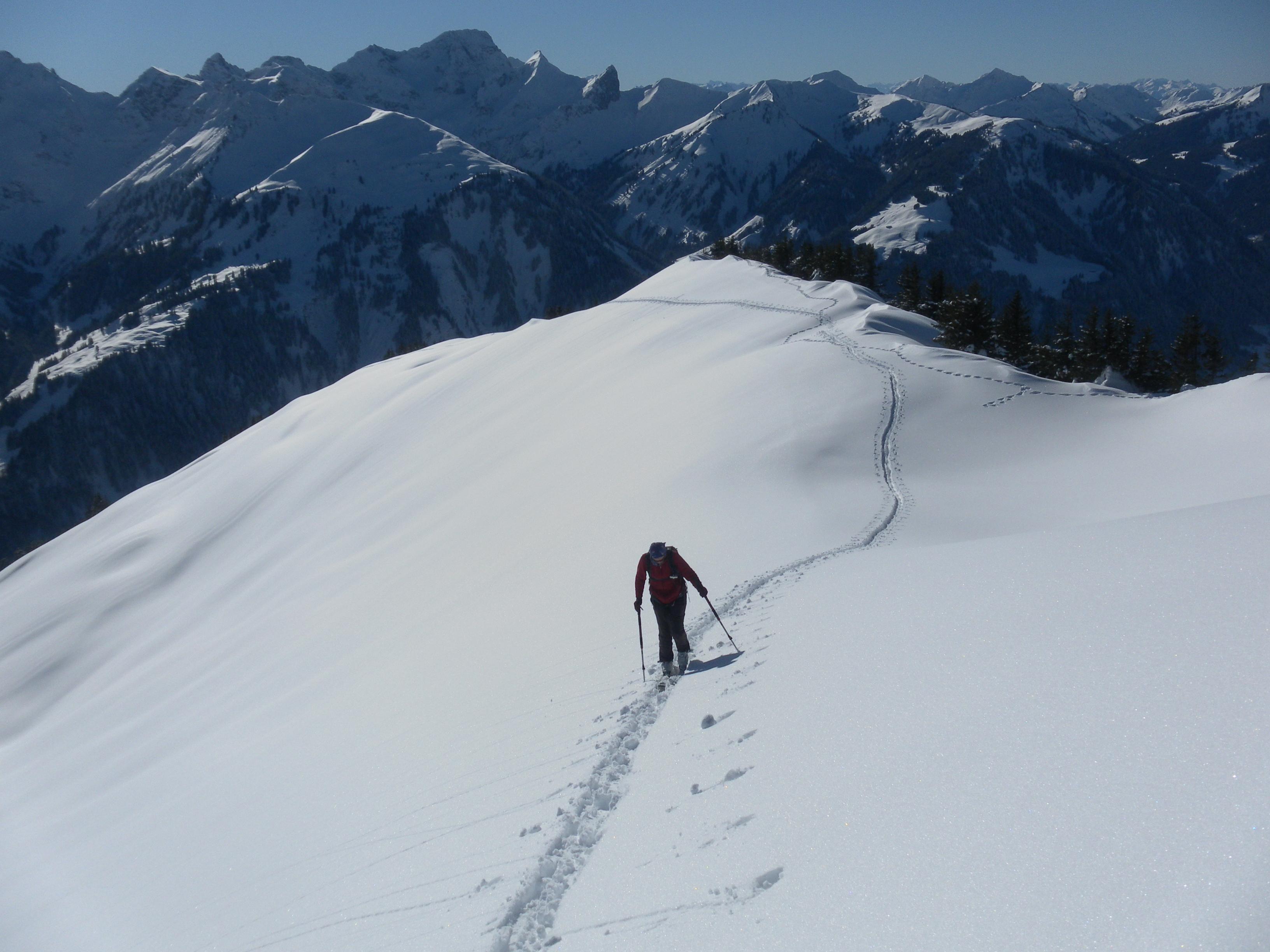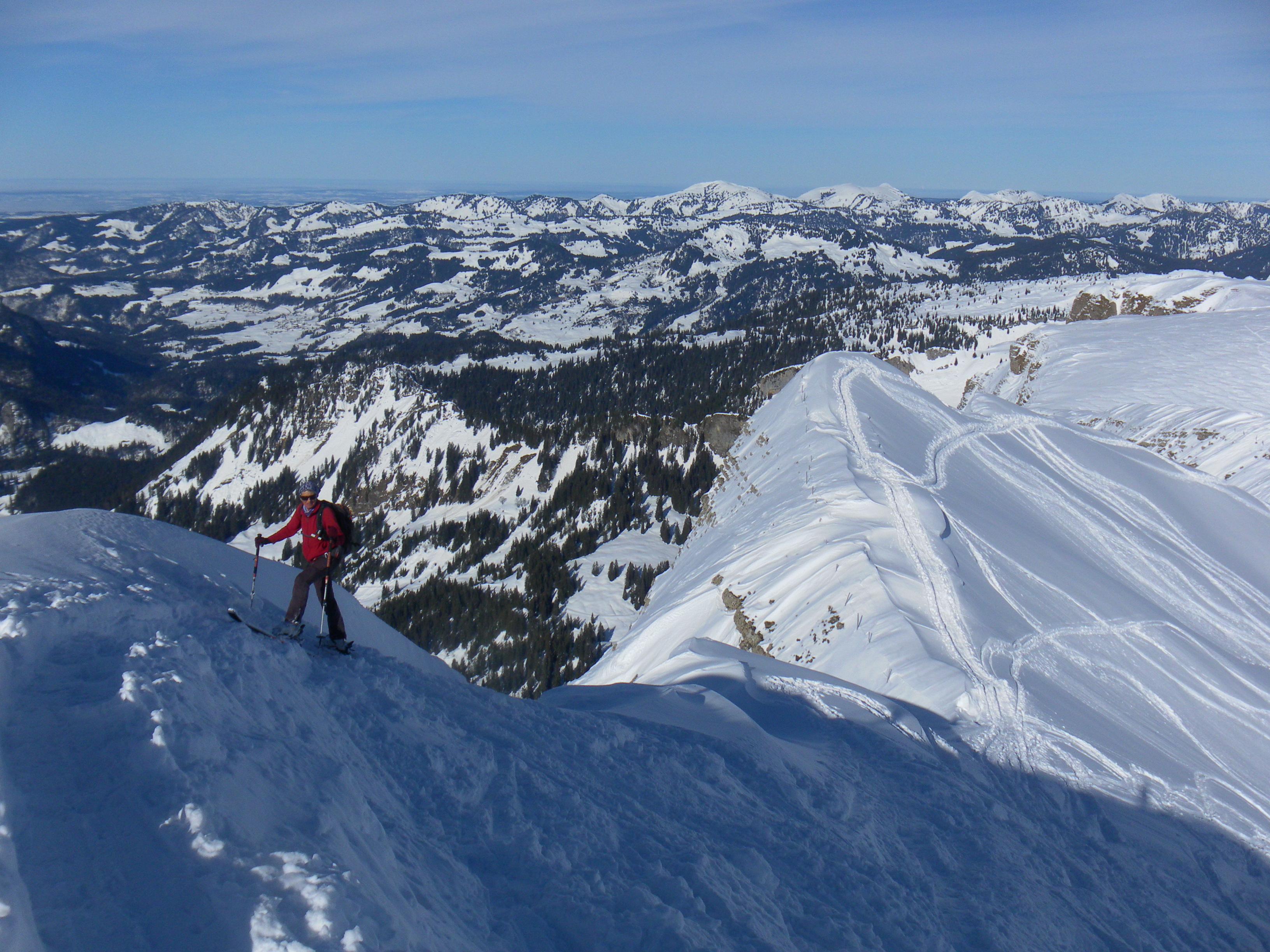 Vier Tage auf der hervorragend geführten Schwarzwasserhütte im gleichnamigen Seitental des Kleinwalsertals/Vorarlberg bringen uns genussvolle Skitouren auf sechs relativ einfach besteigbare Gipfel: Steinmandl, Diedamskopf, Falzer Kopf, Steinmandl, Hählekopf, Berlingerköpfle, Hählekopf und Grünhorn. Die Schneelage ist wie bei uns üppig - viel Pulverschnee, in Südostexposition ein kräftiger Morgendeckel, der in der Nachmittagssonne aufweicht. LWS 3plus am Mo abfallend auf 2plus am Do.