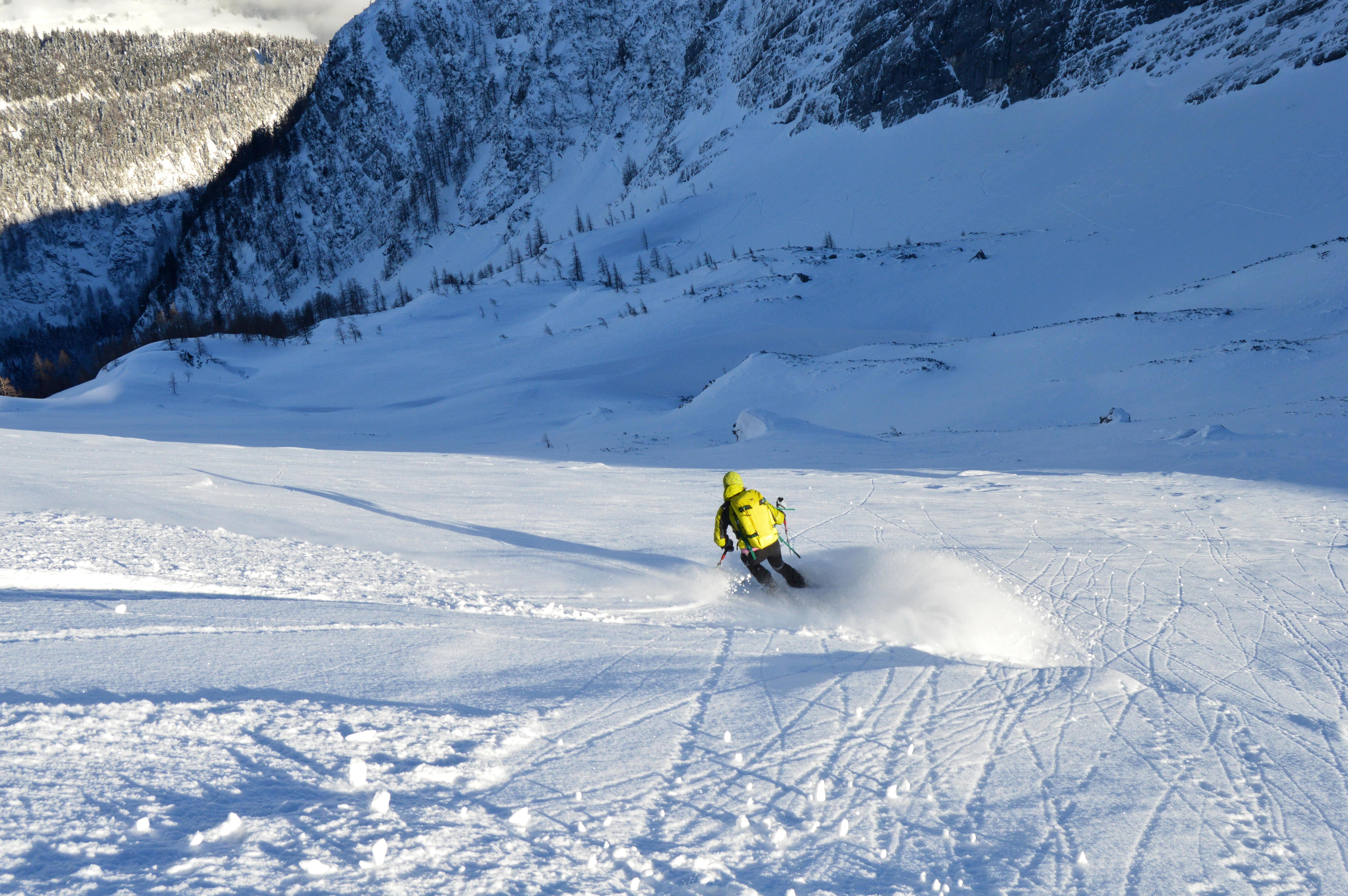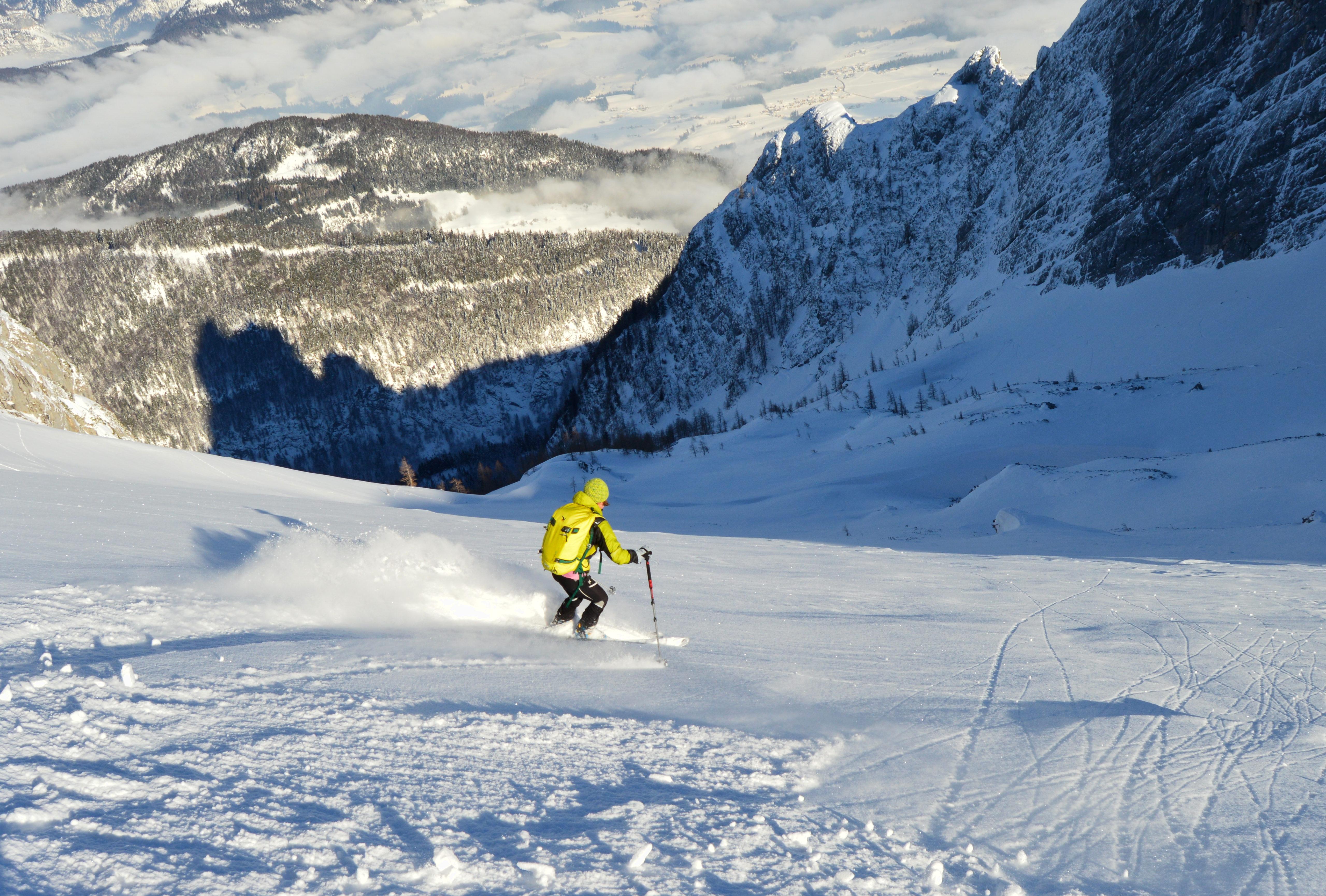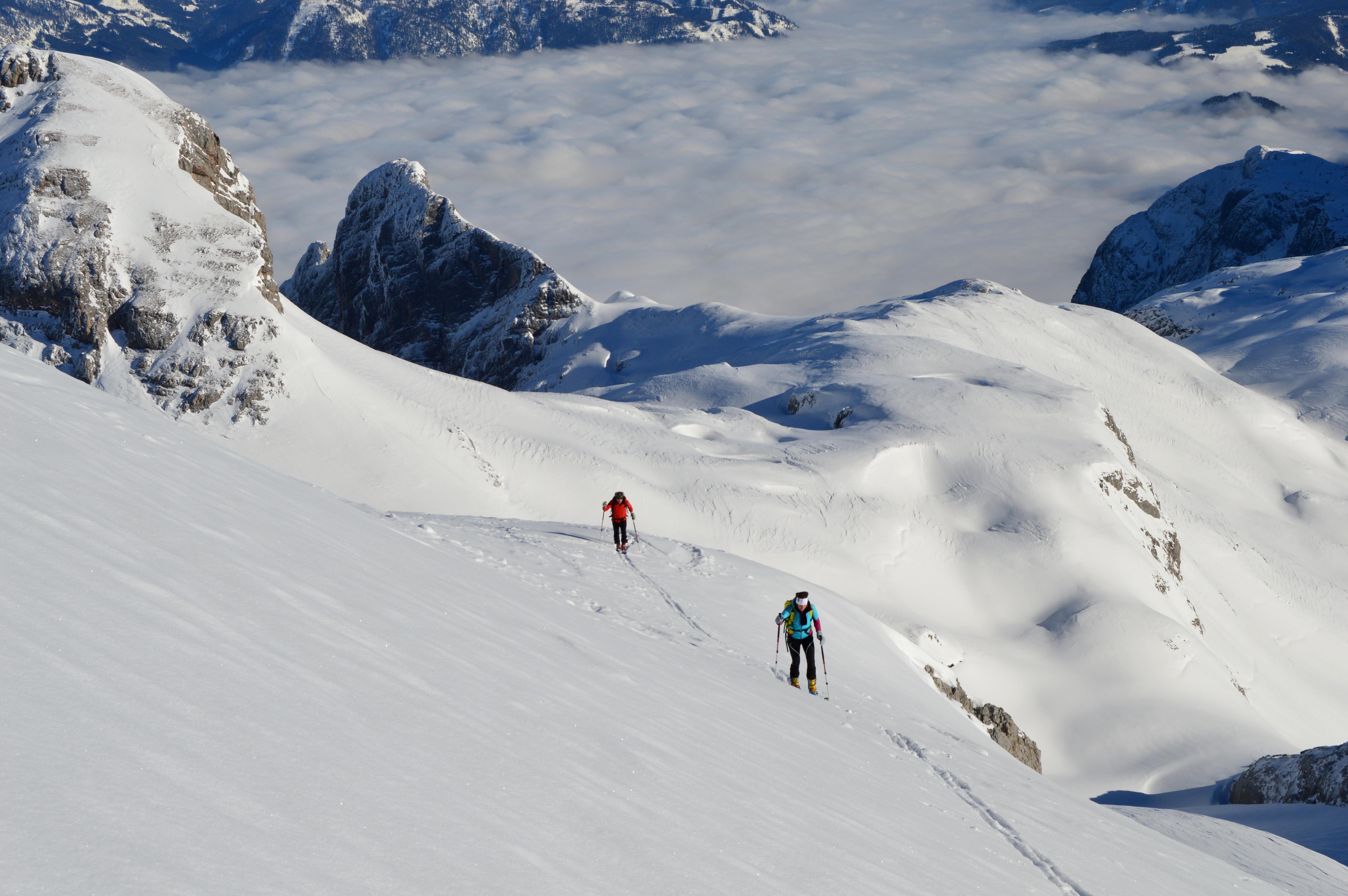 Ein absoluter Tourenklassiker im Tennengebirge. Landschaftlich großartig und schifahrerisch sehr lohnend, allerdings müssen sich der perfekten Abfahrtshänge erst verdient werden. Immerhin 1700Hm sind zu bewältigen, wobei momentan ideale Bedingungen herrschen. Auch die seilversicherte Steilstufe geht sehr gut mit Schi - Weicher Schnee und noch nichts eisig.