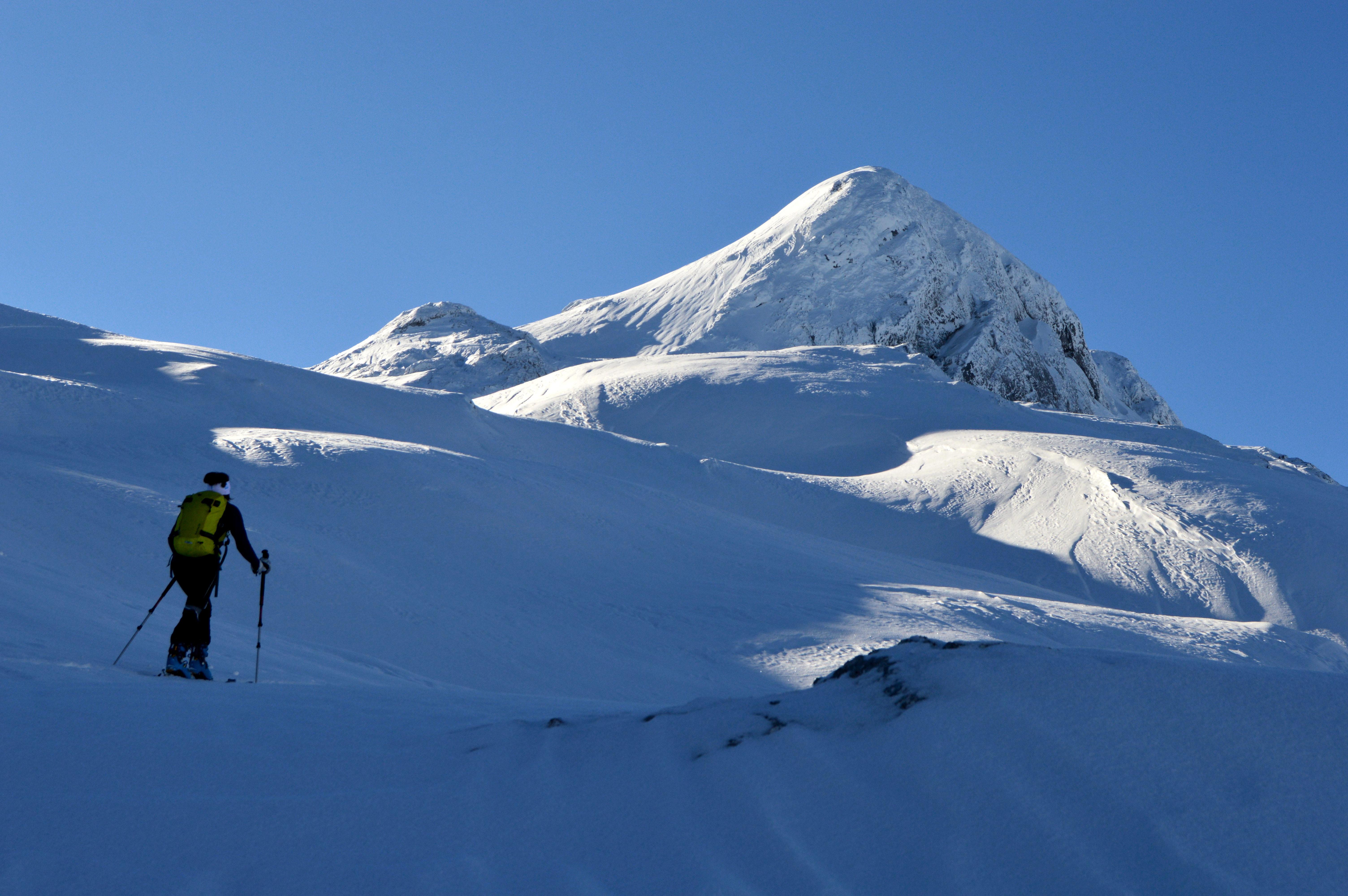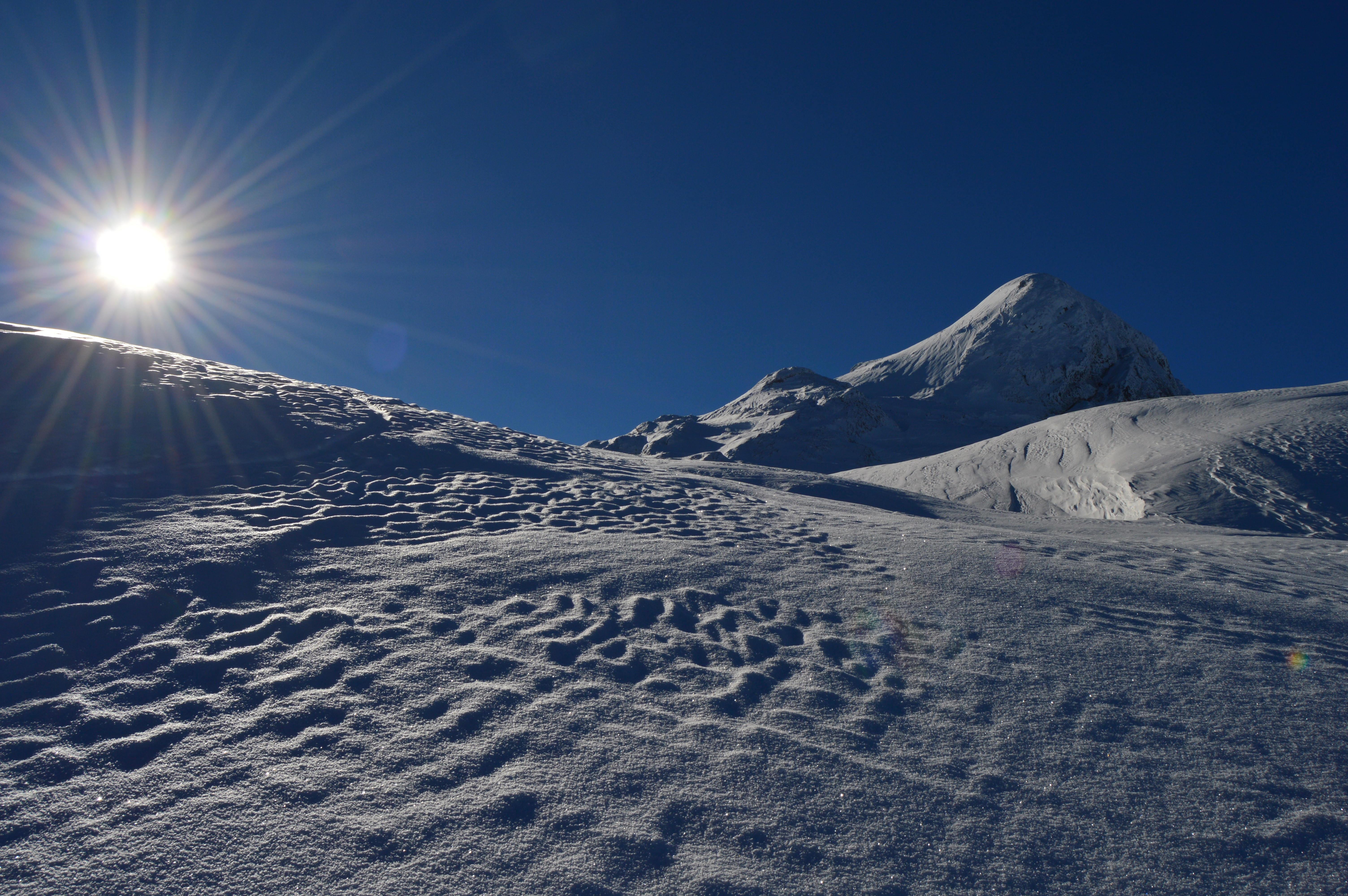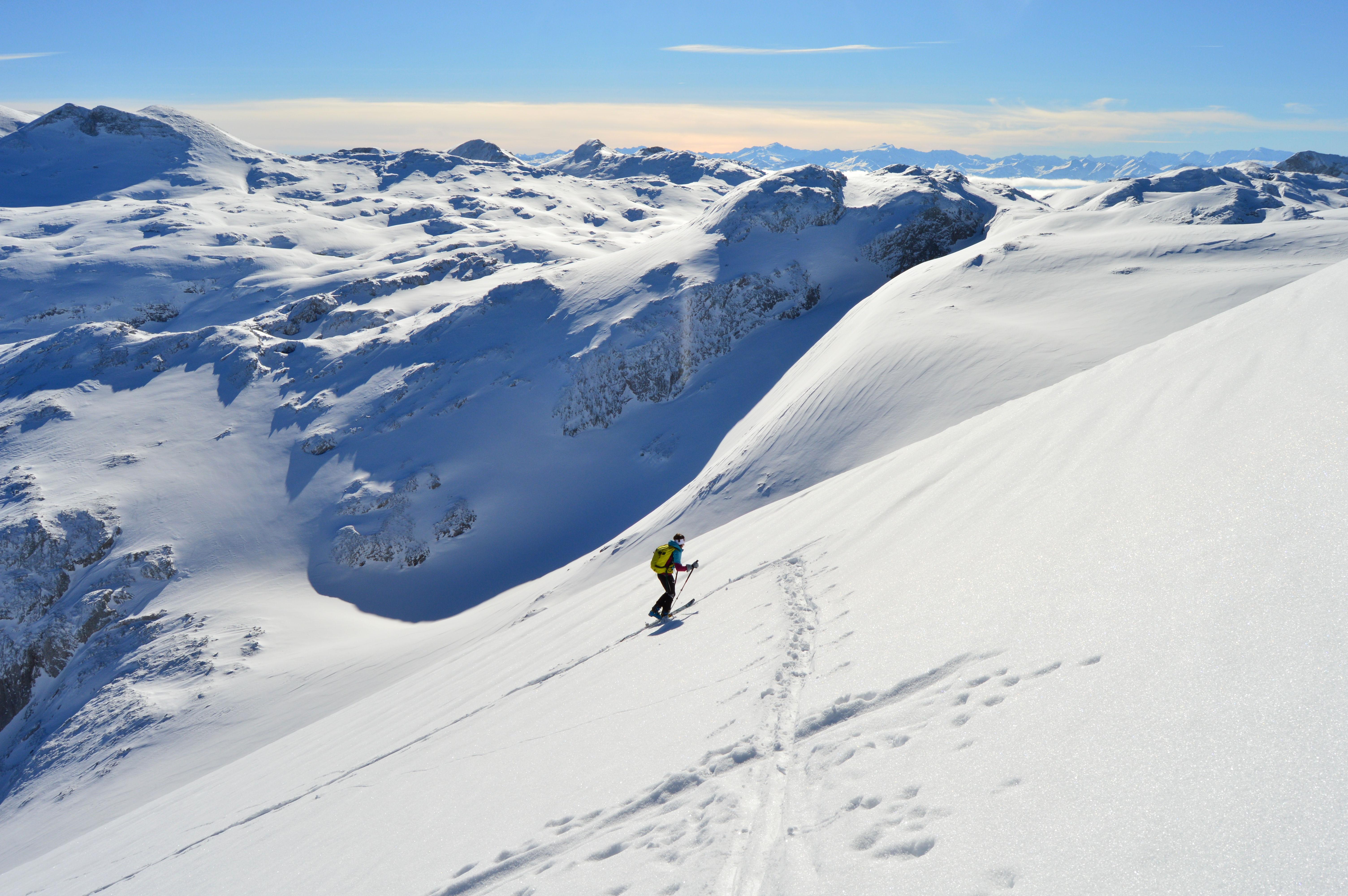 Ein absoluter Tourenklassiker im Tennengebirge. Landschaftlich großartig und schifahrerisch sehr lohnend, allerdings müssen sich der perfekten Abfahrtshänge erst verdient werden. Immerhin 1700Hm sind zu bewältigen, wobei momentan ideale Bedingungen herrschen. Auch die seilversicherte Steilstufe geht sehr gut mit Schi - Weicher Schnee und noch nichts eisig.