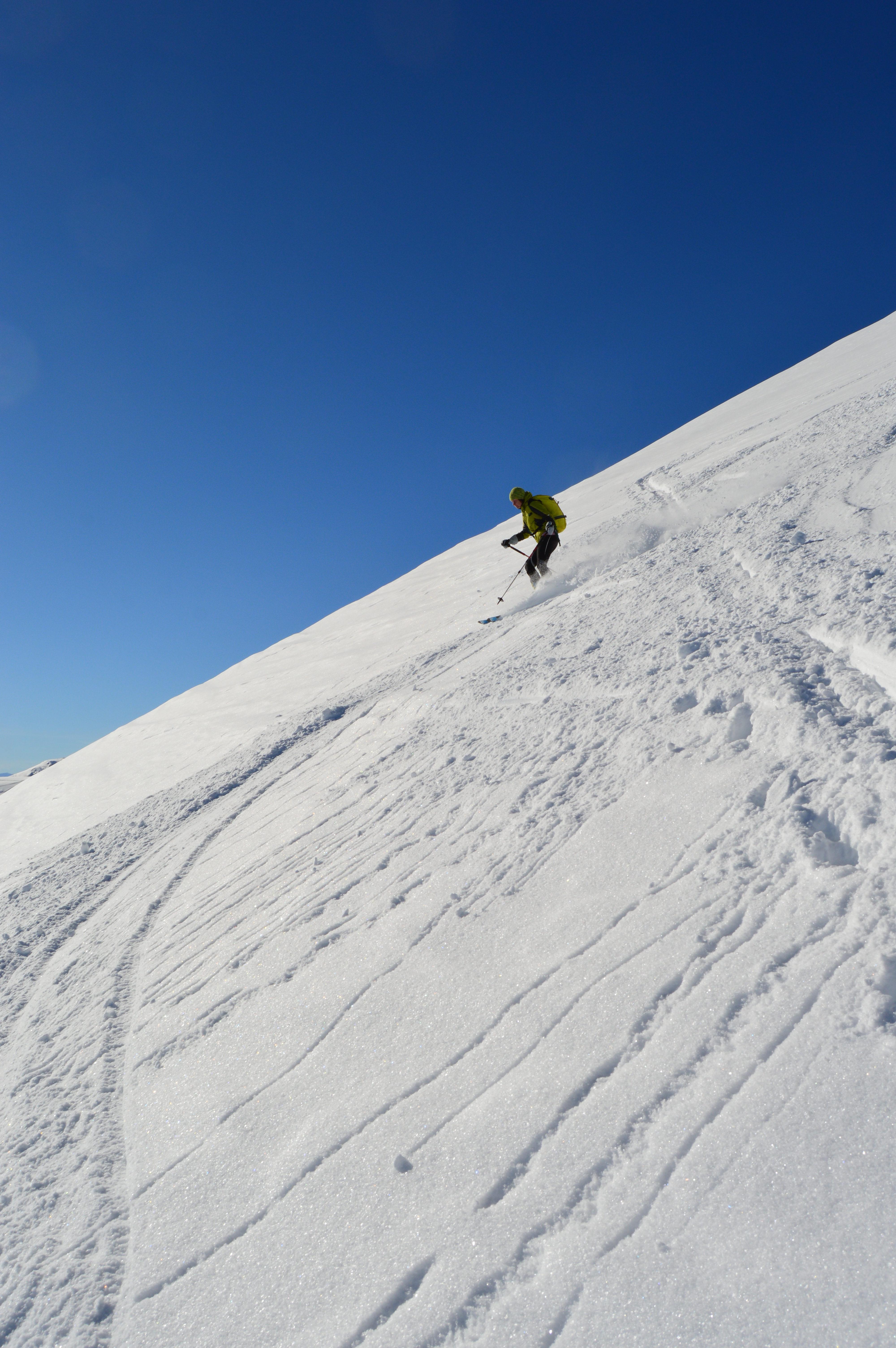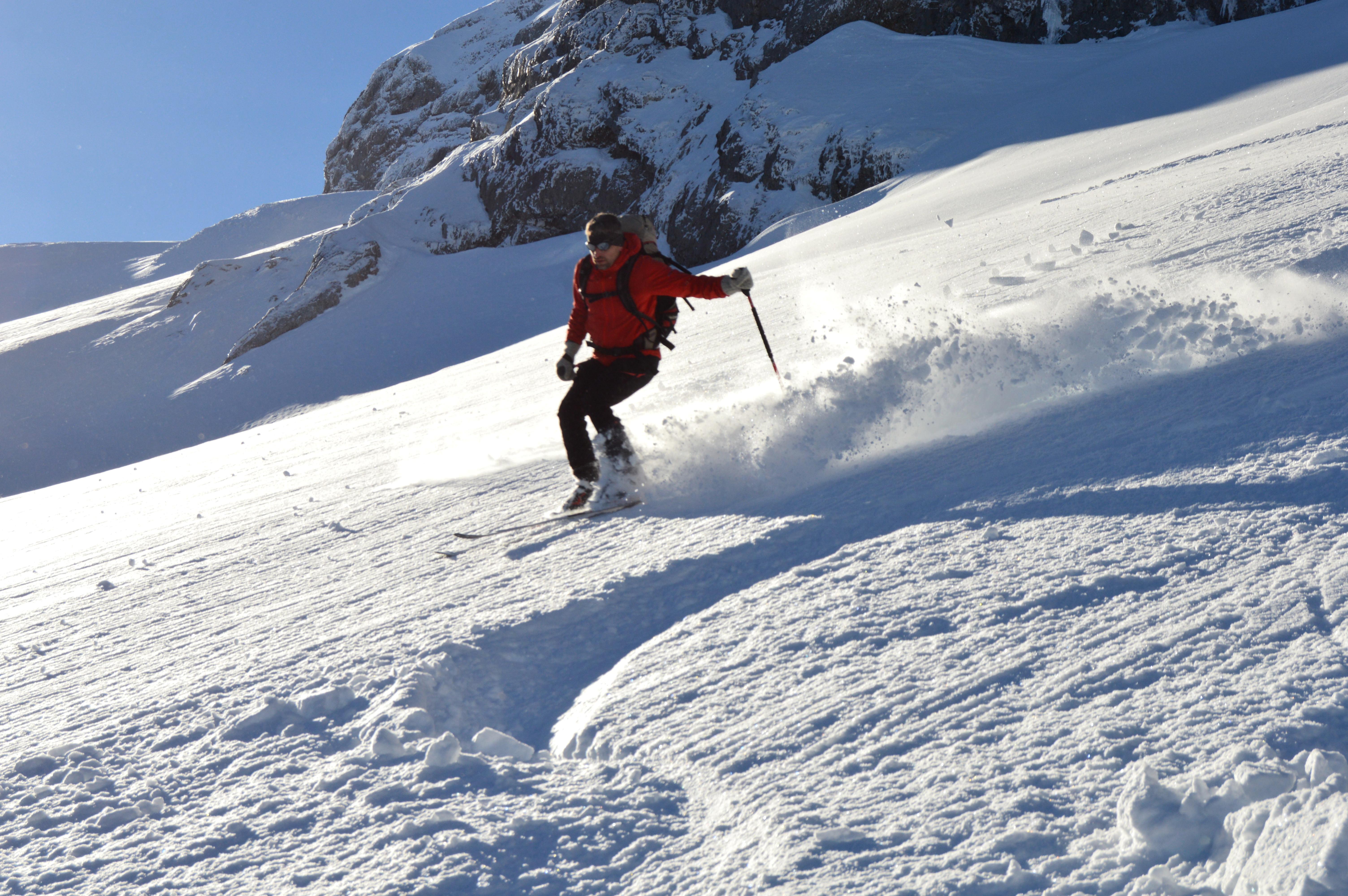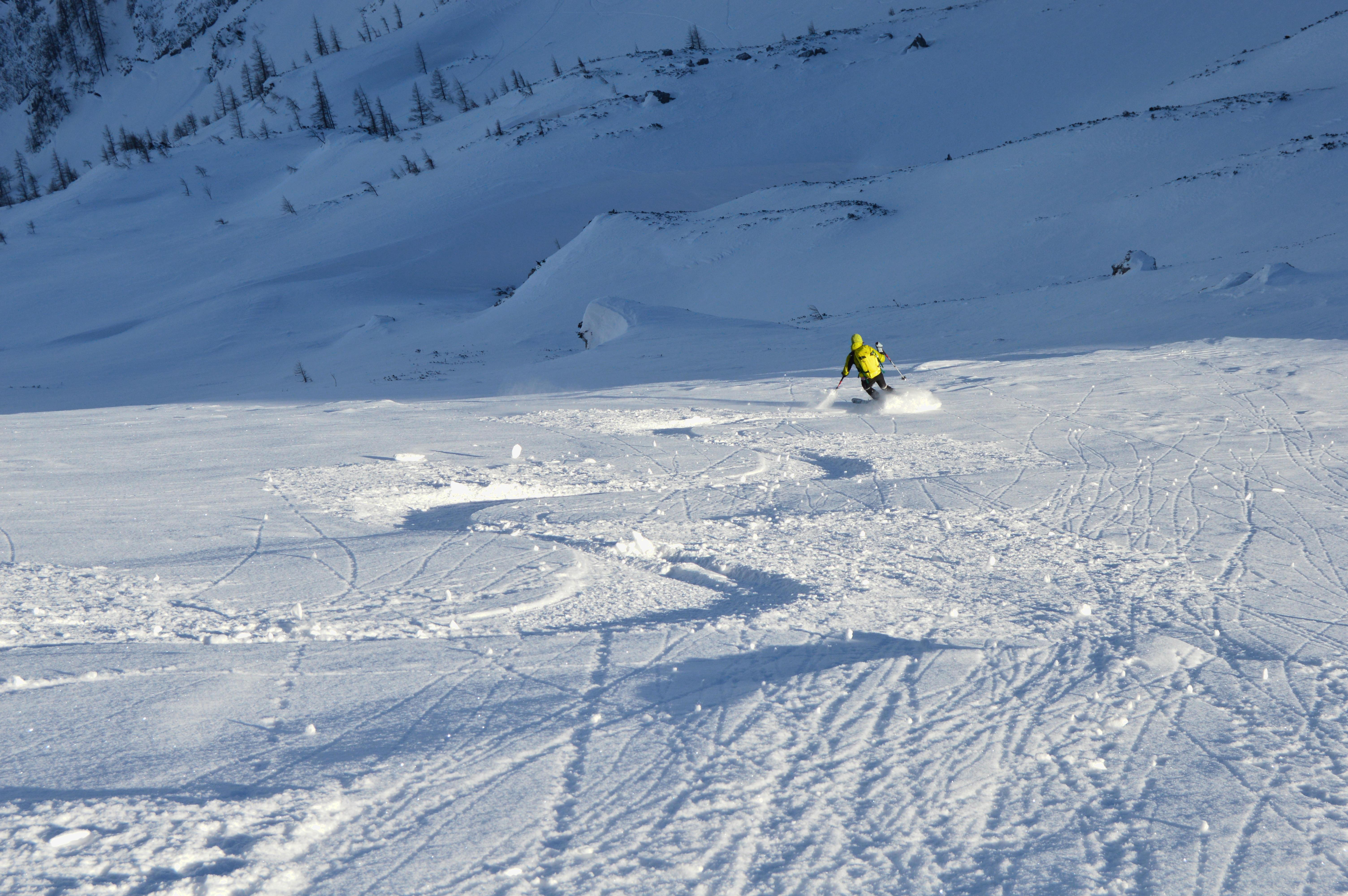 Die Altschneedecke ist sehr kompakt mit einer schönen kalten Pulverauflage. Deutlichere Windspuren waren erst auf dem Plateau zu erkennen, allerdings sehr kleinräumig. Auch bei den Traumhängen der Wies war der Schnee machmal etwas windbehandelt, was aber den Abfahrtsgenuß überhaupt nicht beeinträchtigte.