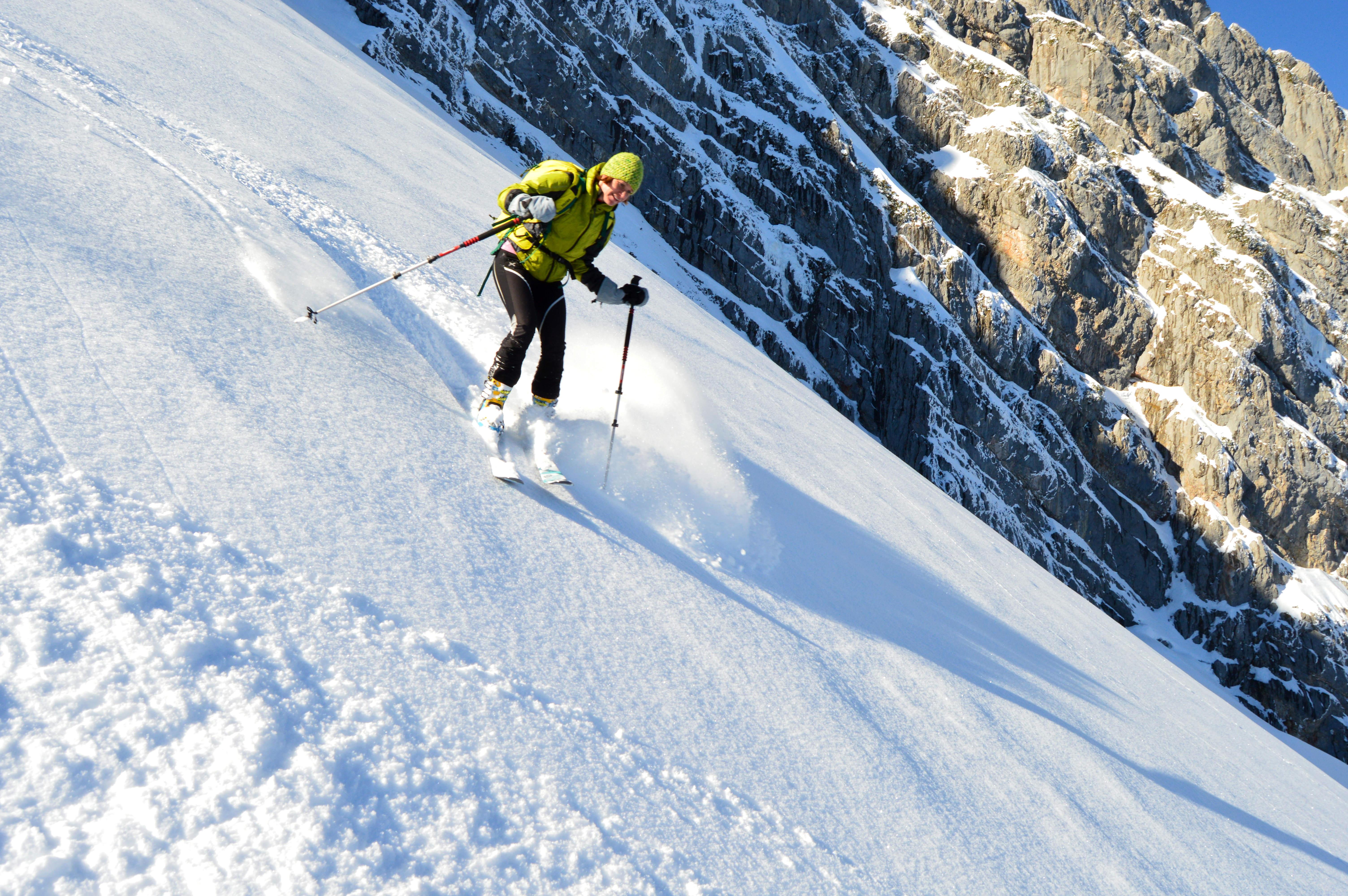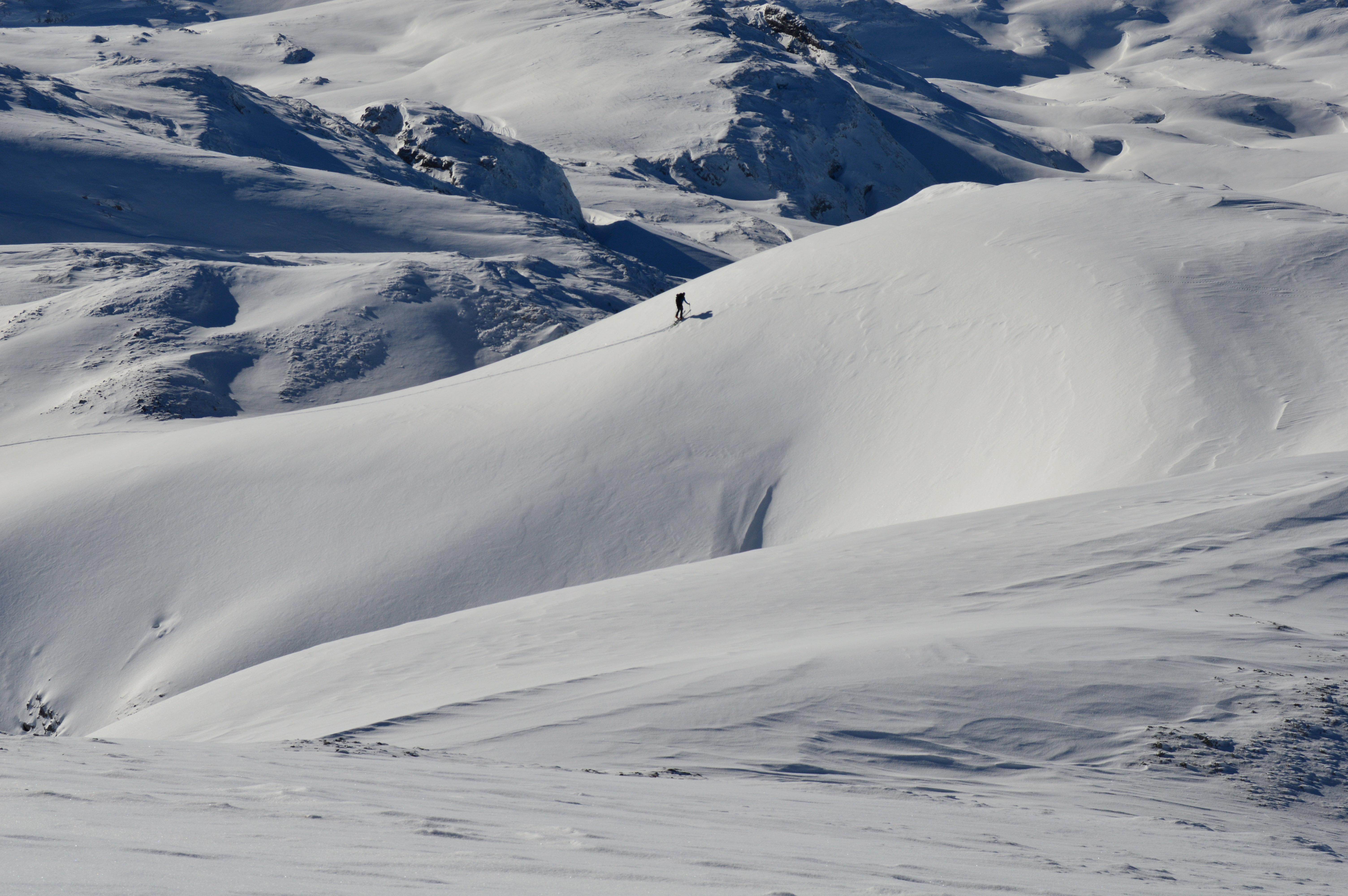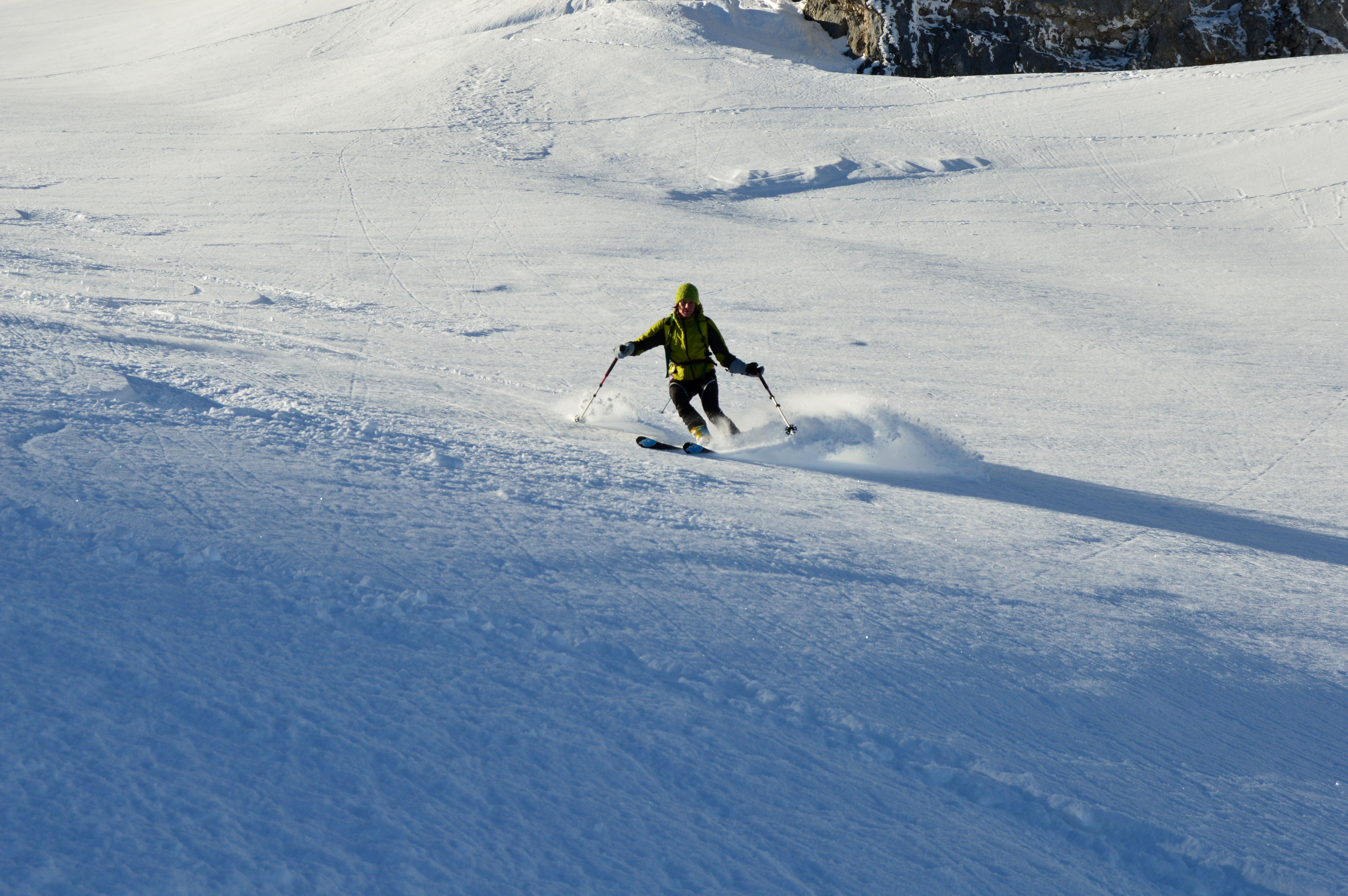 Die Altschneedecke ist sehr kompakt mit einer schönen kalten Pulverauflage. Deutlichere Windspuren waren erst auf dem Plateau zu erkennen, allerdings sehr kleinräumig. Auch bei den Traumhängen der Wies war der Schnee machmal etwas windbehandelt, was aber den Abfahrtsgenuß überhaupt nicht beeinträchtigte.