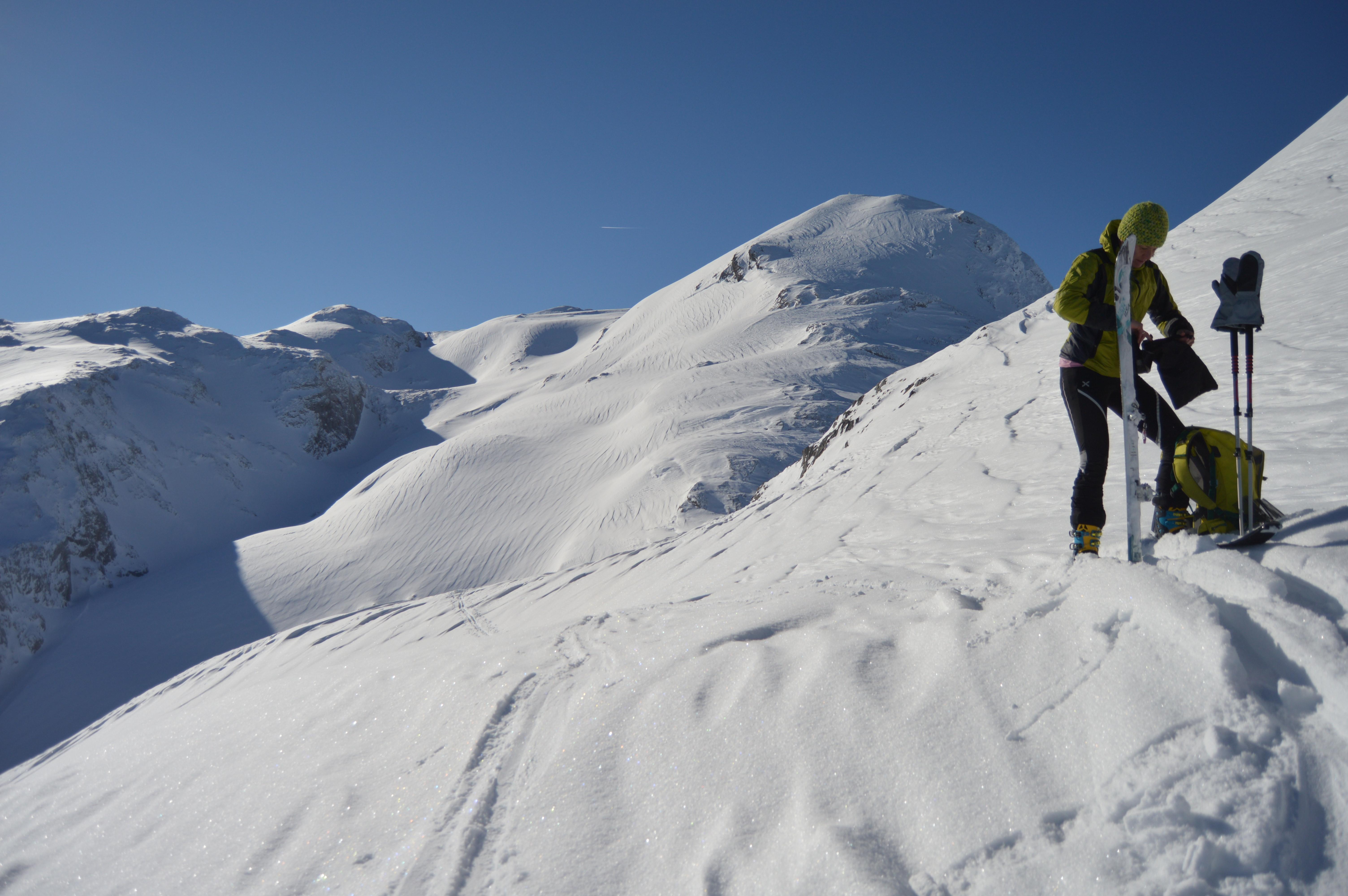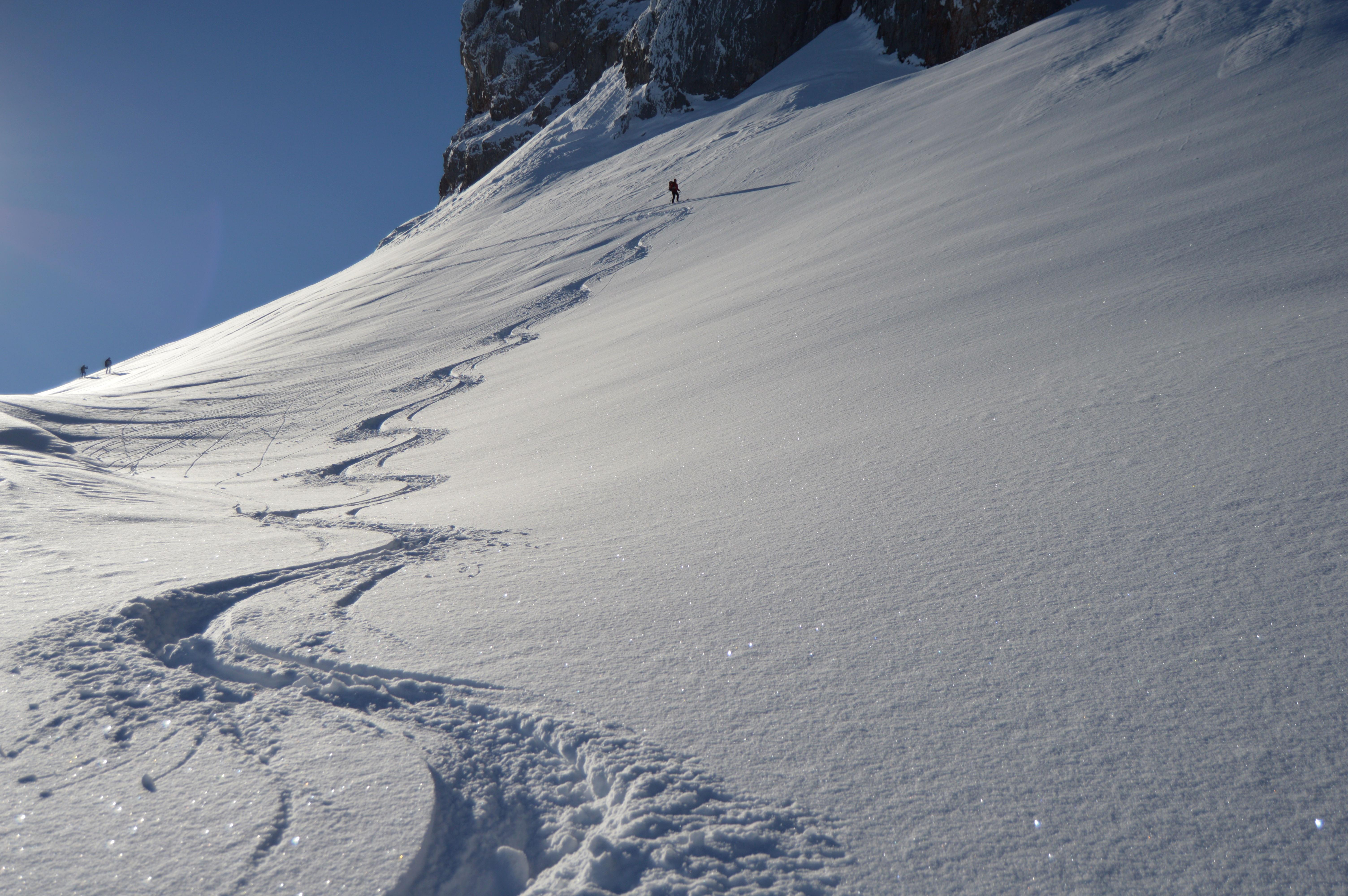 Die Schwer war schon einigermaßen Zerfahren (ca. 15 Spuren zierten bereits das schöne Kar). Deshalb entschlossen wir uns nochmals die Felle auszupacken und spurten zur Einfahrt der Wies.