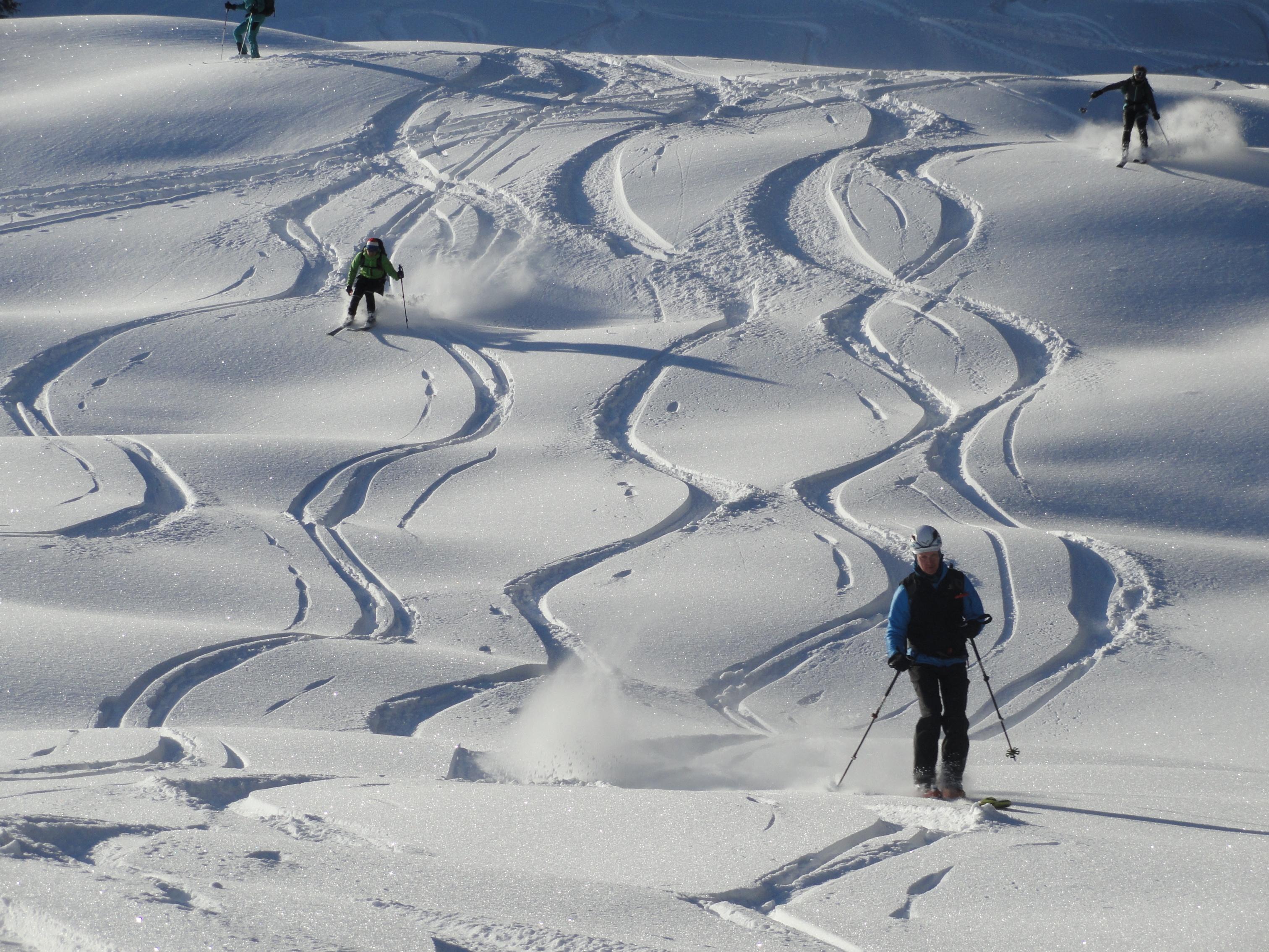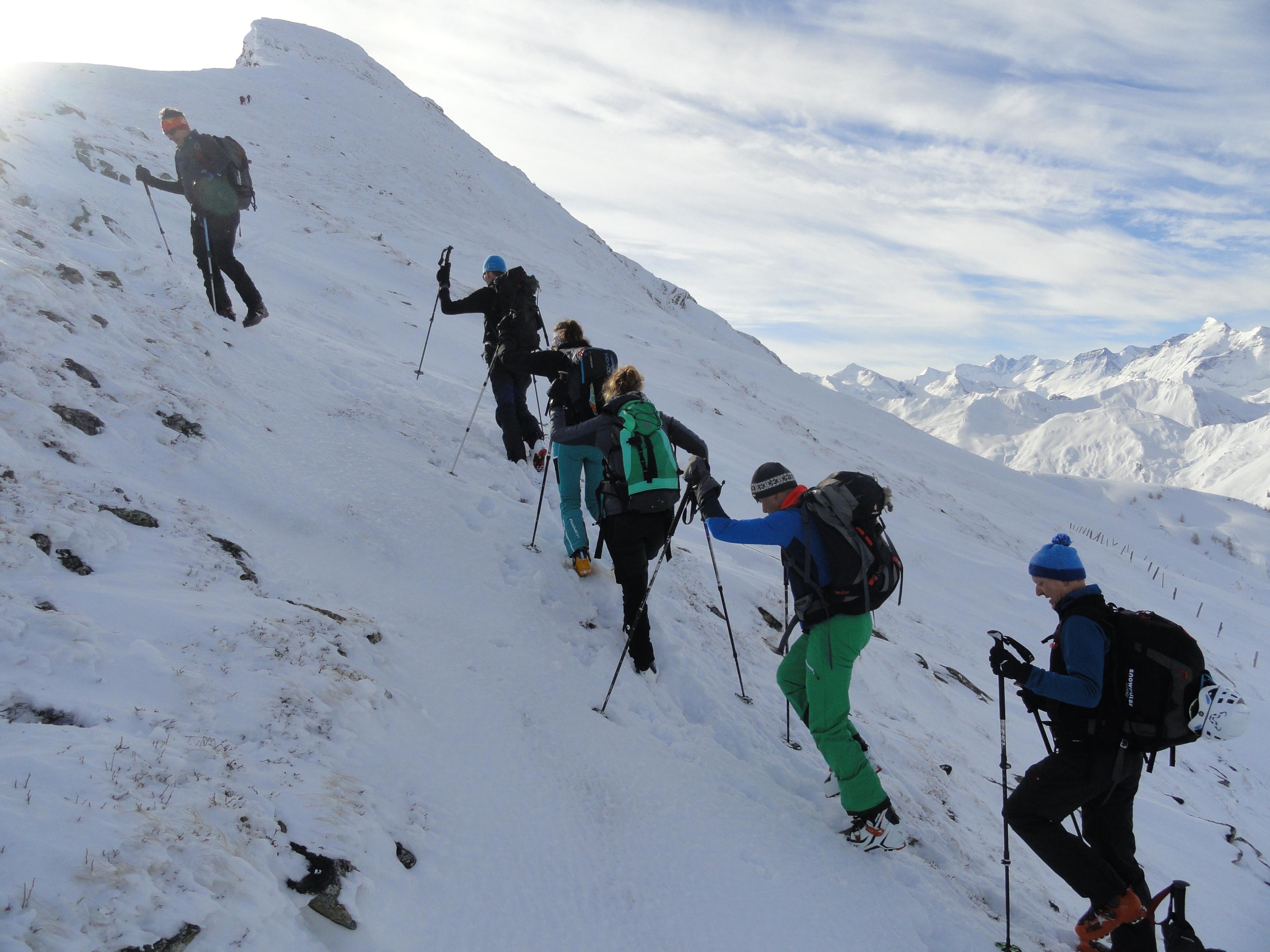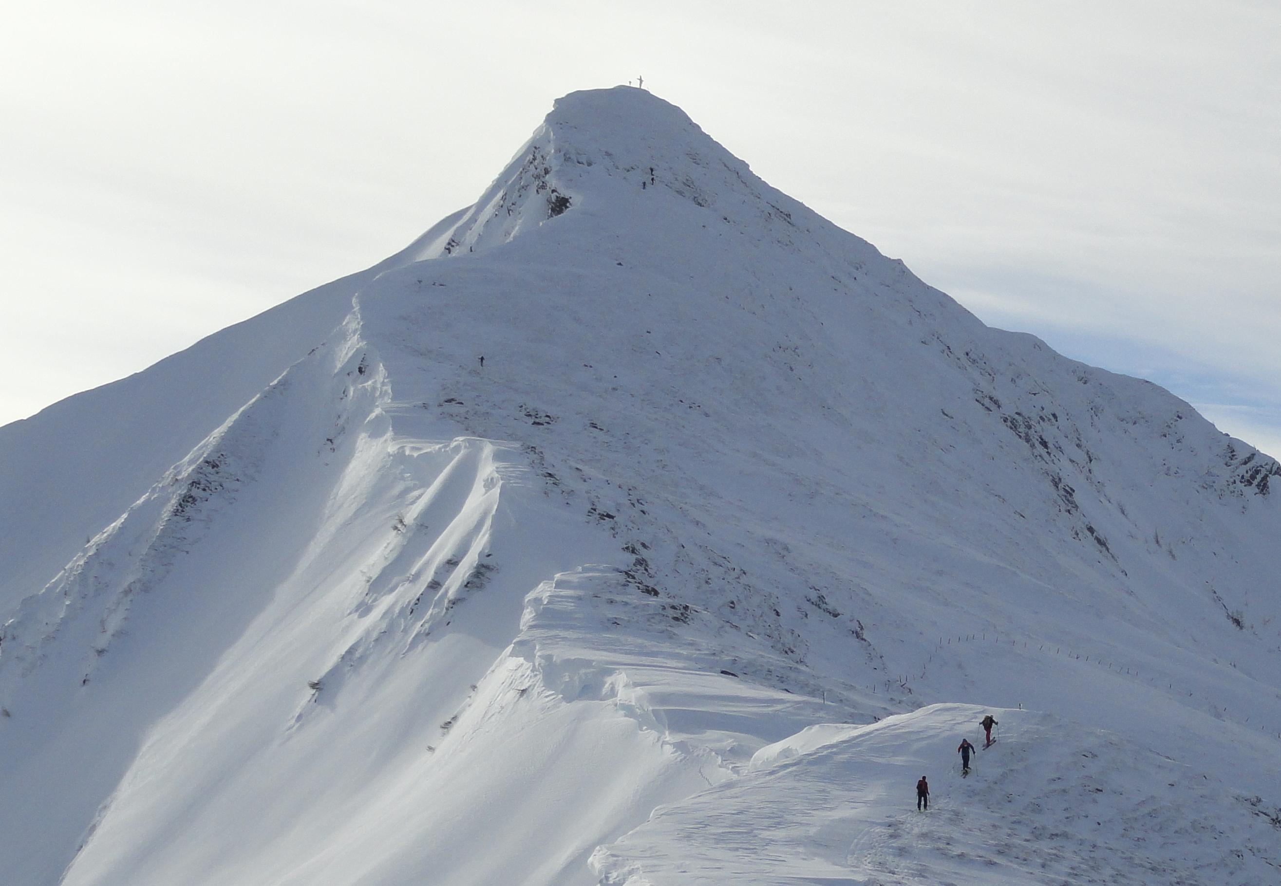 Die ersten 200, ostseitigen Höhenmeter von Ager (892 m) hinauf hatten bereits einen ganz dünnen Schmelzharschdeckel vom Sonnenschein des Vortags. Ansonsten gab es bis auf 2 000 m hinauf eine gut gesetzte Schneedecke mit 20 cm Pulver drauf, sowohl im Wald als auch auf den freien Almwiesen. Der Nordrücken zum Gipfel war auf der Westseite stark abgeweht und daher ostseitig gewaltig überwechtet. Zuerst ging's noch mit Harscheisen und dann per Stapfen zum Gipfel.