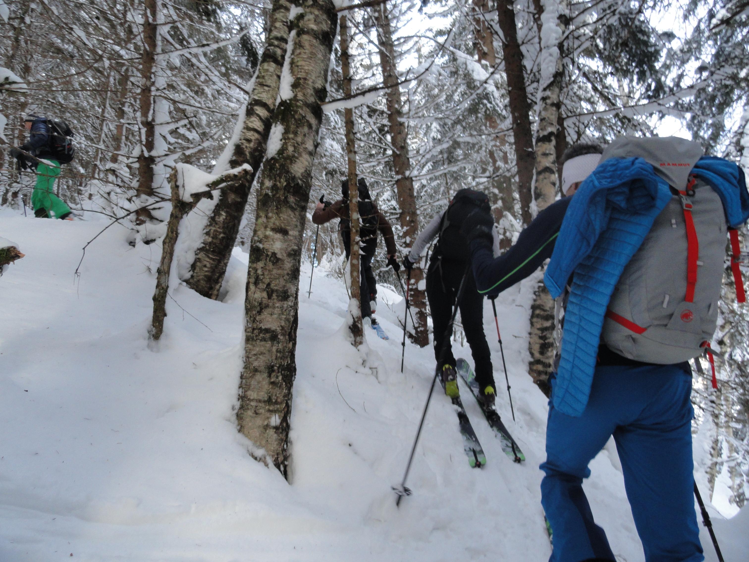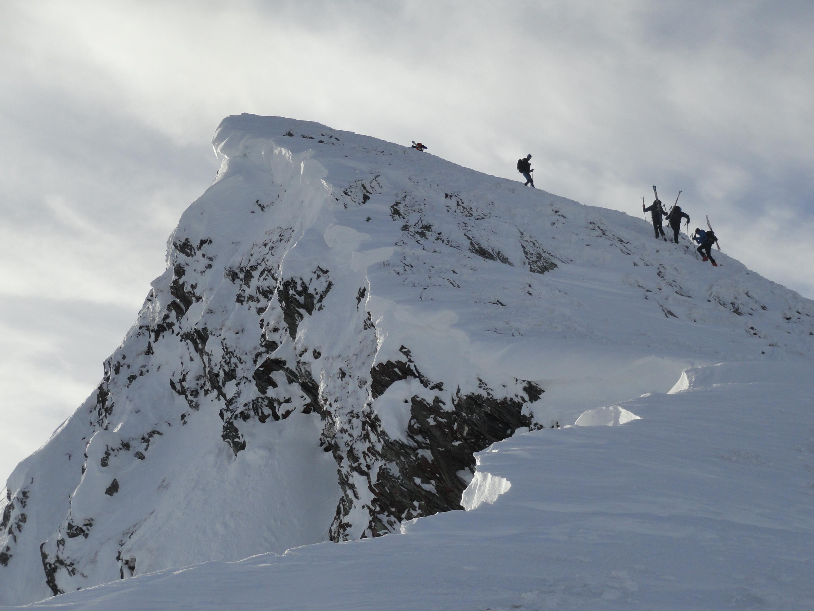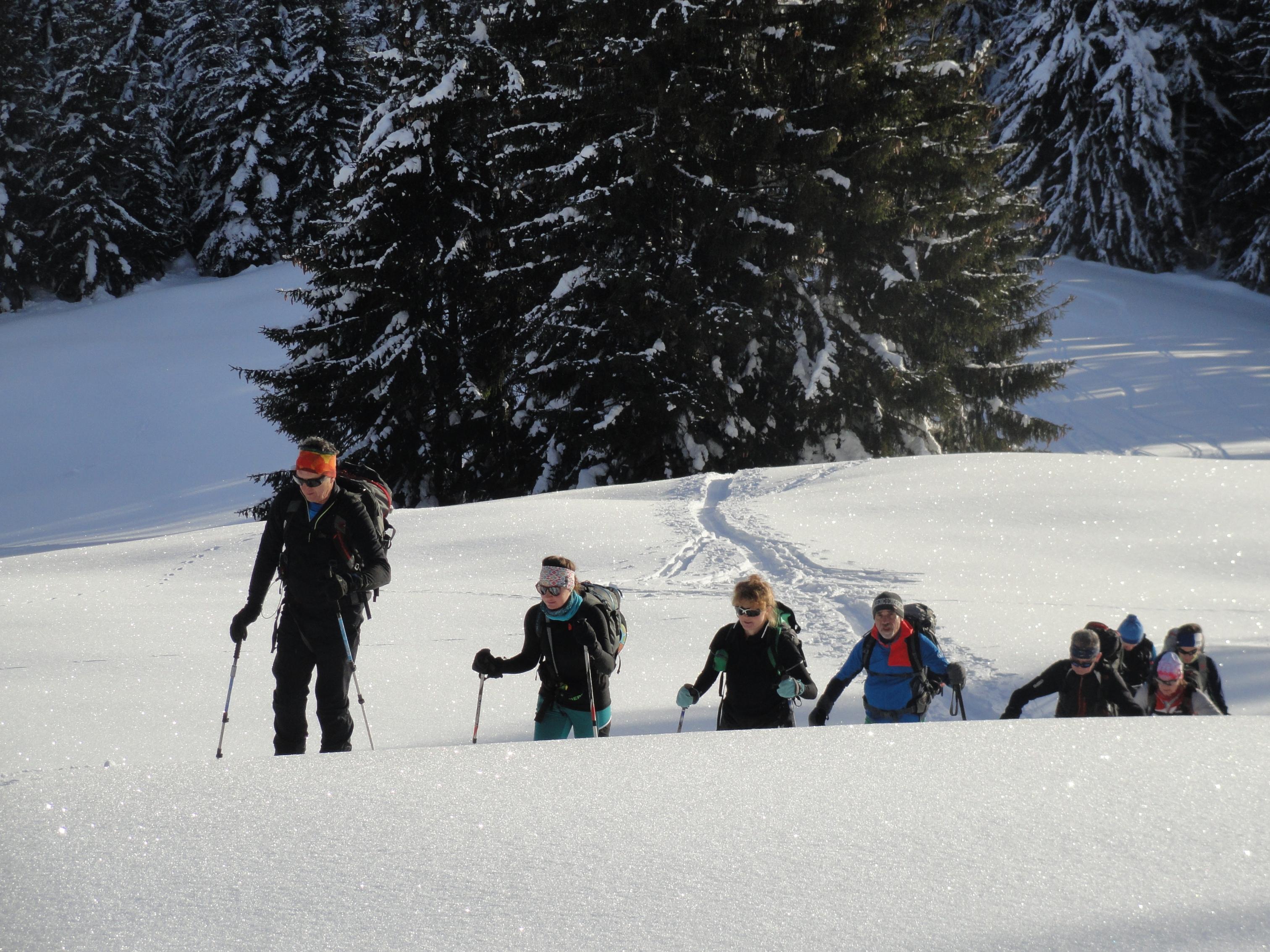 Die ersten 200, ostseitigen Höhenmeter von Ager (892 m) hinauf hatten bereits einen ganz dünnen Schmelzharschdeckel vom Sonnenschein des Vortags. Ansonsten gab es bis auf 2 000 m hinauf eine gut gesetzte Schneedecke mit 20 cm Pulver drauf, sowohl im Wald als auch auf den freien Almwiesen. Der Nordrücken zum Gipfel war auf der Westseite stark abgeweht und daher ostseitig gewaltig überwechtet. Zuerst ging's noch mit Harscheisen und dann per Stapfen zum Gipfel.