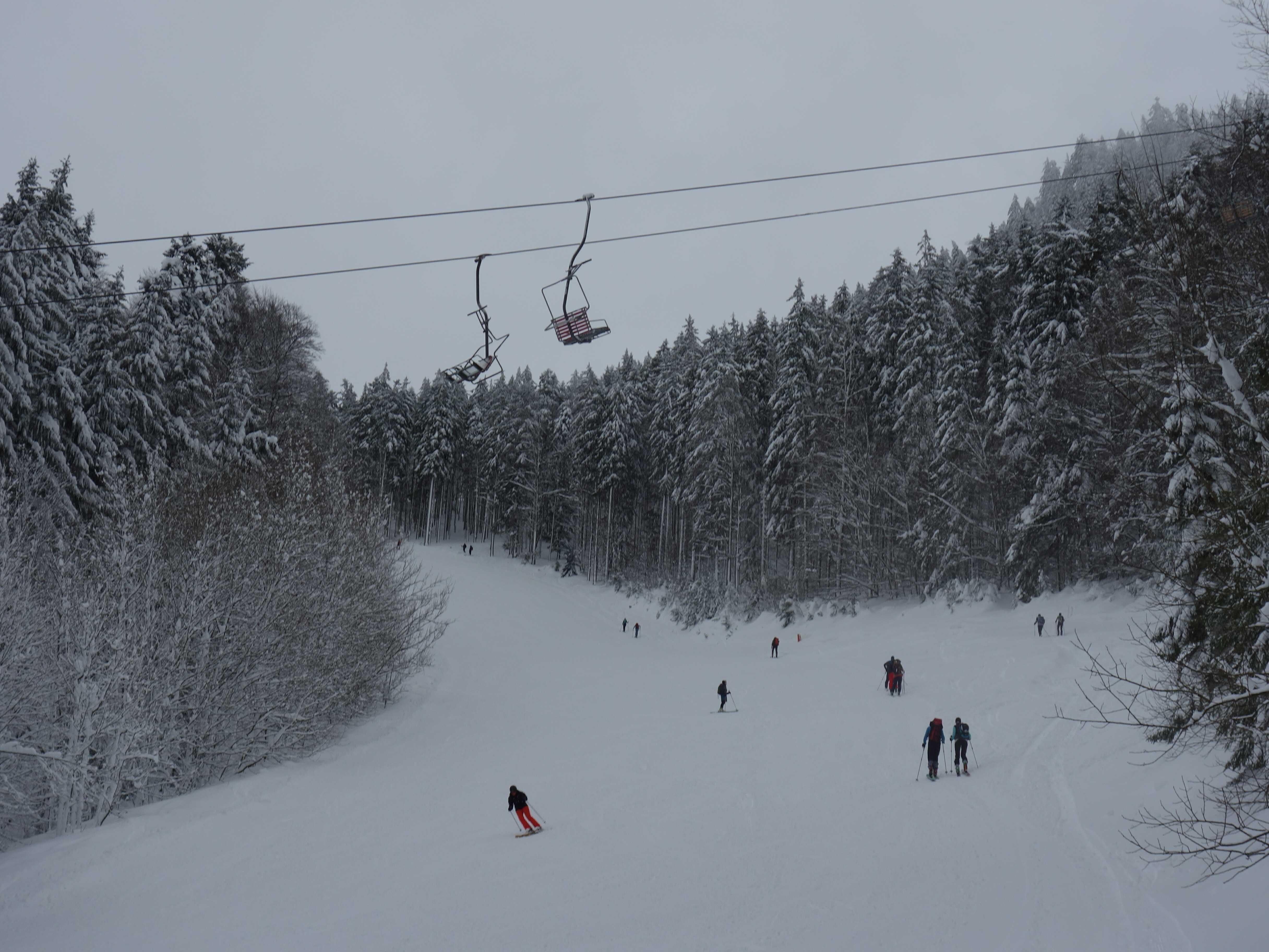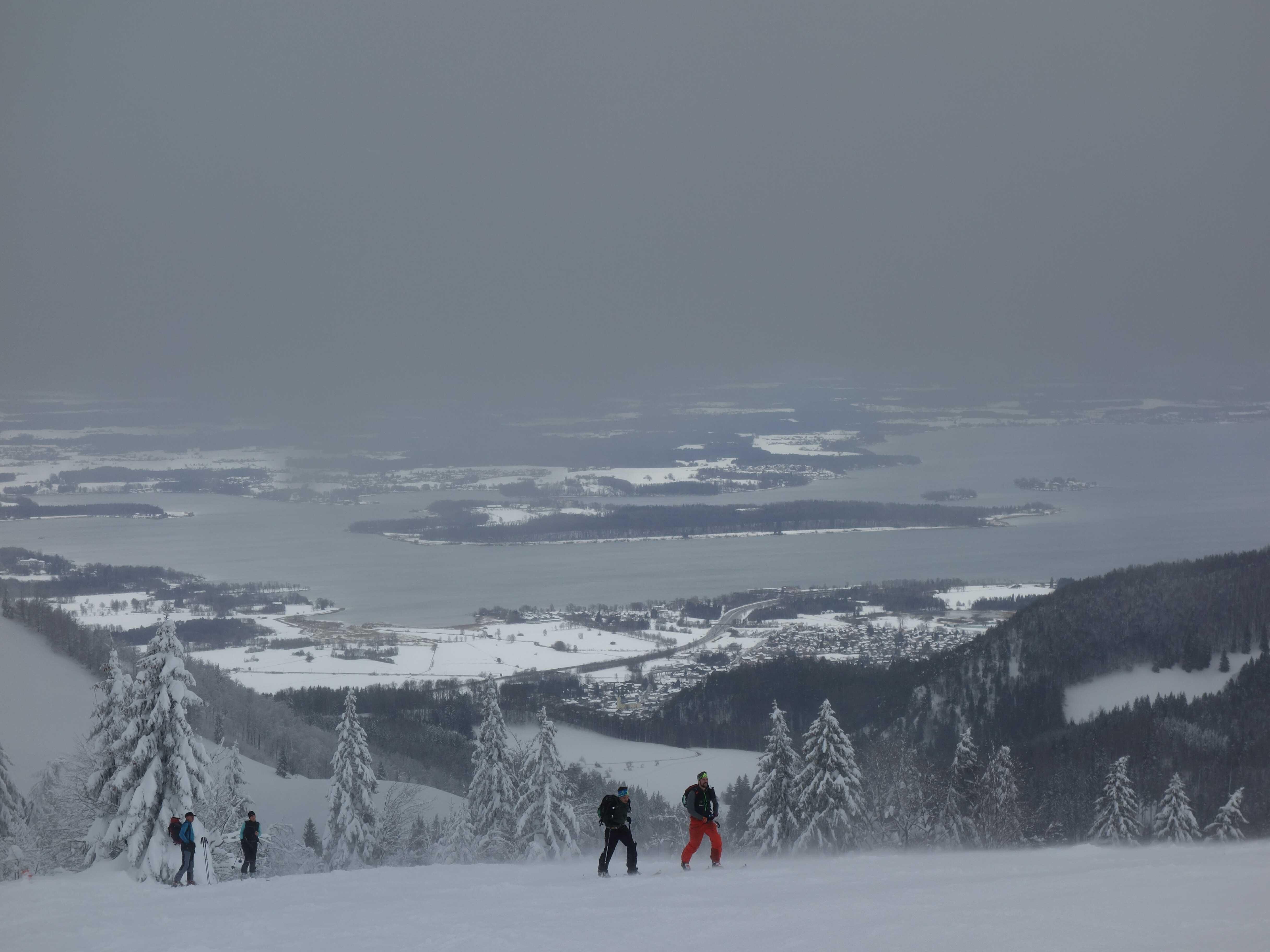 Heute den Verhältnissen angepasst eine Pistentour auf die Kampenwand. Mehr Tourengeher als Pistler. Steinlingalm geschlossen, Gorialm offen und gut eingeheizt. Wetter wie vorhergesagt, vormittags ganz passabel, nachmittag stürmisch bei steigenden Temperaturen. Unterhalb Kaltwasserlift Pappschnee, aber alle Pisten sehr gut fahrbar.