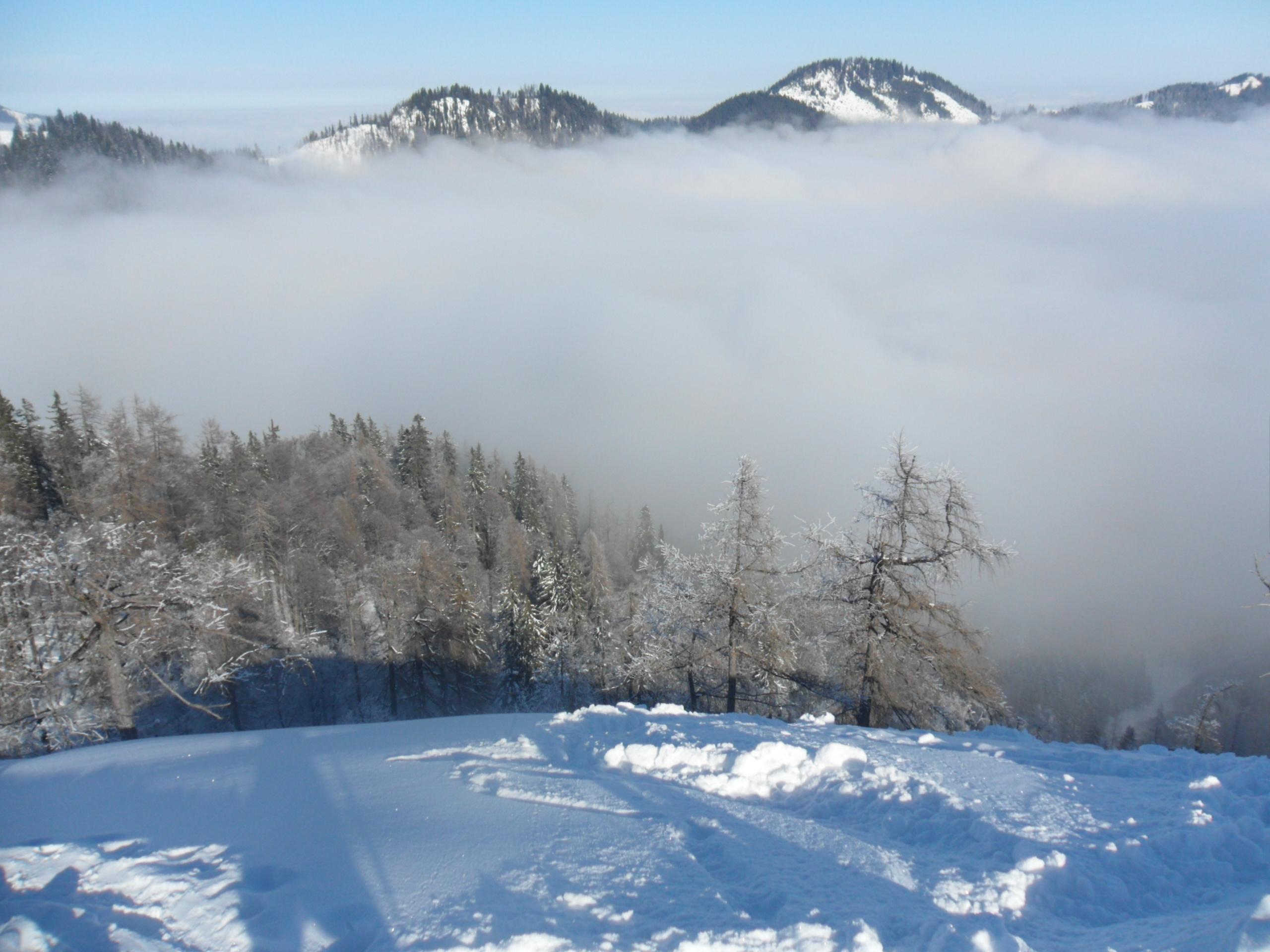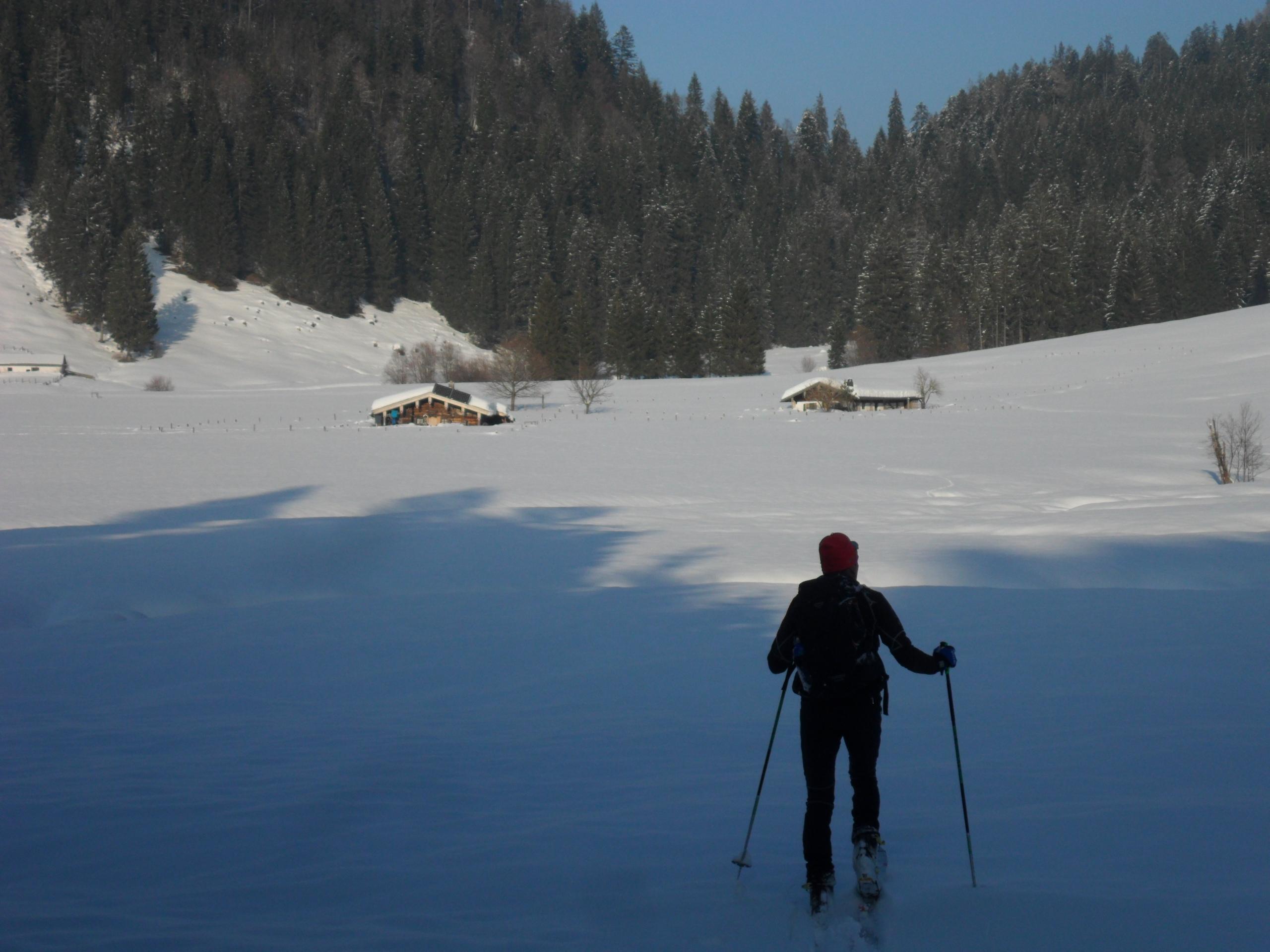 Dass die Tour lange ist, habe ich spätestens beim Aufstieg zur Hörndlalm gemerkt, als ich innerlich zig mal geflucht habe, auch begünstigt durch mehrmaliges Abrutschen mit den Skiern auf der glatten Harschschicht unter dem Neuschnee. War dann aber doch überrascht, als das GPS vom Andi auf der Hörndlalm 1900 Hm angezeigt hatte. Ja ja, auch in den Chiemgauern kann man sich verausgaben.