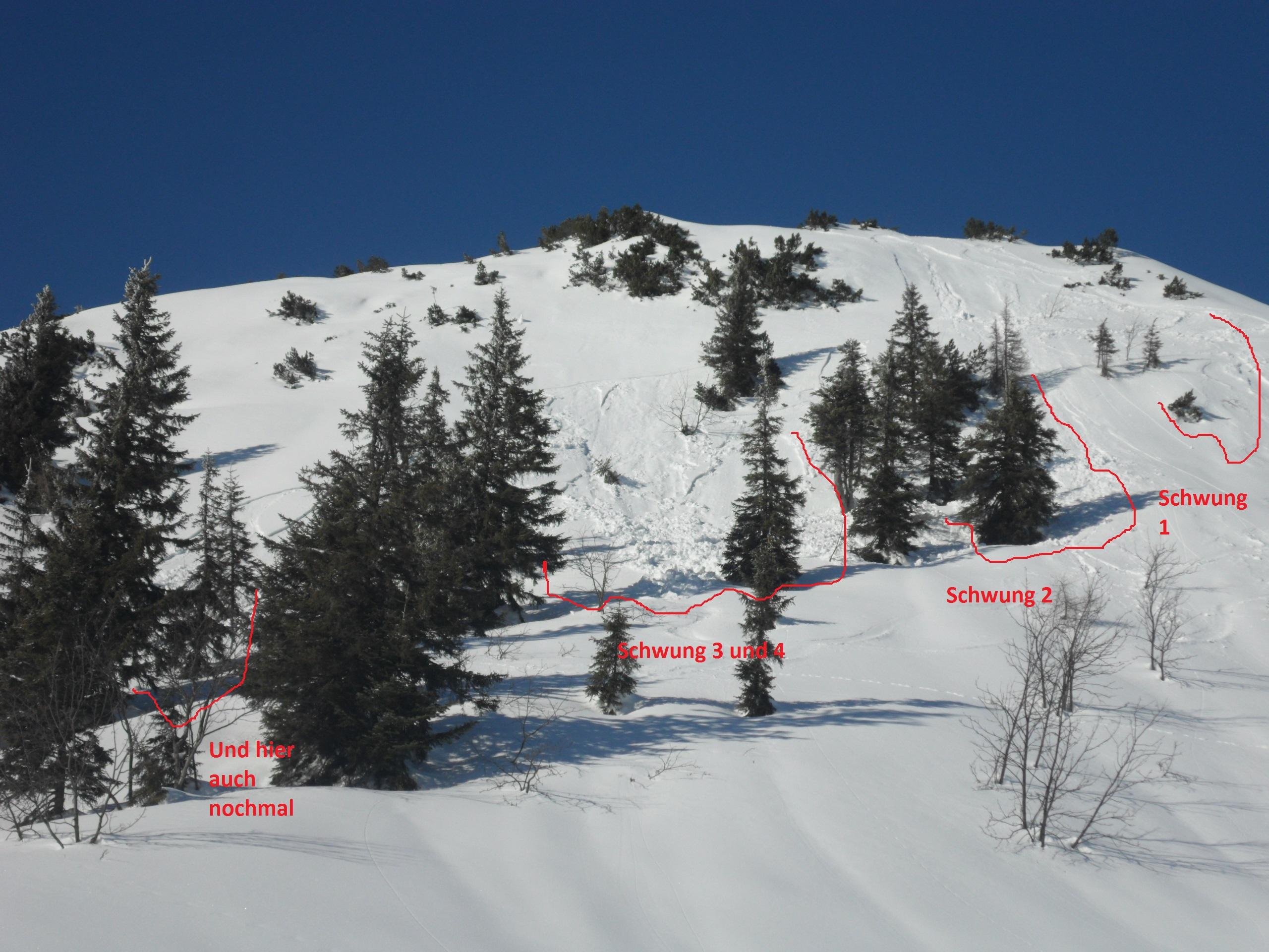 Der Andi hat beim queren von dem Hang ( Gurnwandkopf südseitig runter ) praktisch mit jedem Schwung eine kleine Lawine ausgelöst. Die eine hat ihn sogar fast wieder eingeholt. Und theoretisch ist das bei etwas mehr Neuschnee und weiteren Hängen sogar äußerst gefährlich. Heute bei den Gegebenheiten aber lediglich ein kleiner Wachrüttler. Auch in flacheren Bereichen hat man südseitig unter dem Ski richtig gespürt, wie nervös der Schnee auf der Harschschicht liegt.