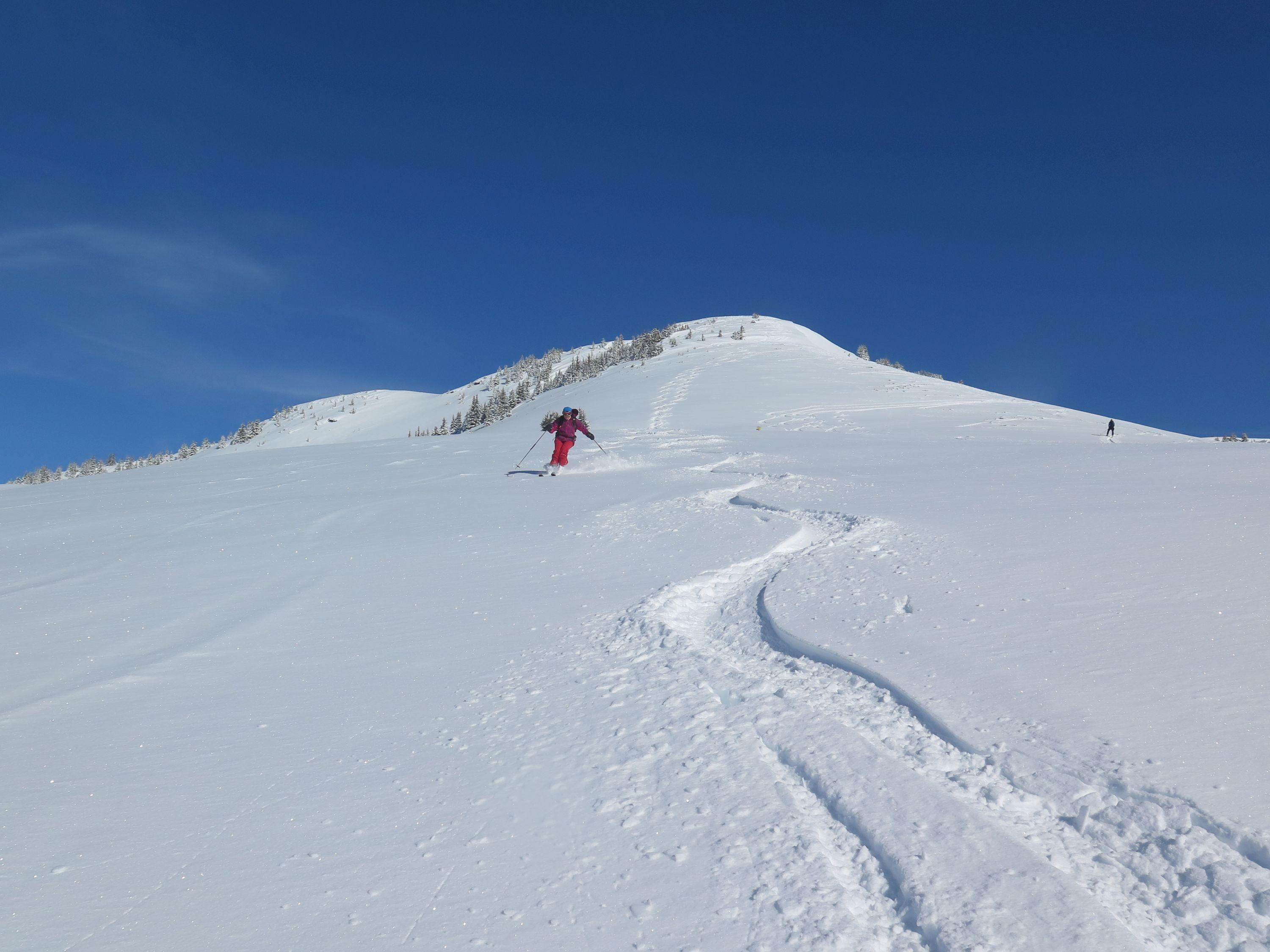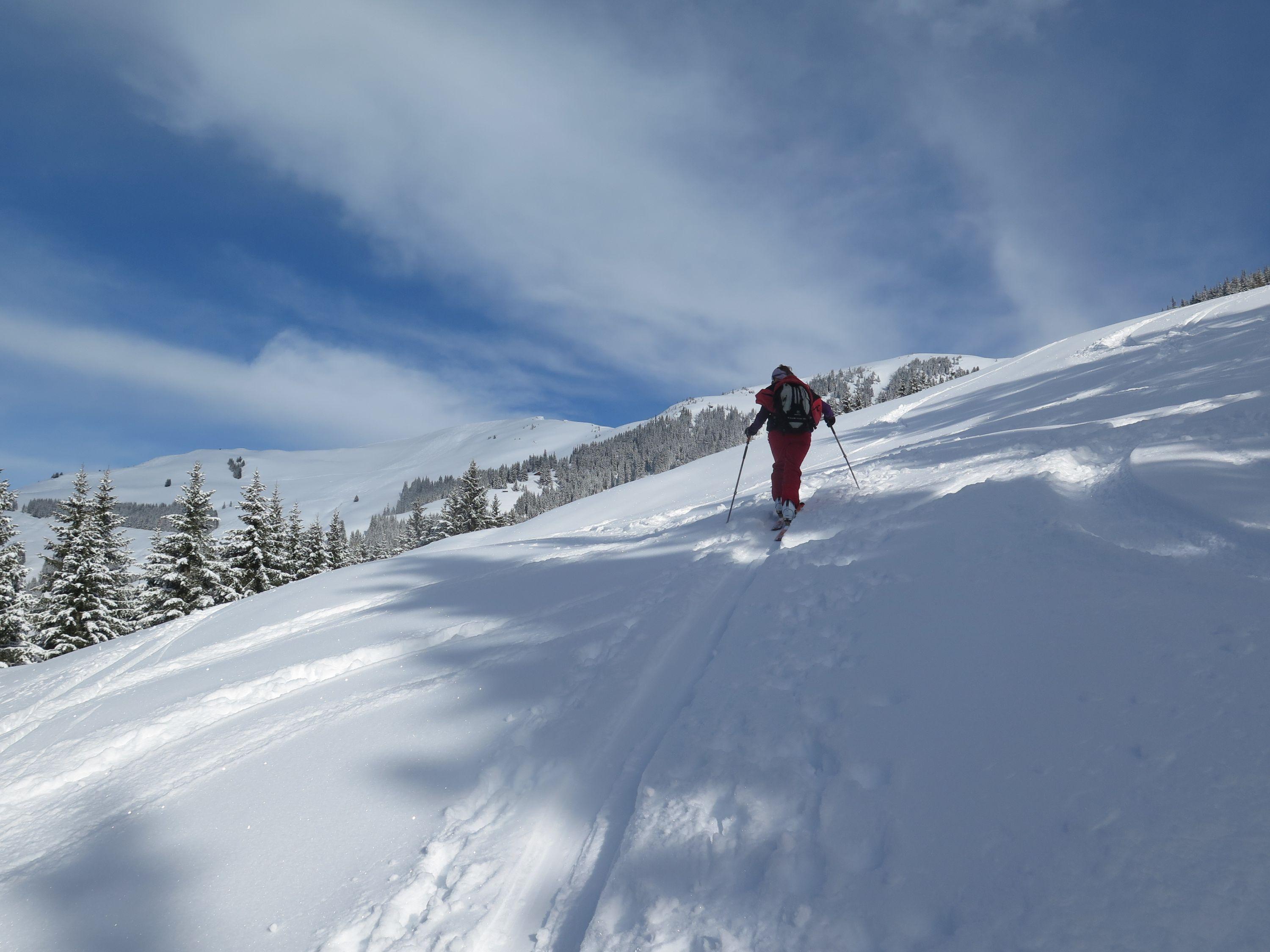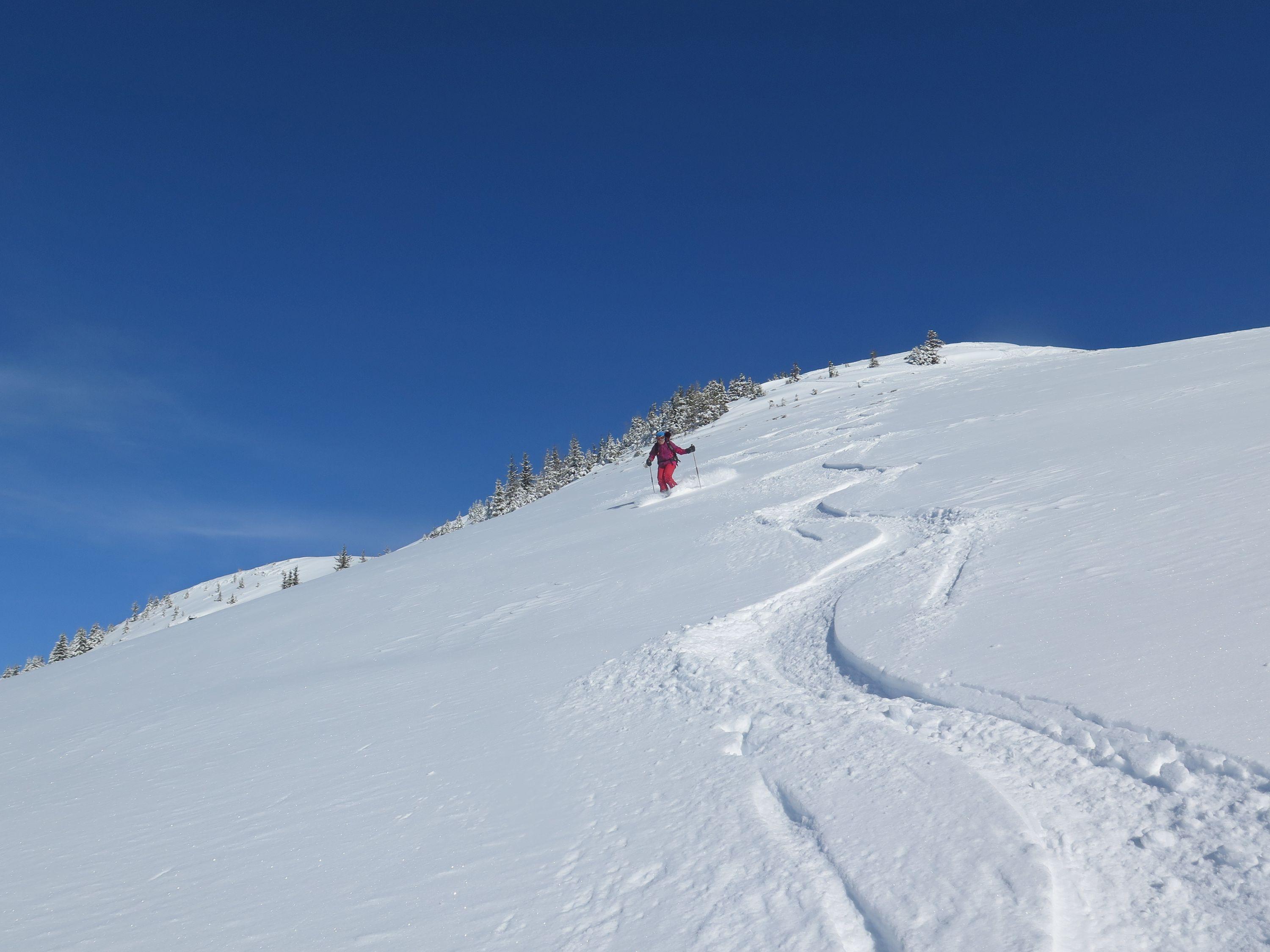 Über der Waldgrenze ca 15cm Pulver auf festem Harschdeckel, in der Waldpassage magere Schneedecke, im unterem Teil macht sich die Sonneneinstrahlung in der Schneequalität schon bemerkbar,