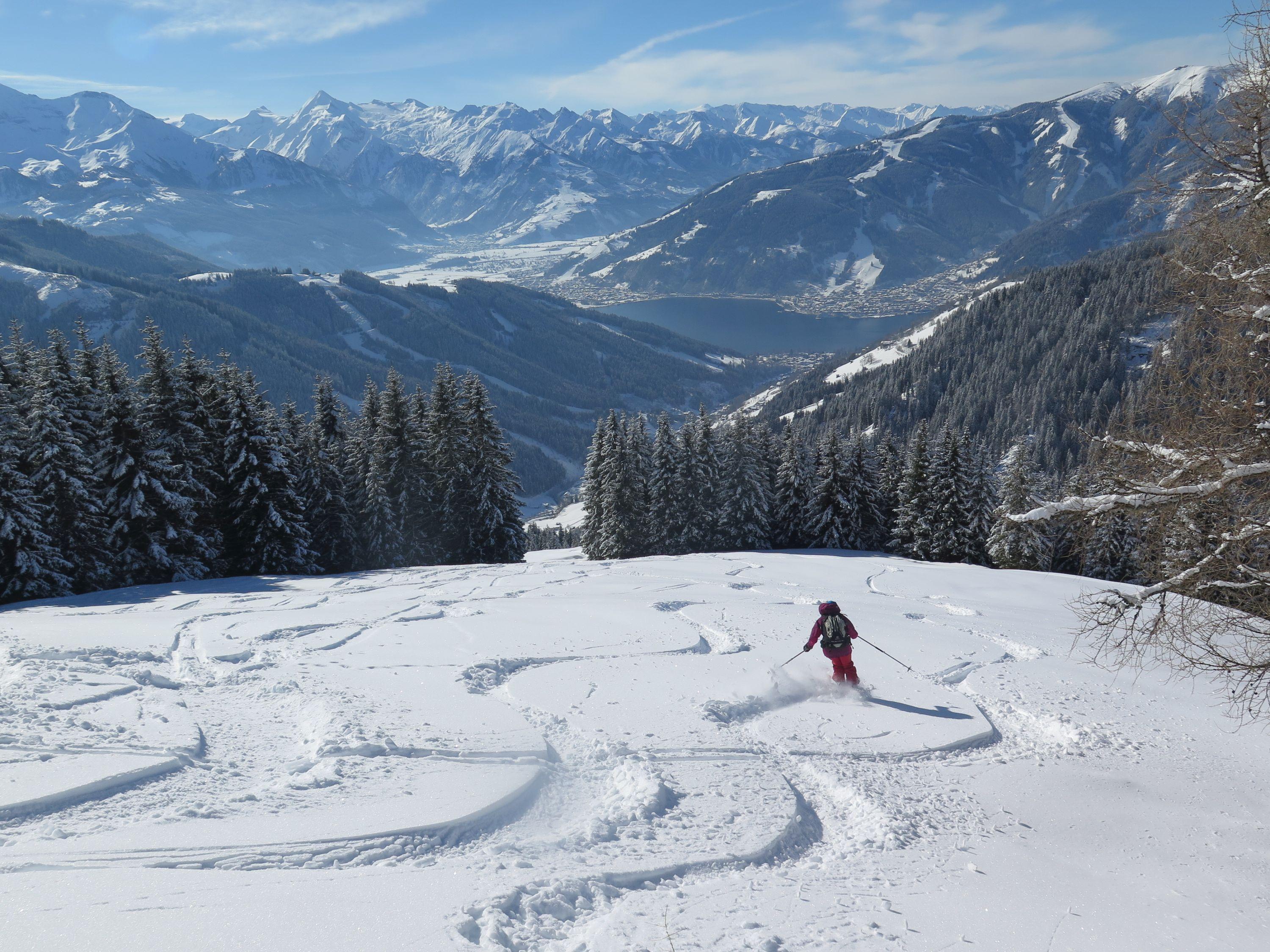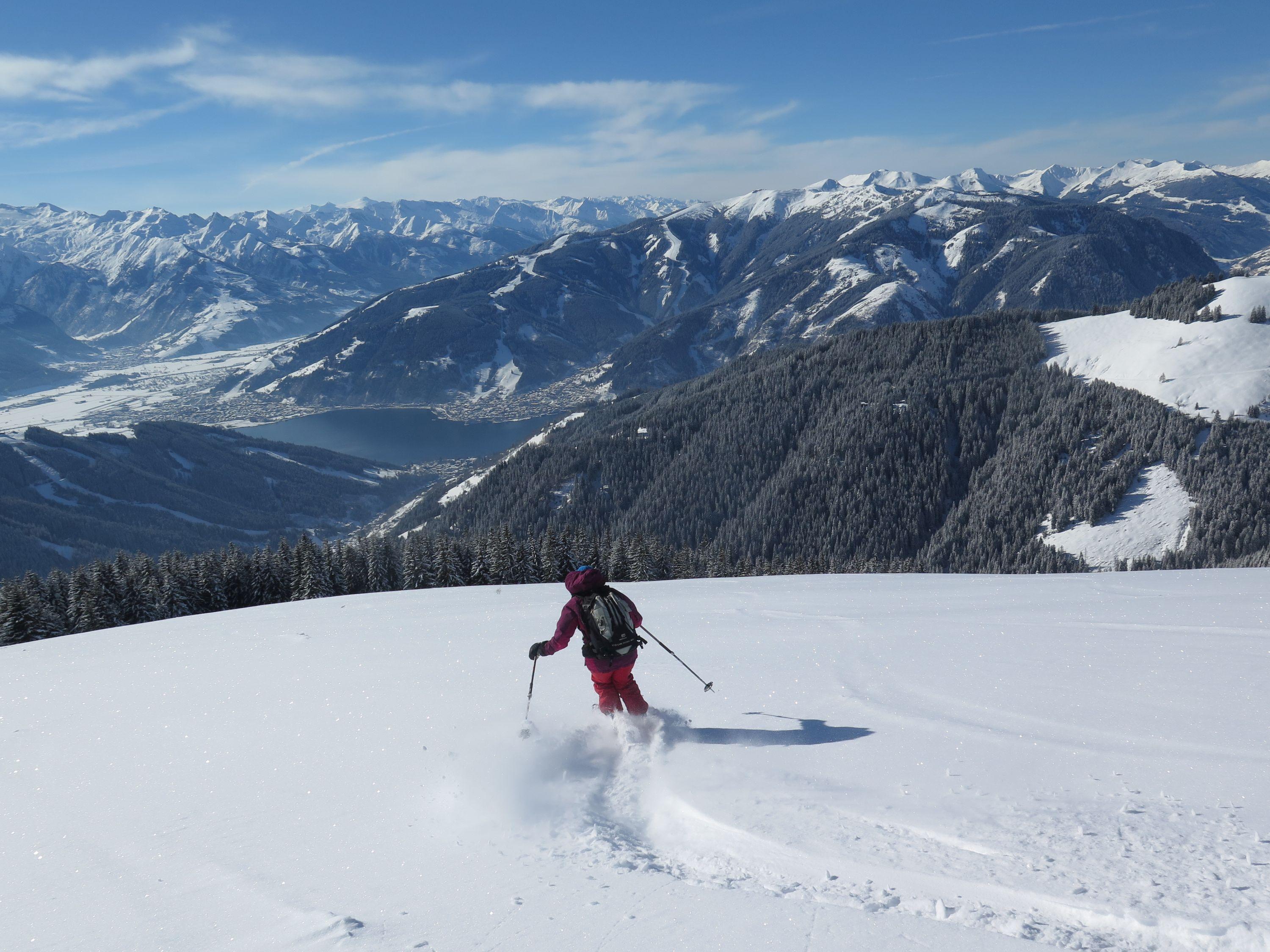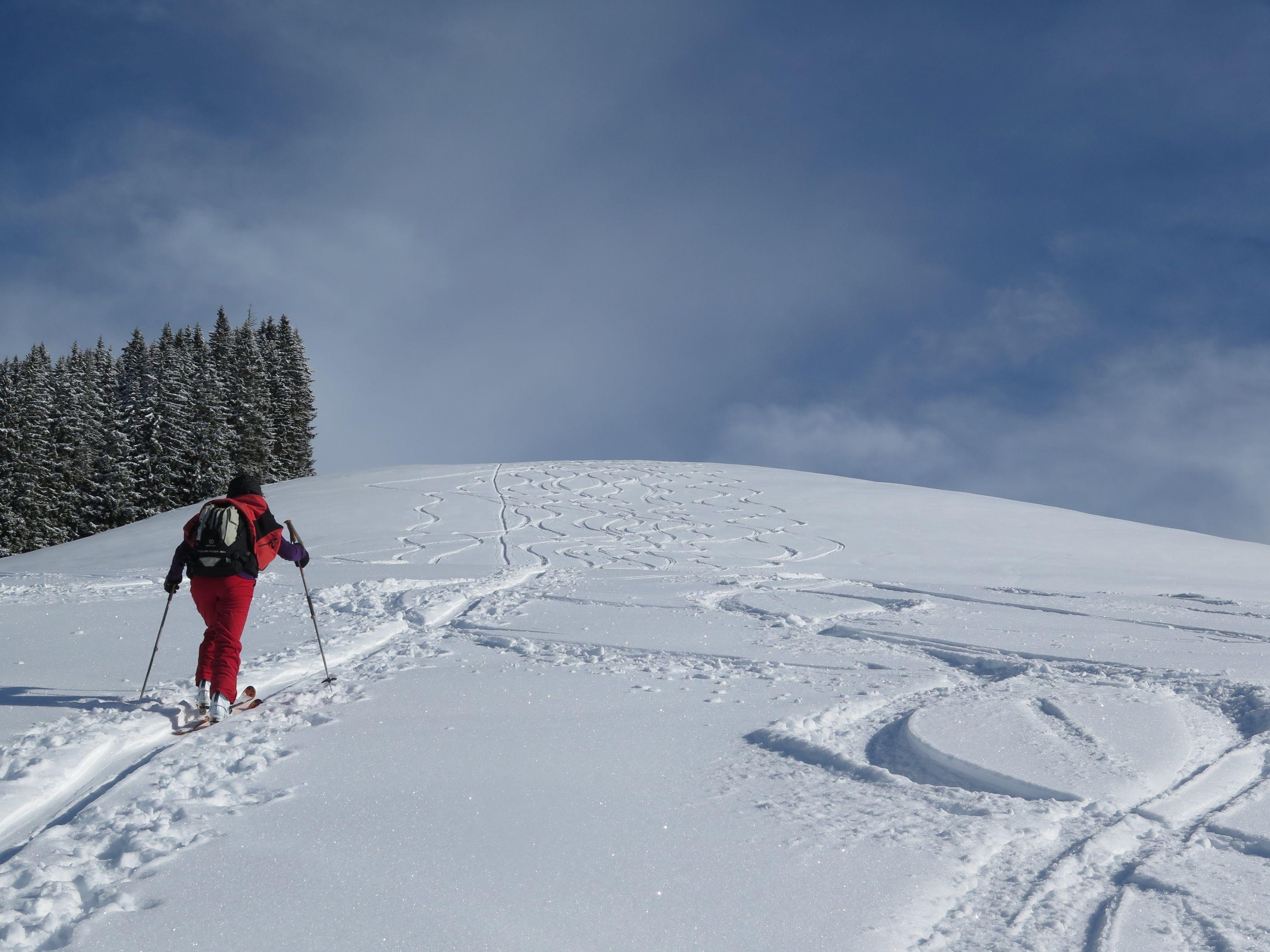 Über der Waldgrenze ca 15cm Pulver auf festem Harschdeckel, in der Waldpassage magere Schneedecke, im unterem Teil macht sich die Sonneneinstrahlung in der Schneequalität schon bemerkbar,