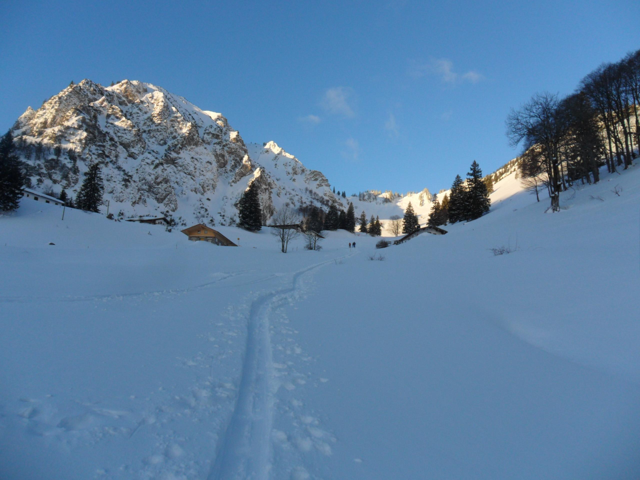 Die Bedingungen waren heute dafür um so besser. 20 cm Pulver von unten bis oben. Nach obenhin war der Schnee leicht windbehandelt. Von den Top Bedingungen ausgenommen der Gipfelhang ( ca. von den letzten Wegweisern weg 100m unterhalb vom Gipfel ). Dort hatte es blankes Eis mit ein paar wenigen Einwehungen drin.