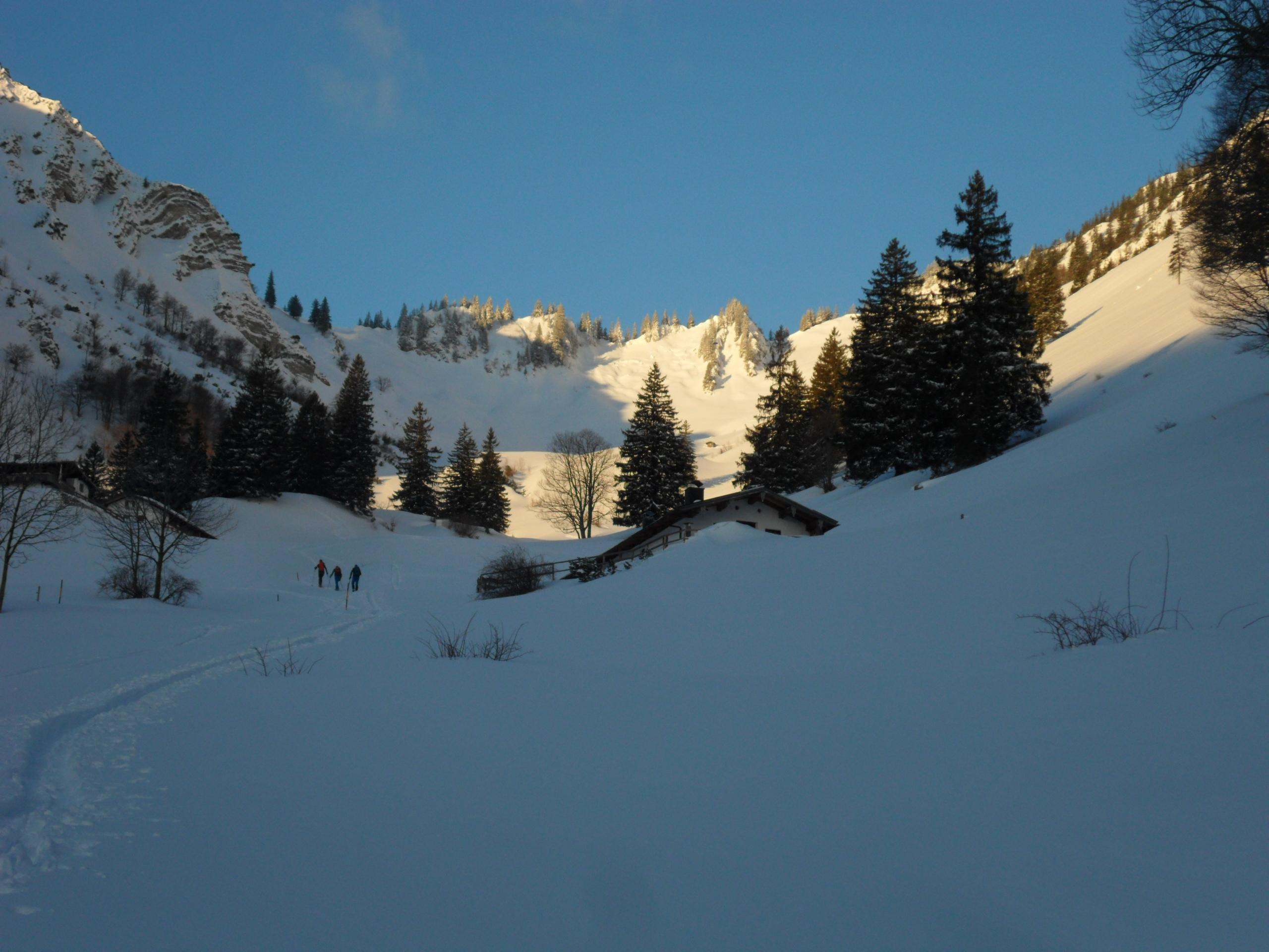 Die Ski haben wir von dort an auf den Rucksack geschnallt und sind zu Fuss weiter. Skifahrerisch hat sich das nicht ausgezahlt, aber schon wieder umkehren wollte ich diesmal nicht ;). Ein Sturz hätte am obersten Hang wohl einige Blessuren zur Folge gehabt. Die Meisten sind auch bei den Wegweisern umgekehrt.