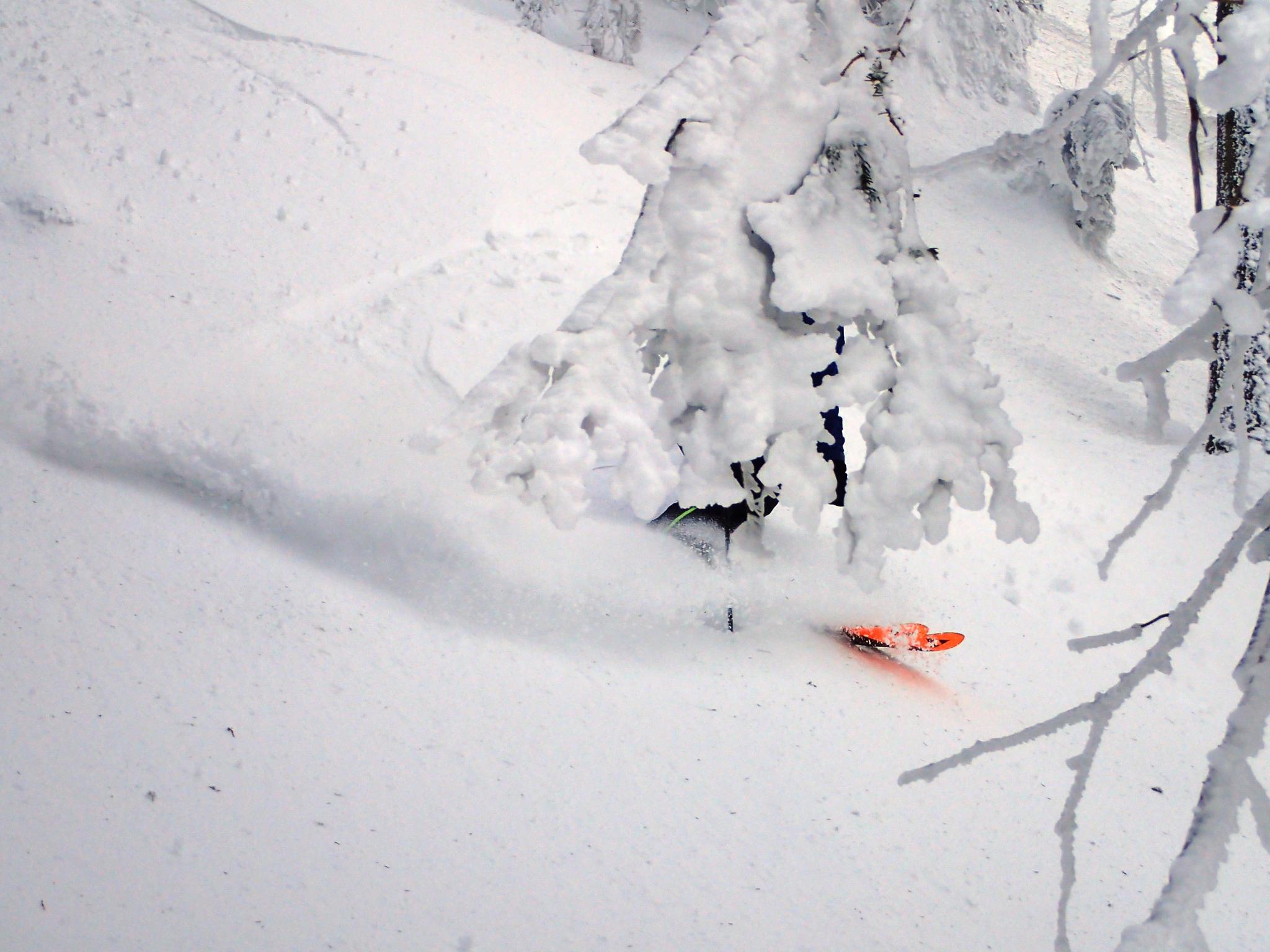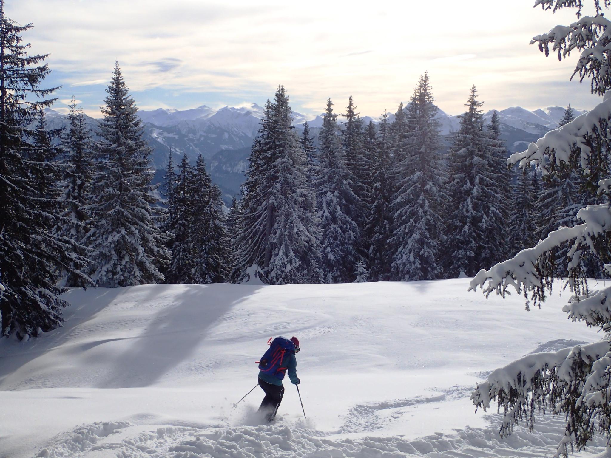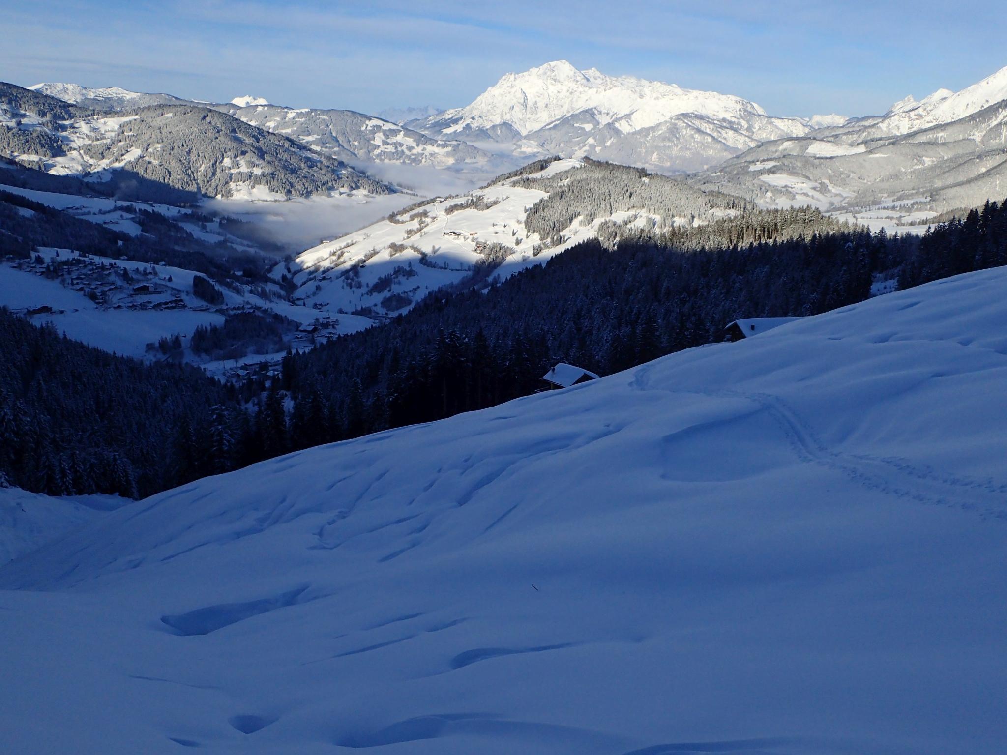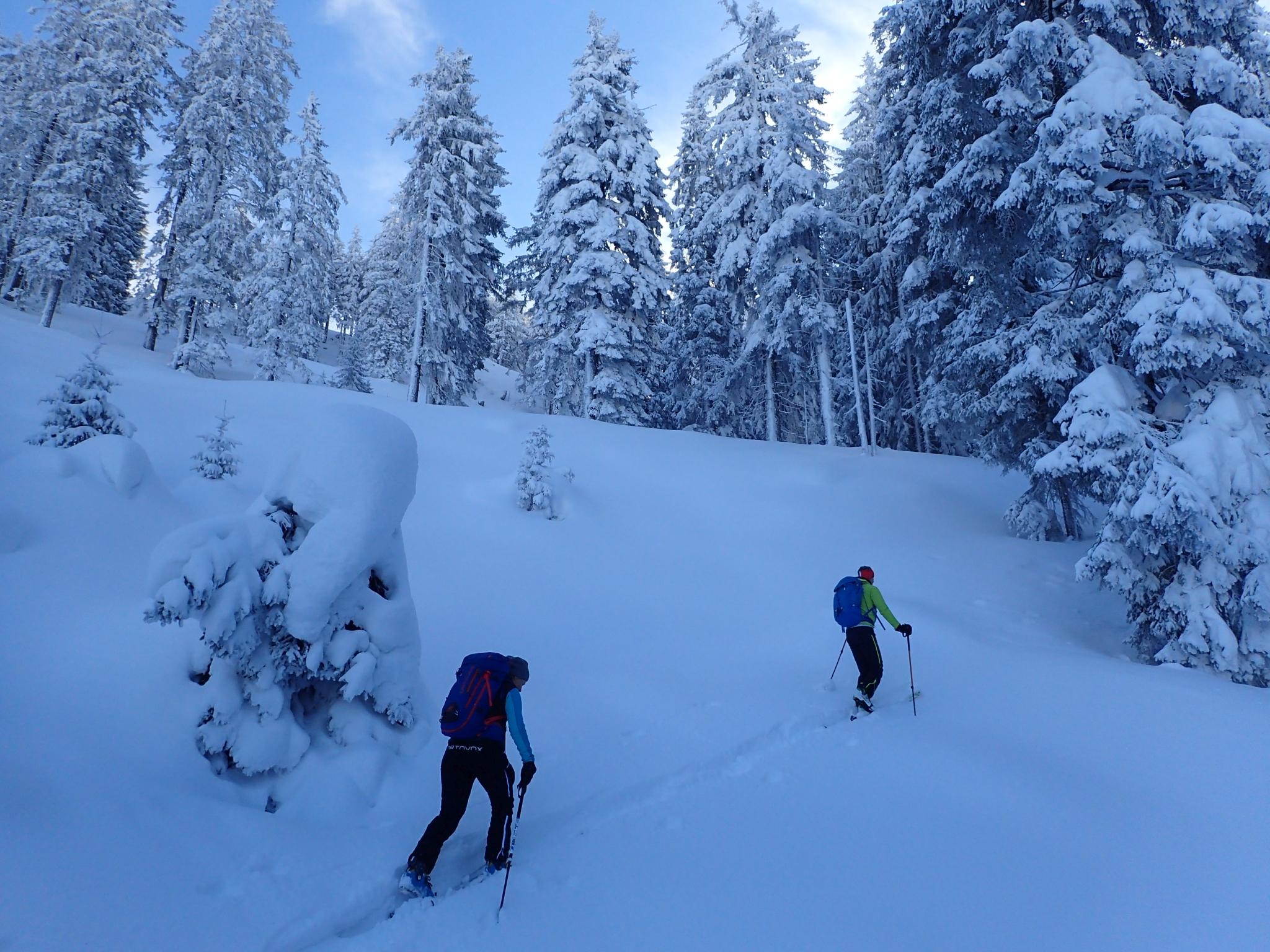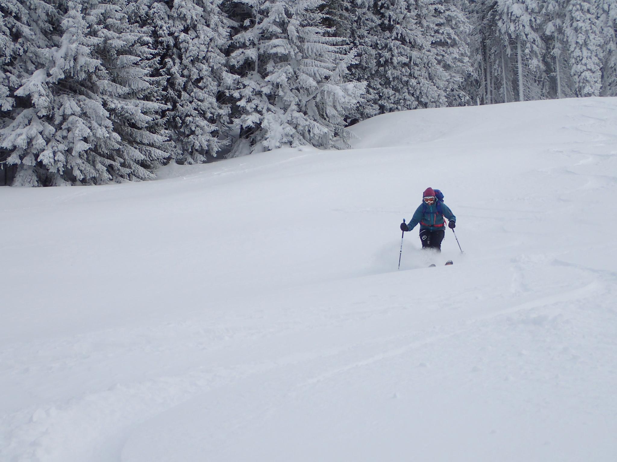 Bereits bei der Schranbachalm zeigt der Schnee deutliche Windspuren, ist aber bis zum Gipfel pulvrig und durchwegs sehr gut fahrbar. Deswegen Wiederaufstieg und nochmals einen unverspurten Hang runter.
