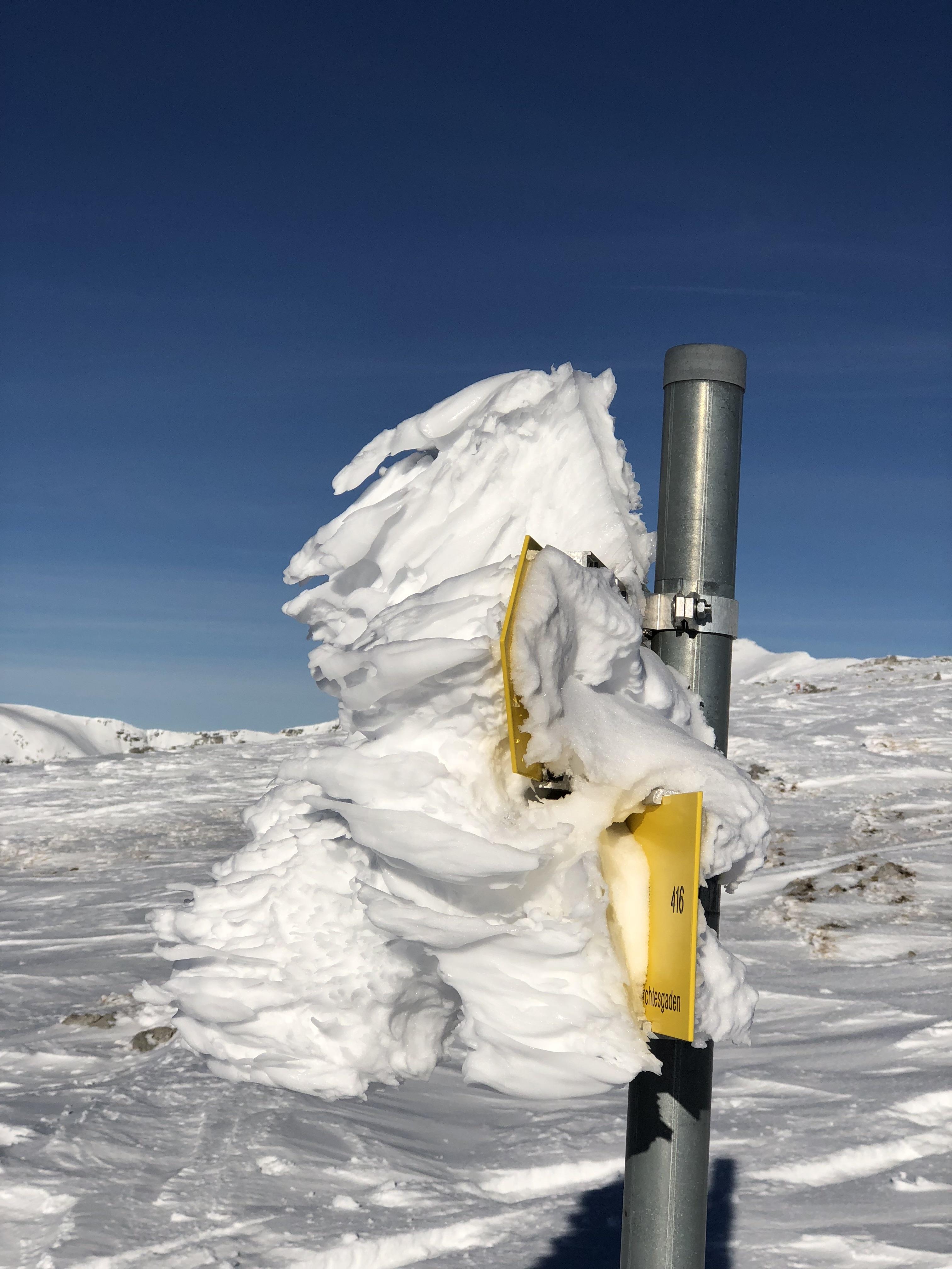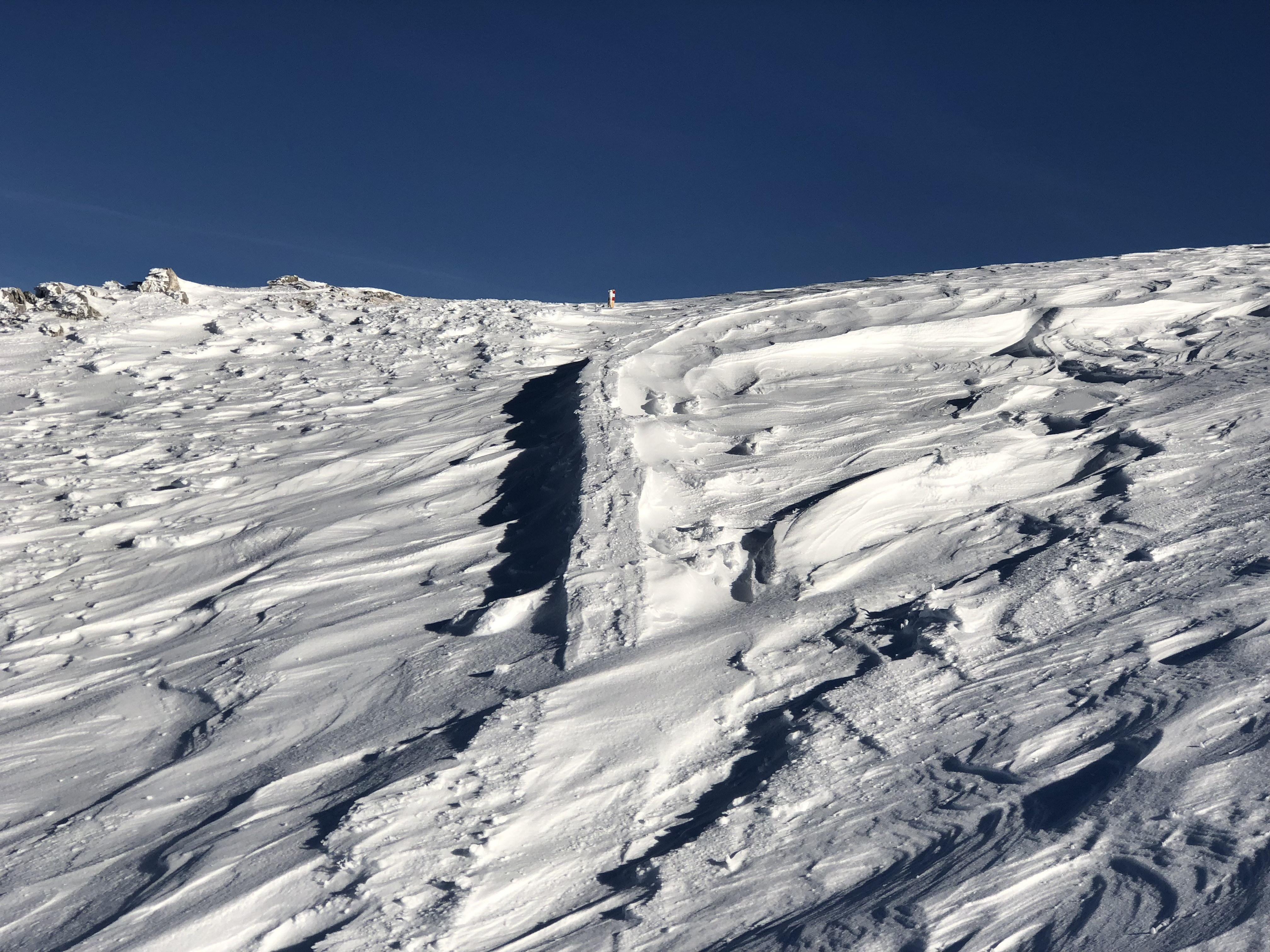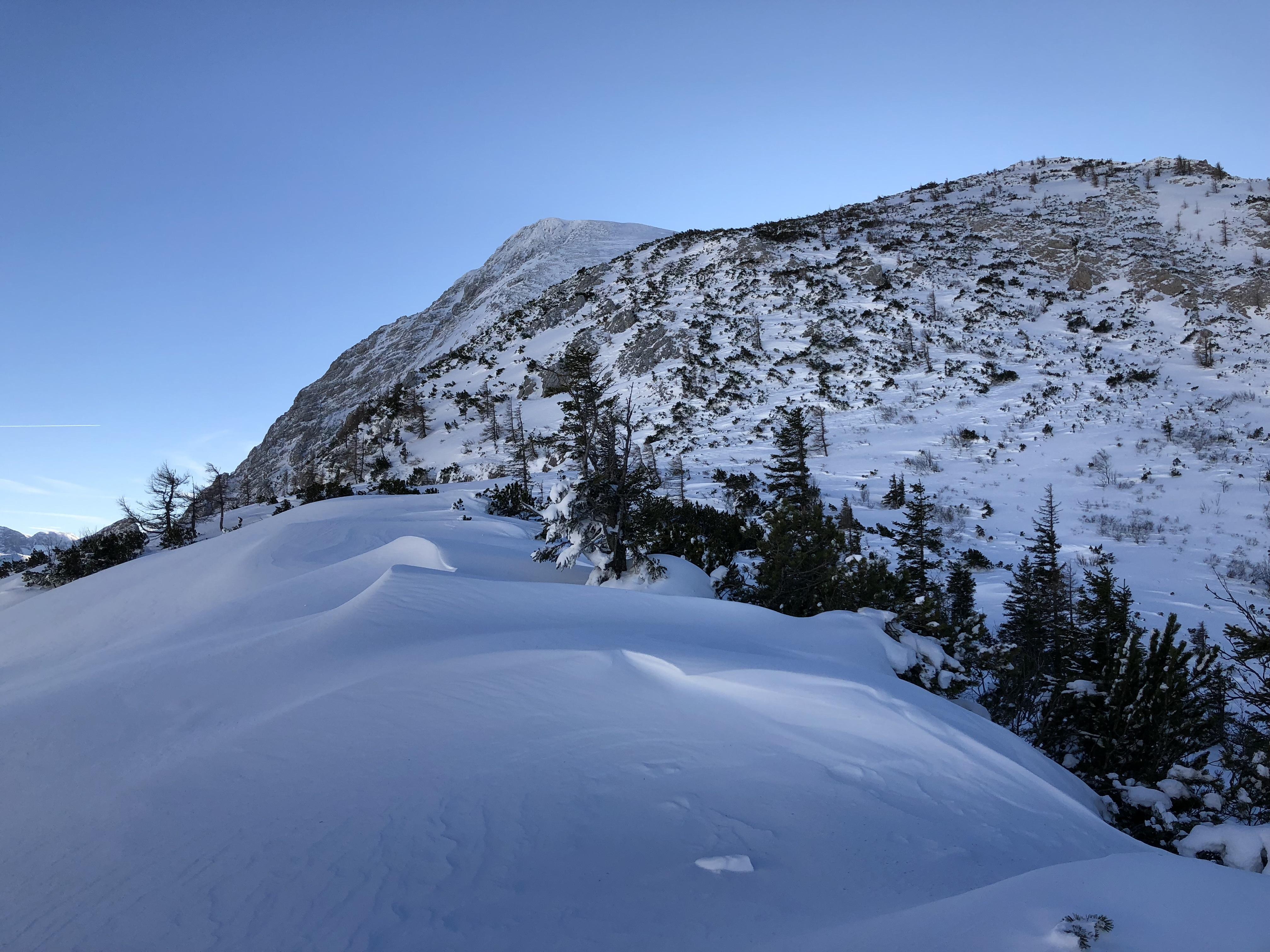Start nach einer kalten Nacht (indoor um 0° C auf dem eigenen Thermometer) zögerlich und erst mit den ersten Sonnenstrahlen vor dem Haus zum Schneibstein, der vom Stahl-Haus aus betrachtet im unteren Bereich schneereich und oben abgeblasen wirkt (was sich als falsche Annahme herausstellen wird). Die Wegfindung war wegen der vielen gut erkennbaren Markierungen und älterer Ski- und Schneeschuhspuren gänzlich unproblematisch, mit zunehmender Höhe wurden dann aber die Auswirkungen des Windes mit den beachtlichen Verfrachtungen und abgeblasenen Stellen immer deutlicher - weiter oben waren die langgezogenen Hänge teils ganz erheblich mit Triebschnee beladen (was leider erst aus einiger Nähe wirklich gut in der ganzen Dimension wahrnehmbar war). Bodennah stand's da nicht überall zum wirklich besten, grobkörnig umgebautes Zeug ("Brez'nsalz") und instabil-bis-locker-pulvriges war über größere Strecken auch drunter, ebenso vereinzelt grundlose Löcher. Oberflächlich gab's viel Variantenreichtum von einem leichten Schmelzdeckel weiter unten über immer wieder viel fluffigen Pulver und Reste von Oberflächenreif wie auch leicht windgepresstes - aber nirgendwo was batziges. In einem flachen Teil gab's einmal ein ordentliches Setzungsgeräusch, aber stabil war das alles glücklicherweise - bis auf kleinschollige Abbrüche an Kanten war nichts auslösbar und auch sonst nichts frisch ausgelöst zu sehen (ein paar Schneebretter wie das auf dem Bild "Eine Sichtung" schienen aus der Ferne am ehesten vom Vortag zu sein).
