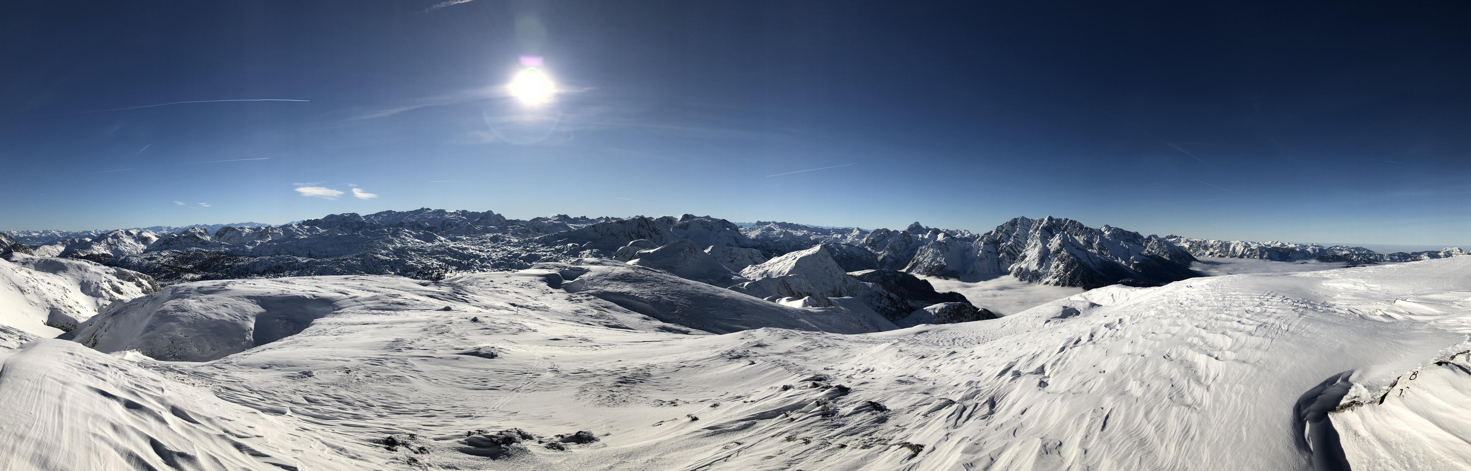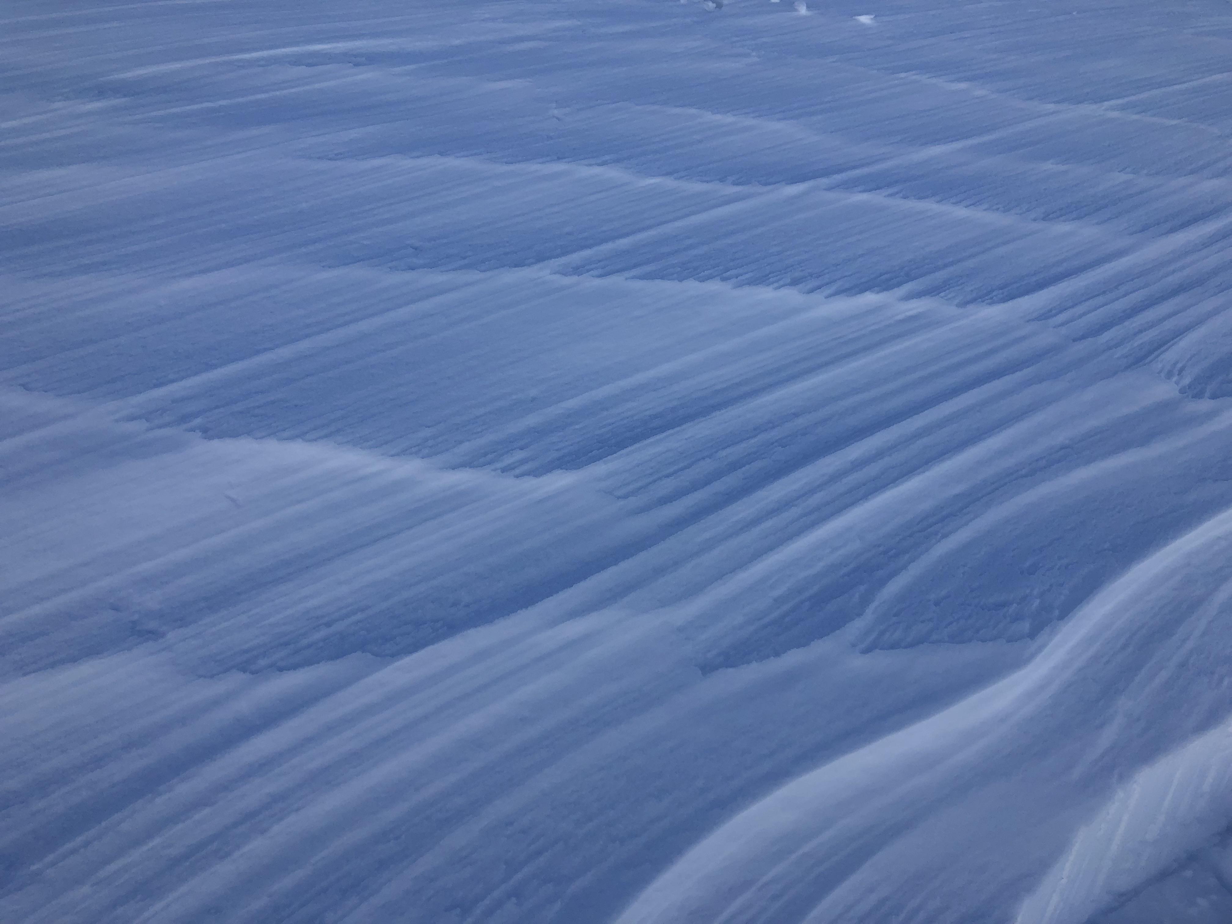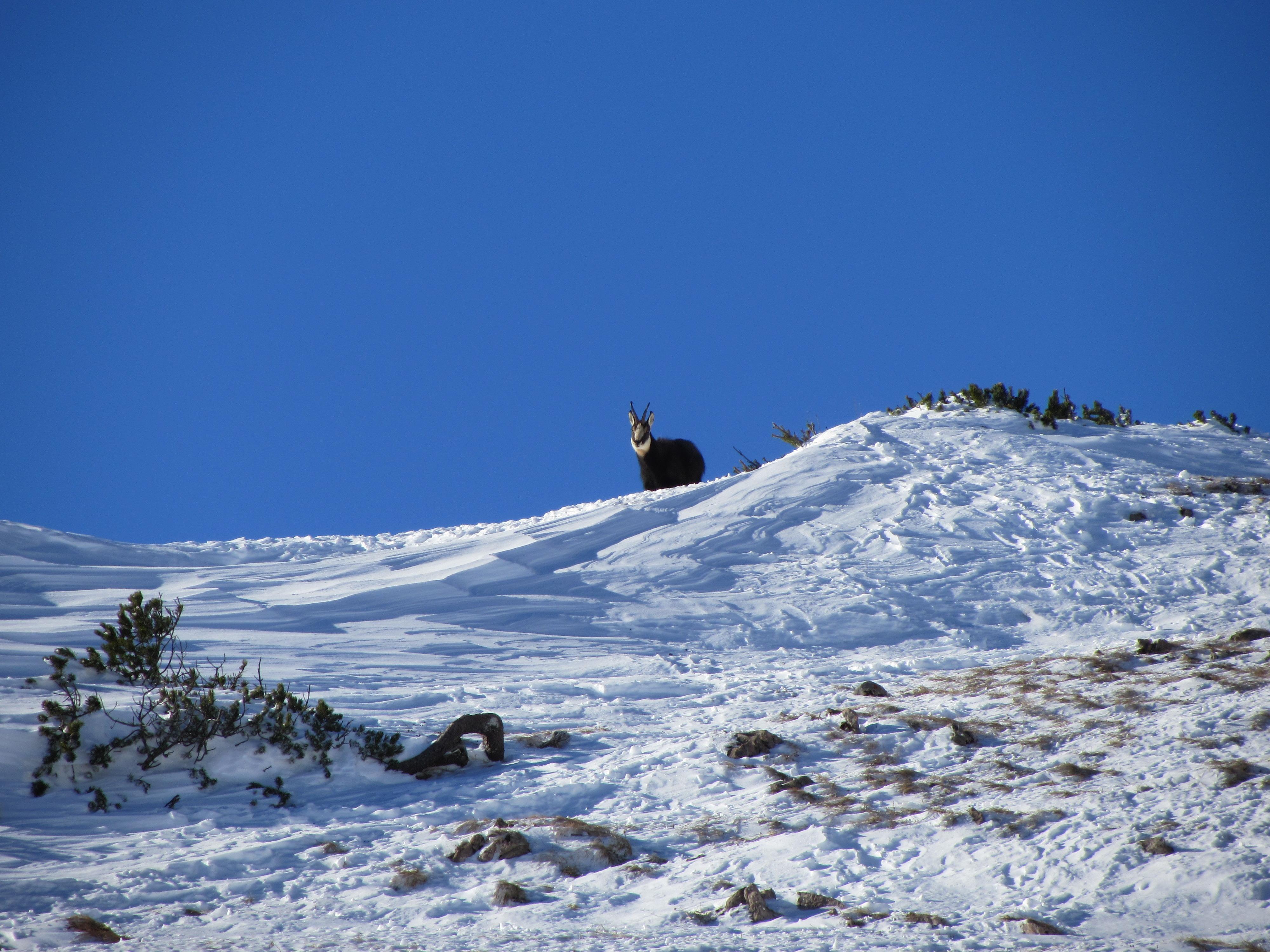 Start nach einer kalten Nacht (indoor um 0° C auf dem eigenen Thermometer) zögerlich und erst mit den ersten Sonnenstrahlen vor dem Haus zum Schneibstein, der vom Stahl-Haus aus betrachtet im unteren Bereich schneereich und oben abgeblasen wirkt (was sich als falsche Annahme herausstellen wird). Die Wegfindung war wegen der vielen gut erkennbaren Markierungen und älterer Ski- und Schneeschuhspuren gänzlich unproblematisch, mit zunehmender Höhe wurden dann aber die Auswirkungen des Windes mit den beachtlichen Verfrachtungen und abgeblasenen Stellen immer deutlicher - weiter oben waren die langgezogenen Hänge teils ganz erheblich mit Triebschnee beladen (was leider erst aus einiger Nähe wirklich gut in der ganzen Dimension wahrnehmbar war). Bodennah stand's da nicht überall zum wirklich besten, grobkörnig umgebautes Zeug ("Brez'nsalz") und instabil-bis-locker-pulvriges war über größere Strecken auch drunter, ebenso vereinzelt grundlose Löcher. Oberflächlich gab's viel Variantenreichtum von einem leichten Schmelzdeckel weiter unten über immer wieder viel fluffigen Pulver und Reste von Oberflächenreif wie auch leicht windgepresstes - aber nirgendwo was batziges. In einem flachen Teil gab's einmal ein ordentliches Setzungsgeräusch, aber stabil war das alles glücklicherweise - bis auf kleinschollige Abbrüche an Kanten war nichts auslösbar und auch sonst nichts frisch ausgelöst zu sehen (ein paar Schneebretter wie das auf dem Bild "Eine Sichtung" schienen aus der Ferne am ehesten vom Vortag zu sein).