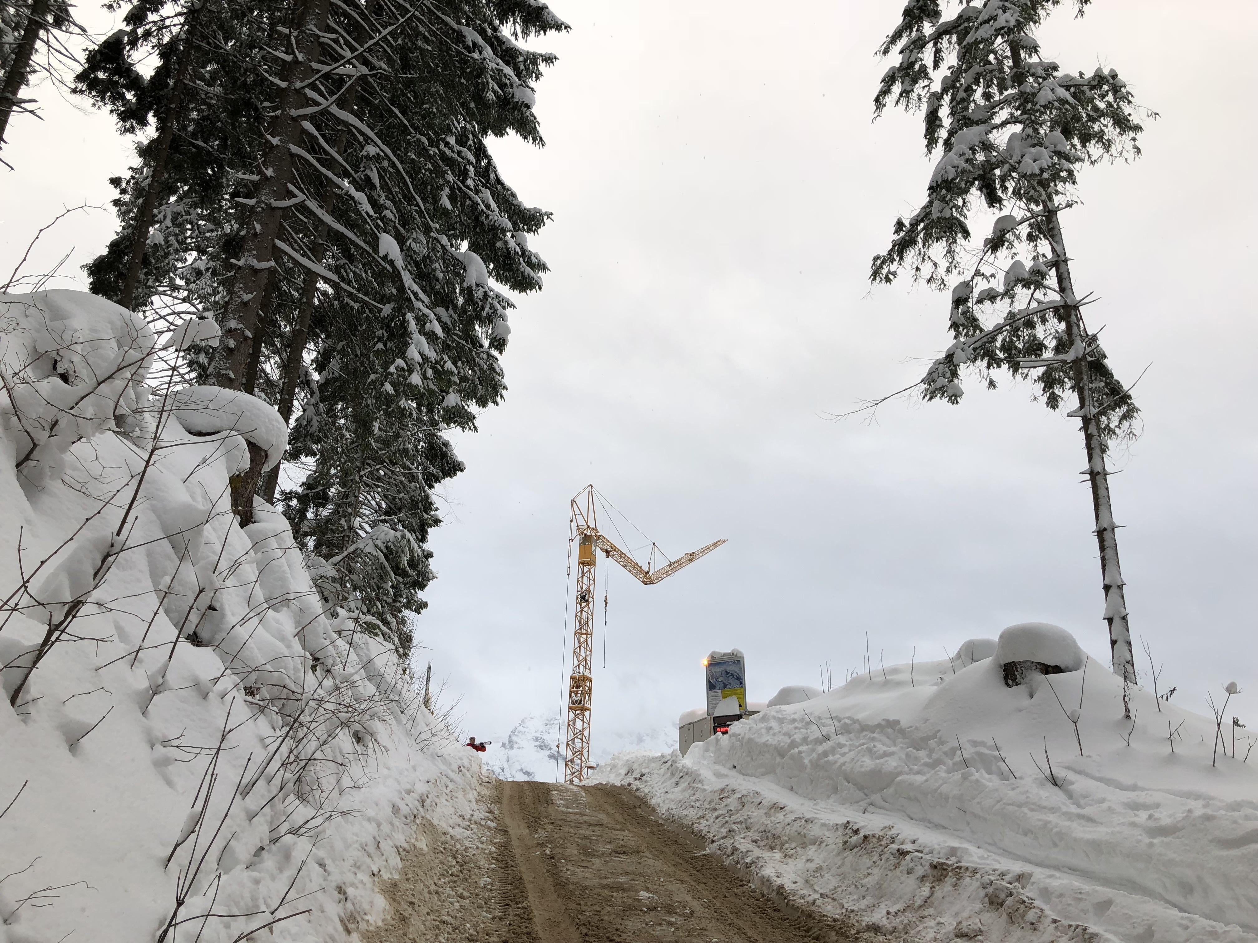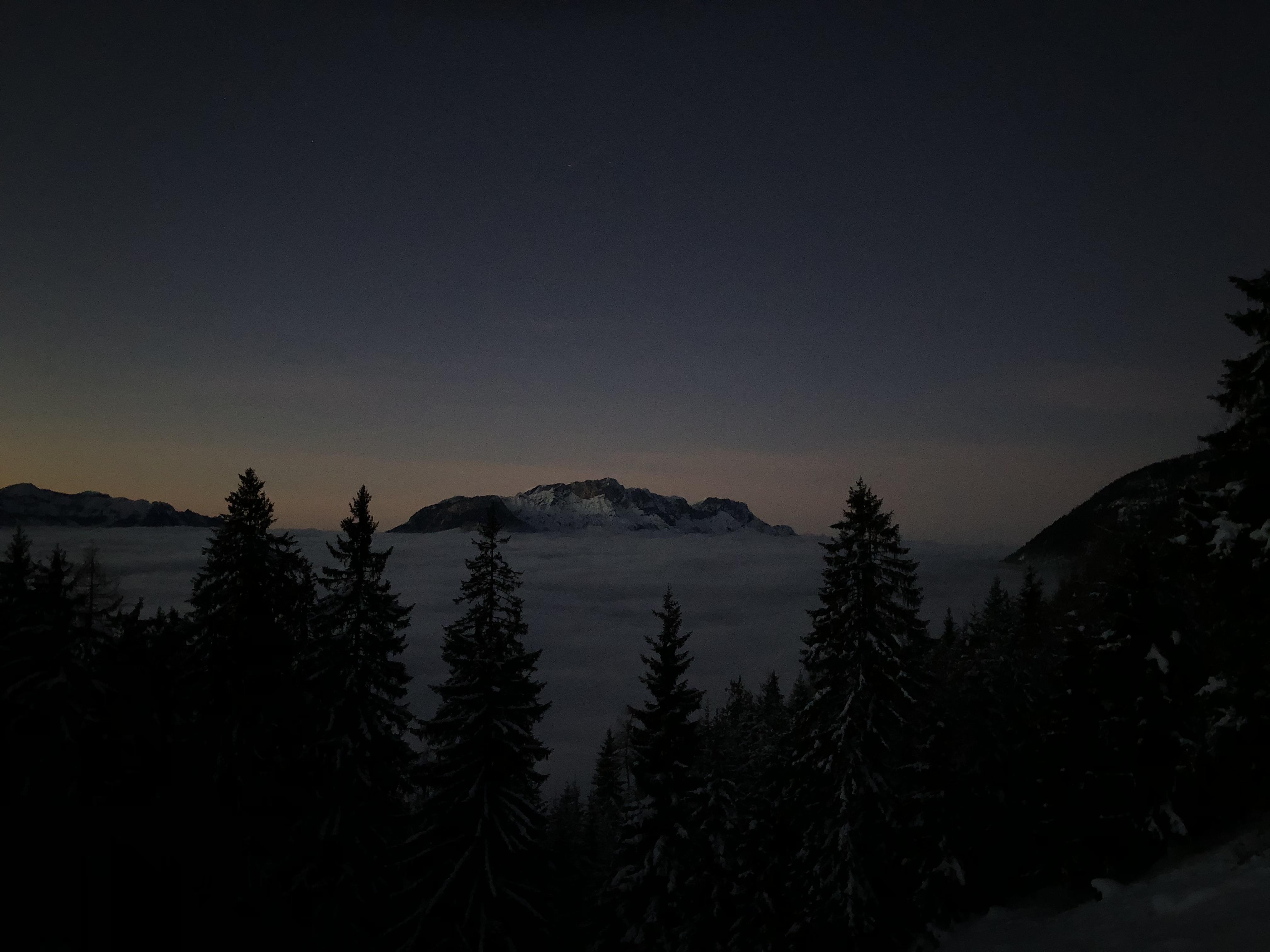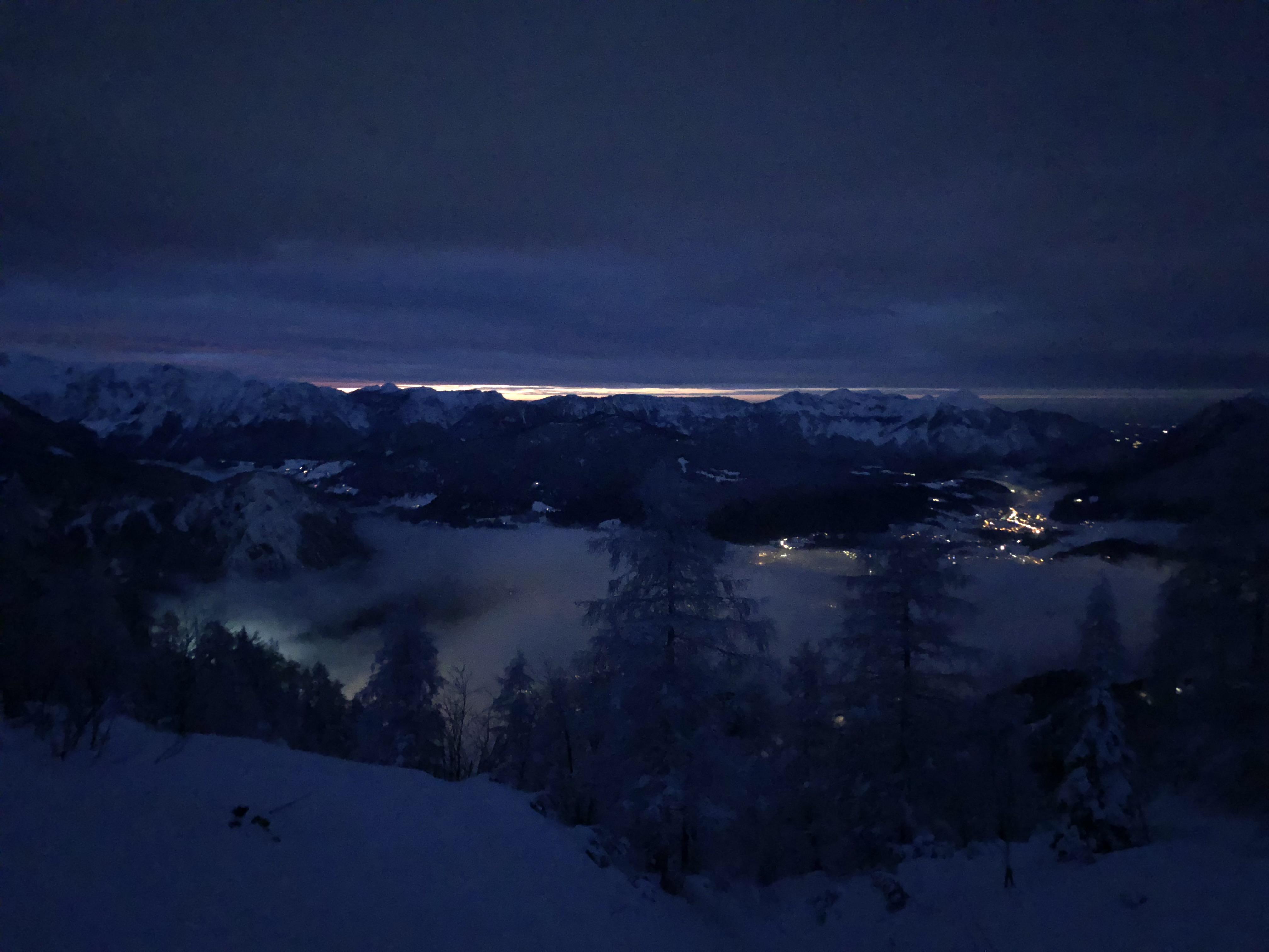 Aufstieg am Tag zuvor vom Parkplatz Hinterbrand über geräumte (!) und gesalzene (!?) Forstwege/Baustellenstraßen (mindestens gewöhnungsbedürftig) und zwischendrin die Jenner-Skipiste (bei beinahe gewaltigen und tiefen Neuschneemengen etwas mühsam) Richtung Bergstation, kurz davor dann ein Stückerl abwärts und auf dem Sommerweg zum Stahl-Haus. Schon auf der Querung wird trotz Dunkelheit klar dass das "Schneedeckenfundament" (zumindest für Schneeschuhgeher) nicht soo großartig ist und teilweise recht wenig trägt und zudem der Wind ganze Arbeit geleistet und kräftigst Schnee verfrachtet hat. (Die Maximalvariante der "Kleinen Reib'n" war für uns damit schon mal abgehakt.)