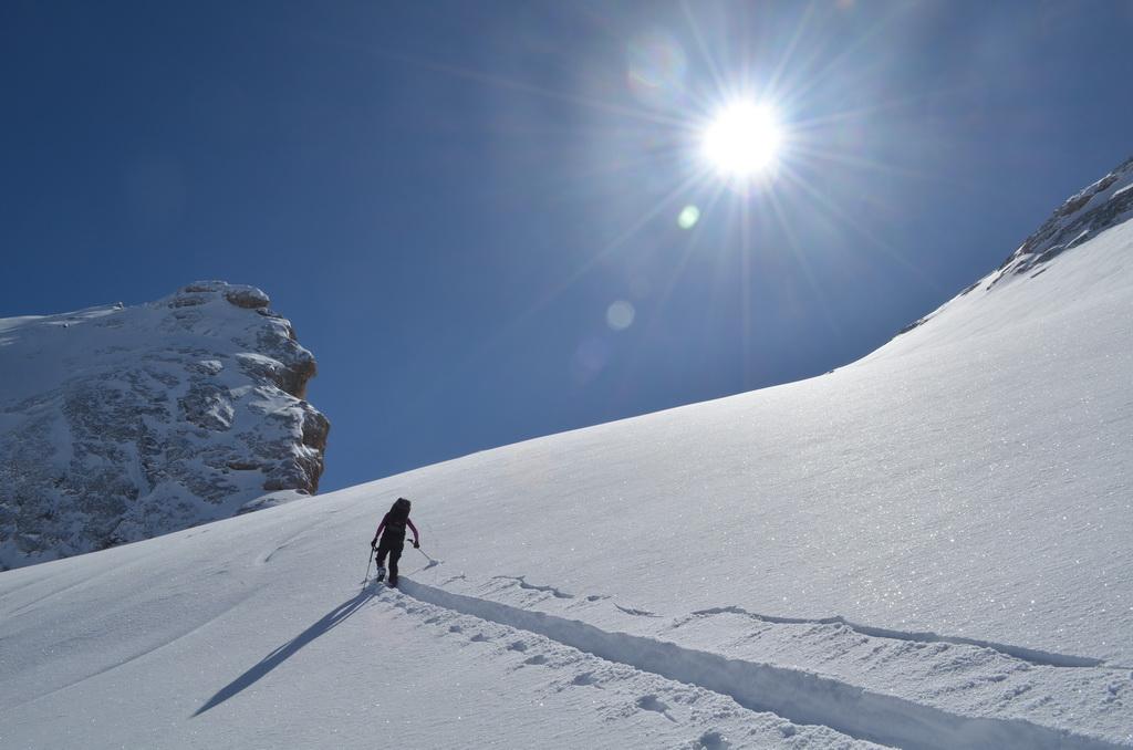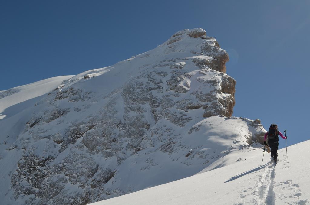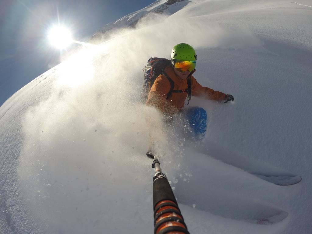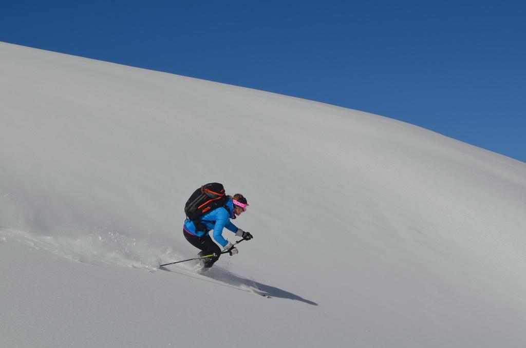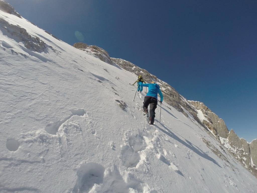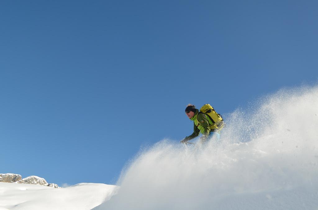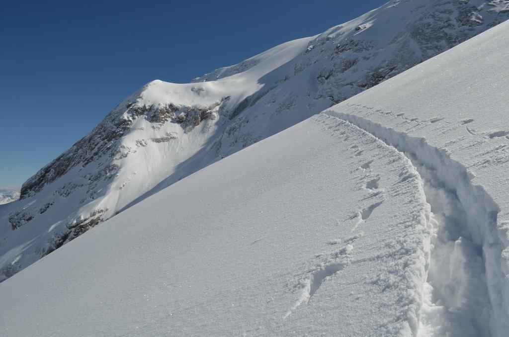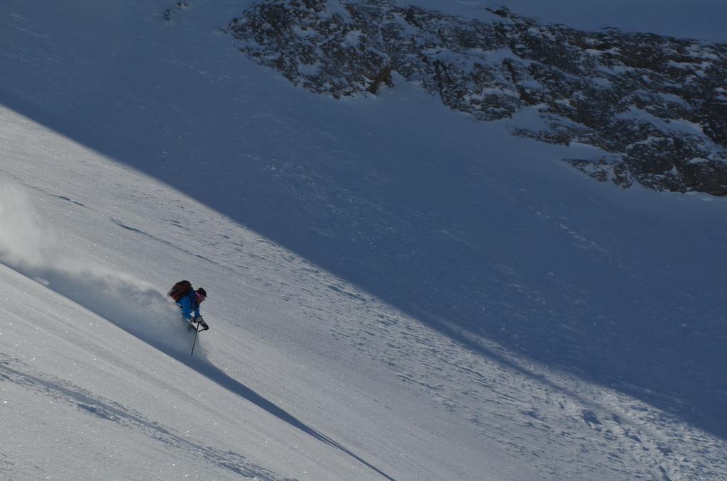 Nachdem ich gestern einen Tip eines italienischen Freundes bekommen habe sind wir heute Früh in Richtung Marmolada aufgebrochen. Unser Ziel der Piccolo Vernell entpuppte sich für den heutigen Tag aber doch etwas zu optimistisch. In den Nordflanken der Marmolda hat es von Vorgestern auf gestern 20-30 cm perfekten Pulverschnee abgegeben, der auch heute noch mega locker war. Zum fahren ein Traum, aber als Auflage für die Felsen zu locker und so sind wir "nur" links vom Gipfel auf die Schulter aufgestiegen. Eine Abfahrt über die felsige Nordflanke währe unter diesen Bedingungen zu gefährlich gewesen. Ein Felskontakt und ein Sturz dort möchte wahrscheinlich niemand erleben. Wir haben noch versucht über den Grat zu Fuss auf den Gipfel aufzusteigen, aber auch das haben wir dann abgebrochen und uns stattdessen noch einmal eine Auffahrt mit dem Lift mit anschließender Pulverabfahrt gegönnt. Nordseitig haben wir heute überall perfekten spannungslosen Pulverschnee ohne jediglichen Windeinfluss vorgefunden.