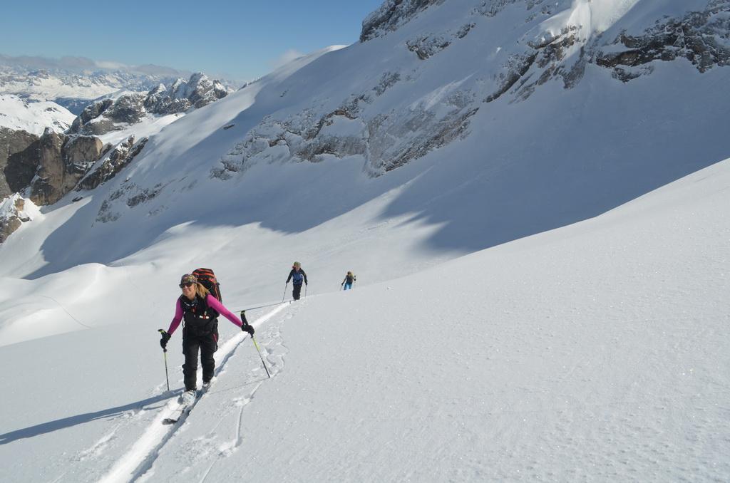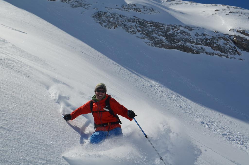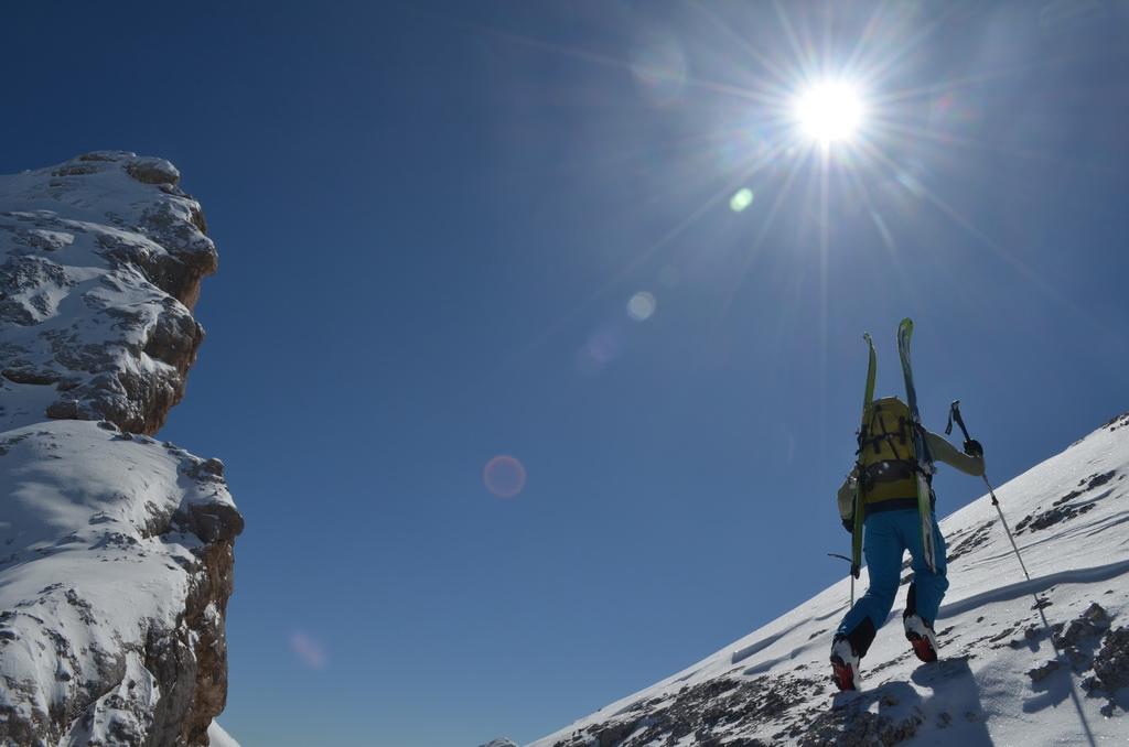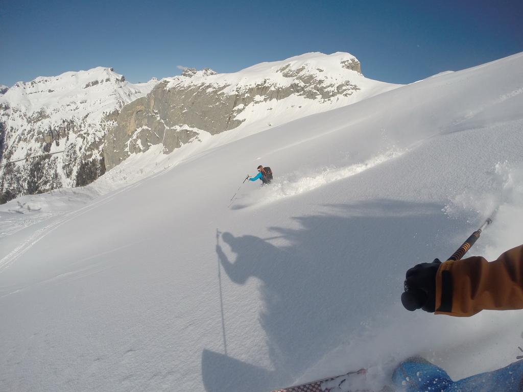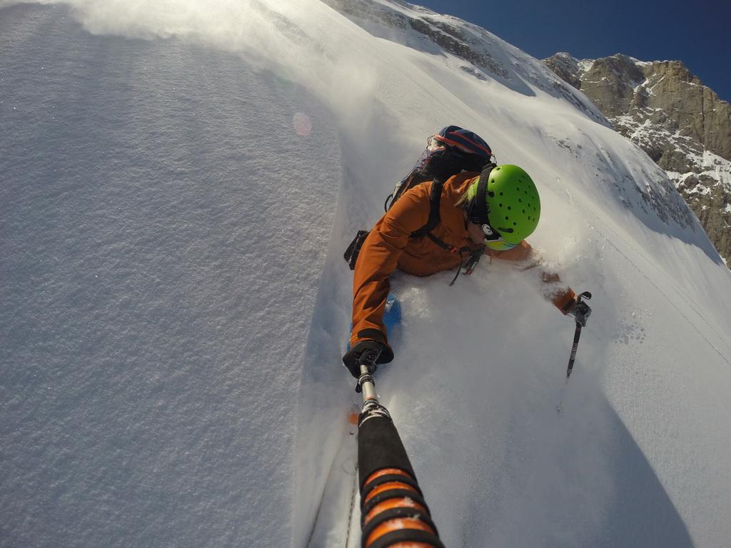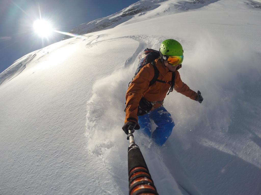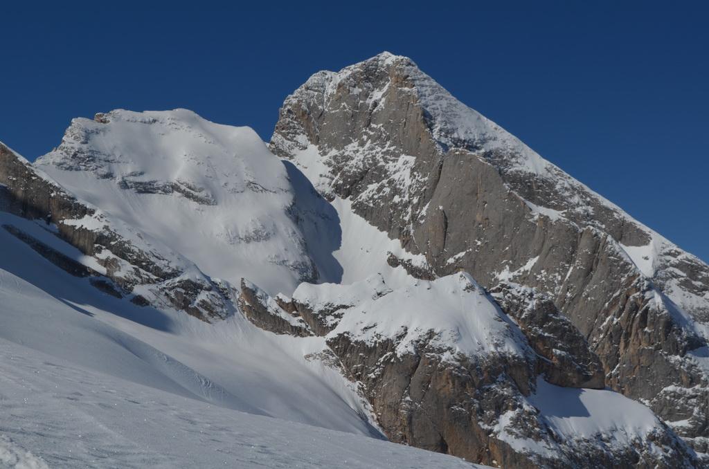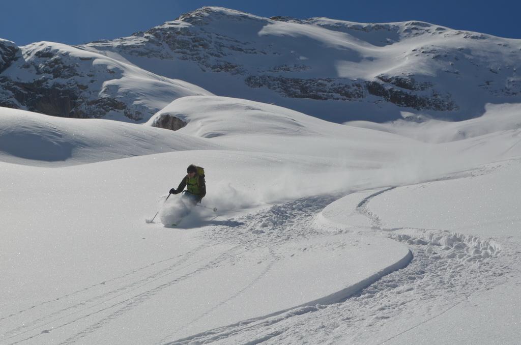 Nachdem ich gestern einen Tip eines italienischen Freundes bekommen habe sind wir heute Früh in Richtung Marmolada aufgebrochen. Unser Ziel der Piccolo Vernell entpuppte sich für den heutigen Tag aber doch etwas zu optimistisch. In den Nordflanken der Marmolda hat es von Vorgestern auf gestern 20-30 cm perfekten Pulverschnee abgegeben, der auch heute noch mega locker war. Zum fahren ein Traum, aber als Auflage für die Felsen zu locker und so sind wir "nur" links vom Gipfel auf die Schulter aufgestiegen. Eine Abfahrt über die felsige Nordflanke währe unter diesen Bedingungen zu gefährlich gewesen. Ein Felskontakt und ein Sturz dort möchte wahrscheinlich niemand erleben. Wir haben noch versucht über den Grat zu Fuss auf den Gipfel aufzusteigen, aber auch das haben wir dann abgebrochen und uns stattdessen noch einmal eine Auffahrt mit dem Lift mit anschließender Pulverabfahrt gegönnt. Nordseitig haben wir heute überall perfekten spannungslosen Pulverschnee ohne jediglichen Windeinfluss vorgefunden.