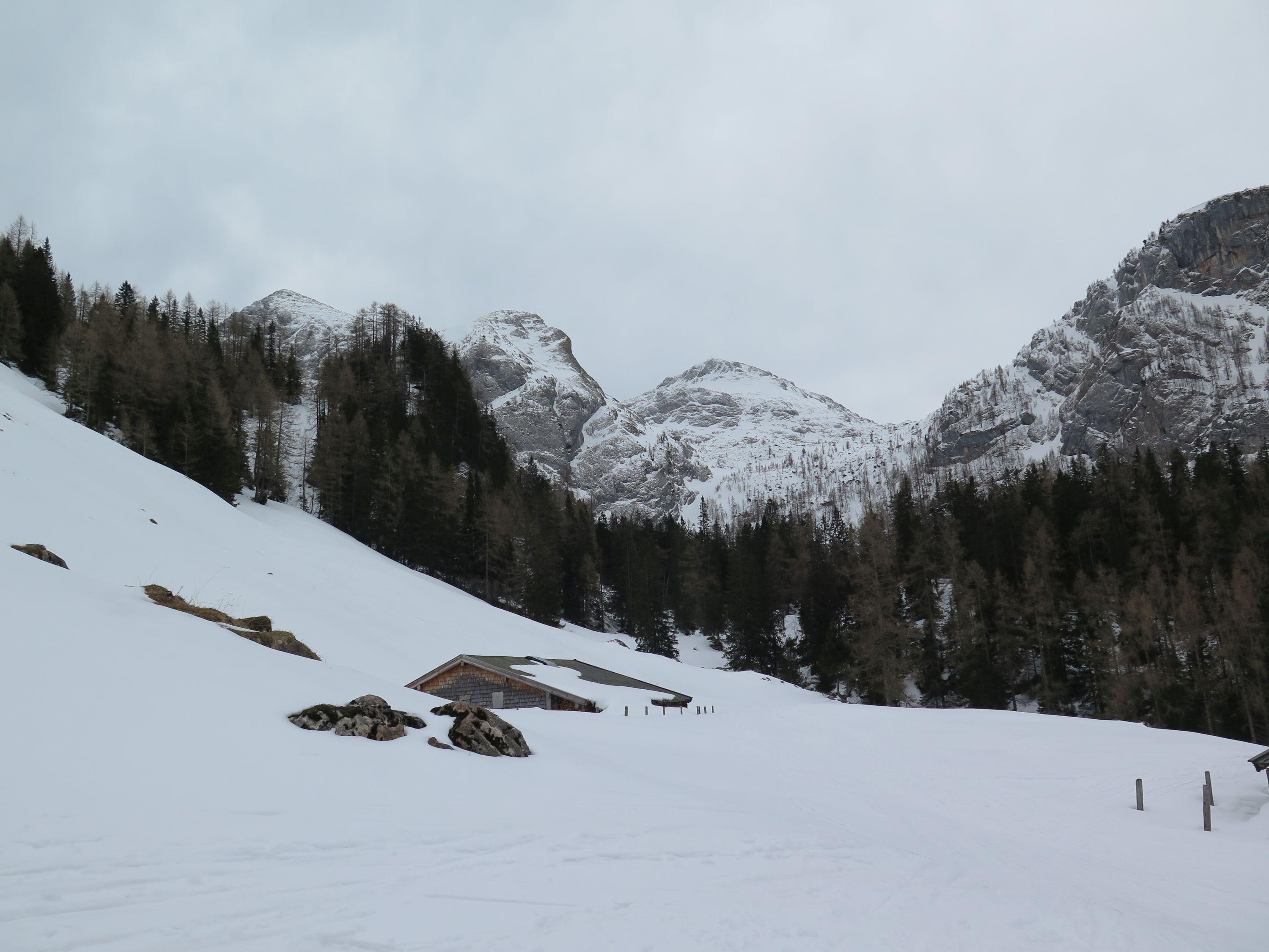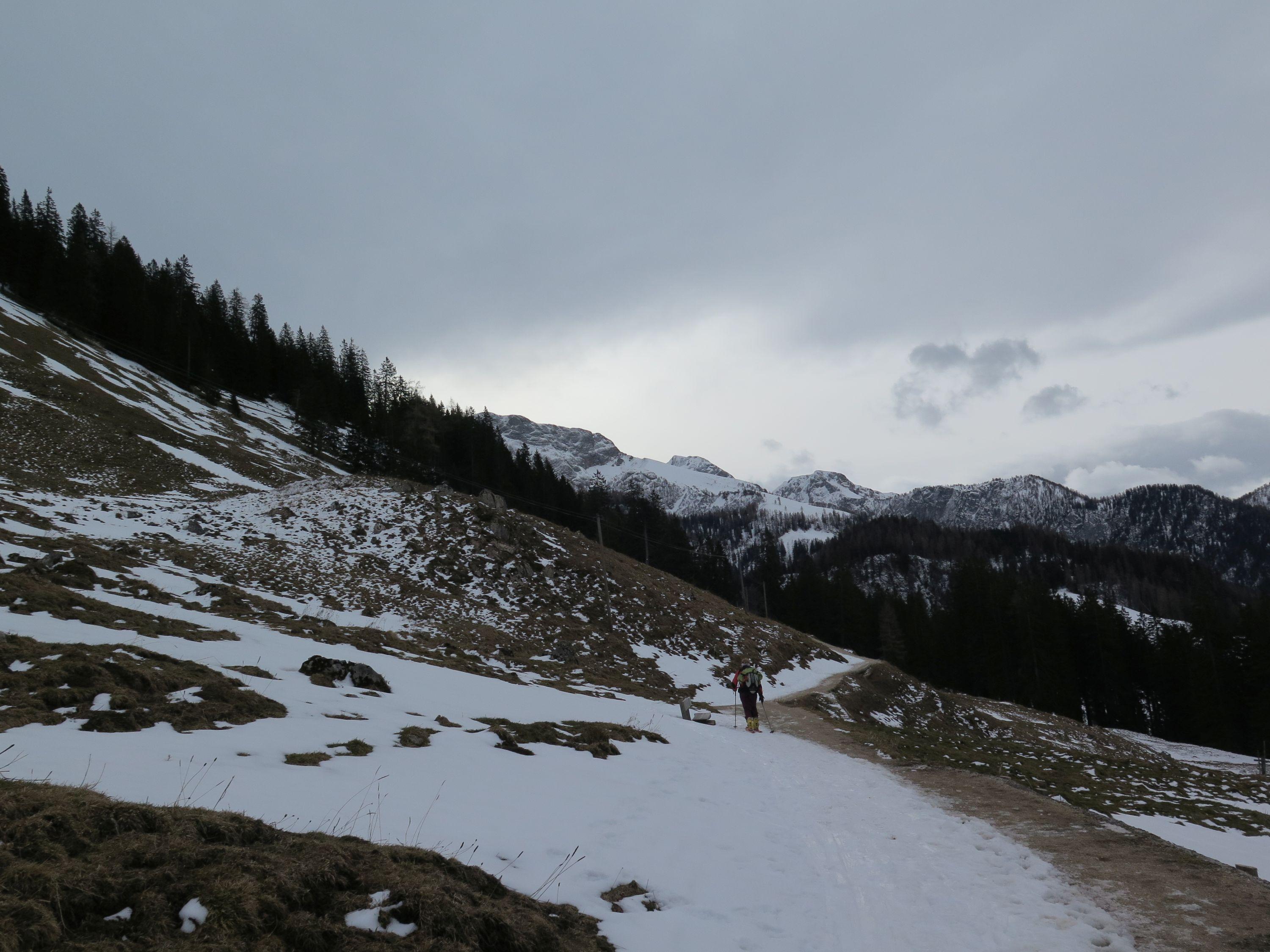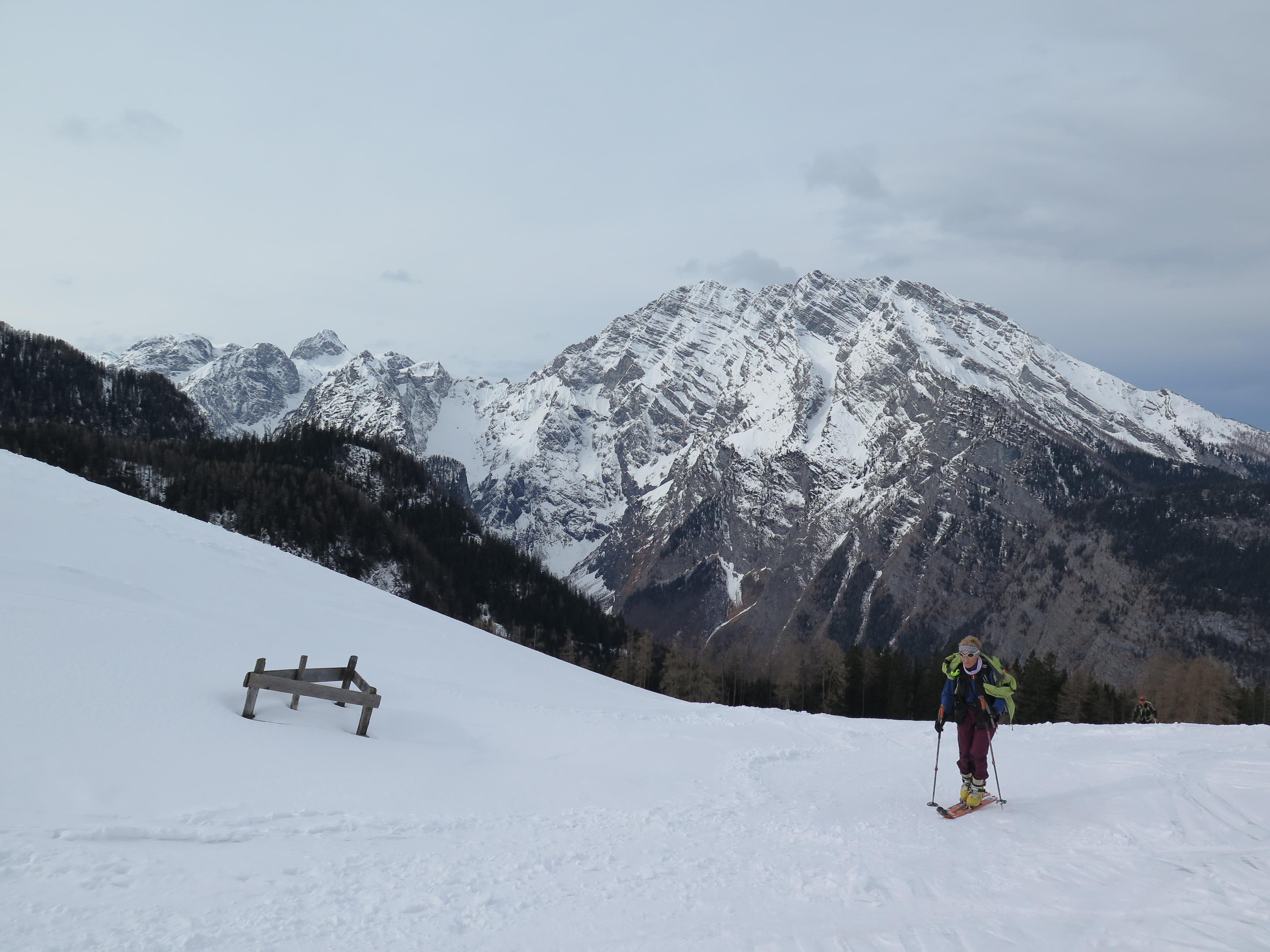 Berchtesgadner Alpen.Aufstieg von Hinterbrand-Priesbergalmem-Hohen Roßfelder-Fagstein.Abfahrt über Rainersbergbruggl-Königstalalm-Stahlhaus-Jennerpiste.Feste Schneedecke mit Harschdeckel und stellenweise diffuse Sichtverhältnisse,kräftiger Wind im Gipfelbereich