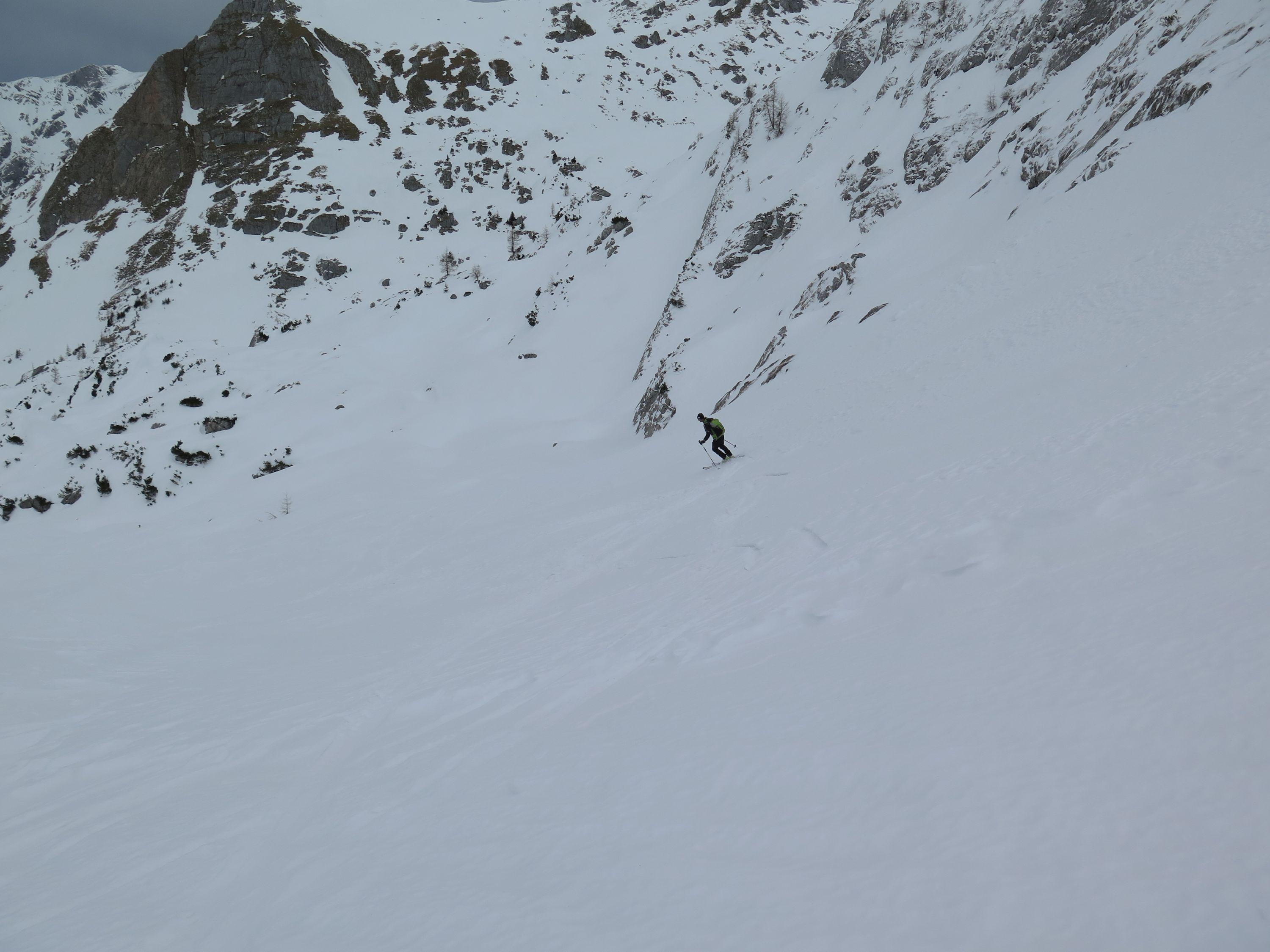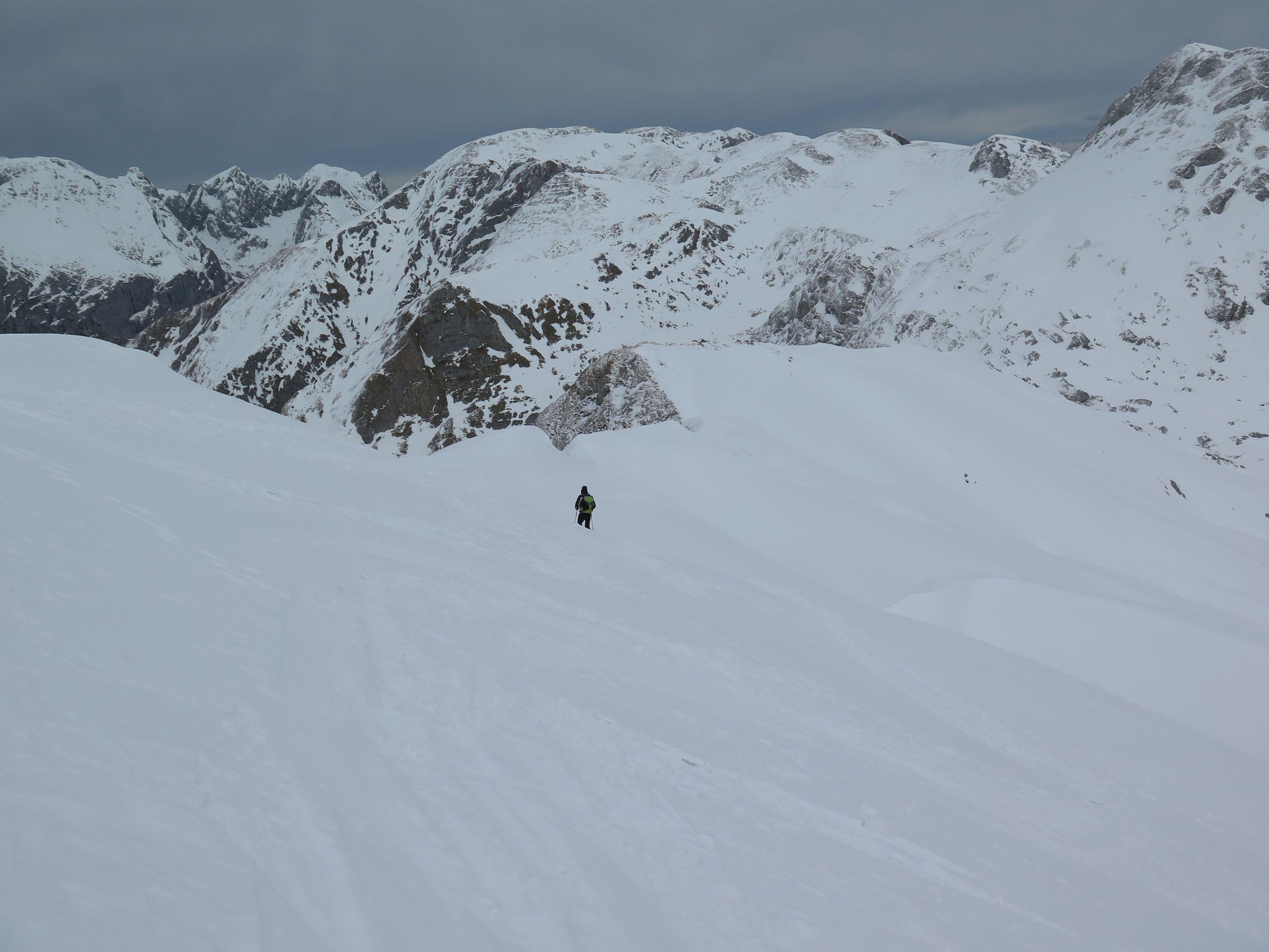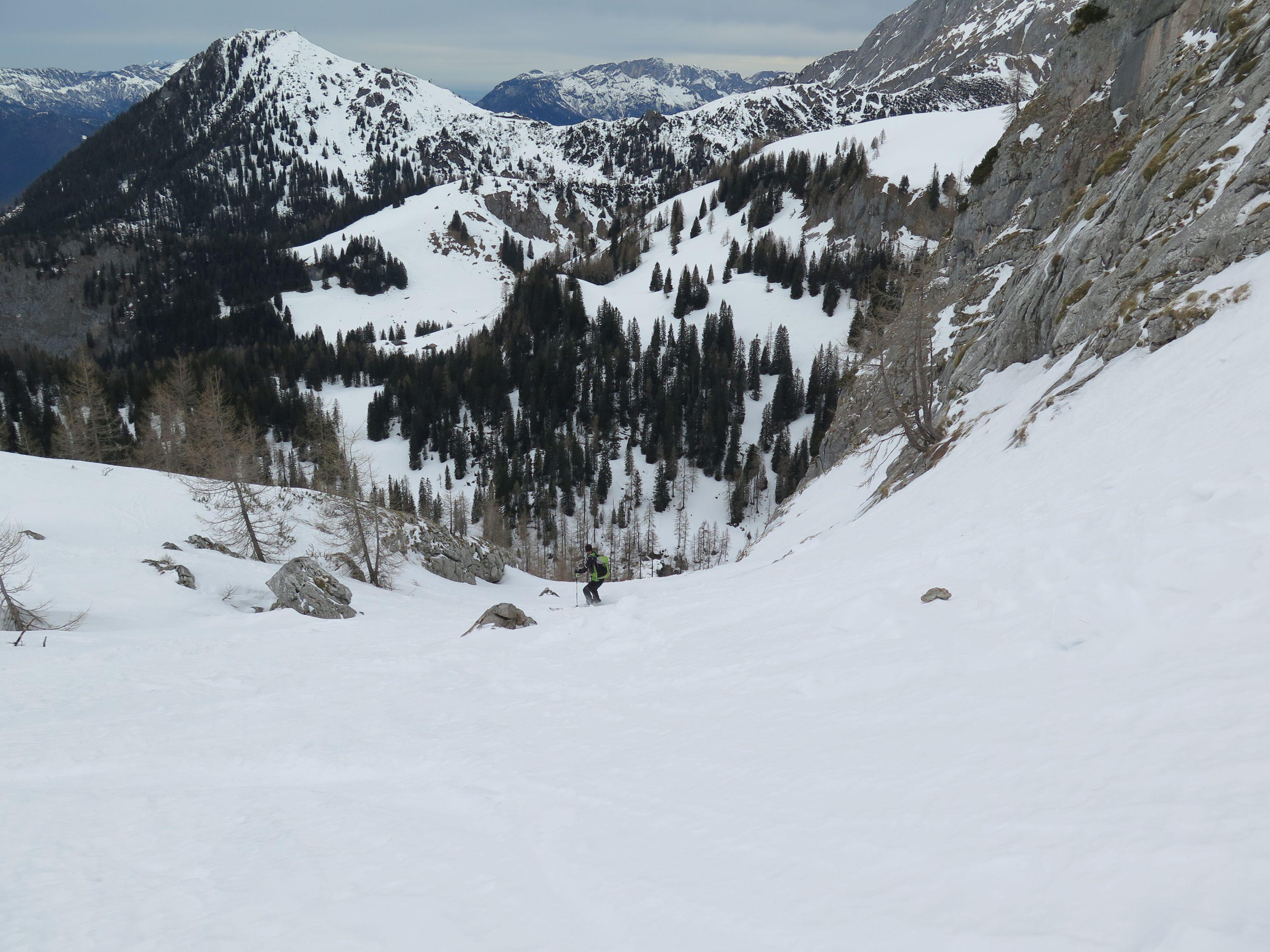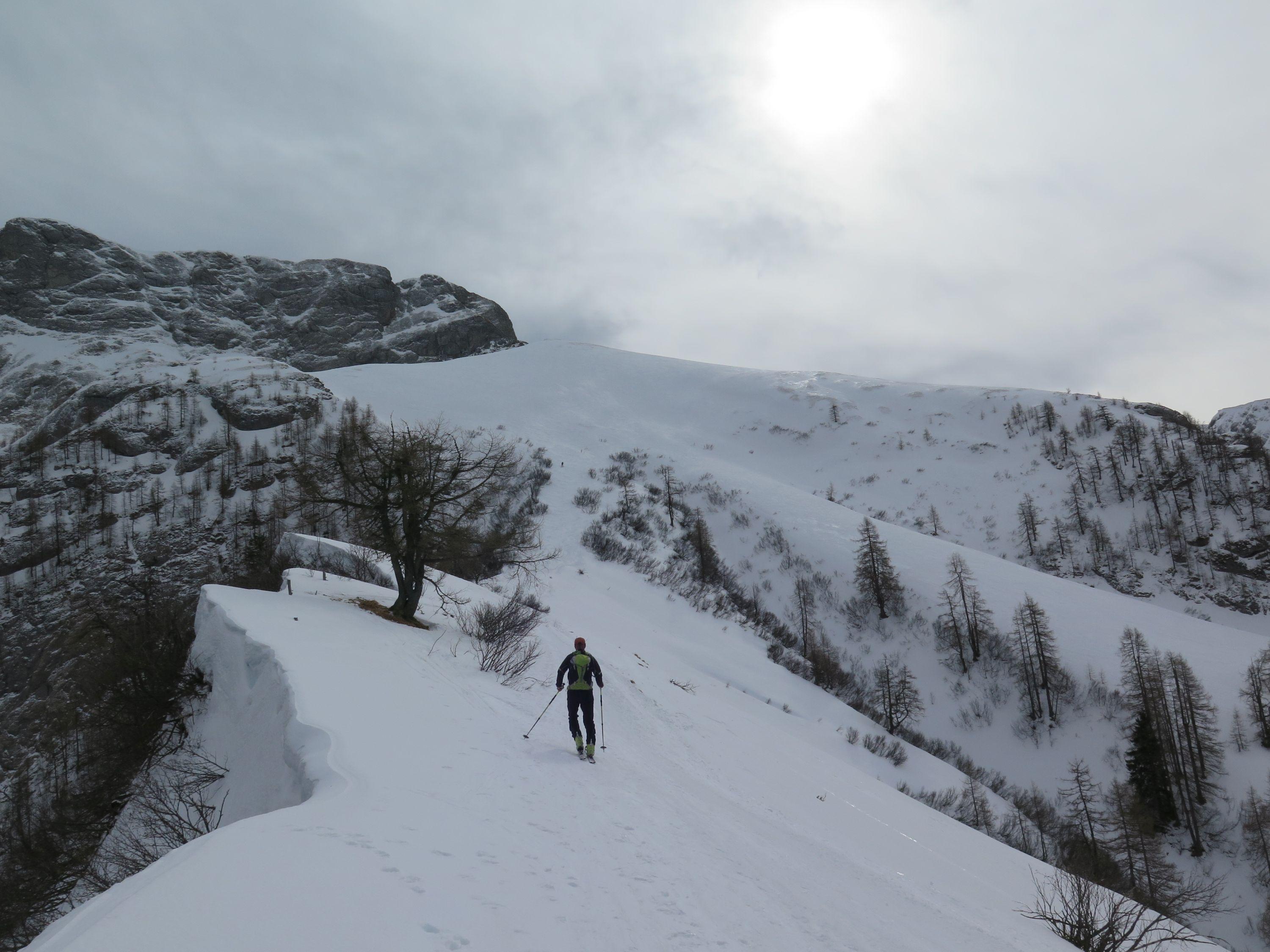 Berchtesgadner Alpen.Aufstieg von Hinterbrand-Priesbergalmem-Hohen Roßfelder-Fagstein.Abfahrt über Rainersbergbruggl-Königstalalm-Stahlhaus-Jennerpiste.Feste Schneedecke mit Harschdeckel und stellenweise diffuse Sichtverhältnisse,kräftiger Wind im Gipfelbereich