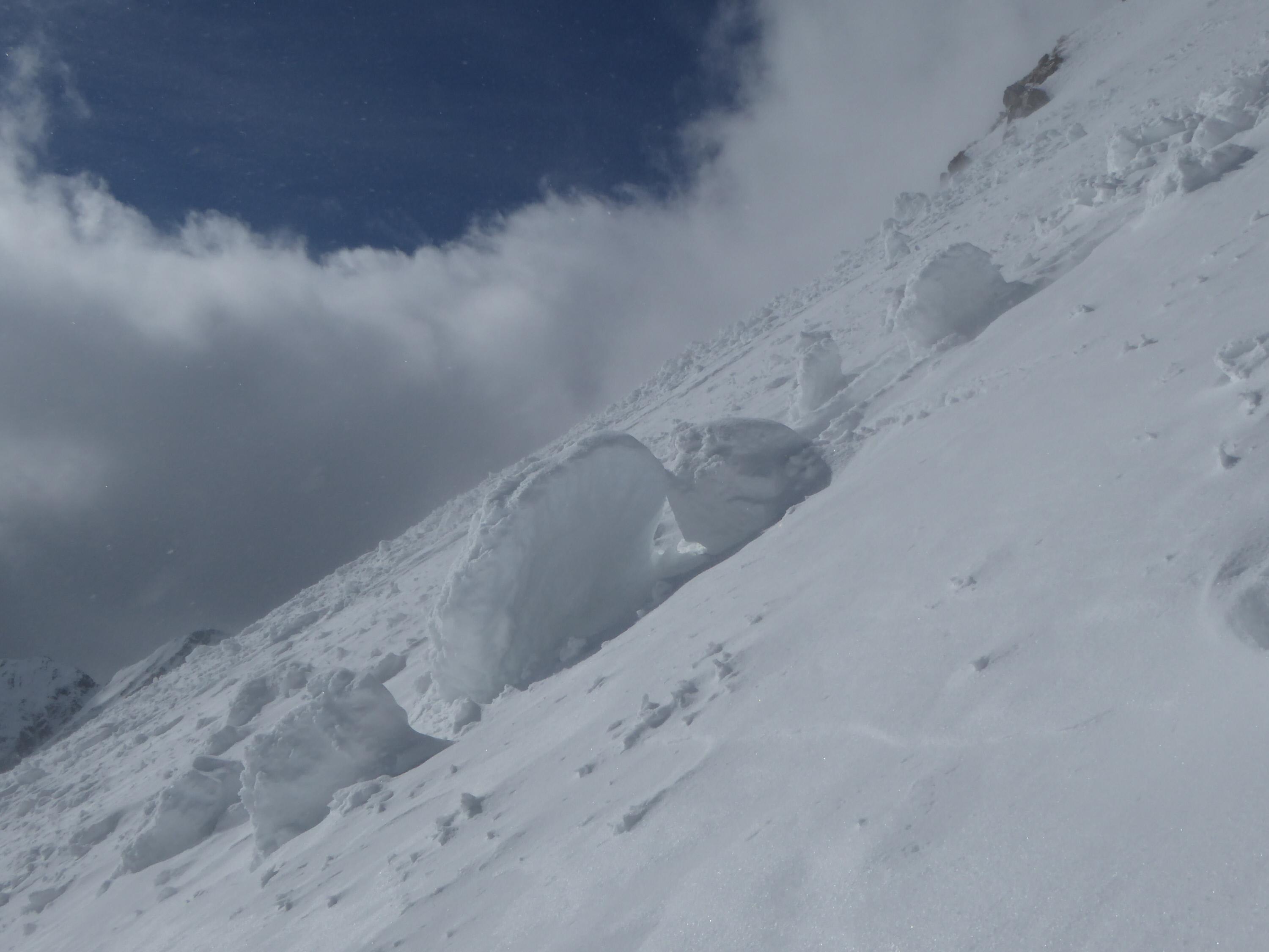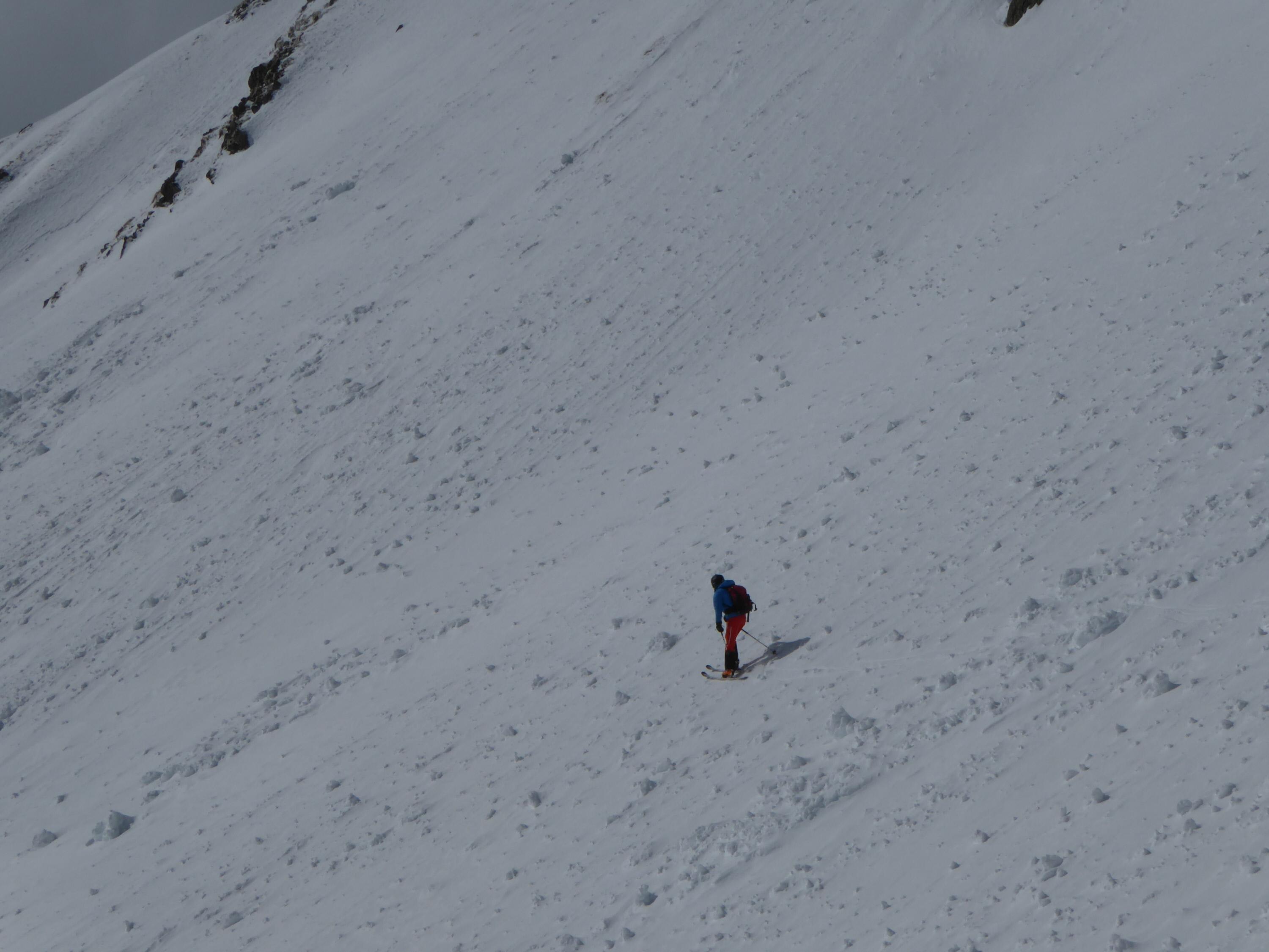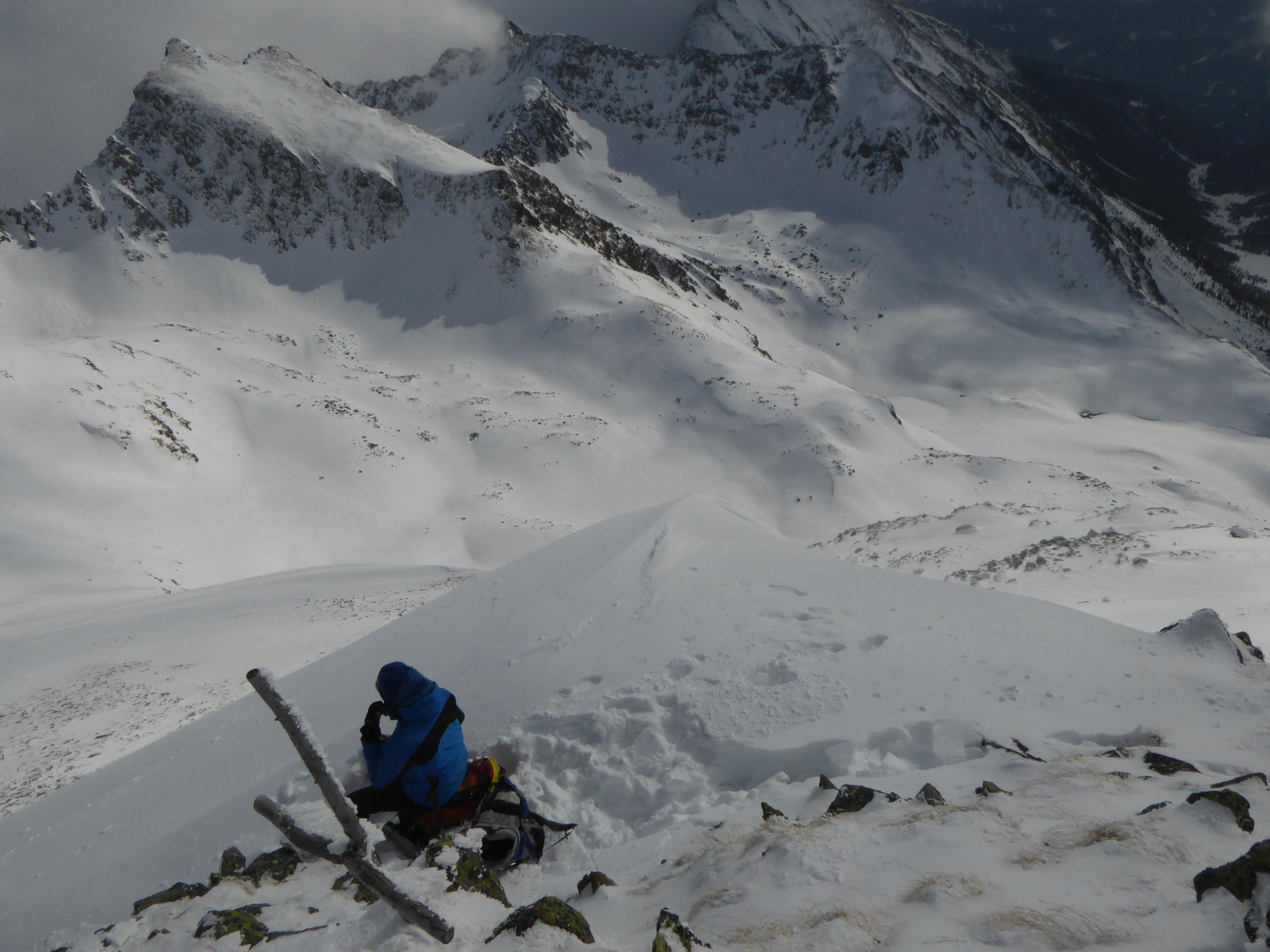 Abwechslungsreiche Tour über mehrere Karstufen im Talschluss des Rantentals; auf Skiern vom Ausgangspunkt (Abzweigung Preber- /Rantental) zum Gipfel und wieder zurück; durch den Regen und die nachfolgende Abkühlung ist der Harschdeckel stellweise pickelhart und spiegelglatt; Harscheisen waren daher für die steileren Passagen jedenfalls angezeigt; mit dem glatten Harschdeckel geht der Triebschnee keine Bindung ein (zumindest nicht vor der nächsten Erwärmung), daher zahlreiche spontan abgegangene kleine Schneebretter aus dem Steilgelände