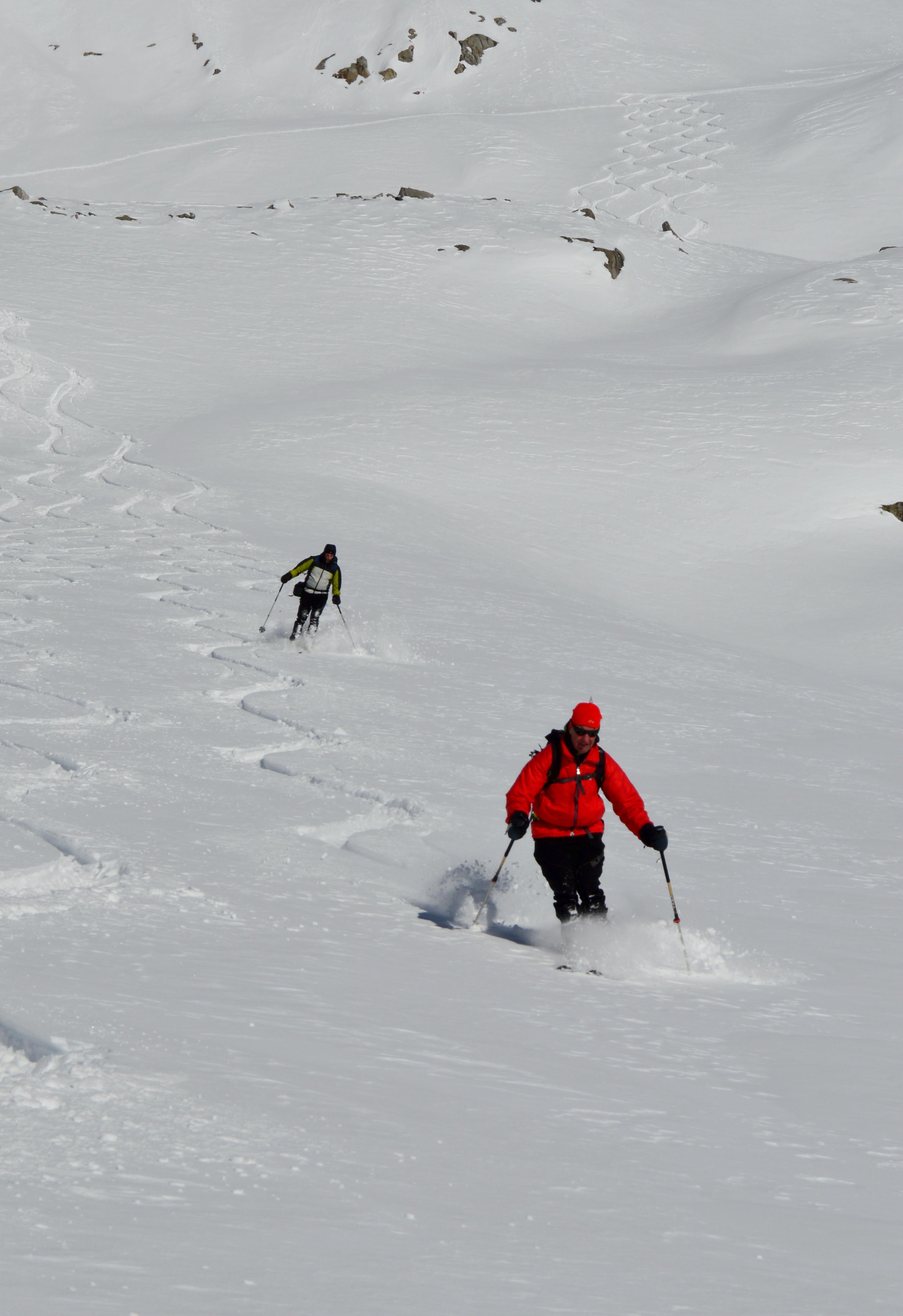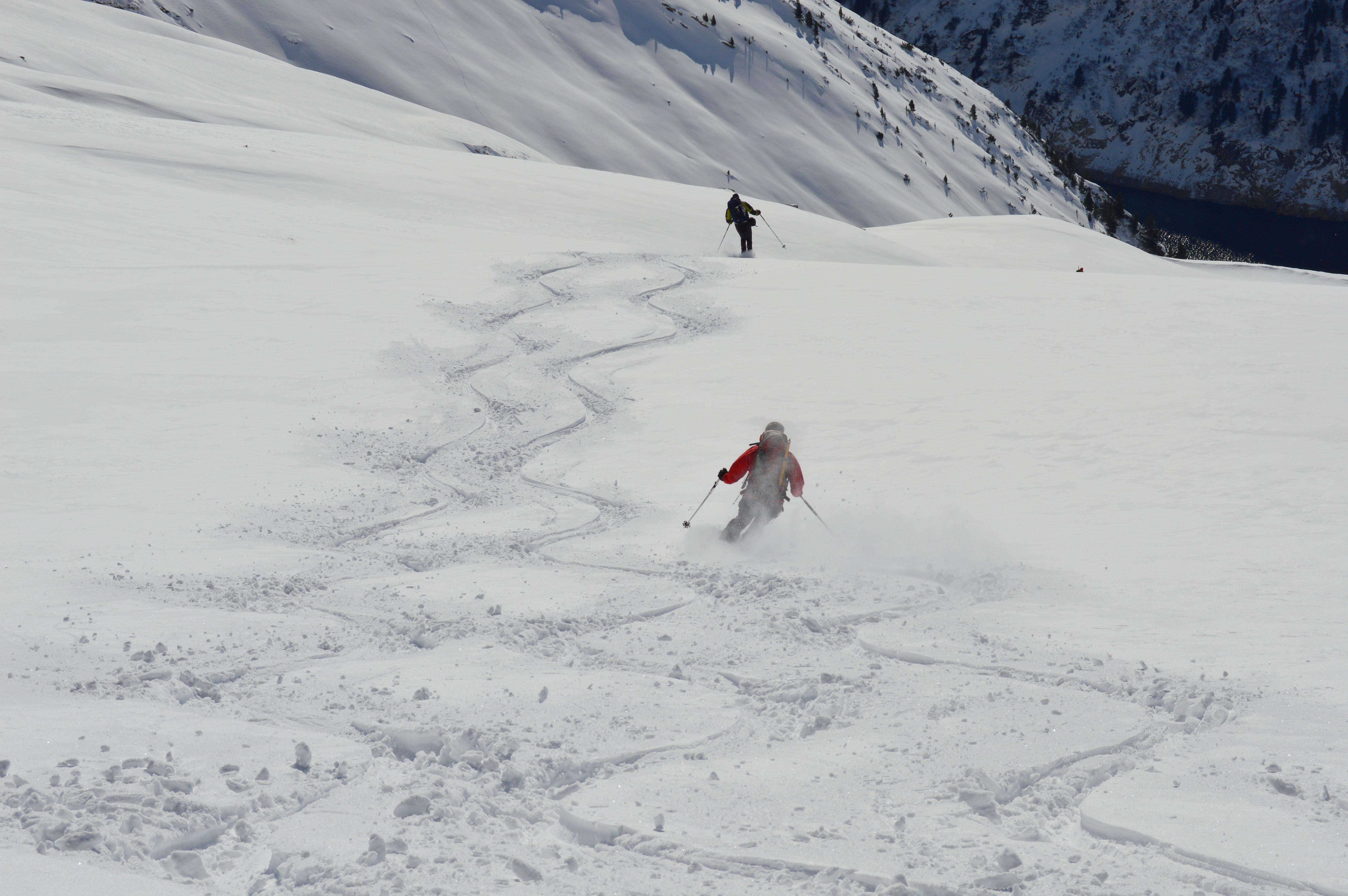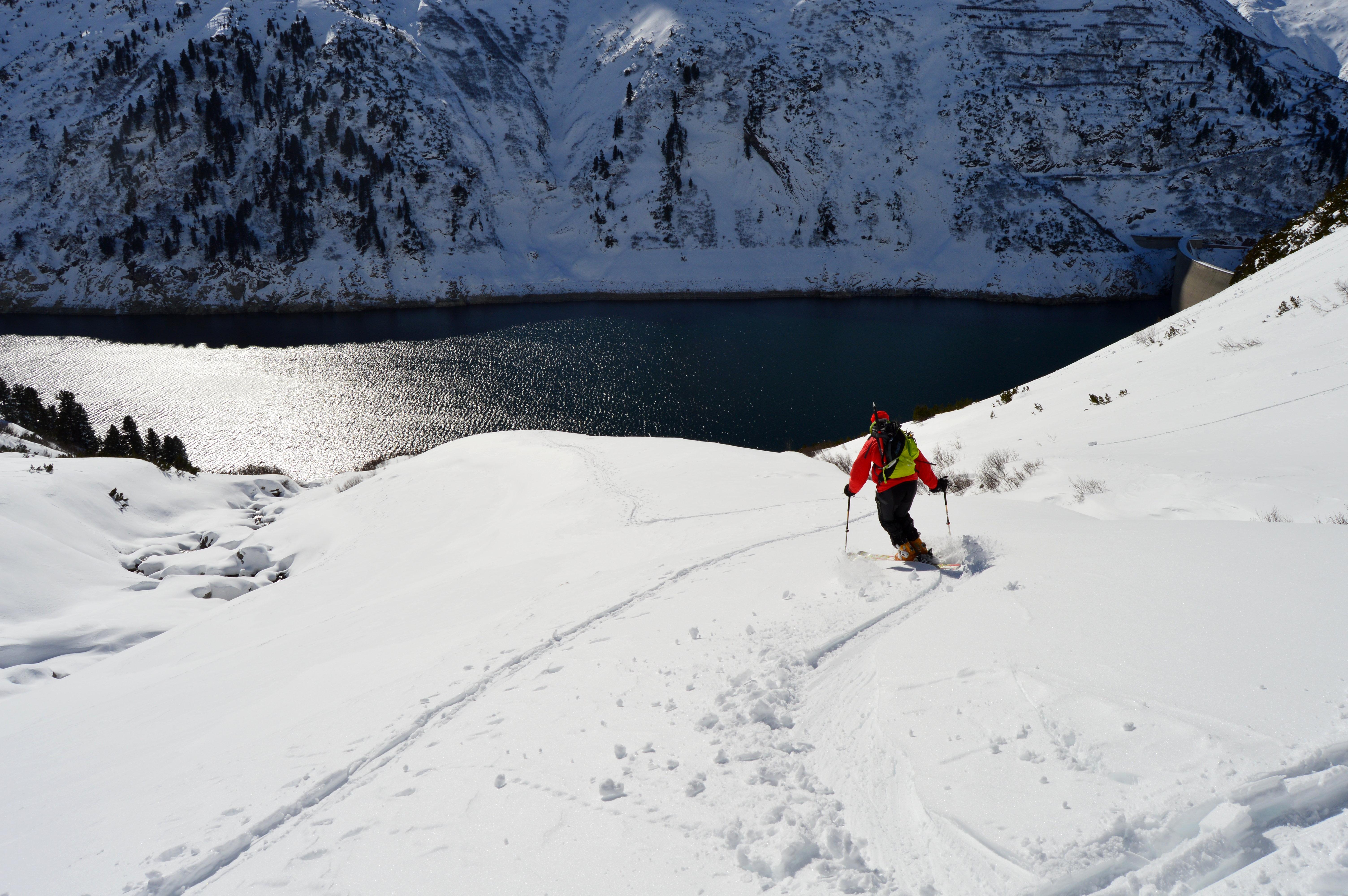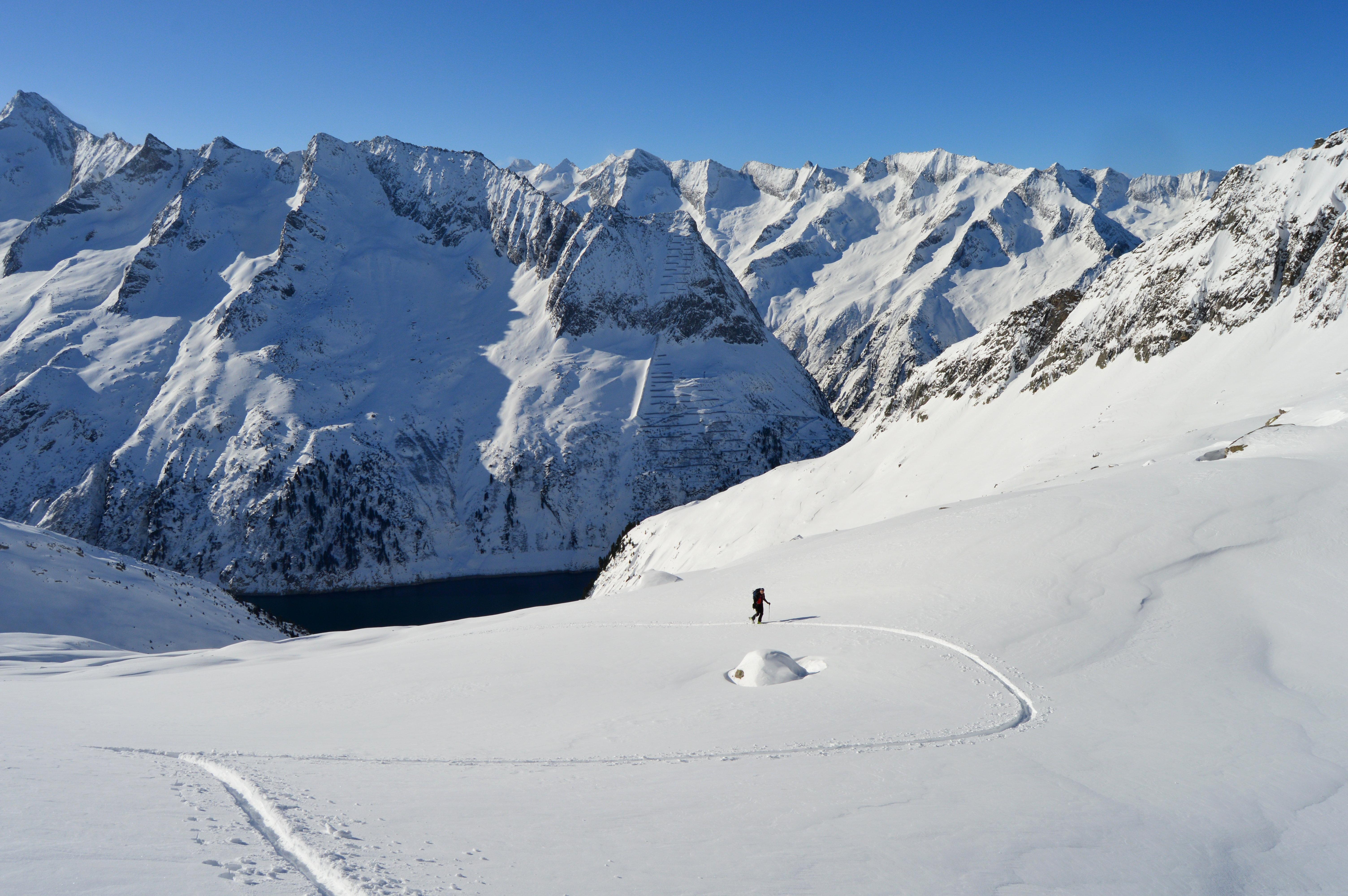 Eine nordseitige Tour war uns heute zu heikel, bzw. auf Kitzbühler hatten wir keine Lust. Also musste eine südseitige Tour her. Um noch sonnseitig Pulver und Sonne (die Nebelgrenze war ganz schön hoch) abzubekommen brauchte es heute ein höheres Ziel, also starteten wir ins Zillertal. Seltsamerweise war der Schnee oberhalb vom Stausee deutlich mehr vom Wind bearbeitet als weiter oben!!??? Lediglich der letzte Hang war etwas spannender zu fahren, ansonsten hatten wir schönen gesetzten Pulverschnee. Der gedeckelte Schnee oberhalb vom Stausee wurde von der Sonne bereits aufgeweicht und war wunderbar zu fahren.