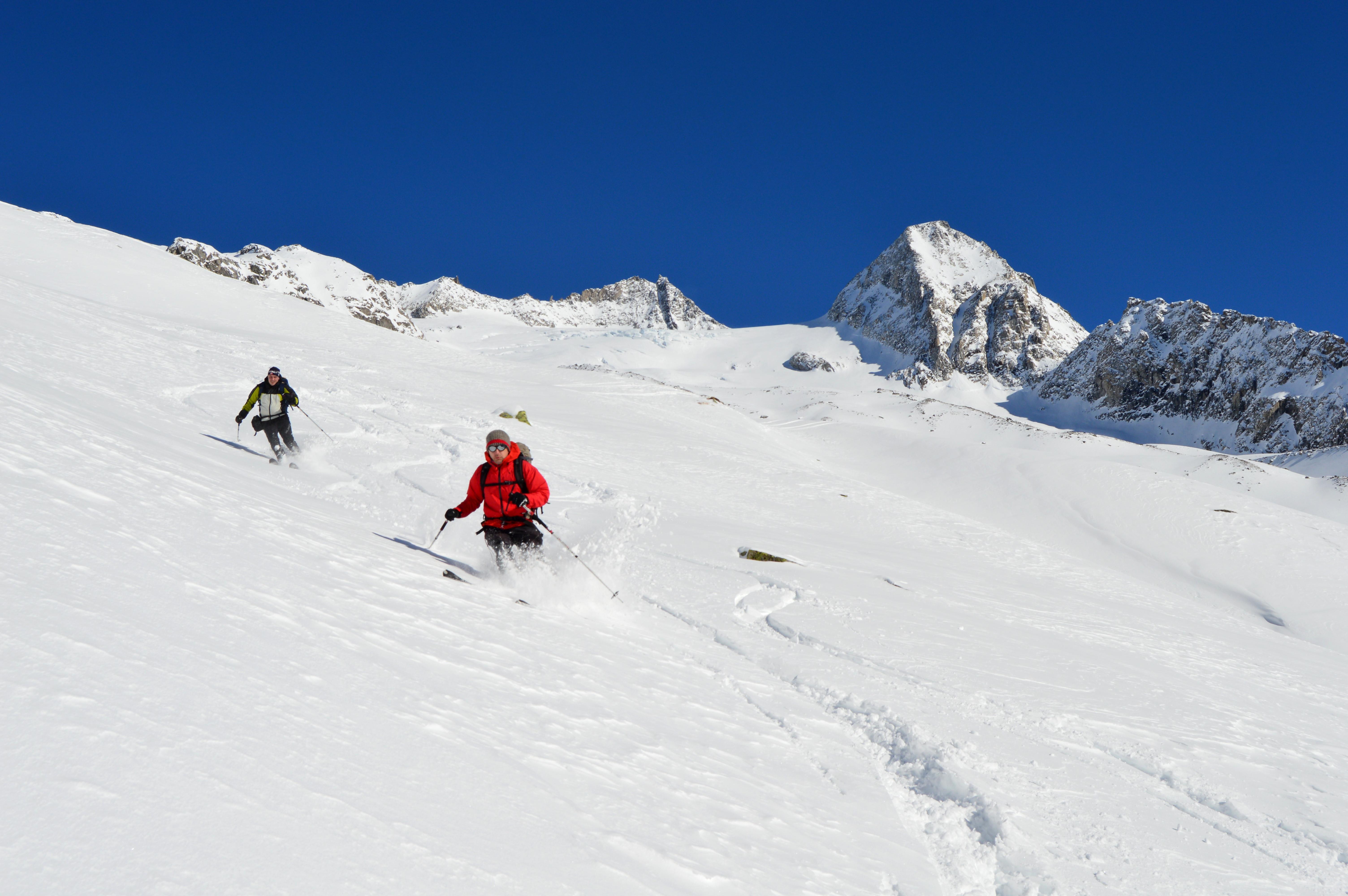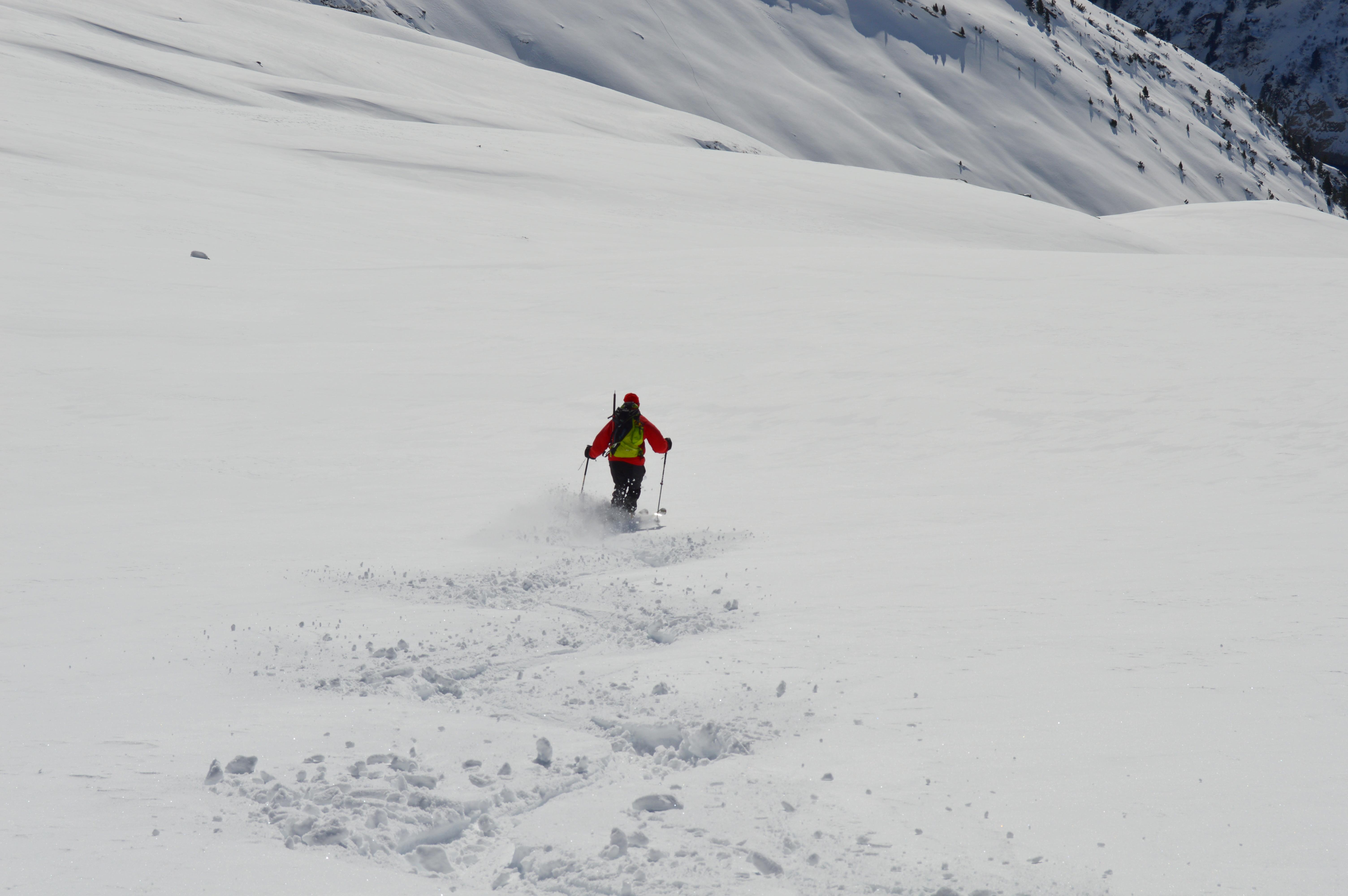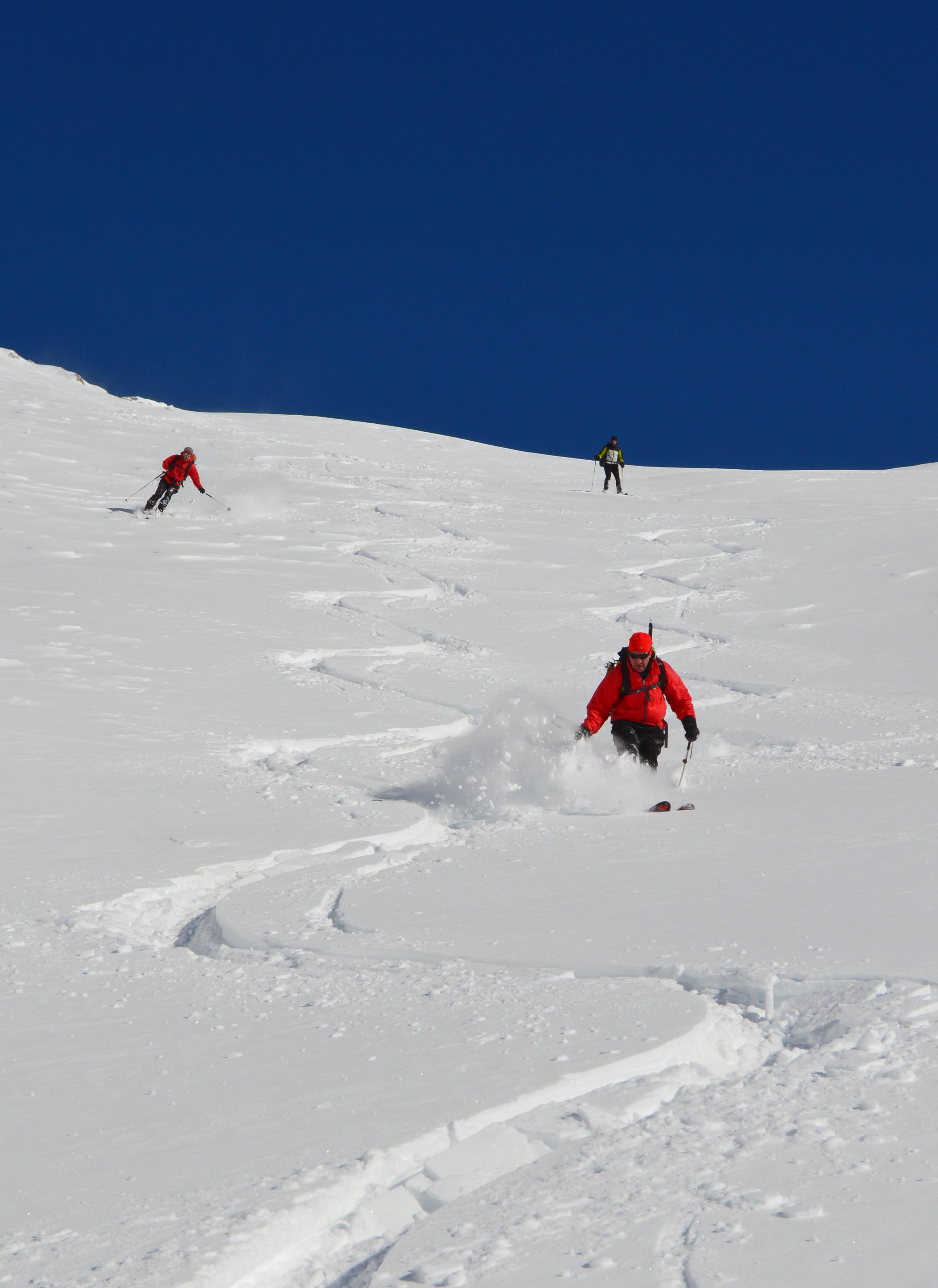 Eine nordseitige Tour war uns heute zu heikel, bzw. auf Kitzbühler hatten wir keine Lust. Also musste eine südseitige Tour her. Um noch sonnseitig Pulver und Sonne (die Nebelgrenze war ganz schön hoch) abzubekommen brauchte es heute ein höheres Ziel, also starteten wir ins Zillertal. Seltsamerweise war der Schnee oberhalb vom Stausee deutlich mehr vom Wind bearbeitet als weiter oben!!??? Lediglich der letzte Hang war etwas spannender zu fahren, ansonsten hatten wir schönen gesetzten Pulverschnee. Der gedeckelte Schnee oberhalb vom Stausee wurde von der Sonne bereits aufgeweicht und war wunderbar zu fahren.