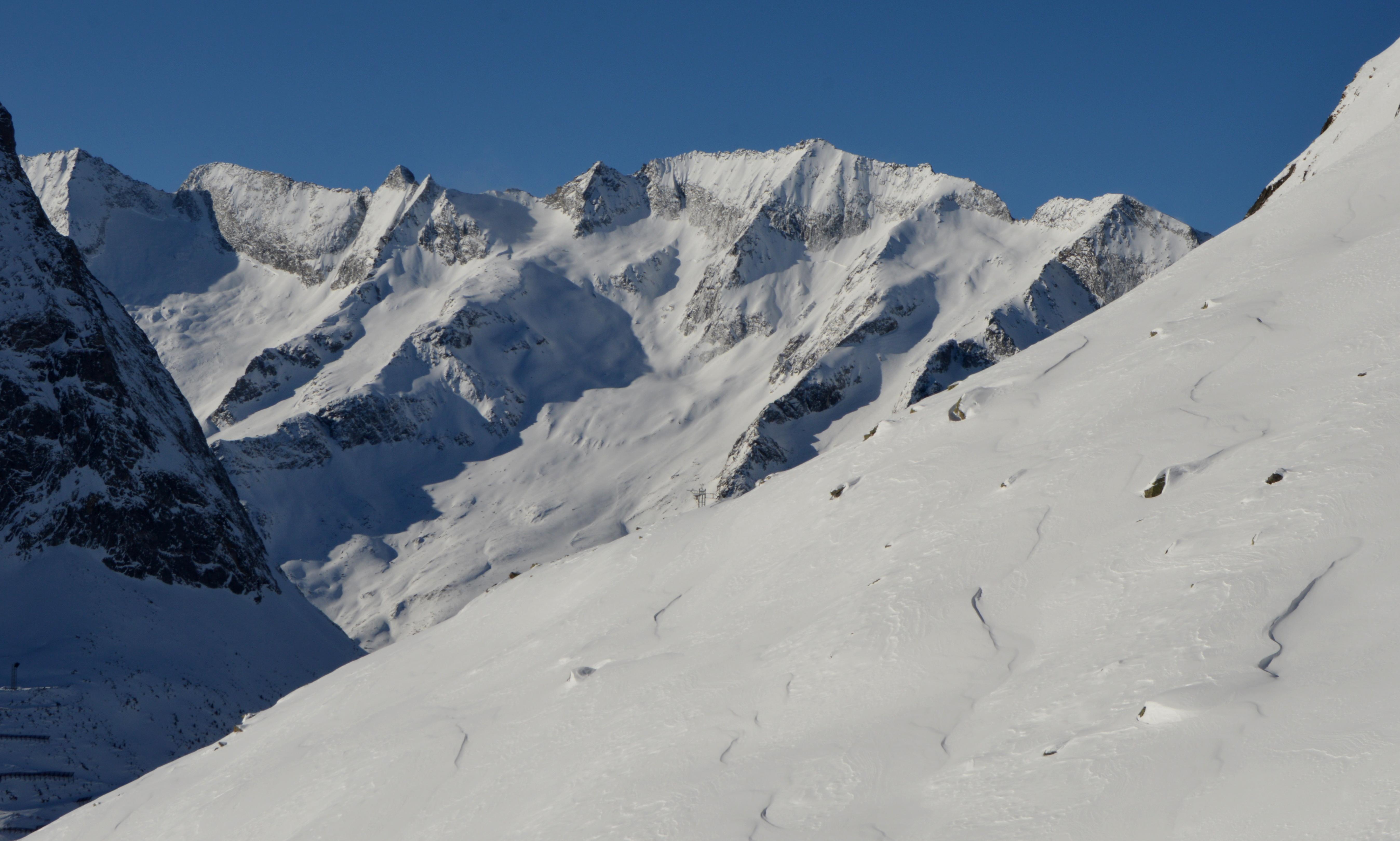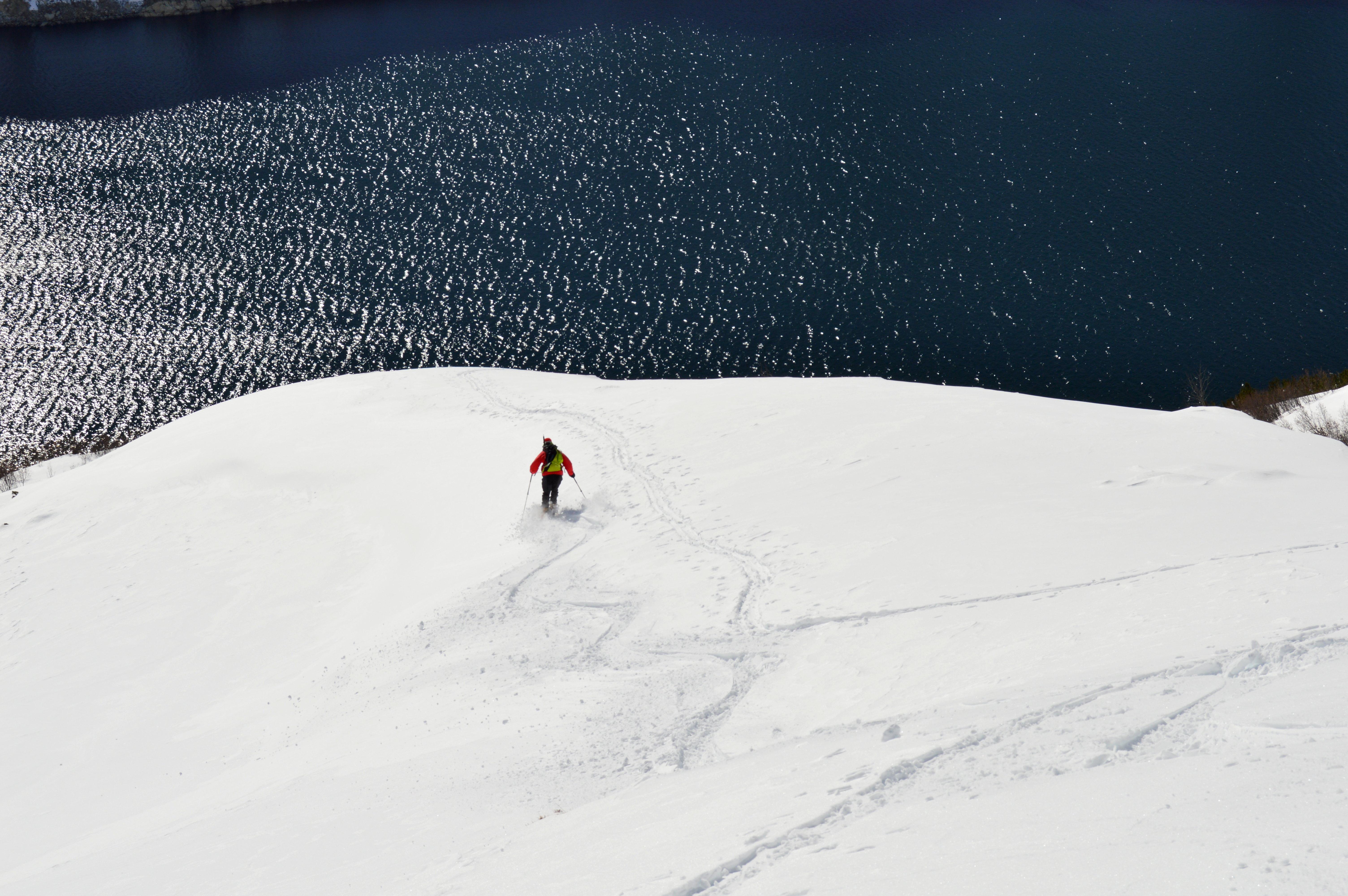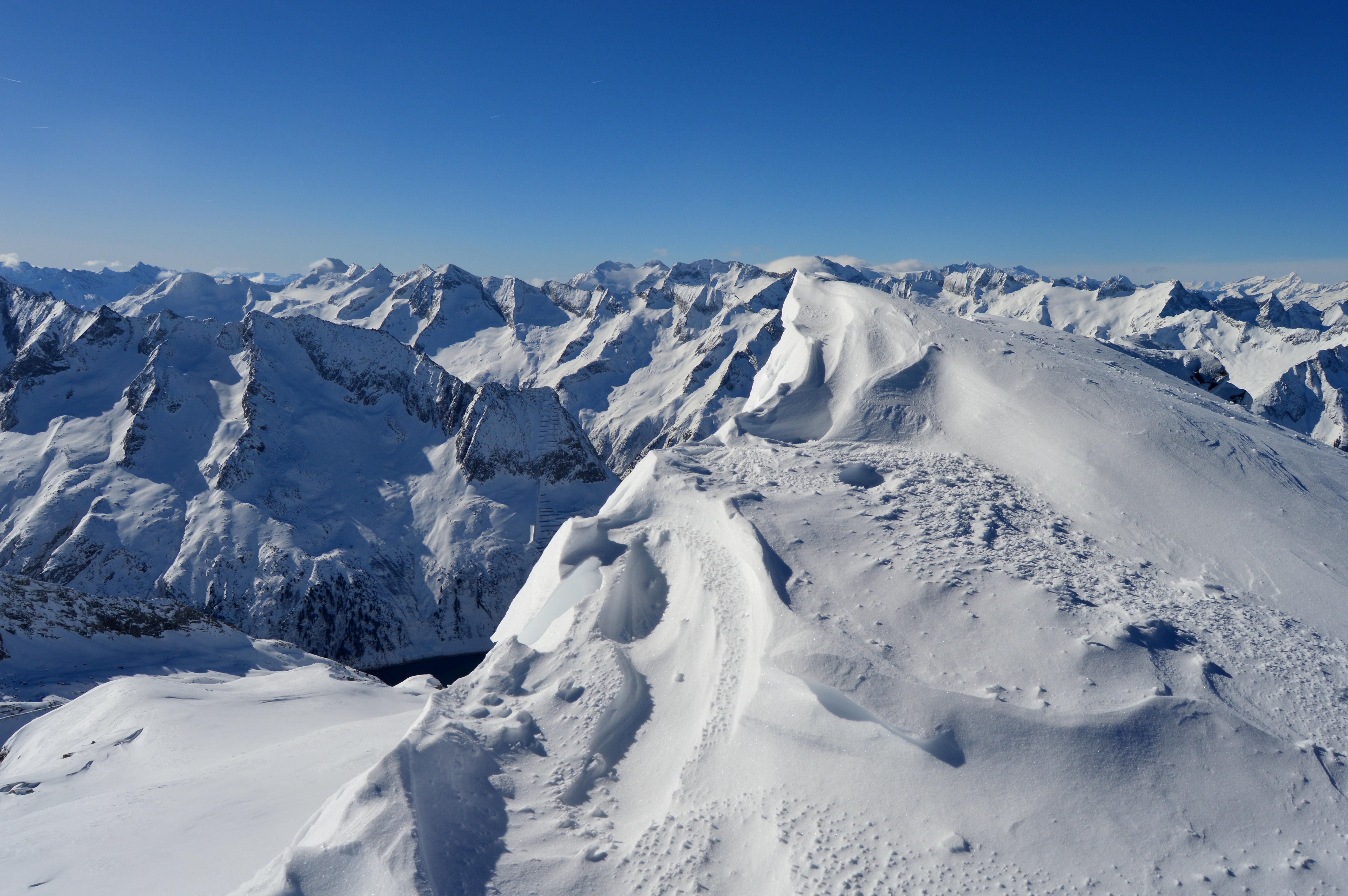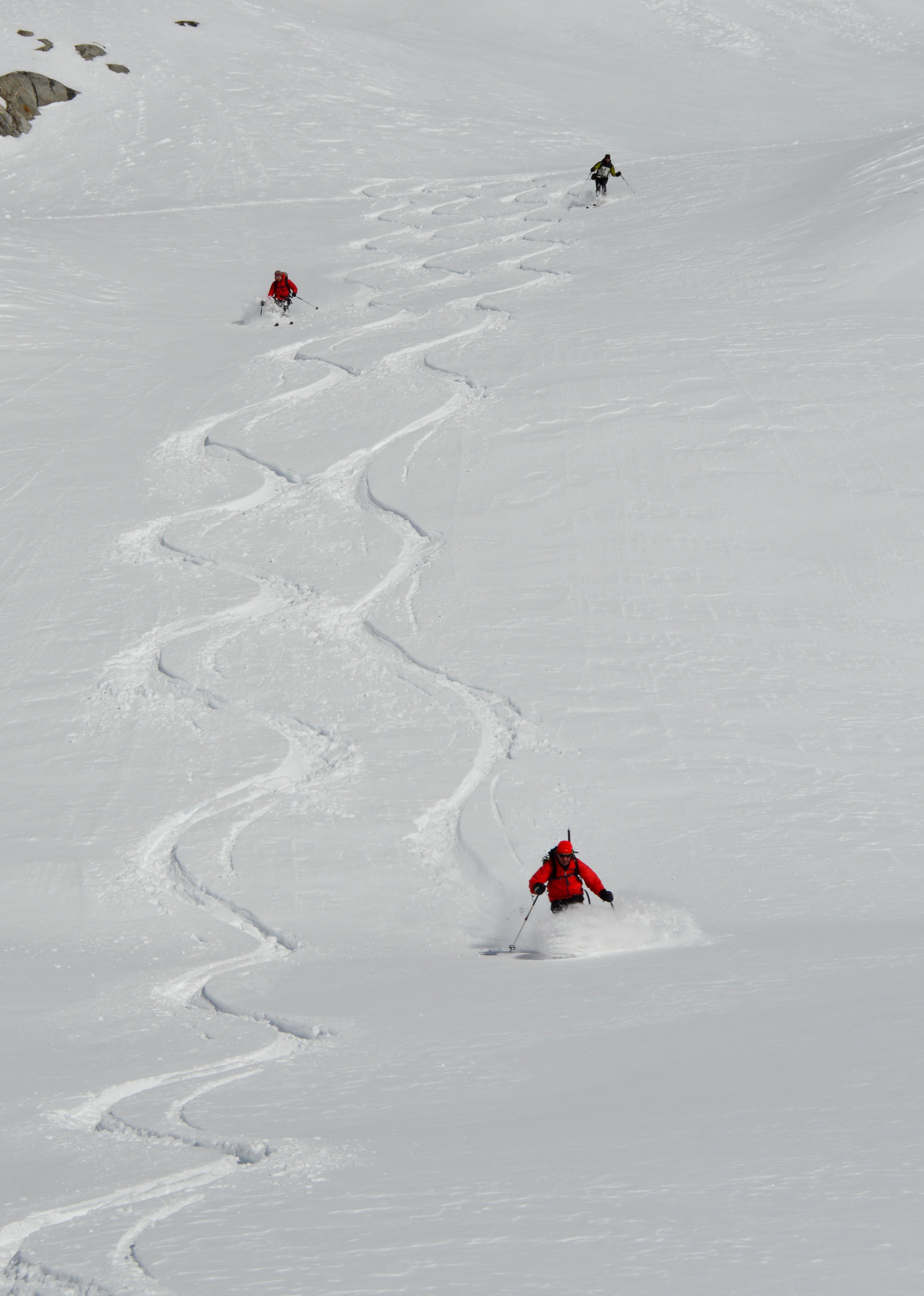 Eine nordseitige Tour war uns heute zu heikel, bzw. auf Kitzbühler hatten wir keine Lust. Also musste eine südseitige Tour her. Um noch sonnseitig Pulver und Sonne (die Nebelgrenze war ganz schön hoch) abzubekommen brauchte es heute ein höheres Ziel, also starteten wir ins Zillertal. Seltsamerweise war der Schnee oberhalb vom Stausee deutlich mehr vom Wind bearbeitet als weiter oben!!??? Lediglich der letzte Hang war etwas spannender zu fahren, ansonsten hatten wir schönen gesetzten Pulverschnee. Der gedeckelte Schnee oberhalb vom Stausee wurde von der Sonne bereits aufgeweicht und war wunderbar zu fahren.