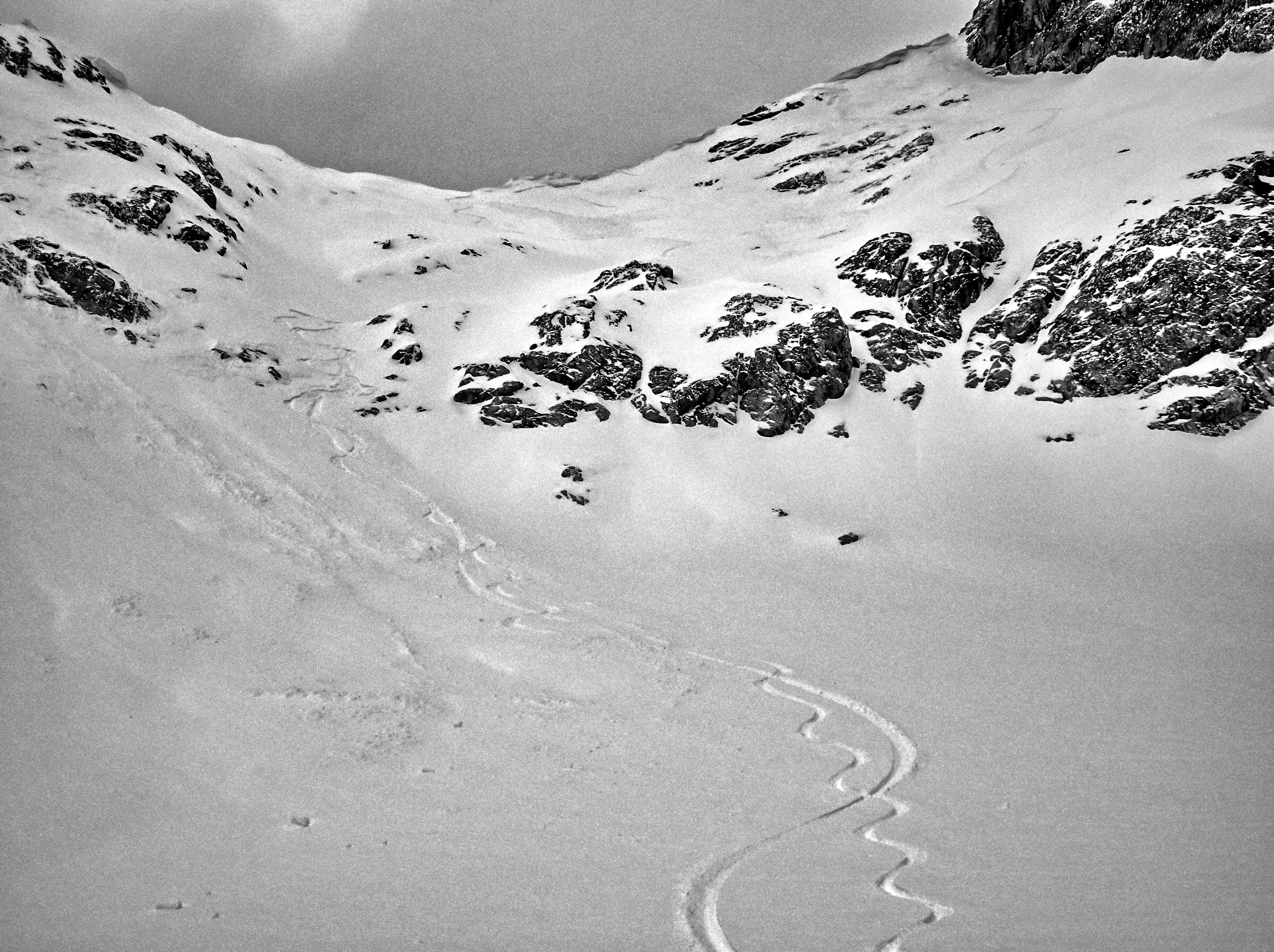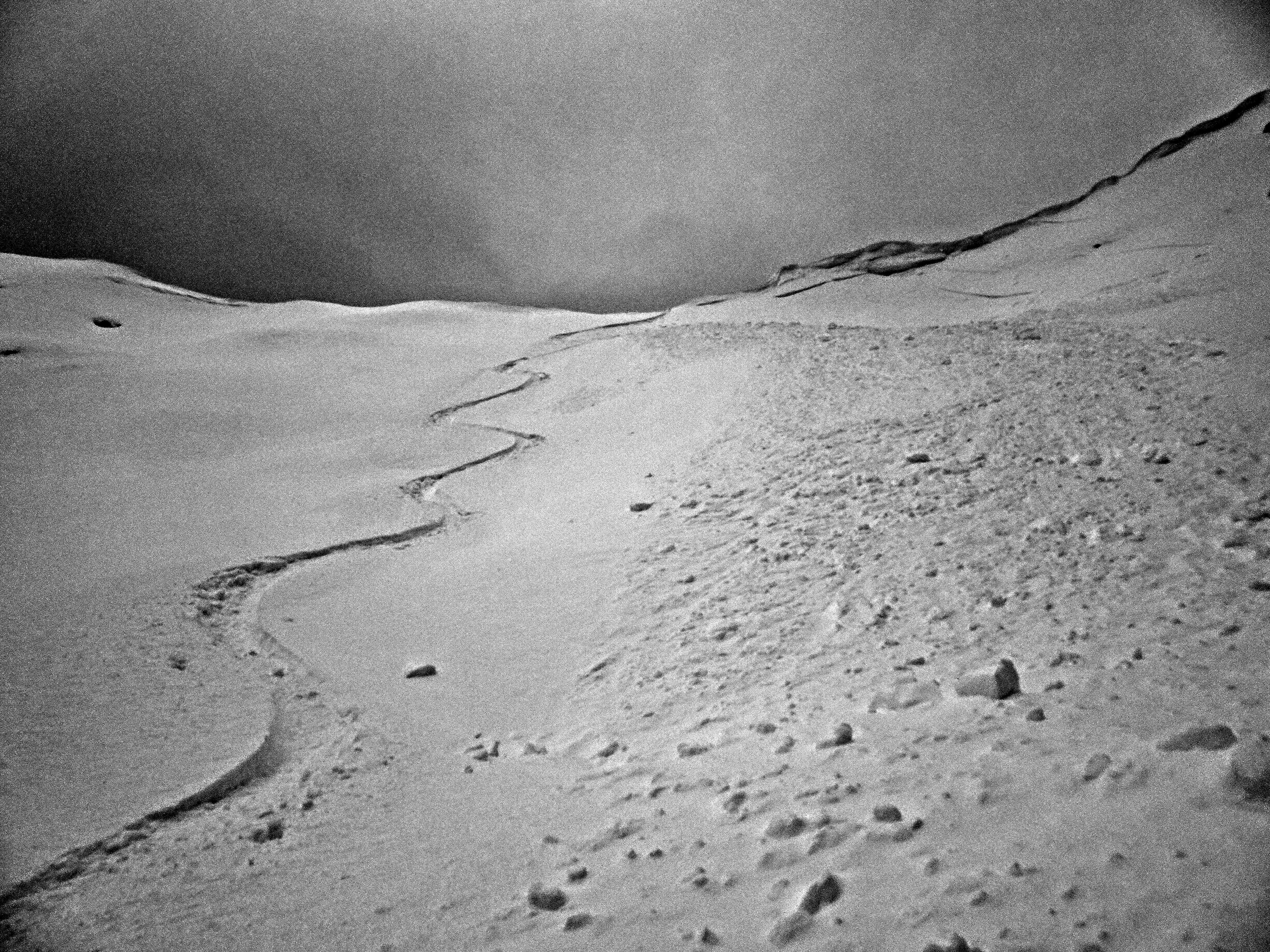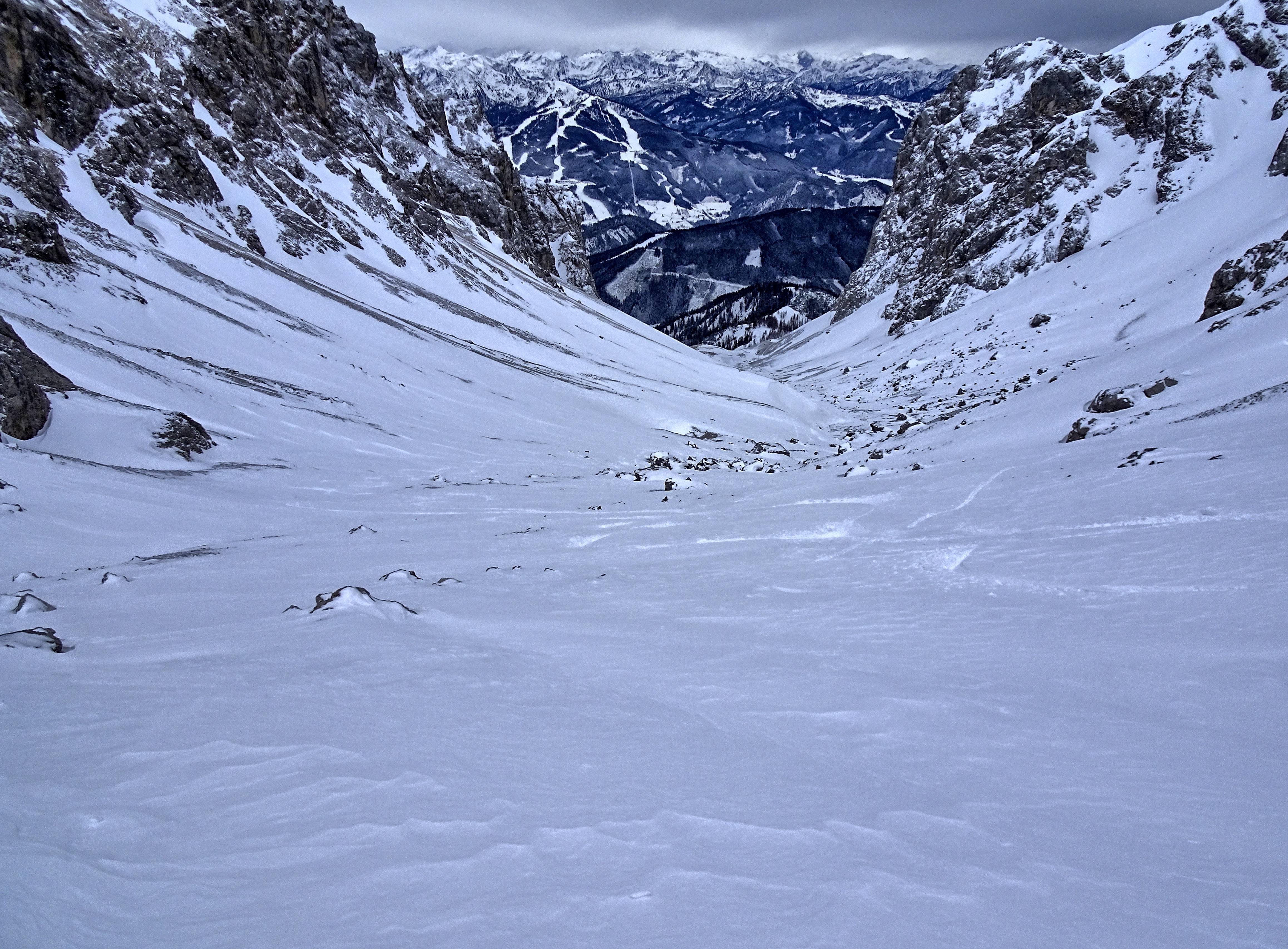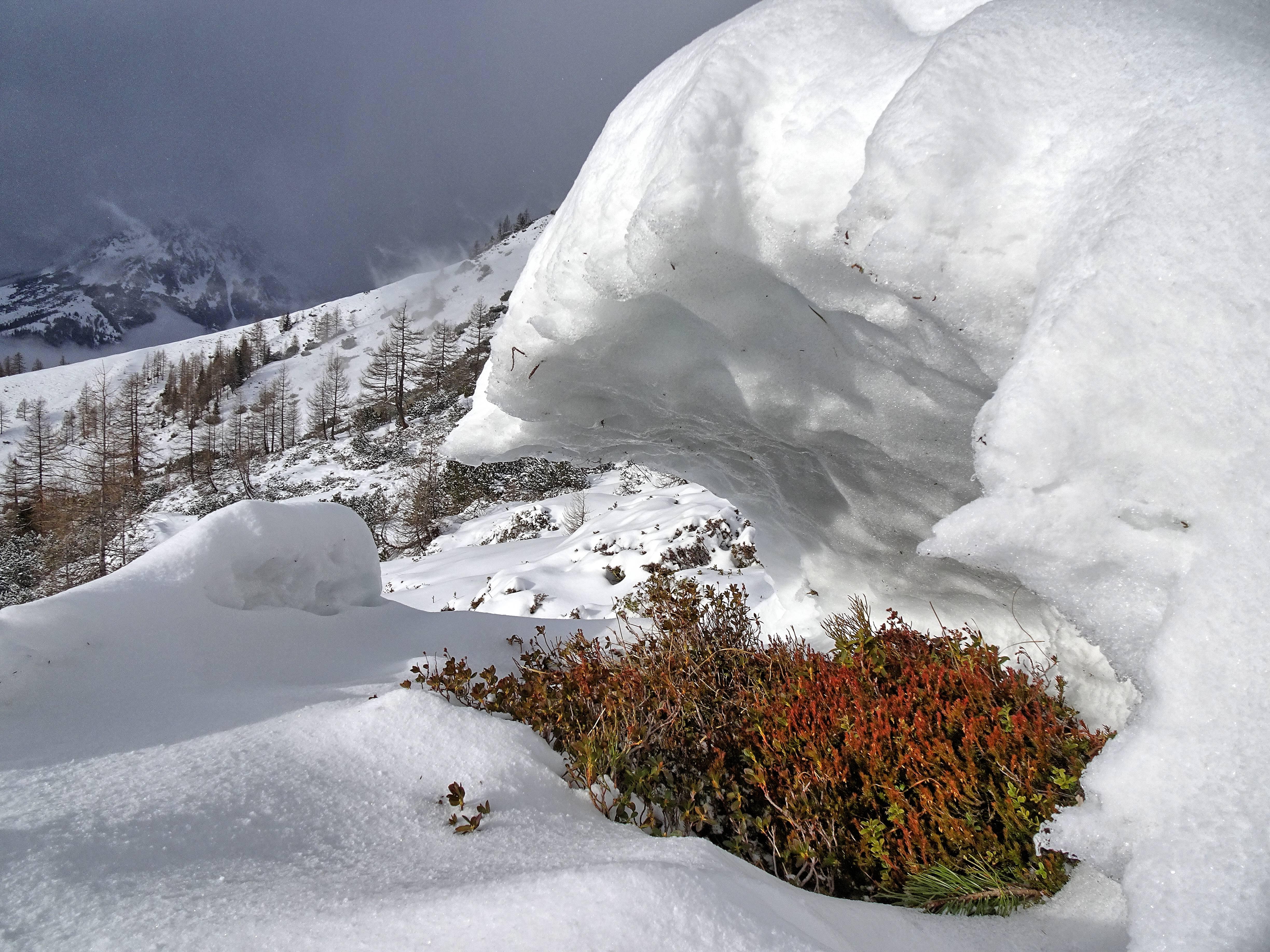 Gestern Erkundungstour bei sonnigem Wetter. Böiger, teils stürmischer Wind hat zu kleinräumigen Verfrachtungen geführt, der großteils lockere Neuschnee ist umgelagert worden ...