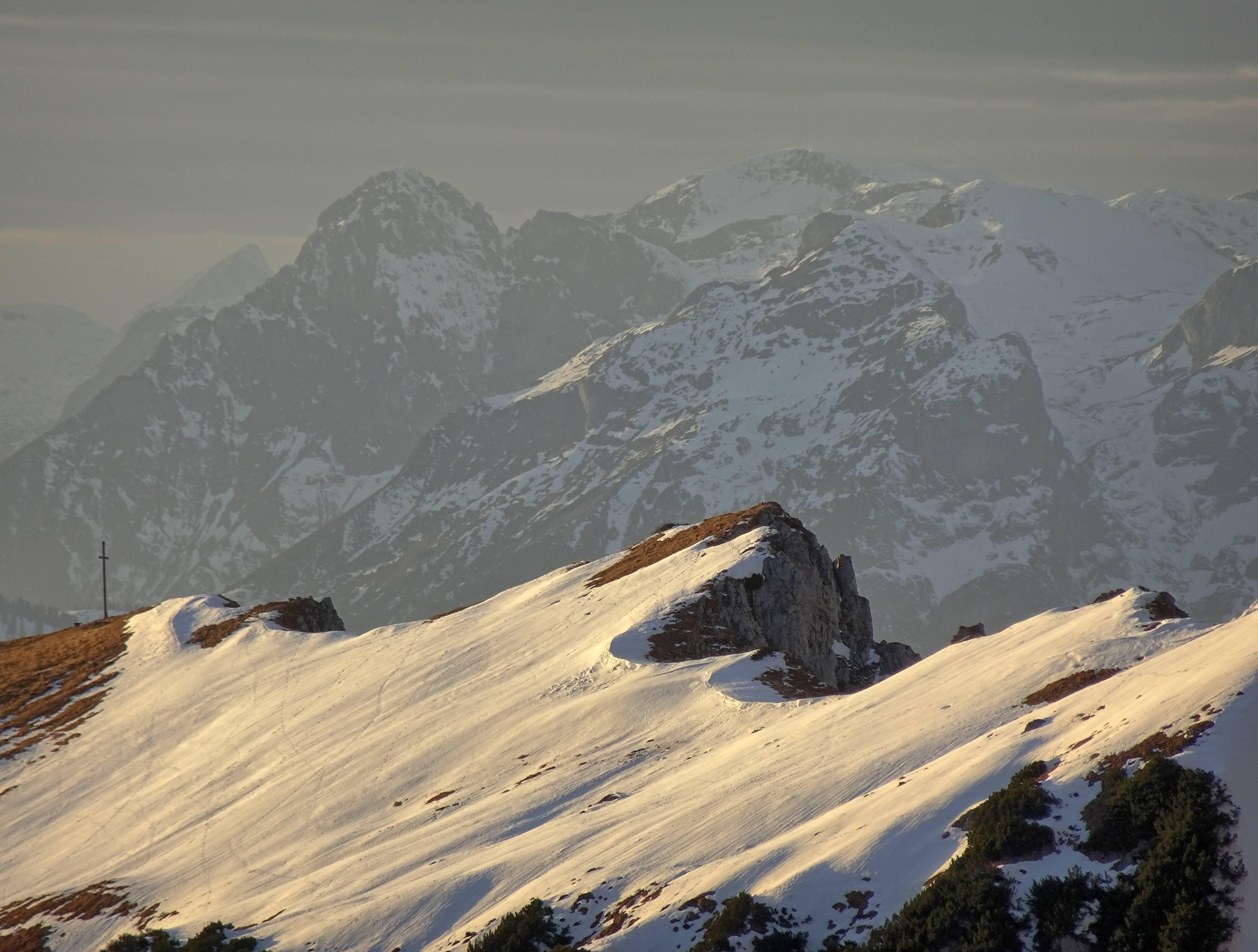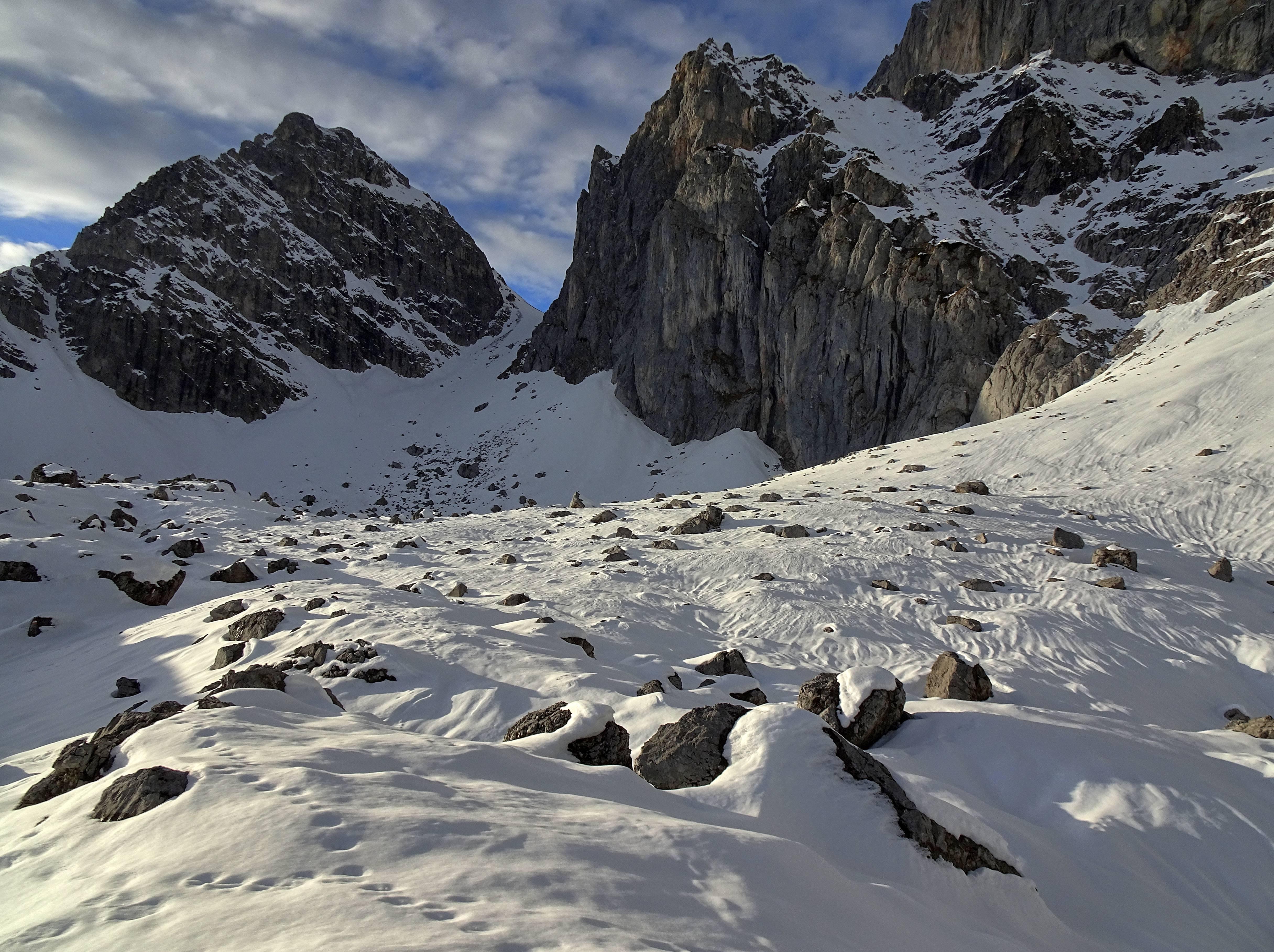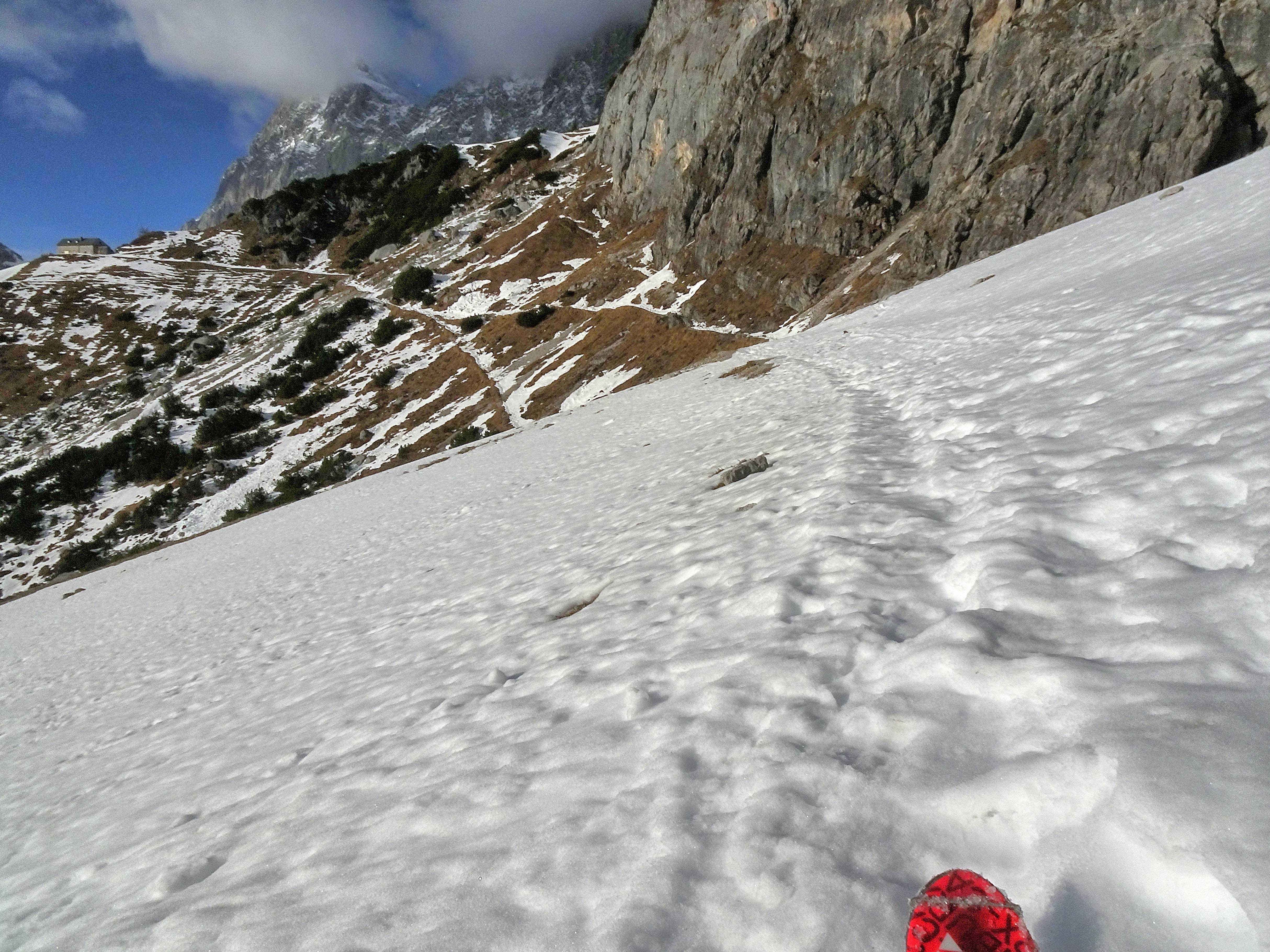 Die Schneedecke auf dieser Höhe (1700 - 2000m) südseitig frühjährlich gesetzt, durchfeuchtet, gut tragend. Vermutlich vormittags nach Abstrahlung noch bessere Bedingungen.