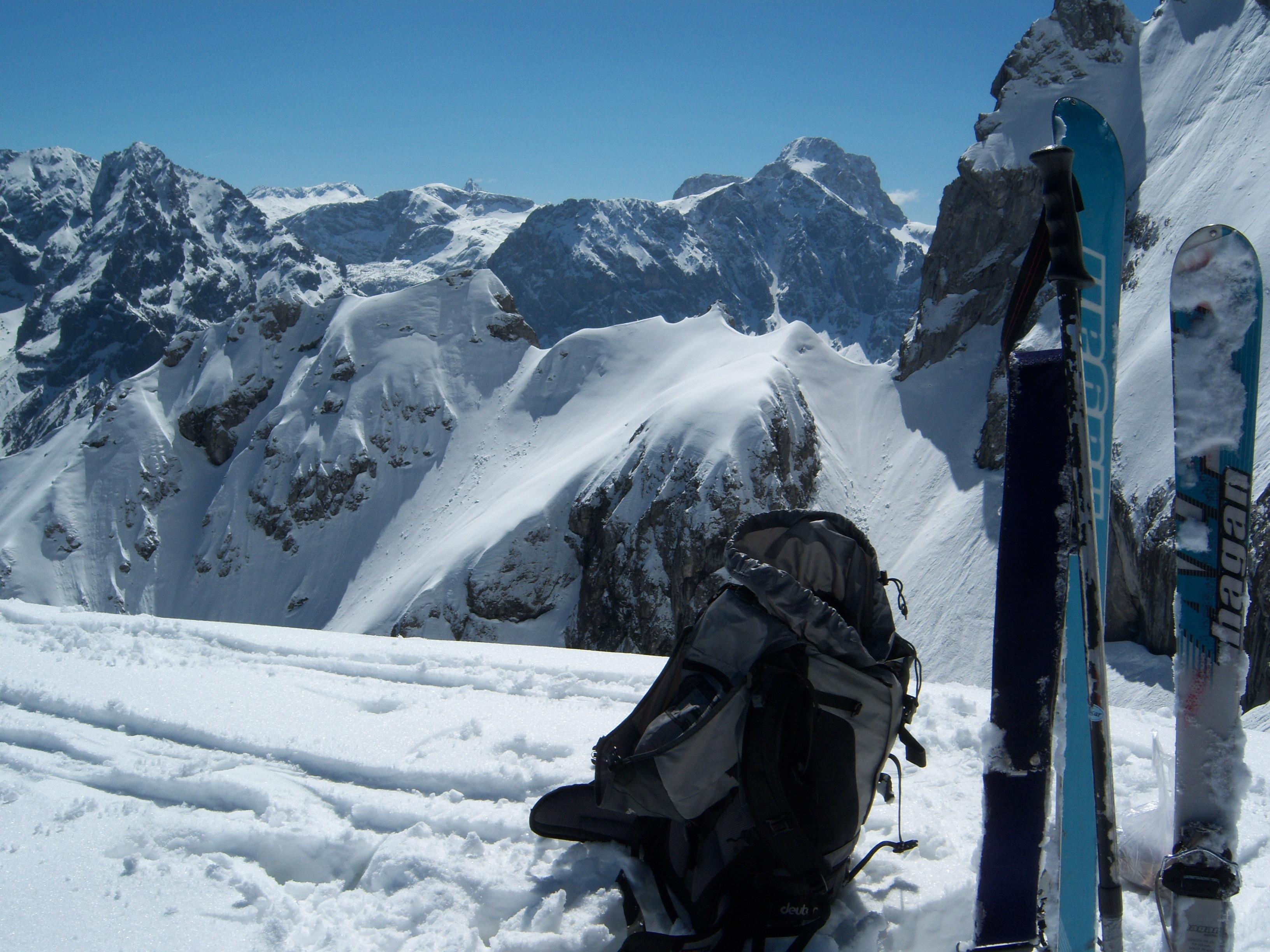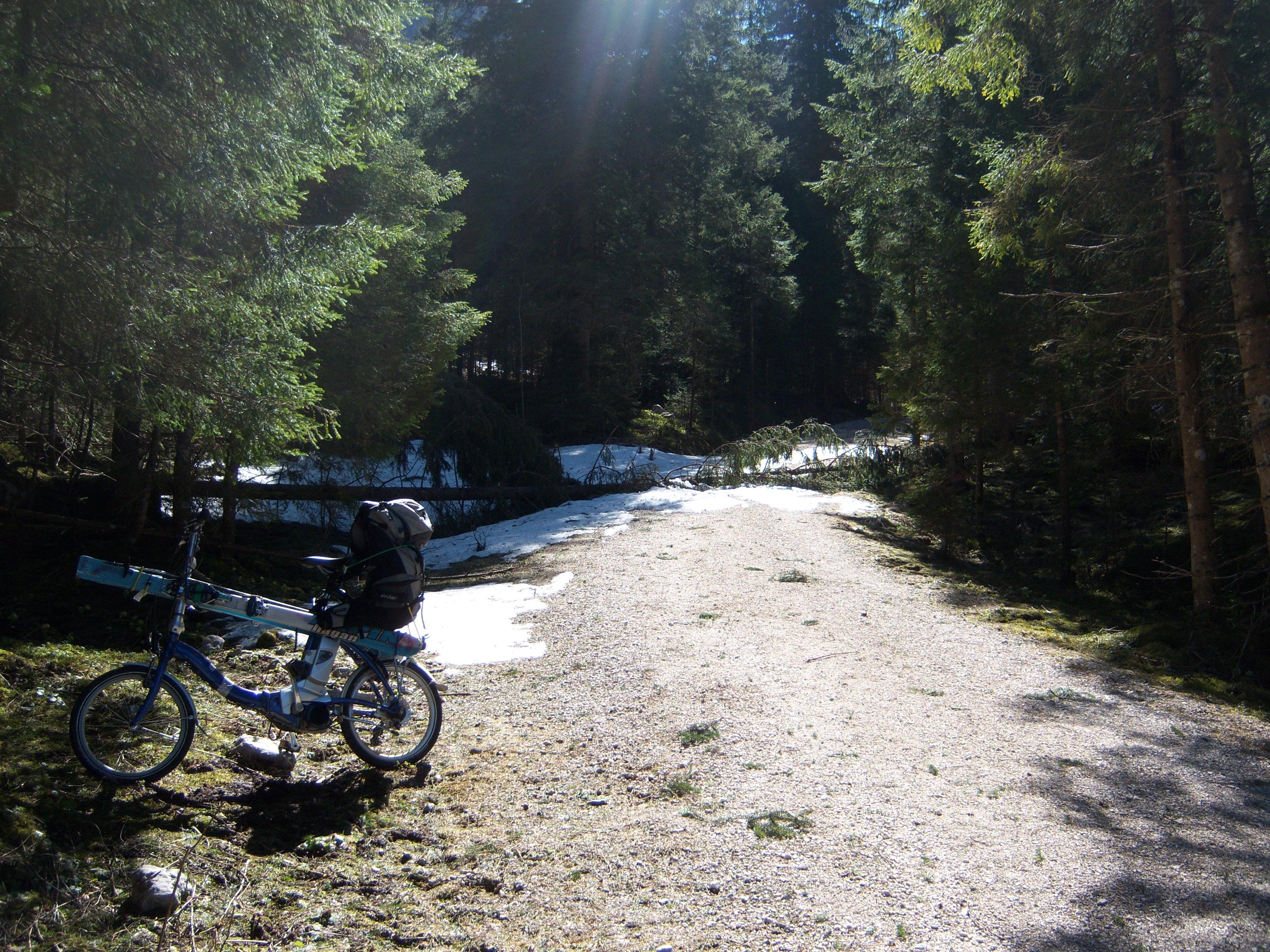 Mit dem E-Klapprad bis zur Eckaualm. Schnee beginnt in halber Höhe vom Wald. Nordseitig bis 7cm Pulver gut verbunden auf Harsch, Ostseitig Pulver auf Bruchharsch, darunter grundloser Sulz.