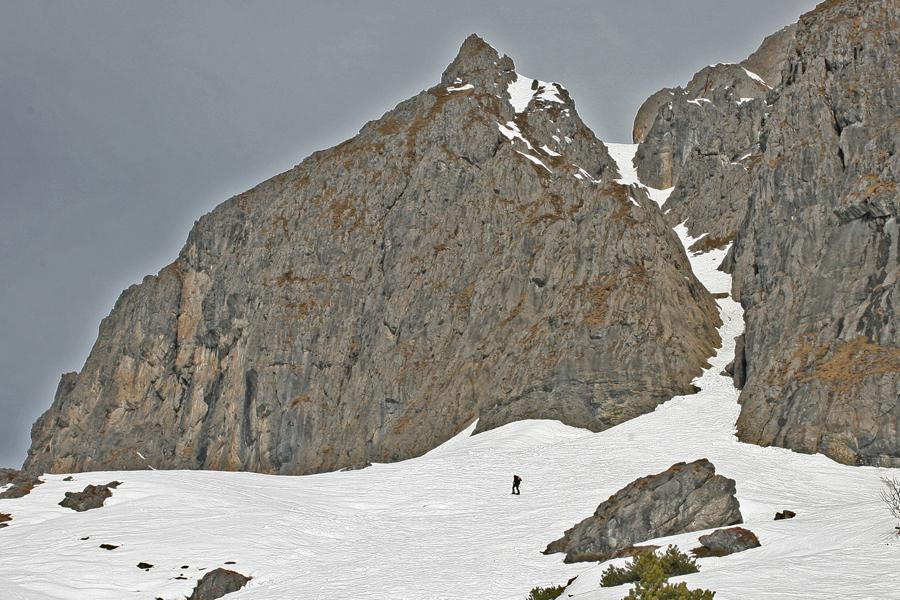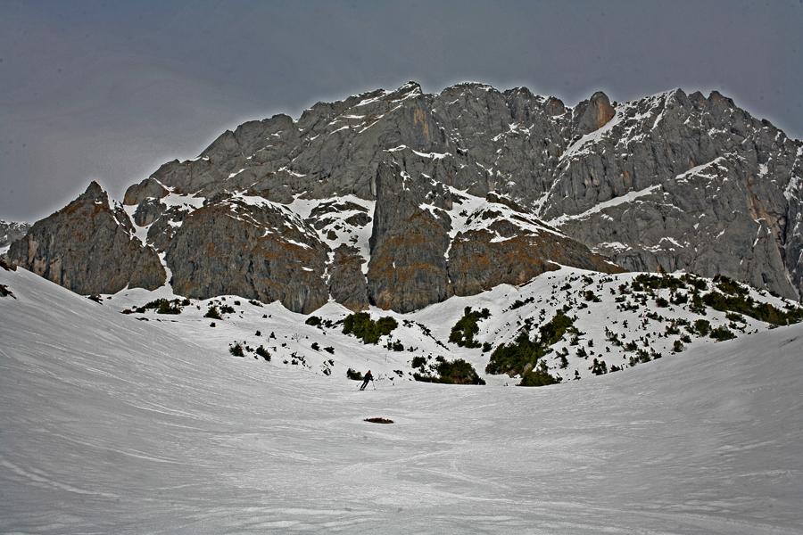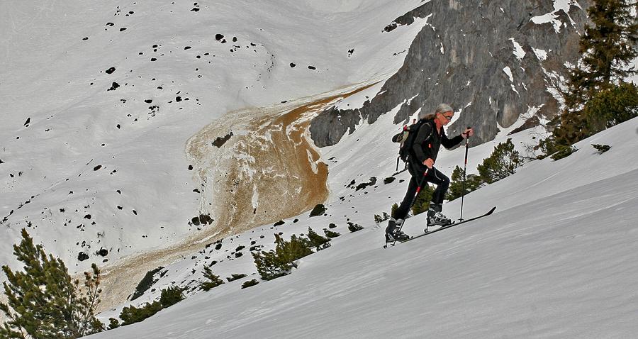 Bis Mittag gibt es heute Sonne, der Mitterriedl noch mit reichlich Schnee bedeckt, zweimal auf und ab, zuerst ist die Ostseite an der Reihe, später drehen wir uns in Richtung westliche Hänge. Die Schneedecke trägt ausgezeichnet, so wird aus der Altherrentour ein netter Vormittag.