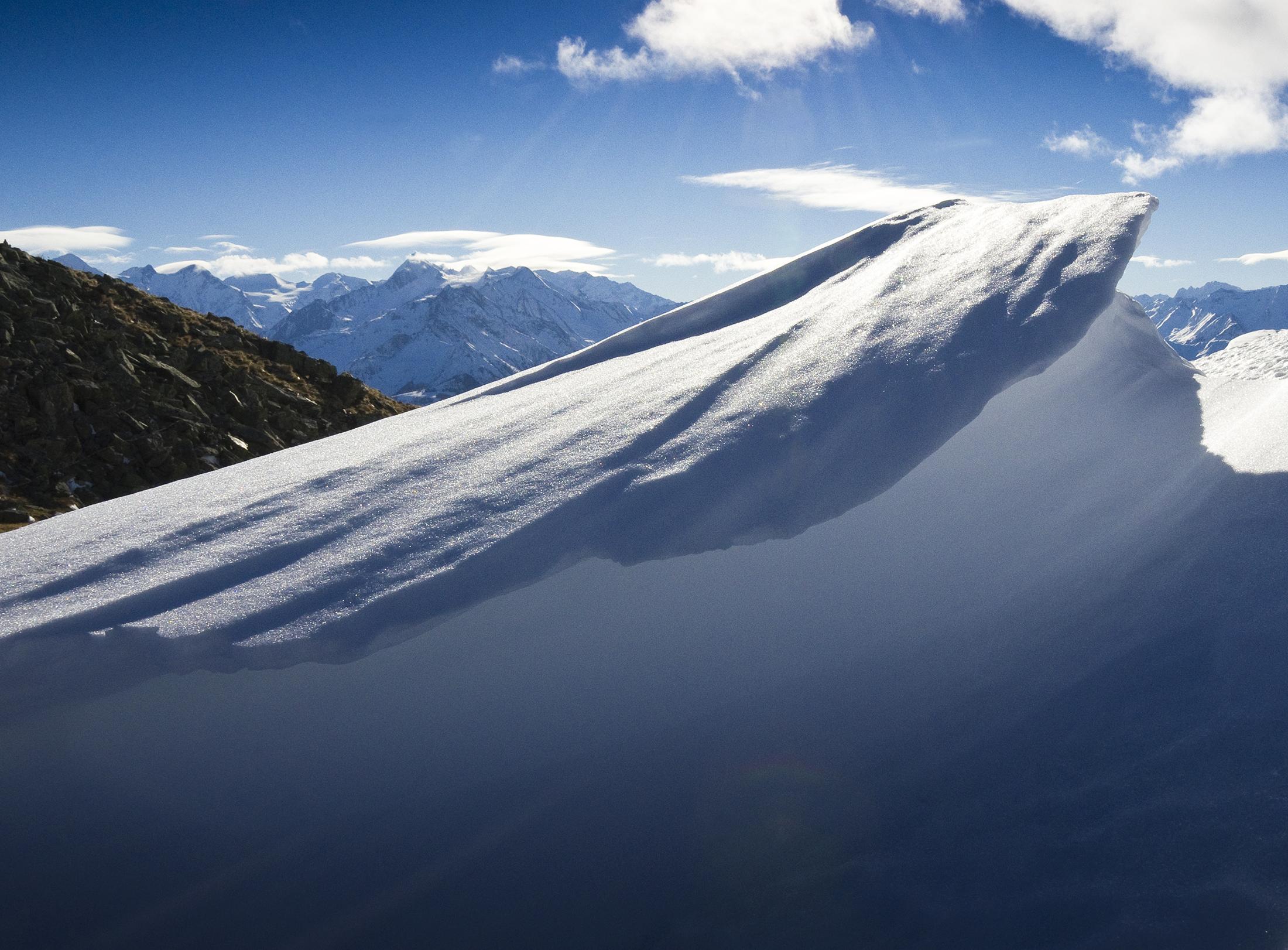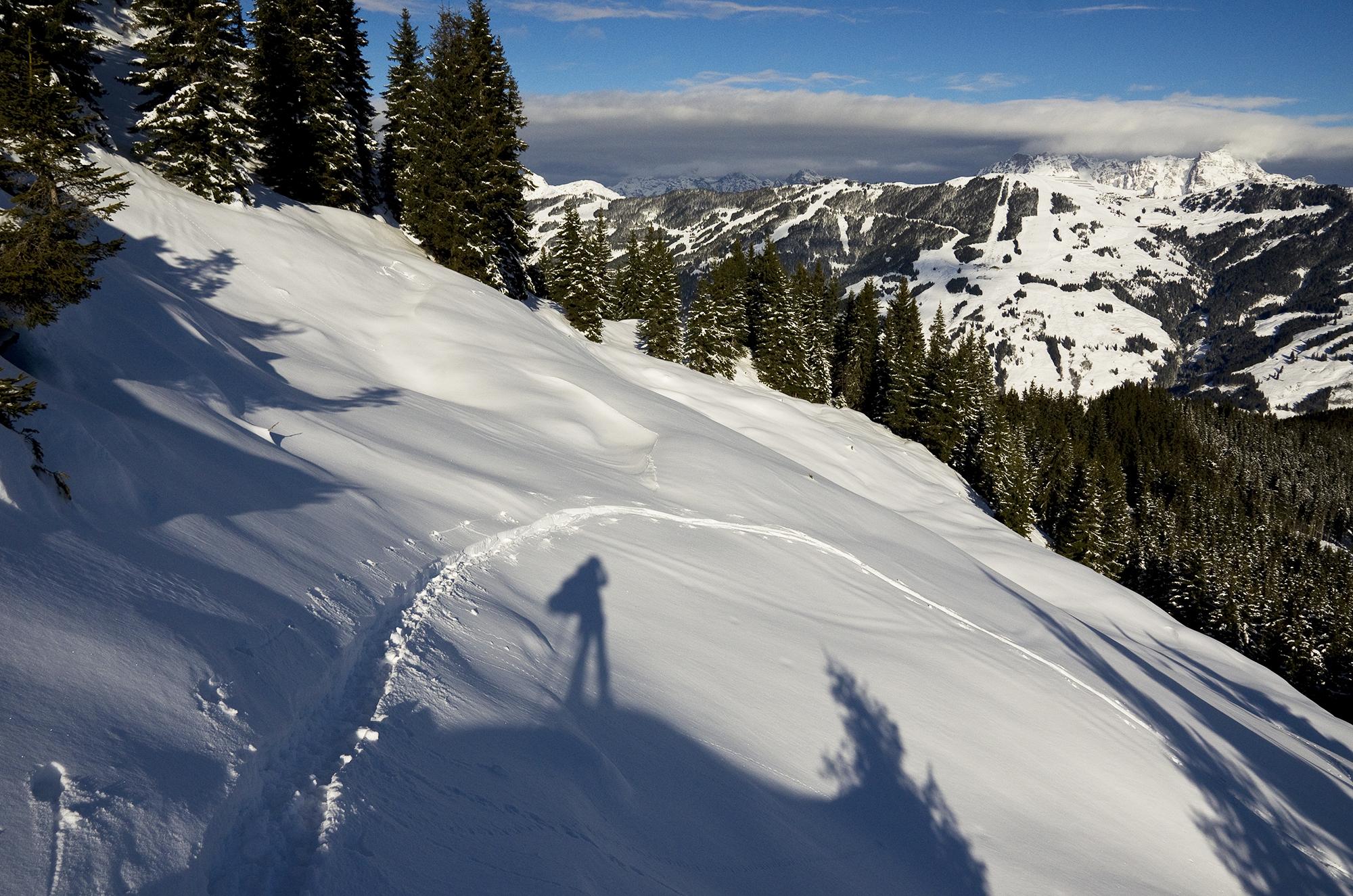 Von Norden aus dem Exenbachgraben bei wunderbarem Pulverschnee. Am langen Gipfelkamm sind die Steine freigeblasen, sonst westseitig die Regenharschschicht, ostseitig Triebschnee. Wer hinüber zum Gernkogel geht, sollte die Ski am Langeck zurücklassen. Die steilen Osthänge verbieten sich ohnehin noch für die Abfahrt, und am Grat ist kein Schnee.