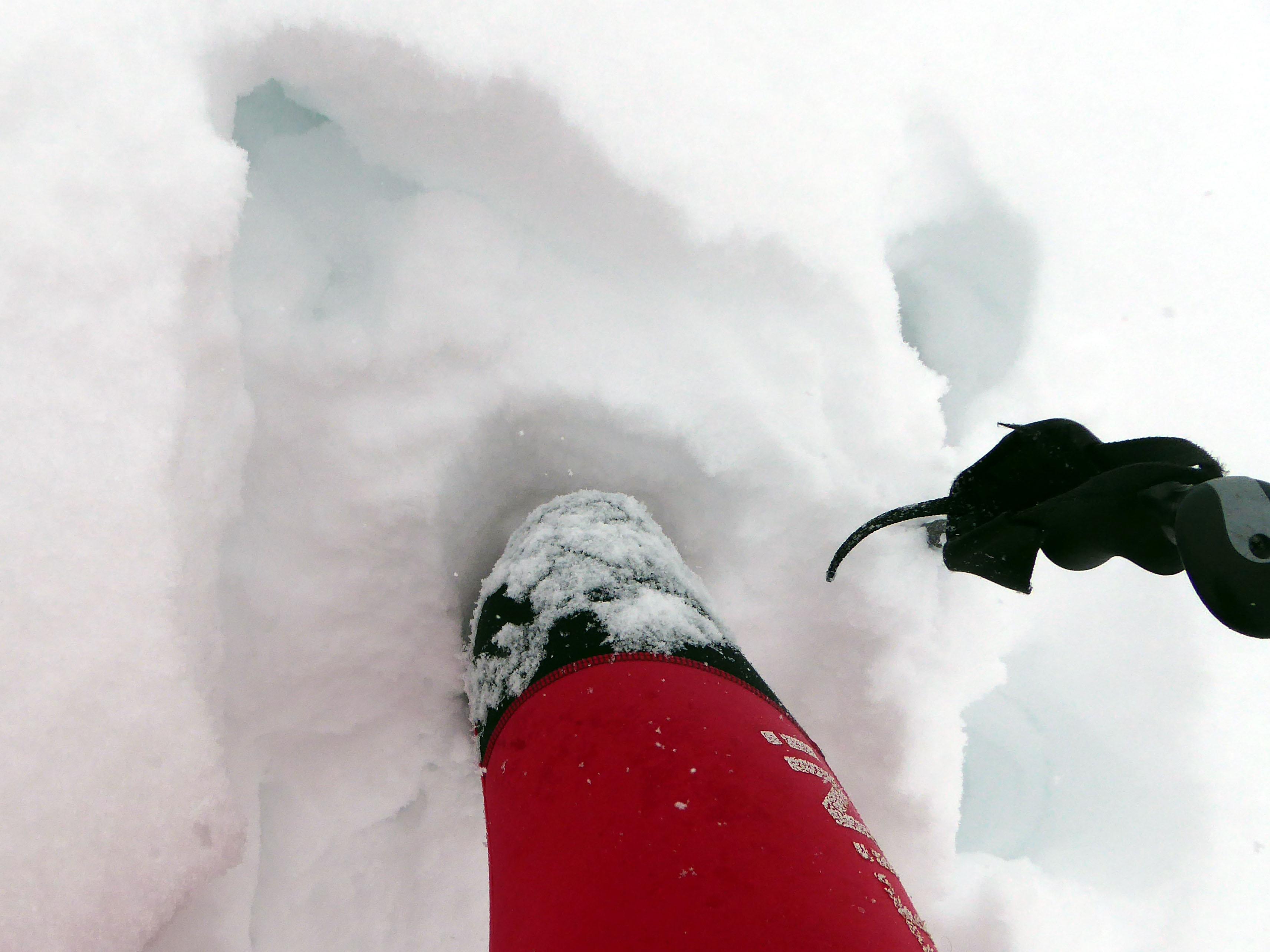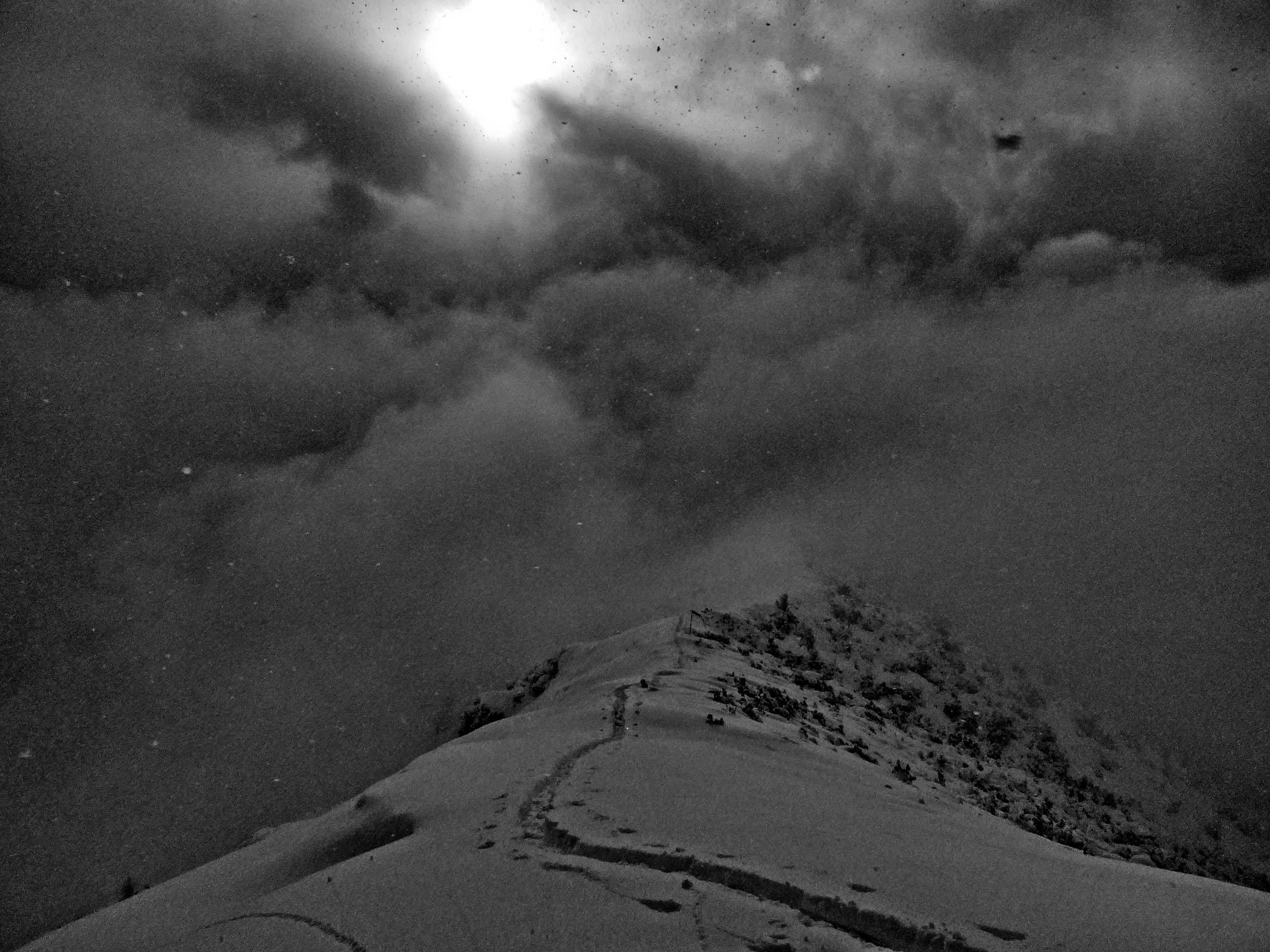 Schneelage: Nachdem Frau Holle den Winteranfang verpennt hat, scheint sie jetzt alles nachholen zu wollen. Im Tal liegen ca. 50-60cm Pulverschnee, oben unterschiedliche Schneehöhen, in windgeschützten Lagen bis über 1m, sonst ca.60-80cm. Leider alles ziemlich grundloser Pulverschnee mit sehr hohen Einsinktiefen und manchmal kaum mehr zu spuren. Die Abfahrten erfolgten mit normalen Tourenski meist in Schussfahrt und da musste oft noch geschoben werden, also nicht gerade berauschende Verhältnisse.