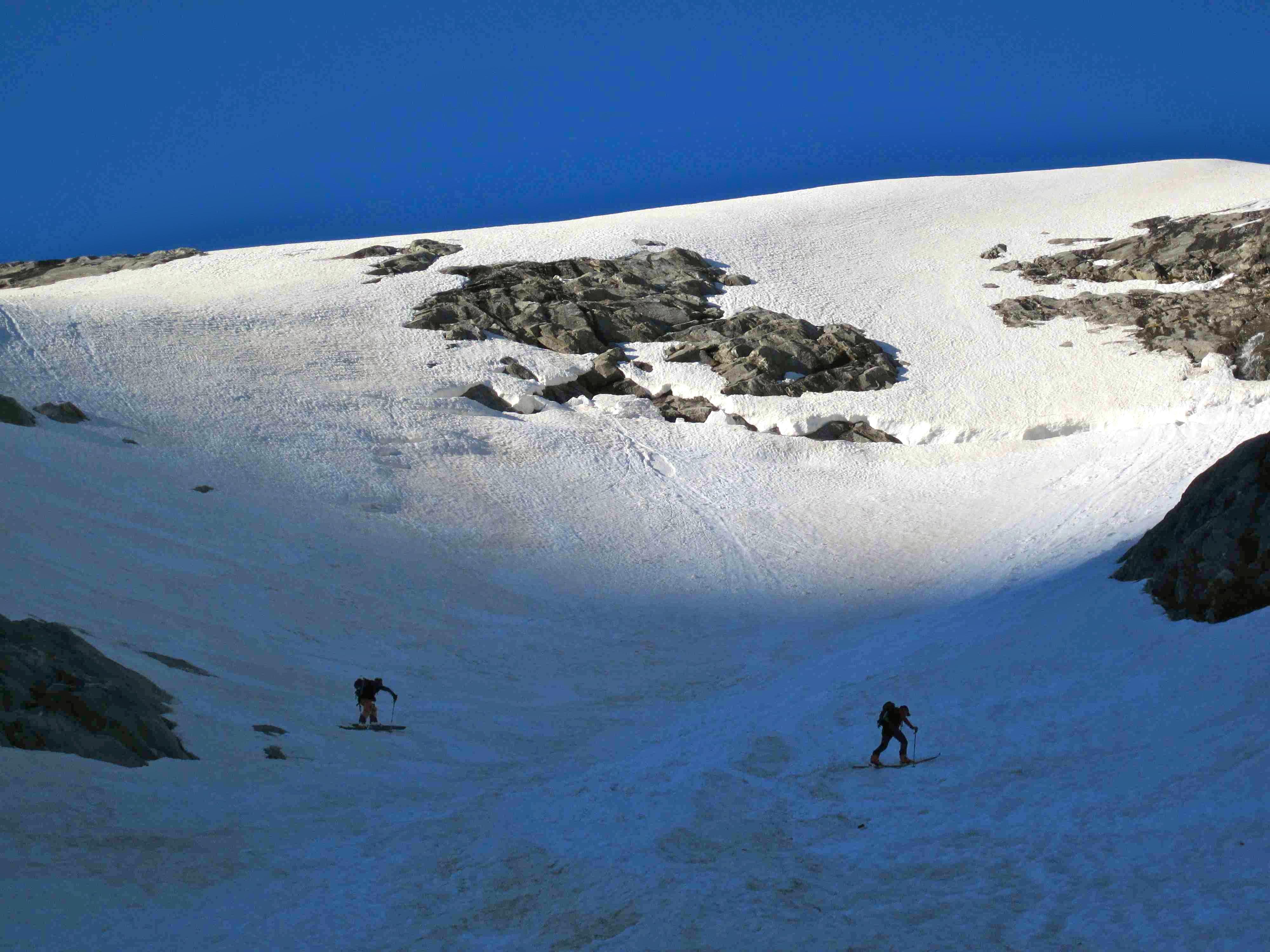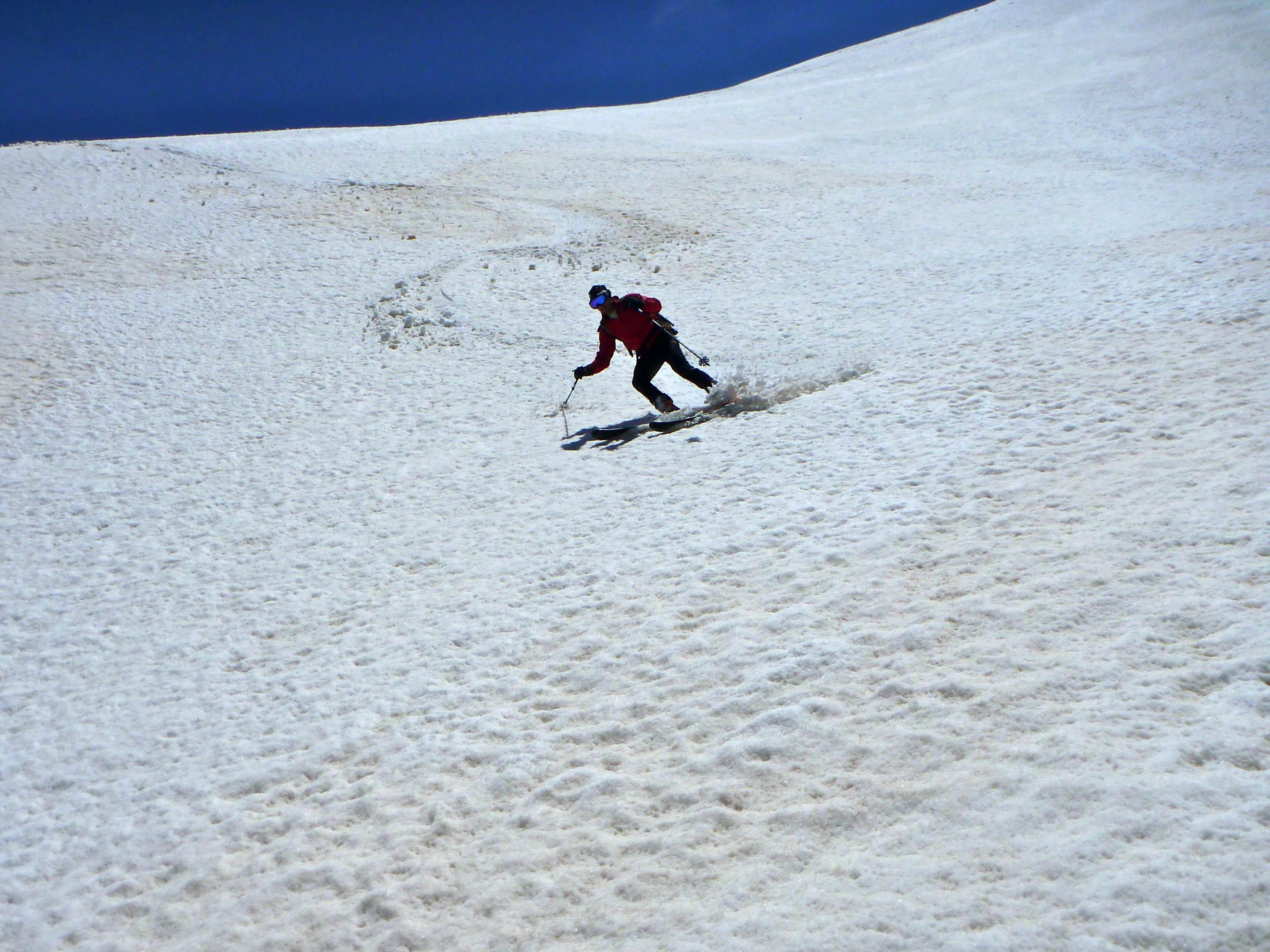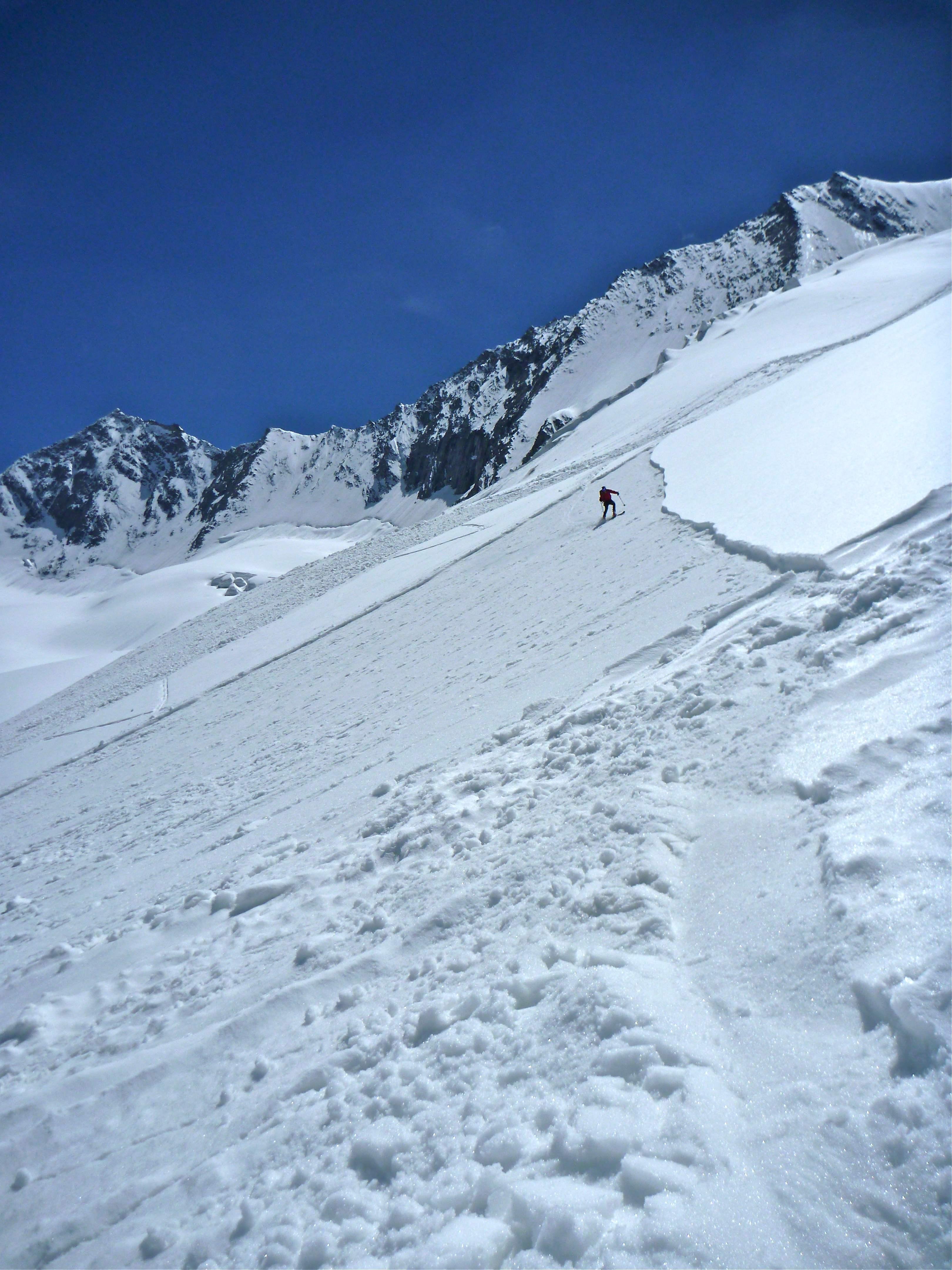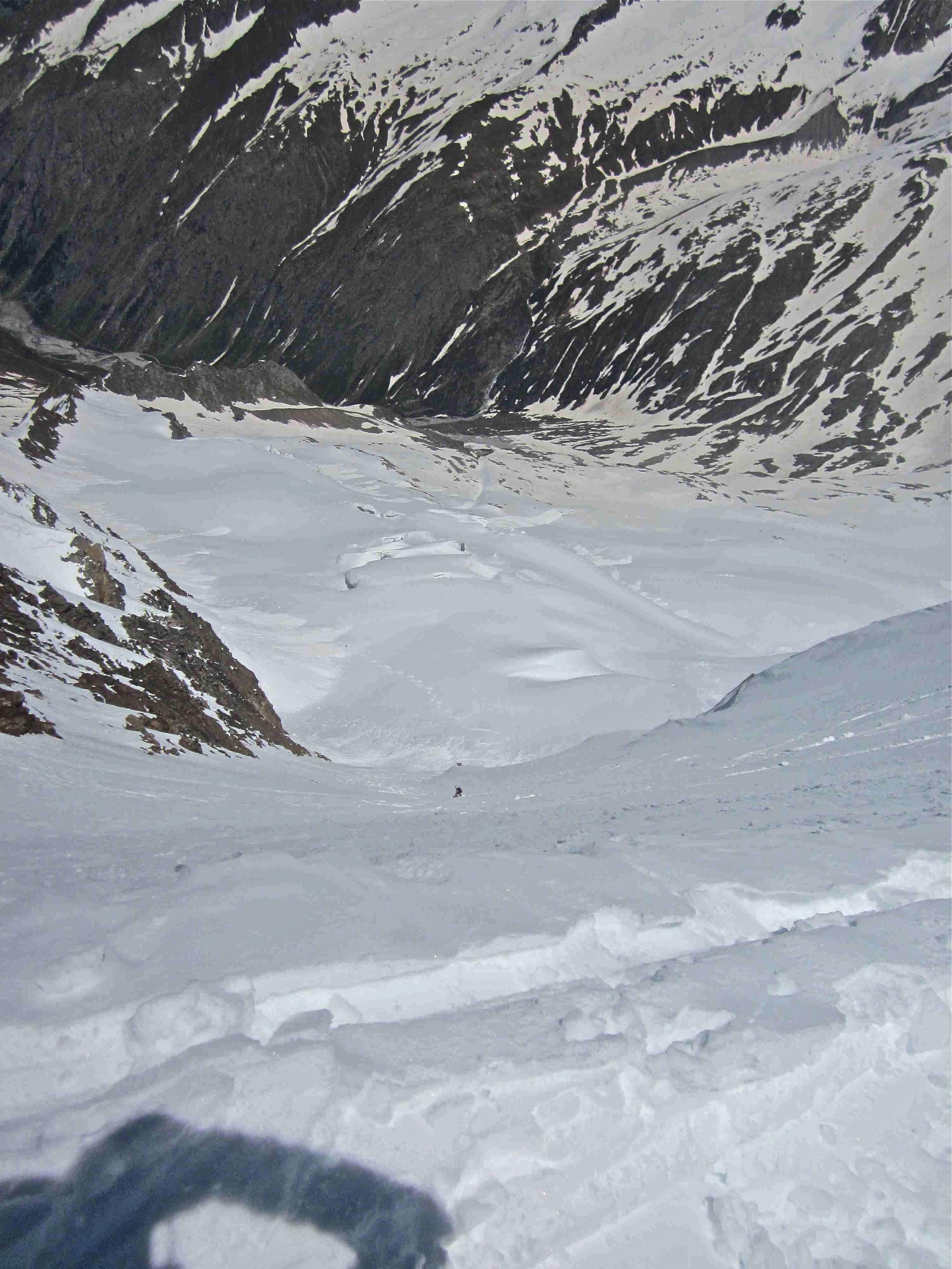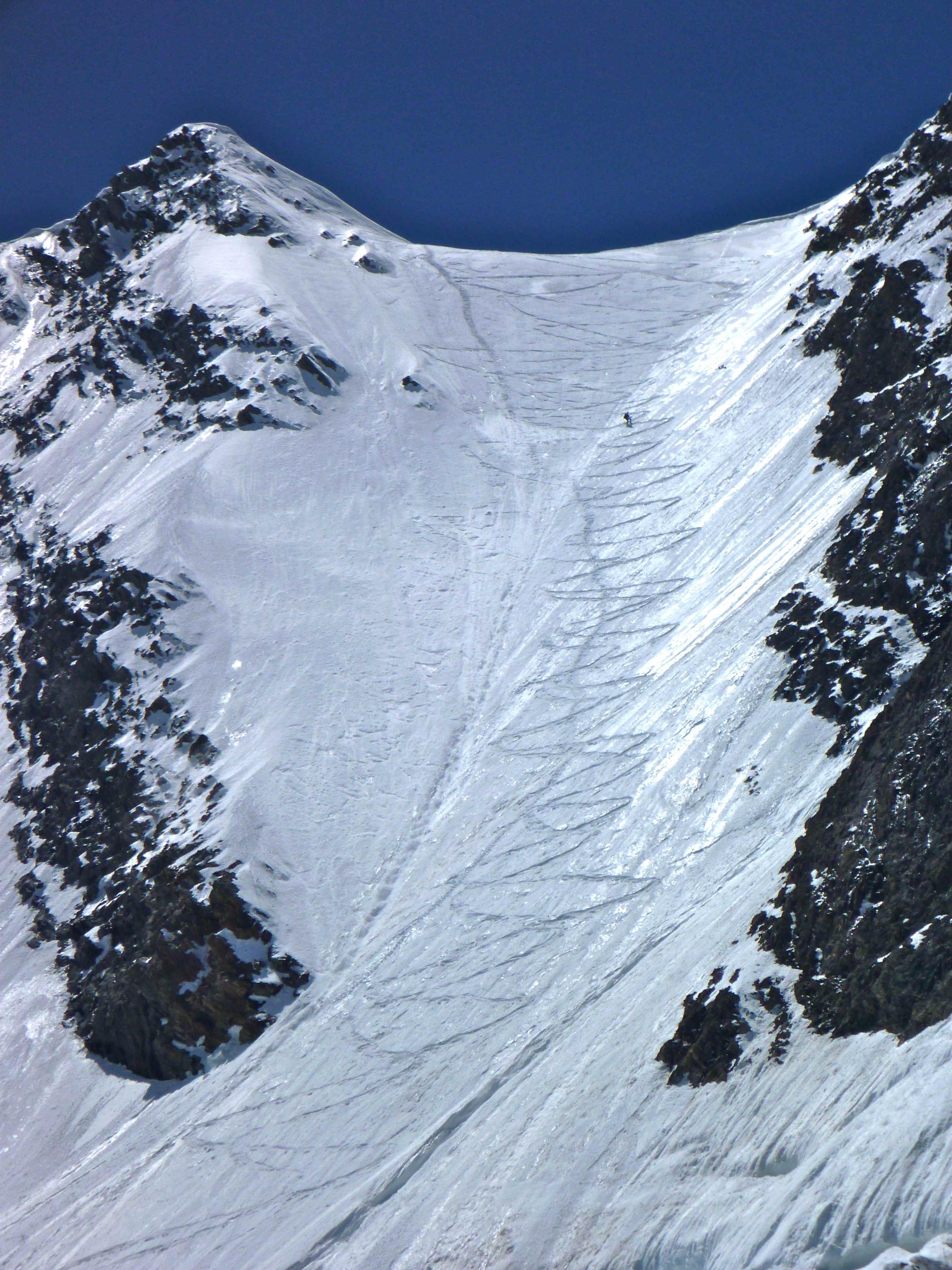 wir sind die Wand wegen der Stein- bzw. Schneeschlaggefahr einzeln abgefahren (ein Alpinist hat im Anstieg ein ordentliches Cut an der Hand abgekommen), die Bedingungen waren weich, gut, aber irgendwie doch schwierig (v.a. für Ski), daher konzentriert, zügig aber nicht flüssig.