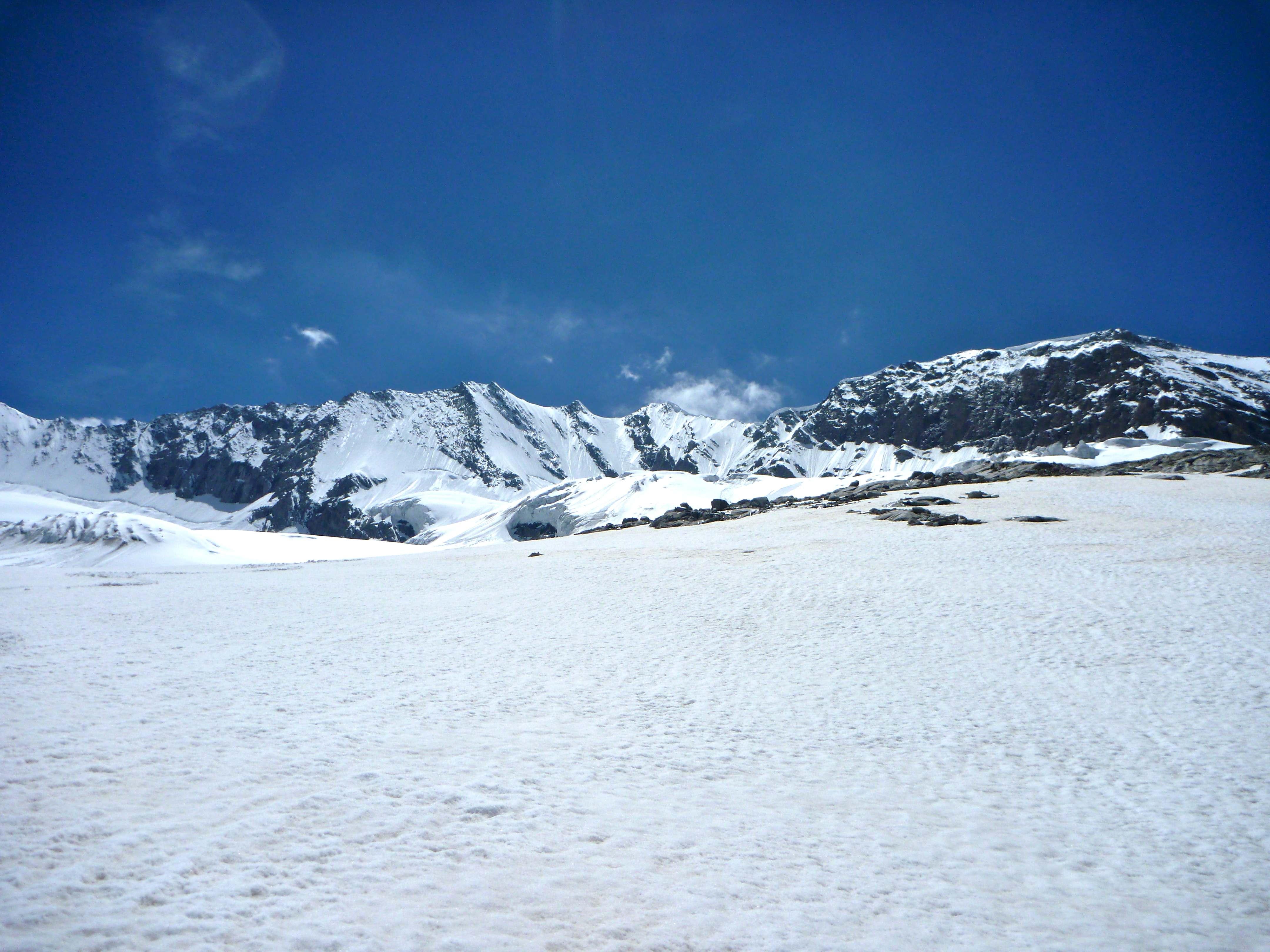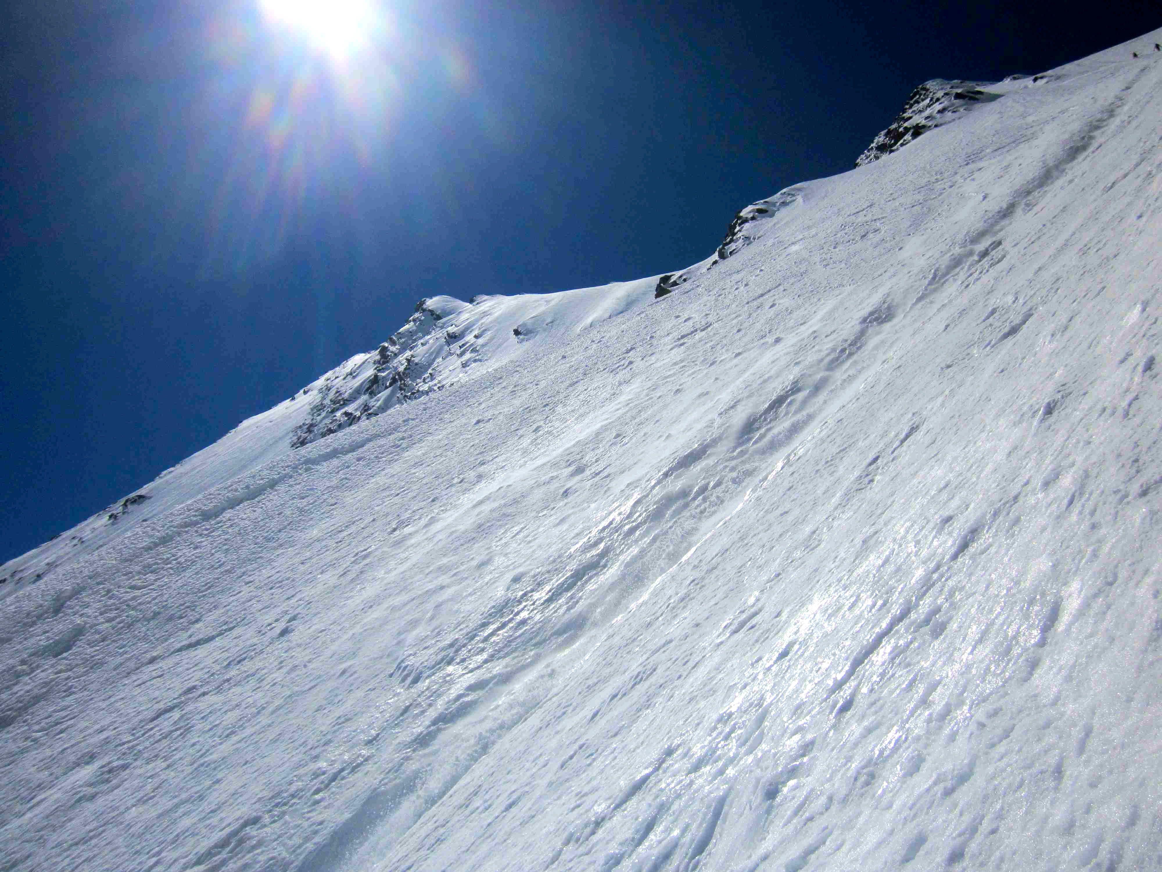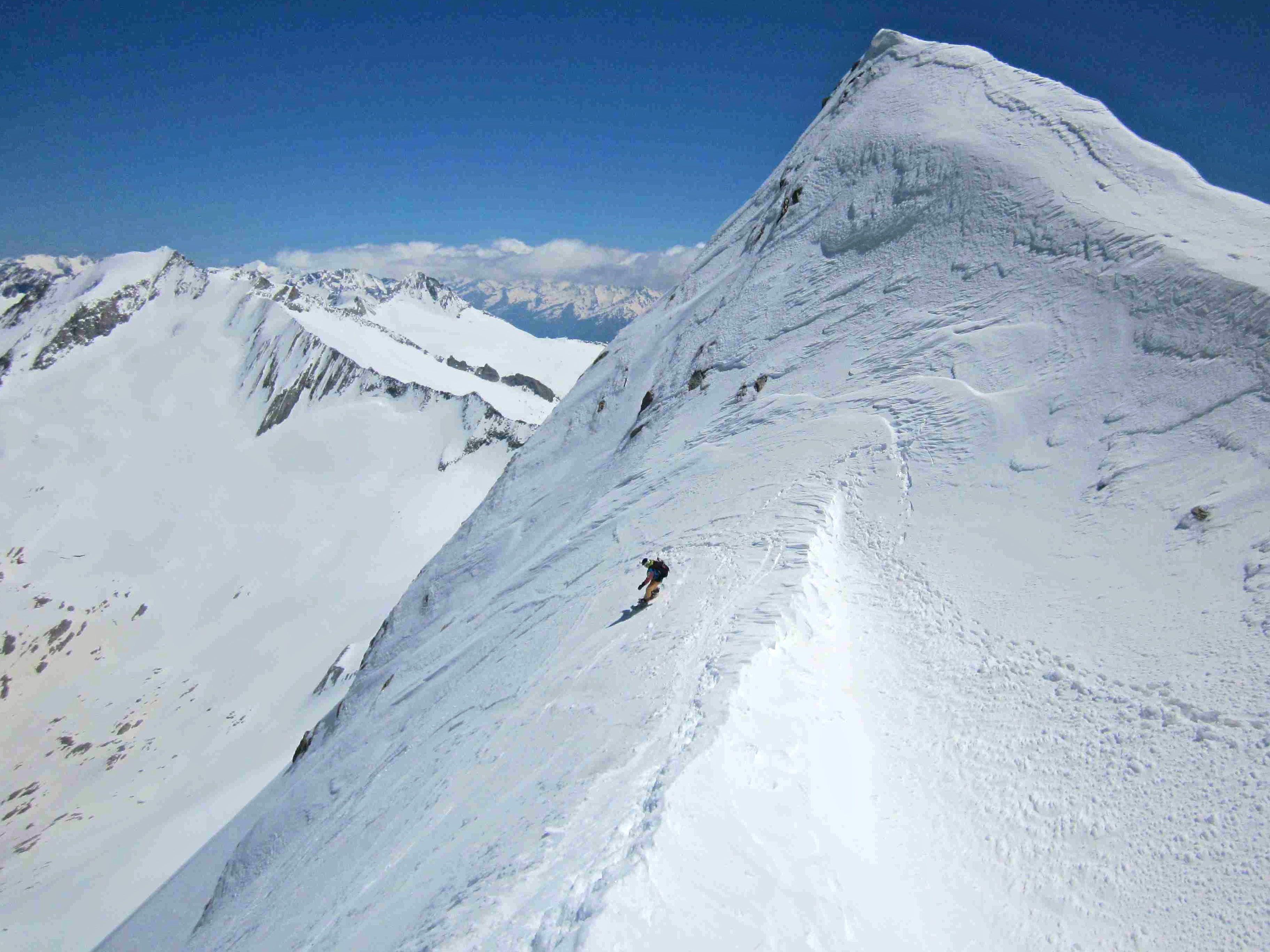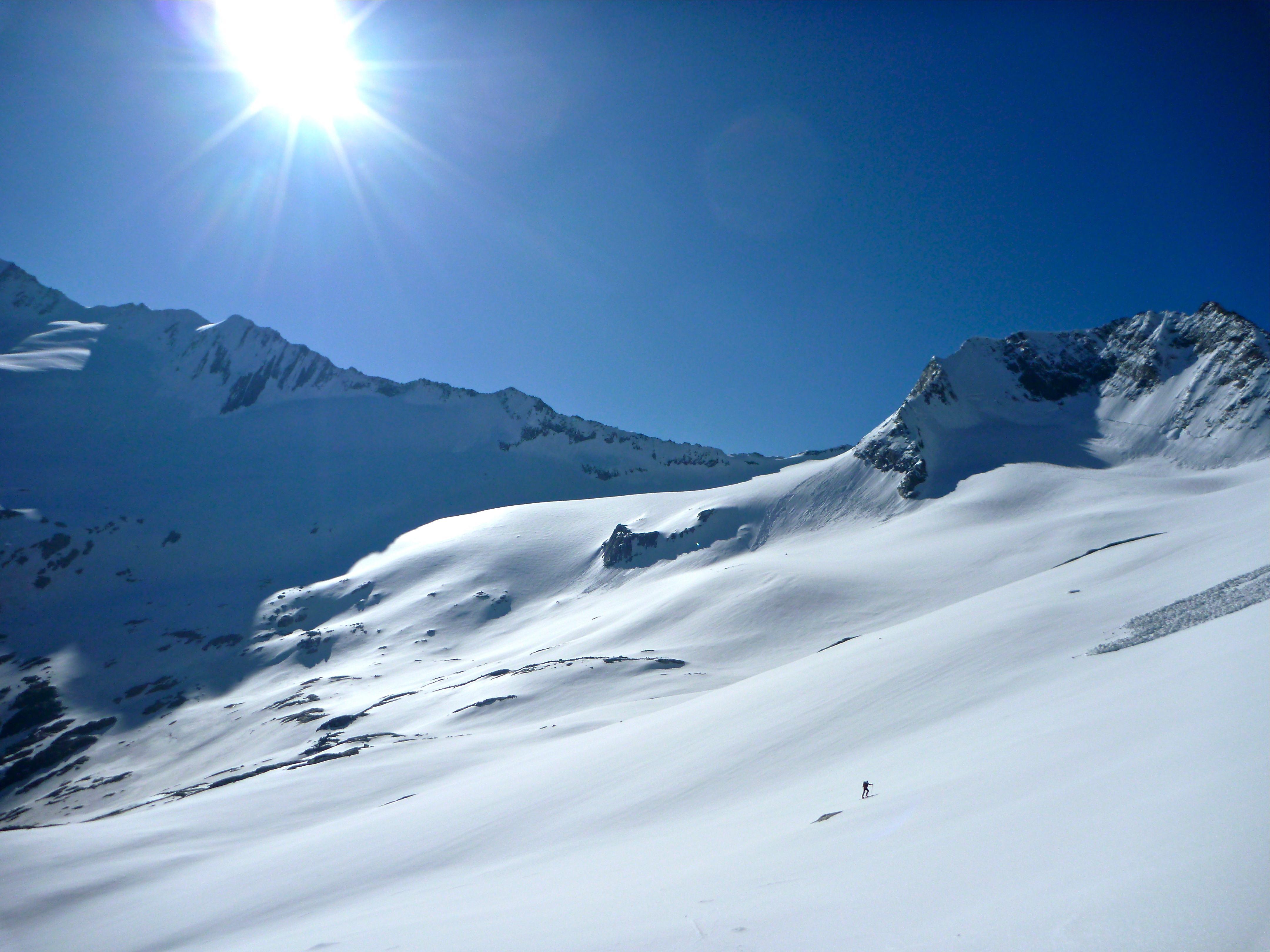 Heli und ich sind dann selbst abgefahren, wobei der eher flache Gletscherboden zu einem wahren Spießroutenlauf wurde, da sich durch die Abfahrt unglaublich mächtige und blitzschnell Nassschneerutsche lösten, denen es echt nicht leicht war auszuweichen. Zu guter letzt sind wir dann auch noch im untersten Teil falsch abgefahren und mussten 200hm wieder aufsteigen.