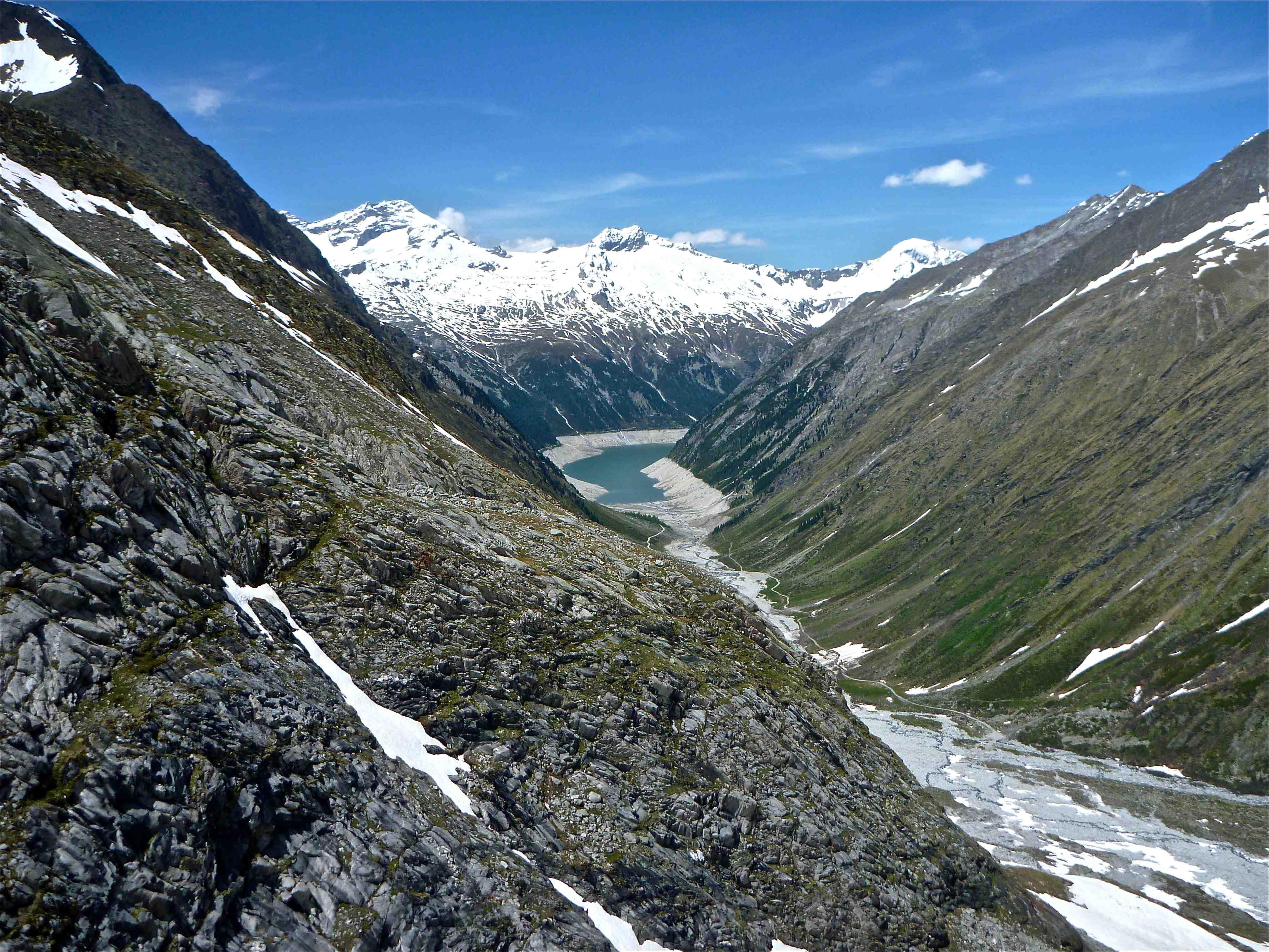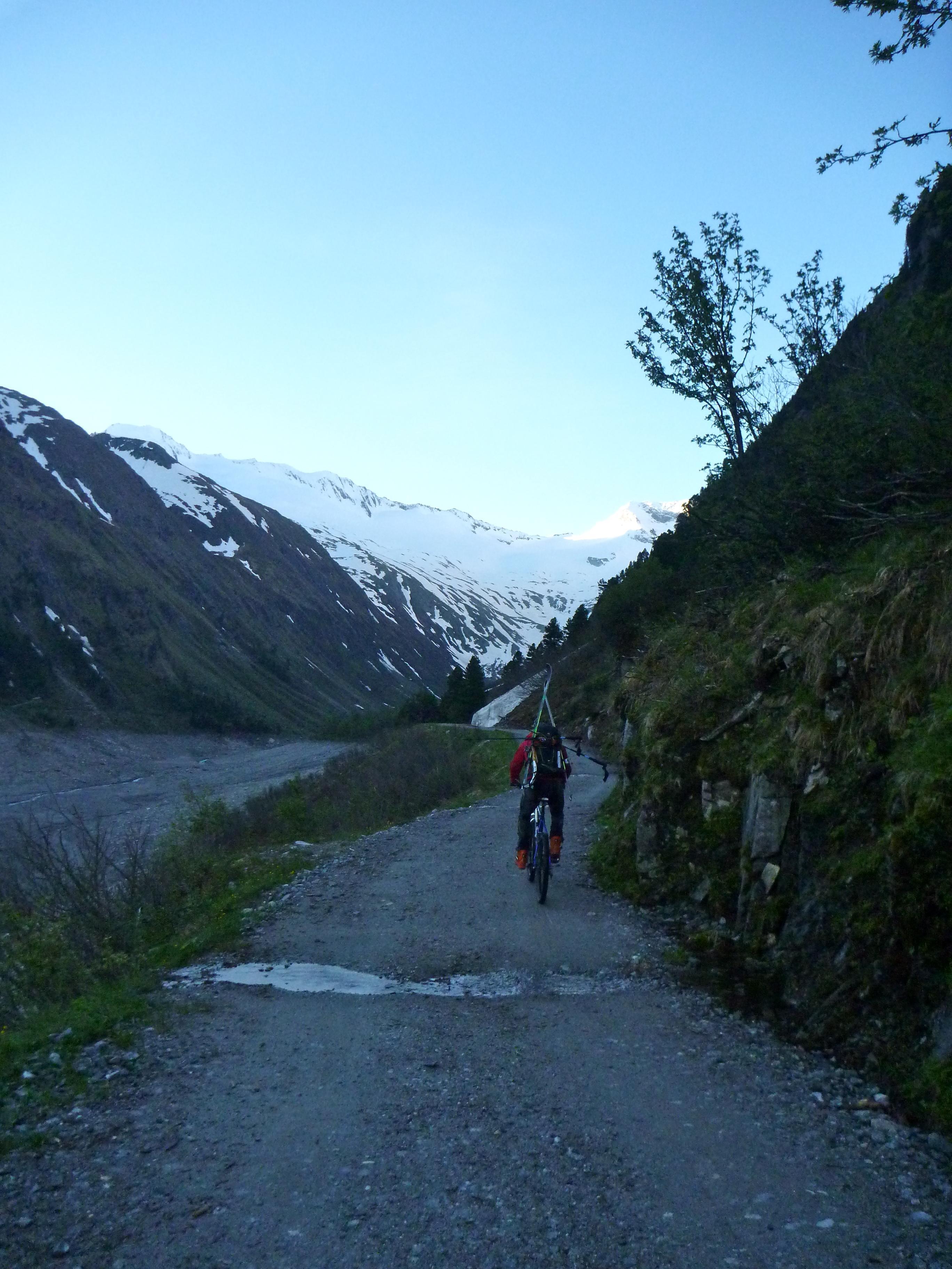 vom Schlegeisspeicher mit MTB bzw. zu Fuß in den Talschluss, dann nach wenigen felsigen Metern über beinharten Altschnee mit Harscheisen rechts hinauf auf den Gletscherboden, weiter rechts haltend bei schon sehr weichen Bedingungen zum Wandfuß gespurt, Aufstieg durch die bereits gespurte Wand (50°, 300hm) bei weichen trittfesten Bedingungen (wär ohne Pickel und Steigeisen gegangen) und nach rechts am Grat zum Gipfel.