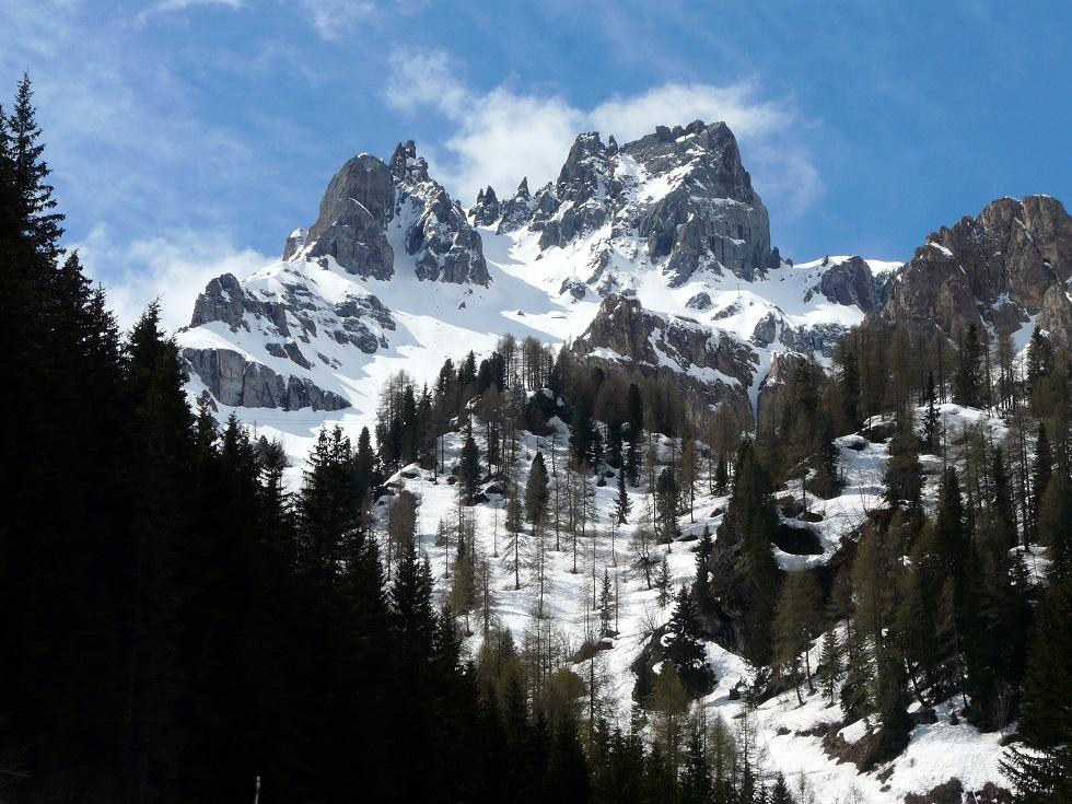 Start bei der Talstation der Porta Vescovo Seilbahn und Aufstieg über breite Pisten. Bei der Zwischenstation auf etwa 2.200m gehe ich allein noch im Schnelltempo zur Station Cason Richtung Passo Padon, fasziniert von den Felszacken der Crepes de Padon.