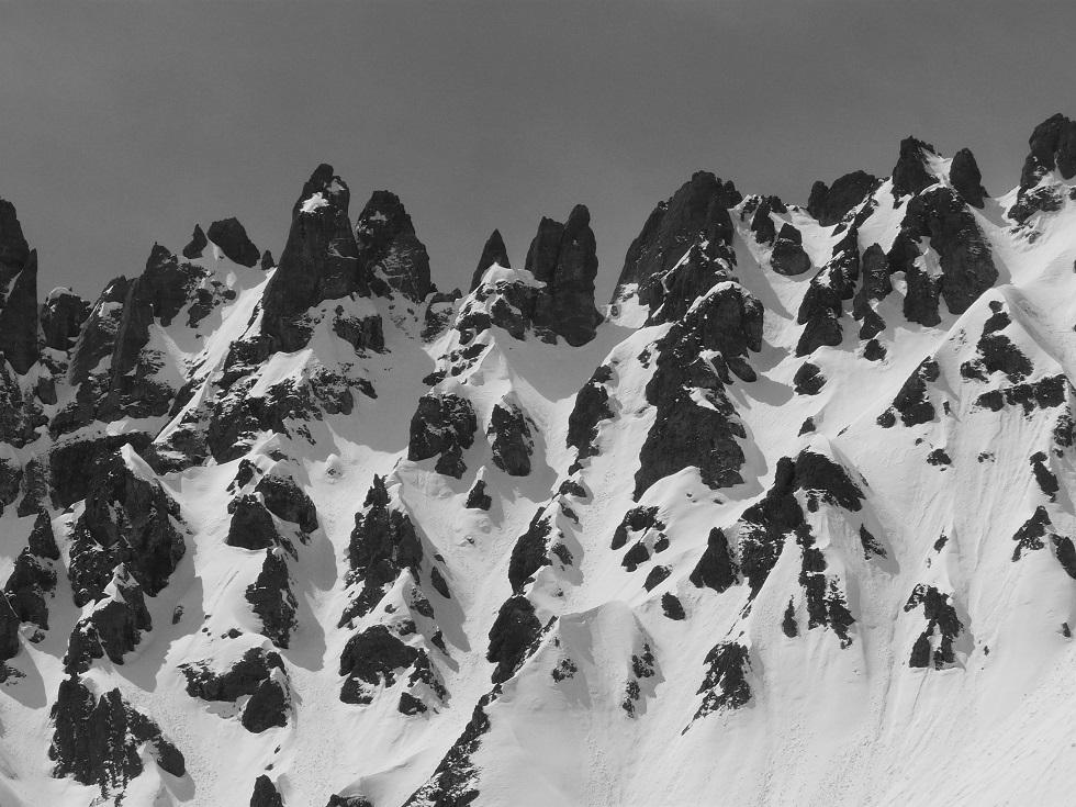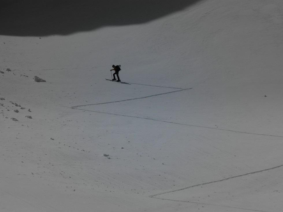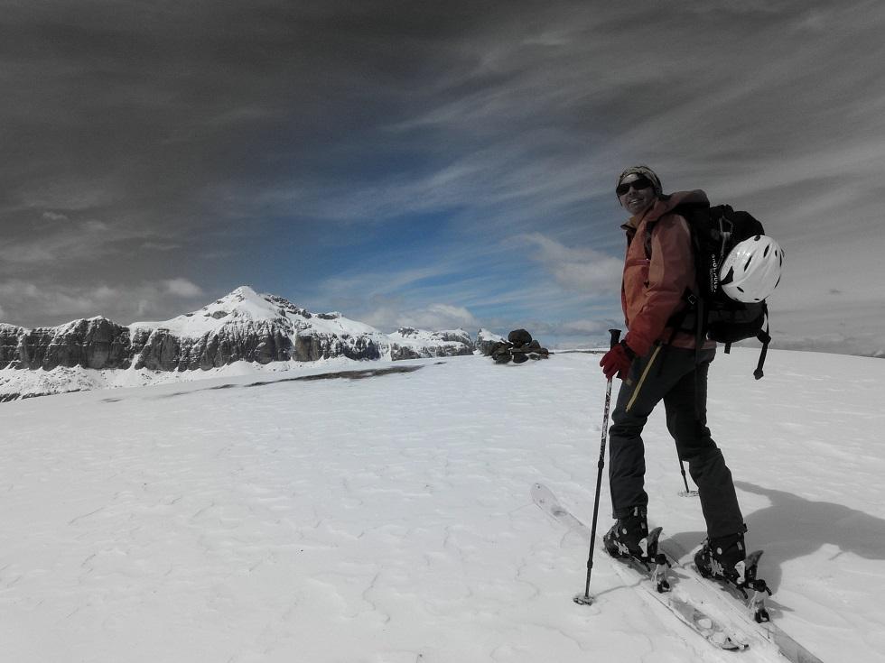 Wieder zurück muß ich mich beeilen um Ursula noch vor der Forcella Europa einzuholen. Die Scharte wird nach oben hin immer steiler und die Schneeverhältnisse sind tückisch, oben empfängt uns ein grauslicher Sturm. Nach kurzer (windgeschützter) Rast wieder runter und auf der anderen Seite rauf zur Station Porta Vescovo. Gleich weiter, interessanterweise weitgehend windgeschützt steil auf den Belvedere, ein ausgesprochener Aussichtsbalkon.