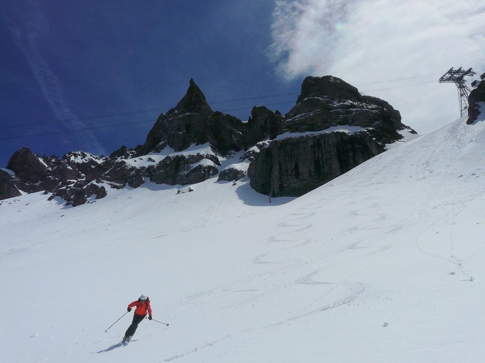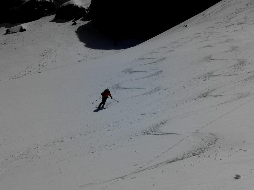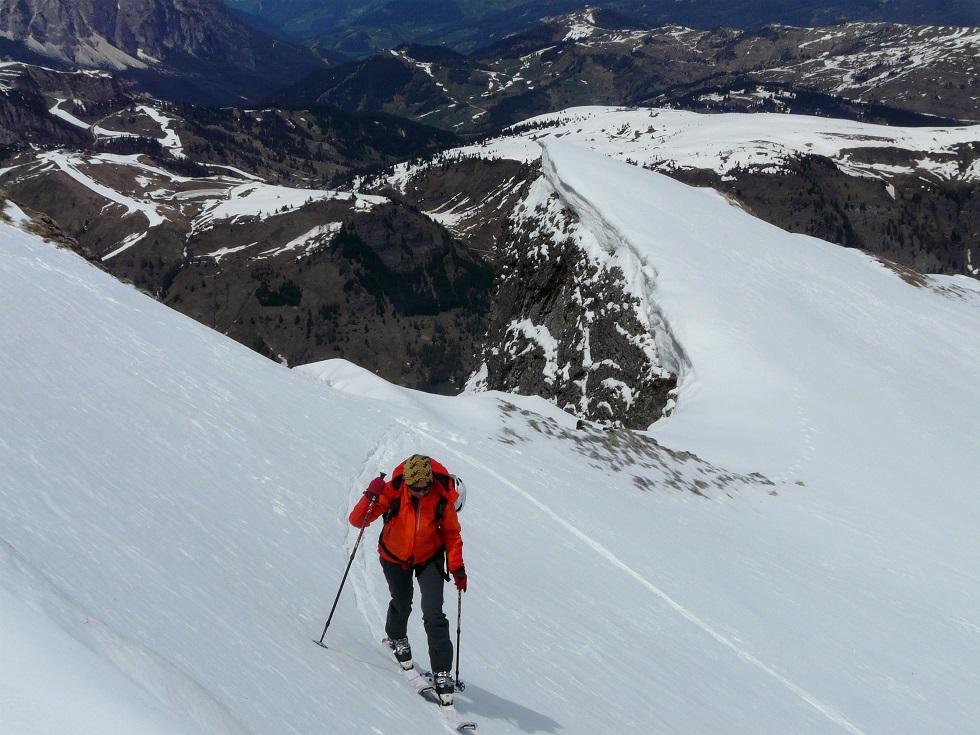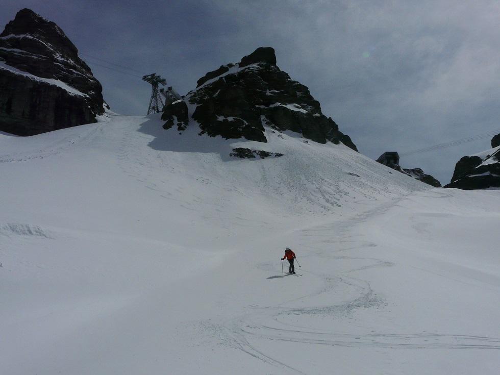 Abfahrt oben griffig, dann Richtung Fedaia super Schnee. Leider müssen wir wieder in die windige Scharte zurück, später sehr schöne Abfahrt nach Arabba.