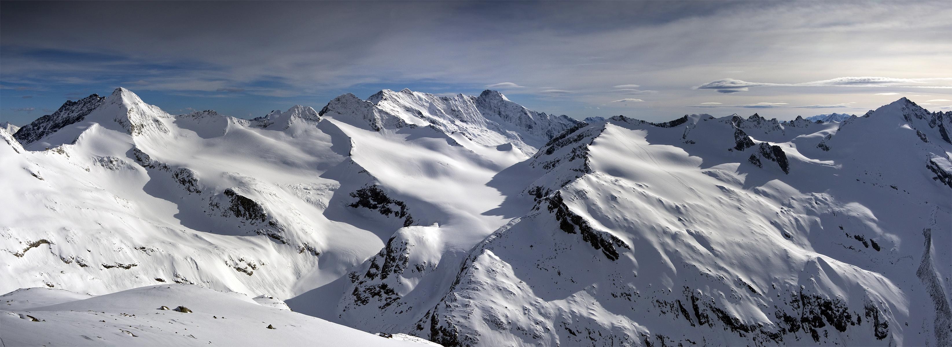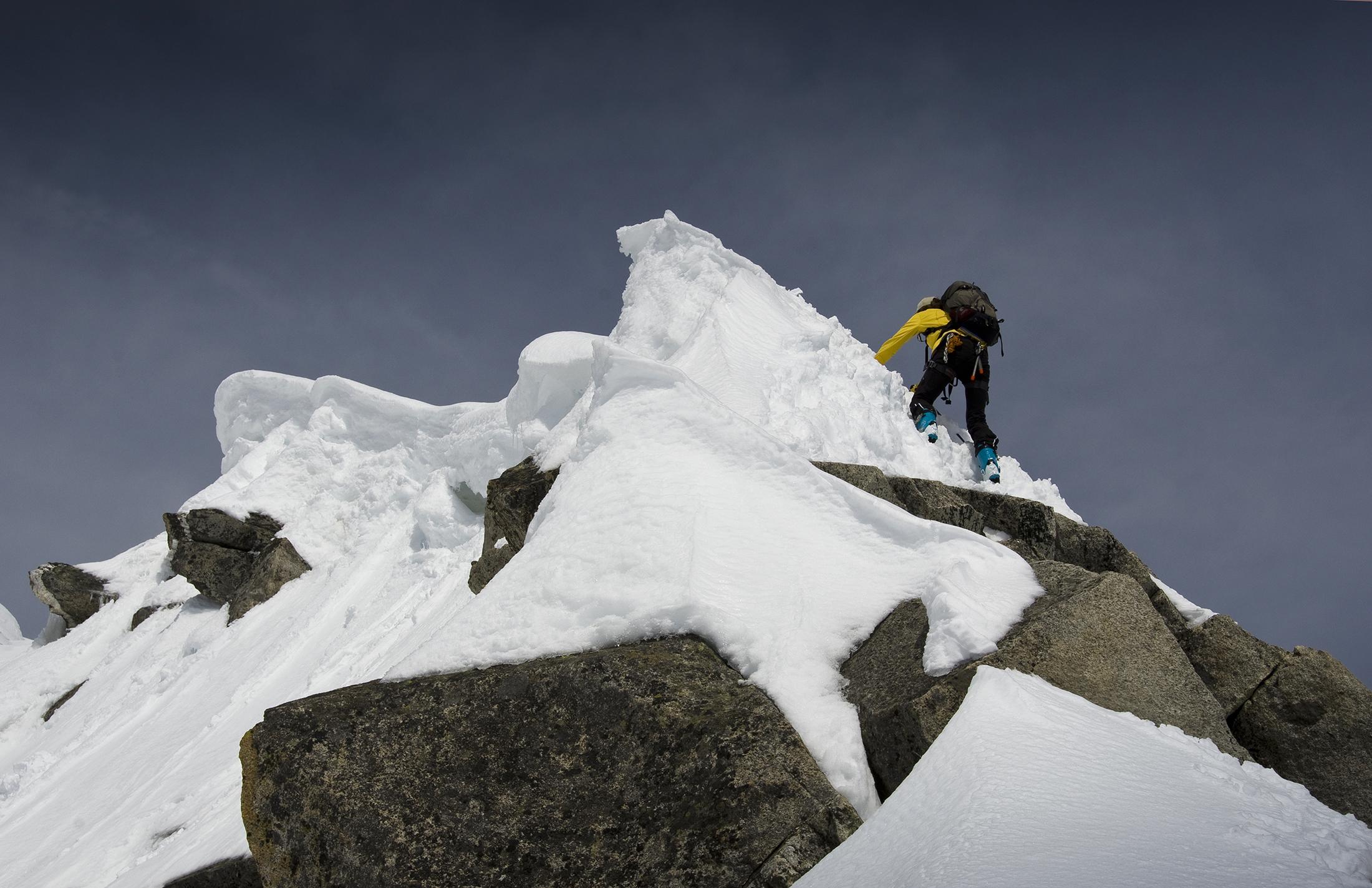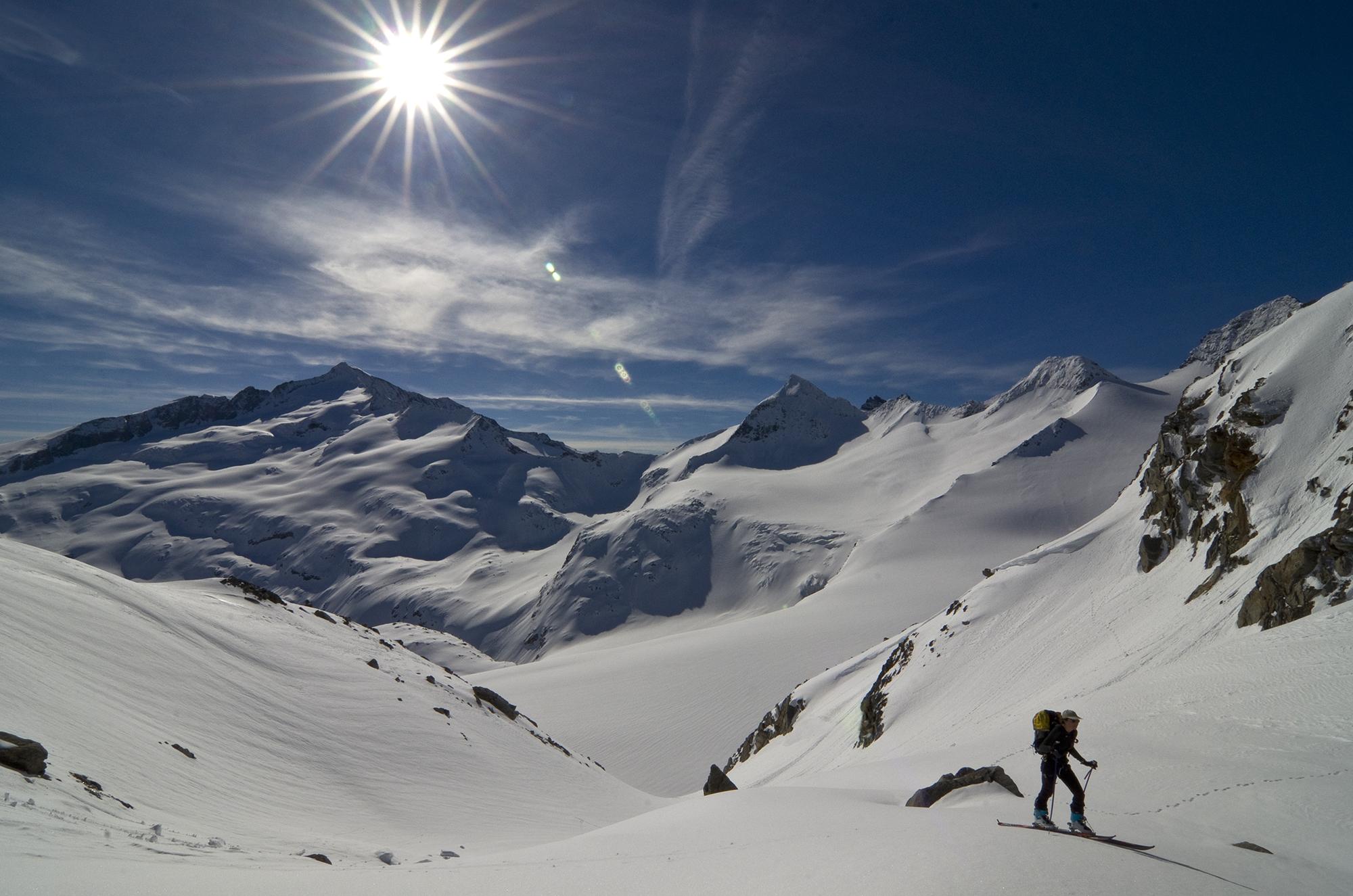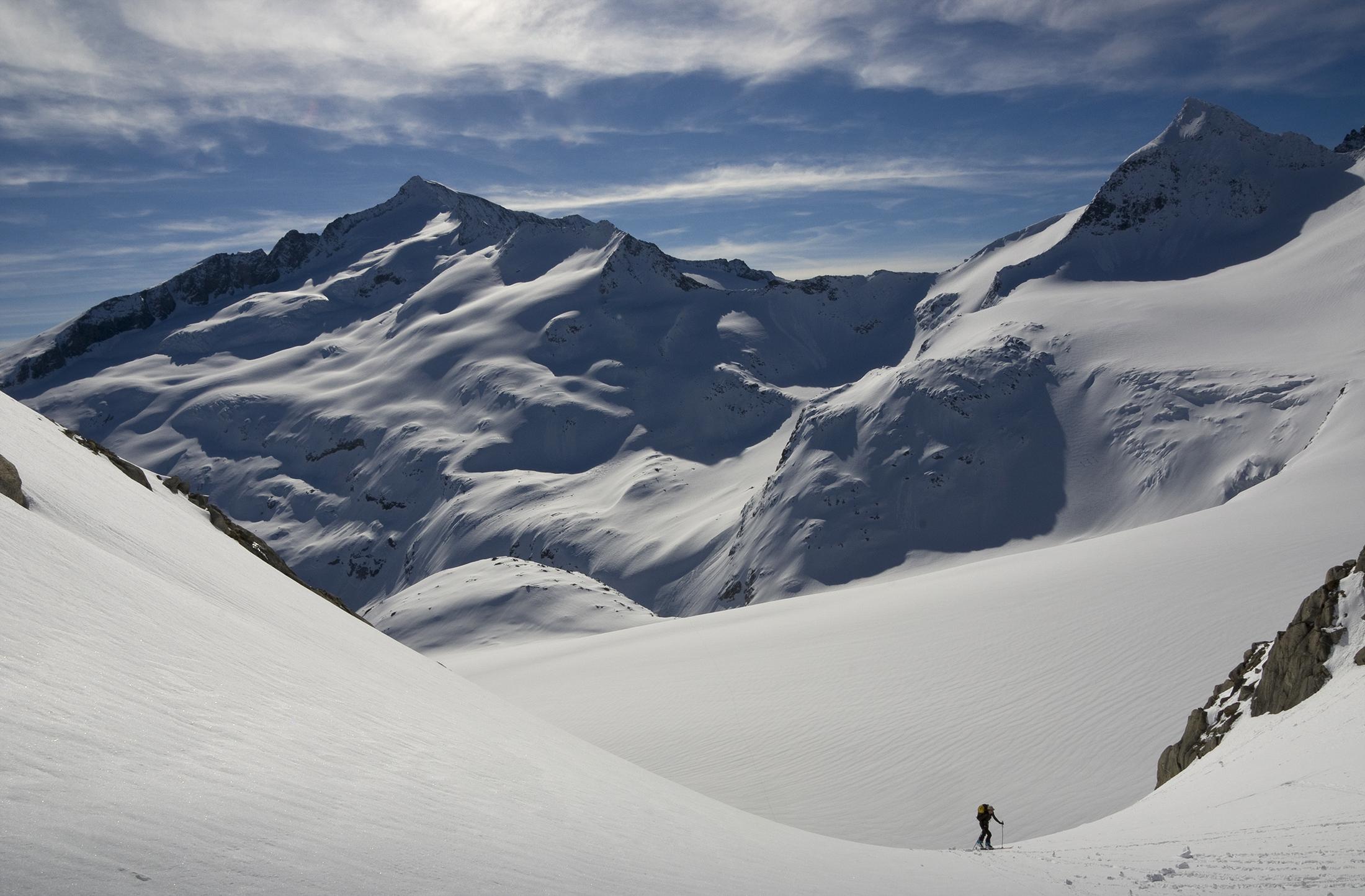 In der Frühe ist der Schnee fest genug, um nicht mehr einzubrechen, es sind beste Verhältnisse für den Übergang von der Kürsinger Hütte zur Schlieferspitze. Wir ziehen eine einsame, kaum sichtbare Spur. Am Sonntagskees treffen wir sogar Pulverschnee. Es ist ein sehr abwechslungsreicher und landschaftlich wunderschöner Anstieg. Am Gipfelgrat ist der Schnee dann weich und die Wechten fordern Aufmerksamkeit. Zu unserer Überraschung treffen wir am Gipfelkreuz auf zwei coole Locals, die mit Ski am Rücken aus der Nordwand aussteigen. Offensichtlich eine Erstbegehung! Respekt!