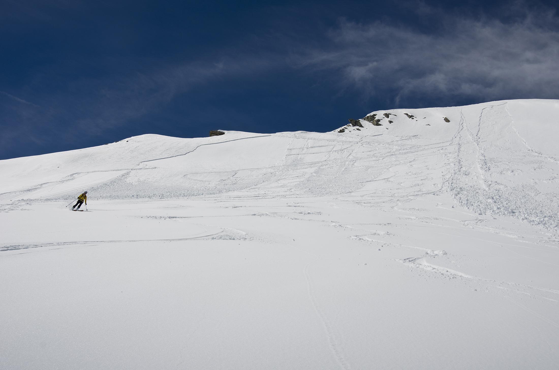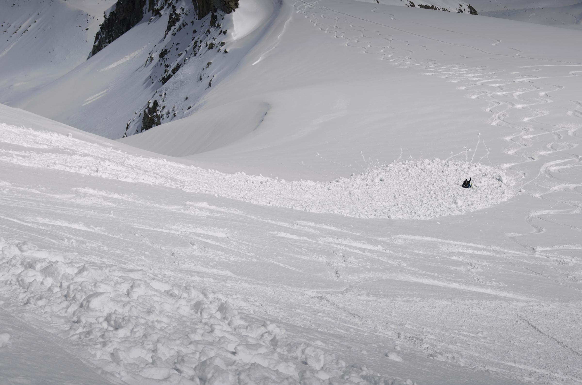 Im Gipfelhang hat es kleinere Naßschneerutsche, die jüngste Schicht Schnee von letzter Woche rutscht auf der alten Schneedecke ab. So passiert es auch, dass einer der Beiden eine kleine Lawine auslöst und damit hinabschwimmt, aber glücklicherweise nicht verschüttet wird. Einen Schrecken bekommt man schon!