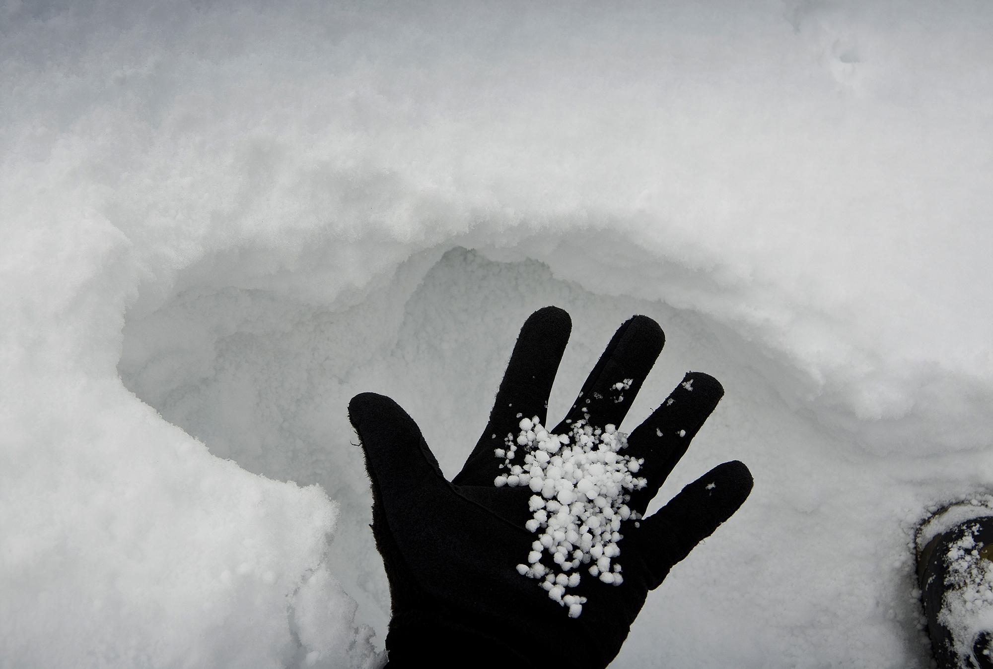 Sehr furchteinflössend, was ich im oberen Teil des Nordhangs beim Wiederanstieg entdecken musste: Unter einer 10 bis 15cm mächtigen gebundenen Schneeschicht findet sich eine Graupelschicht als Kugellager.
