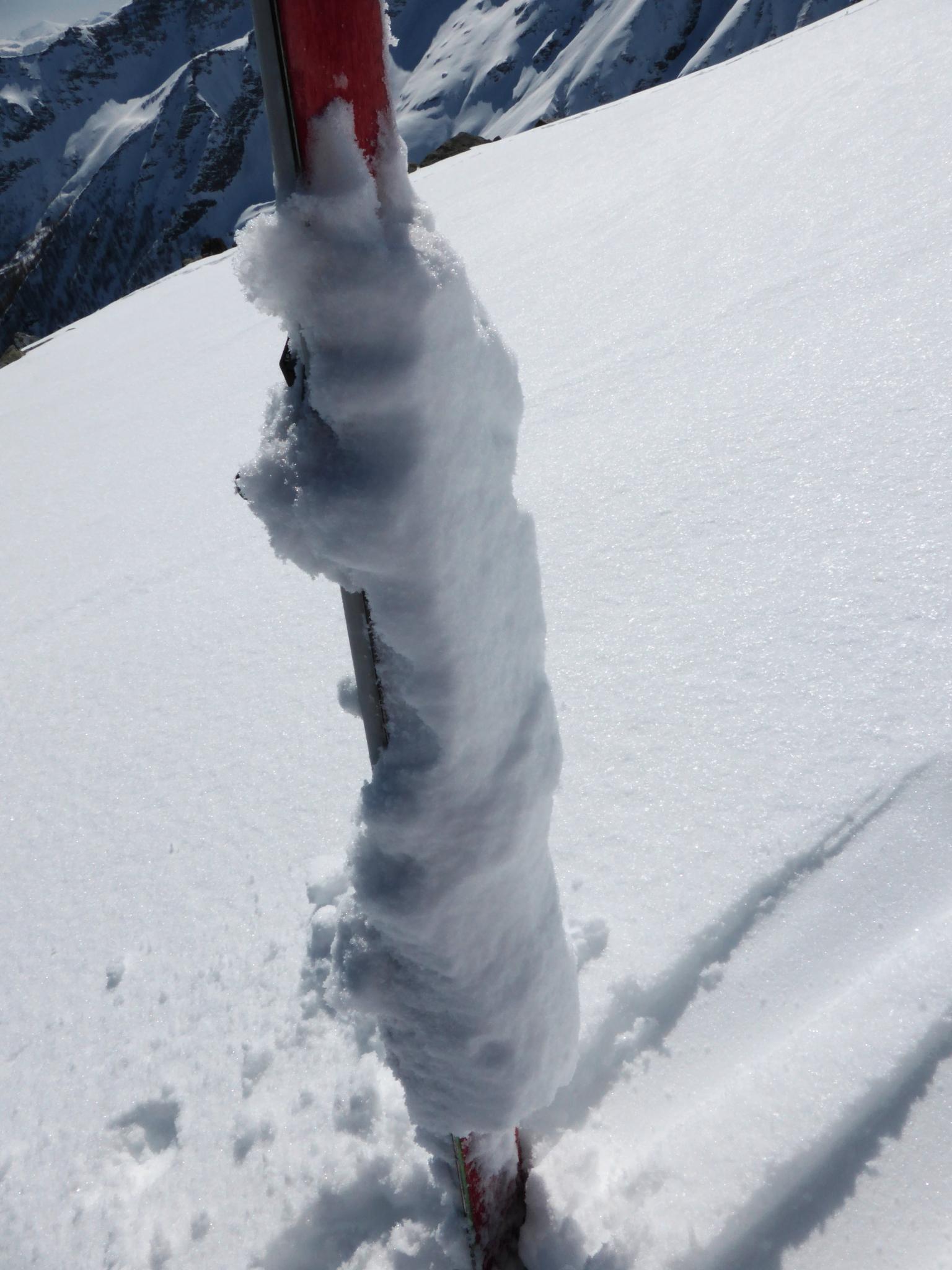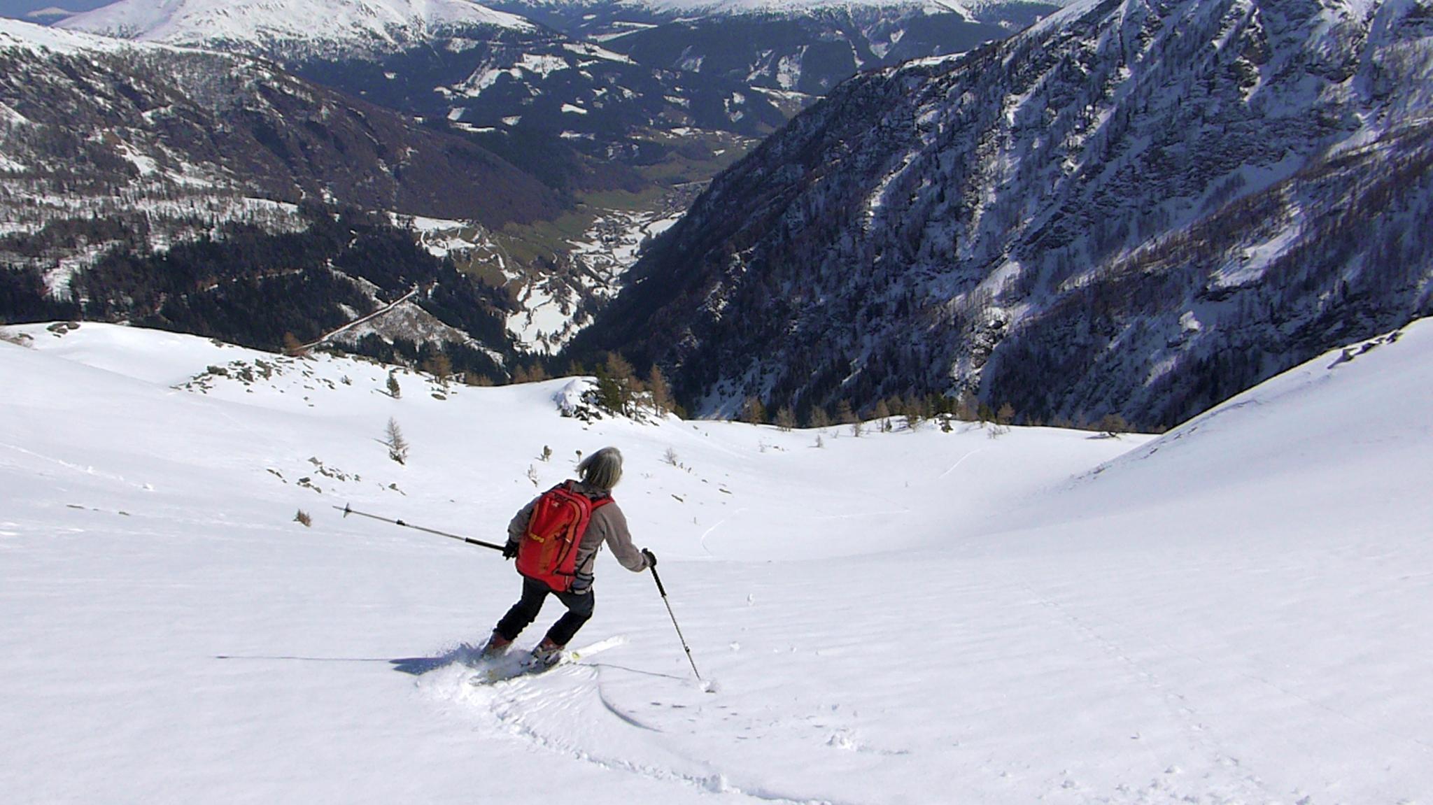 Allgemeine Verhältnisse, Schnee: Neuschnee im Umwandlungsstadium - von allem etwas. Die Abfahrt ist überraschend gut, auf den obersten 250 HM noch pulvrig mit einzelnen windgepressten Stellen, der Rest feucht und schwer, jedoch durchaus passabel zum Fahren. Am Forstweg zäher Nassschnee.