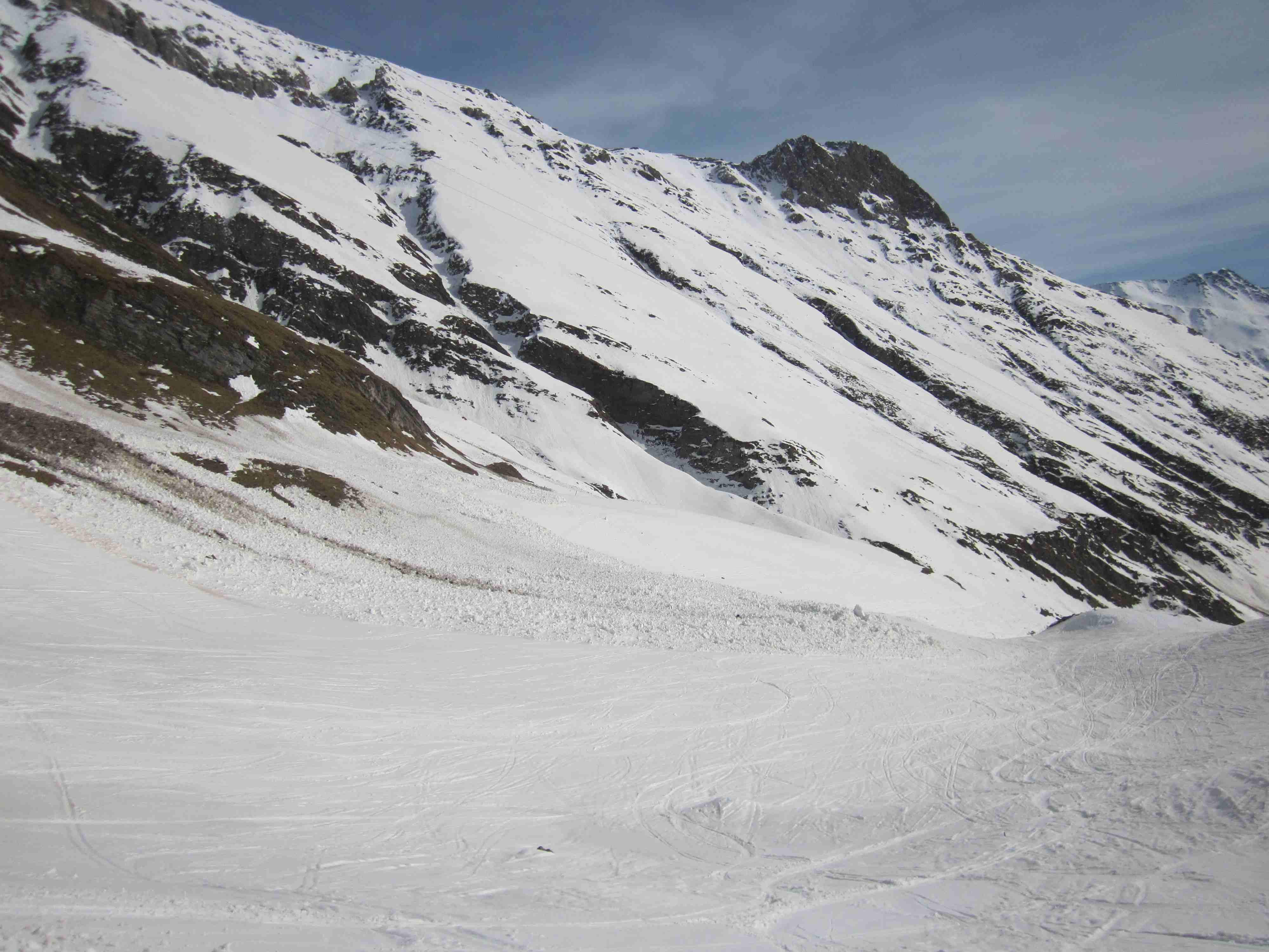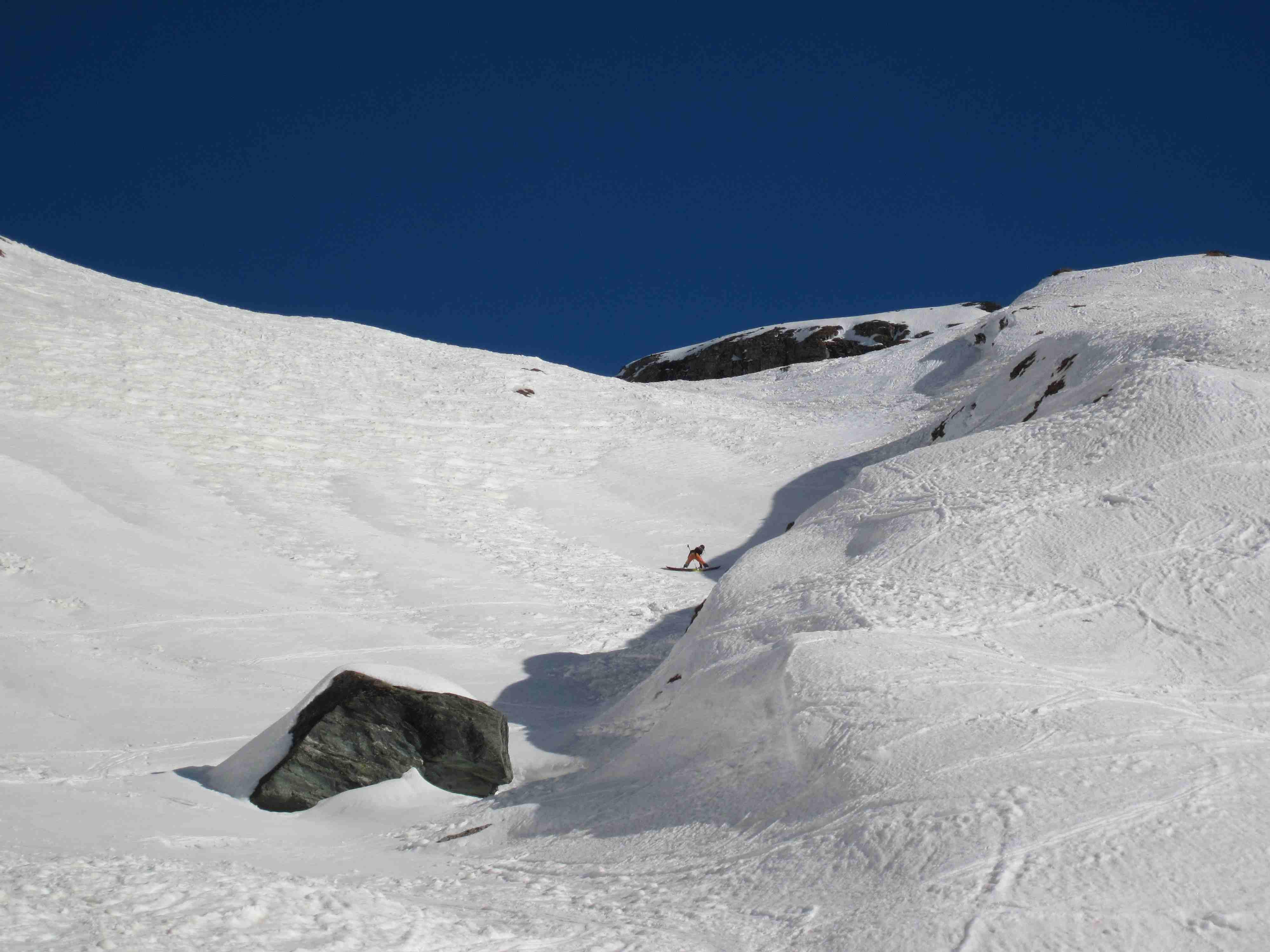 Aus den 30 - 35° sinds 40 - 45° geworden, bei der Abfahrt um 12:30 Uhr wars im oberen Teil kaum aufgefirnt. Stürzen verboten.