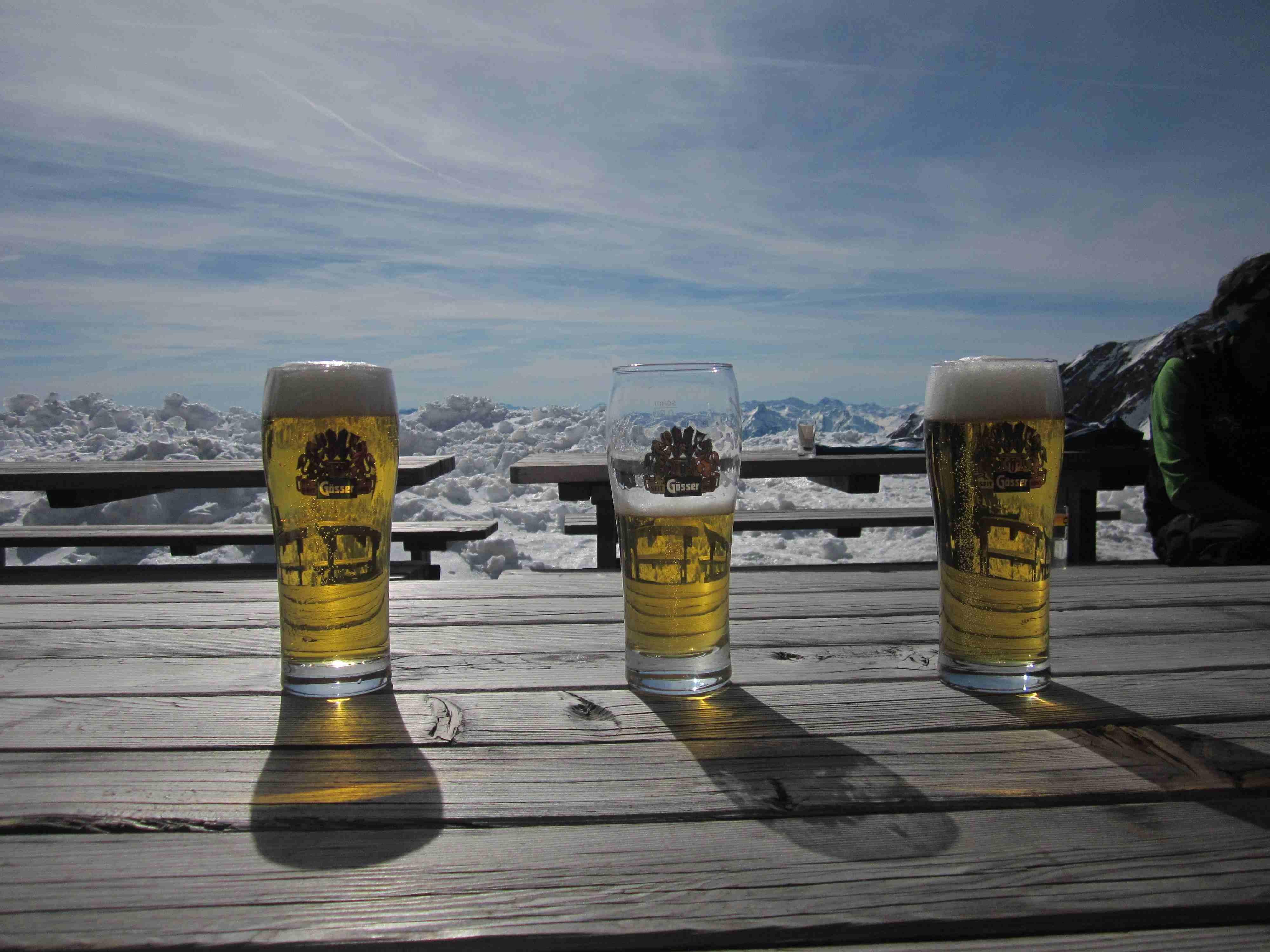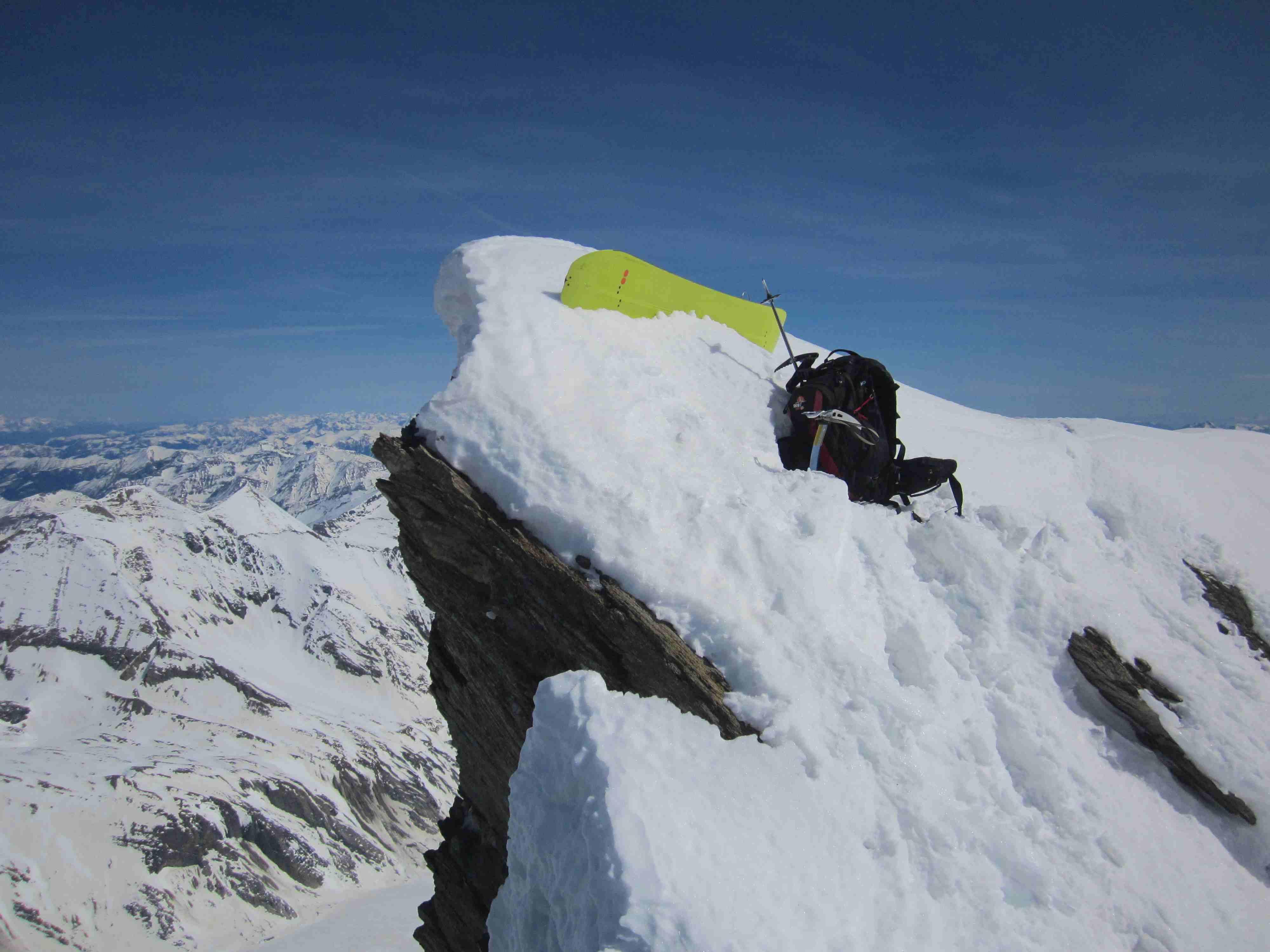 Anschnallen um 7:30 Uhr am Lucknerhaus, dann über hartgefrorene Altschneepiste. Sonne erst an den Hängen zur Stüdelhütte (ist offen). Das Teischnitzkee schaut stabil zu aus, wir sind ohne Seil drüber (zu zweit machts eh keinen Sinn), aber vor allem beim raufgehen bleibt doch ein komisches Gefühl.