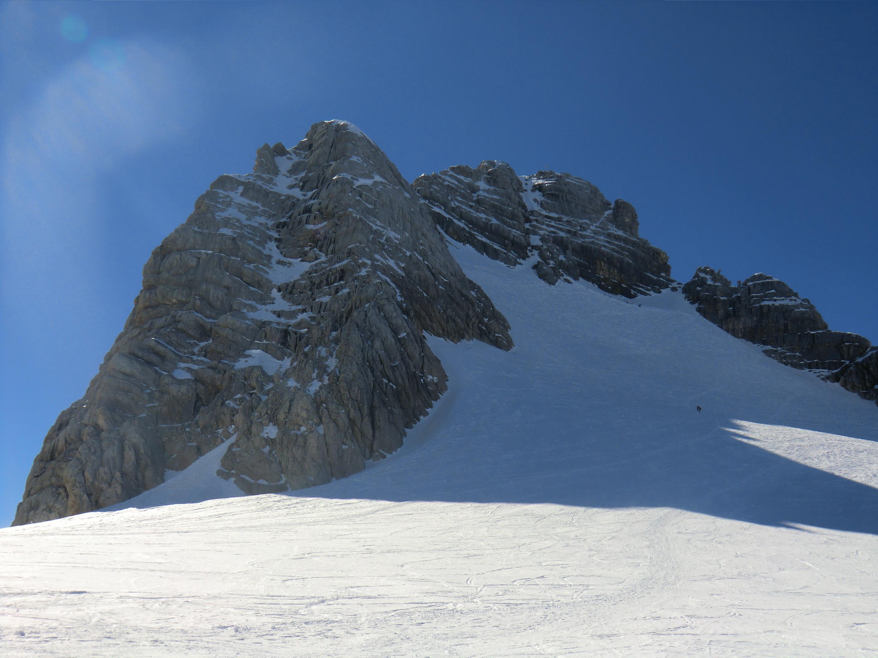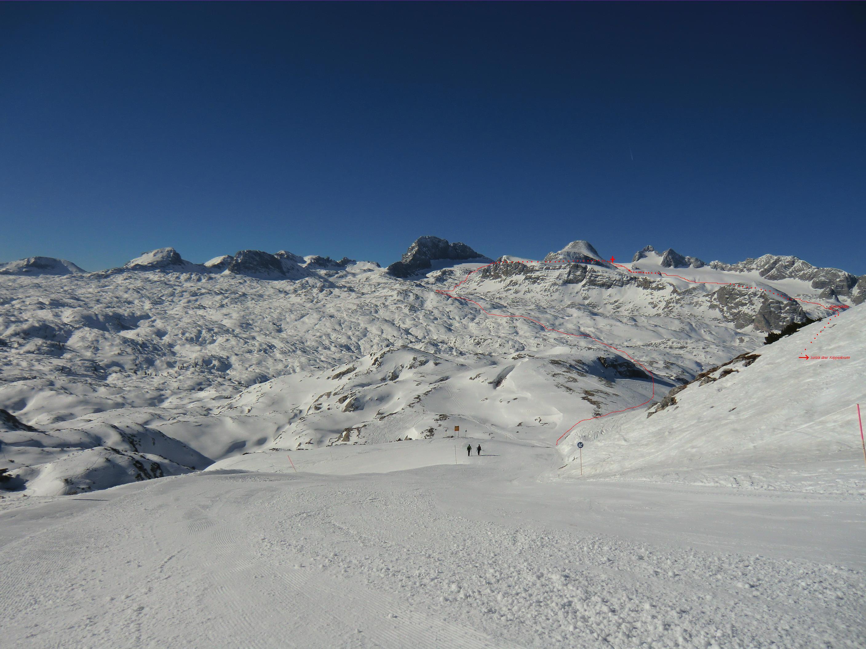 Meine Bergseele durfte heute mal wieder einen Spaziergang in grandioser Landschaft machen. Die Umrundung des Gjaidsteinsattels – auch Rumplerrunde genannt – bot heute perfekte Bedingungen und prächtiges Wetter. Über lange Strecken war ich "ziemlich einzeln" unterwegs. Die Bedingungen am Gletscher waren hart-ruppig, stellenweise pulvrig, der Slalom durch den Latschengürtel von der Simonyhütte bis Gjaidalm eine schnelle Spur und die 11 km Abfahrt über Krippenbrunn hinunter in bestem Zustand - nur ganz unten im Flachteil eine kleine Tragestrecke.