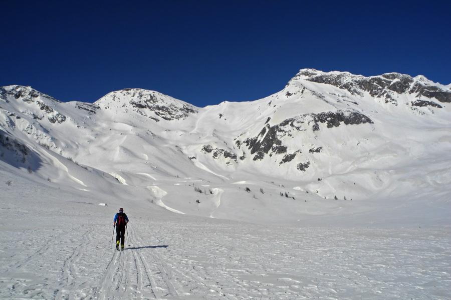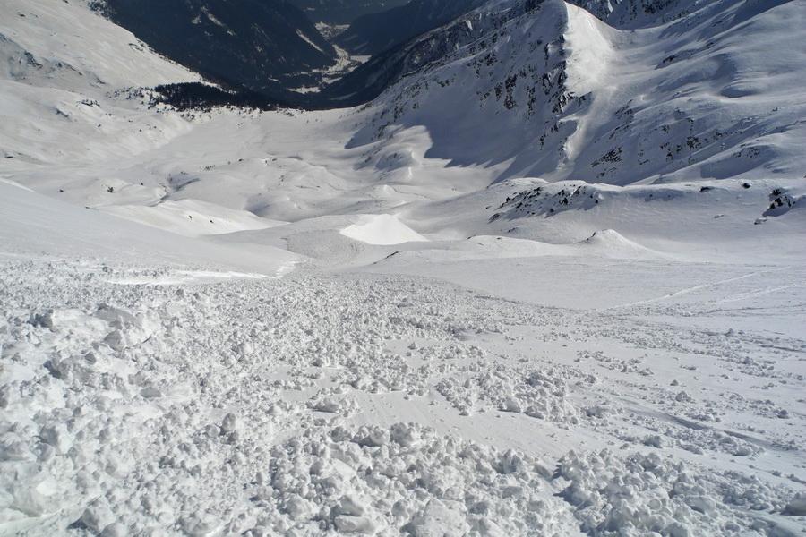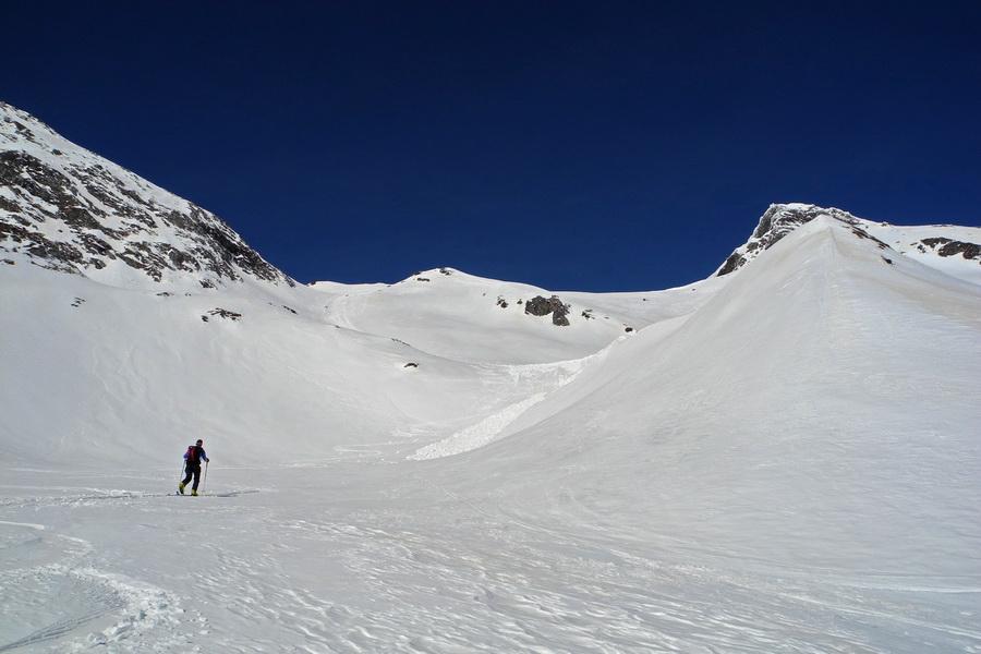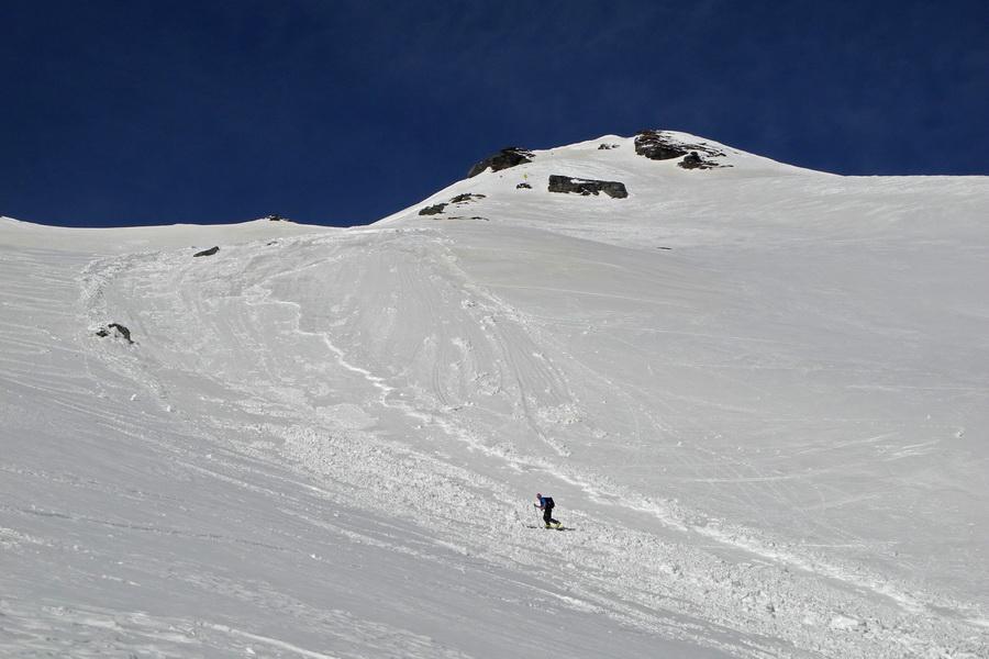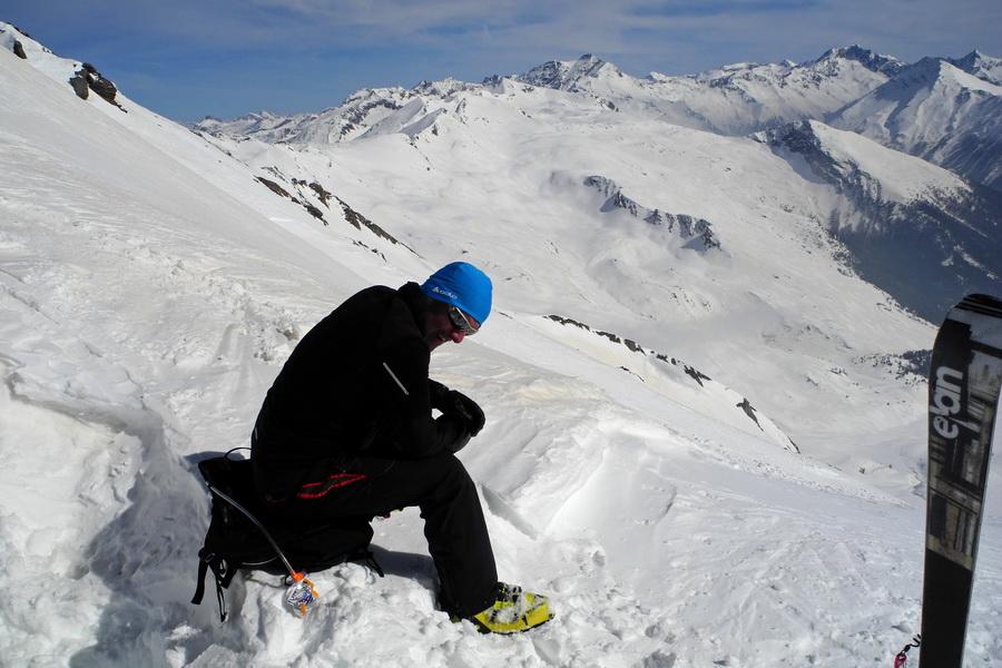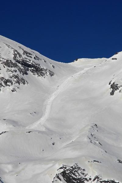 Monday was more like a hiking tour. First we went up to seddle Feldseescharte. We were going up in the area of Sundays avalanche. It was 20 - 40 cm deep, 10 - 20 meters wide and high (long) 500 h.m! It started about 30 m below the bivouac and it was caused by the skiers making a traverse to the saddle. Snow at the top was very unstabile and there were several cracks so we were very cautious mooving arround there. Skiing down was good. Some in the area, cleaned by the avalnanche.